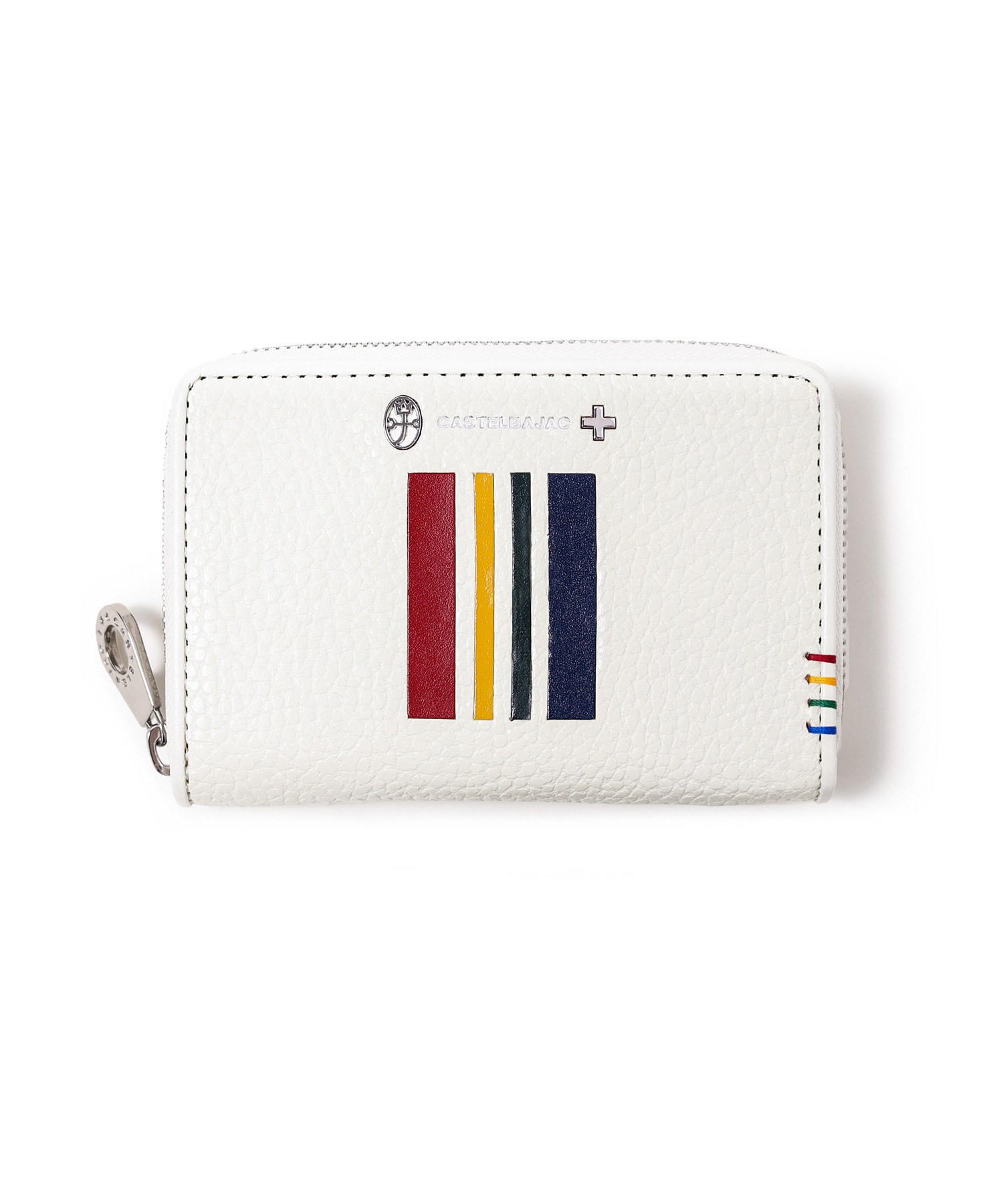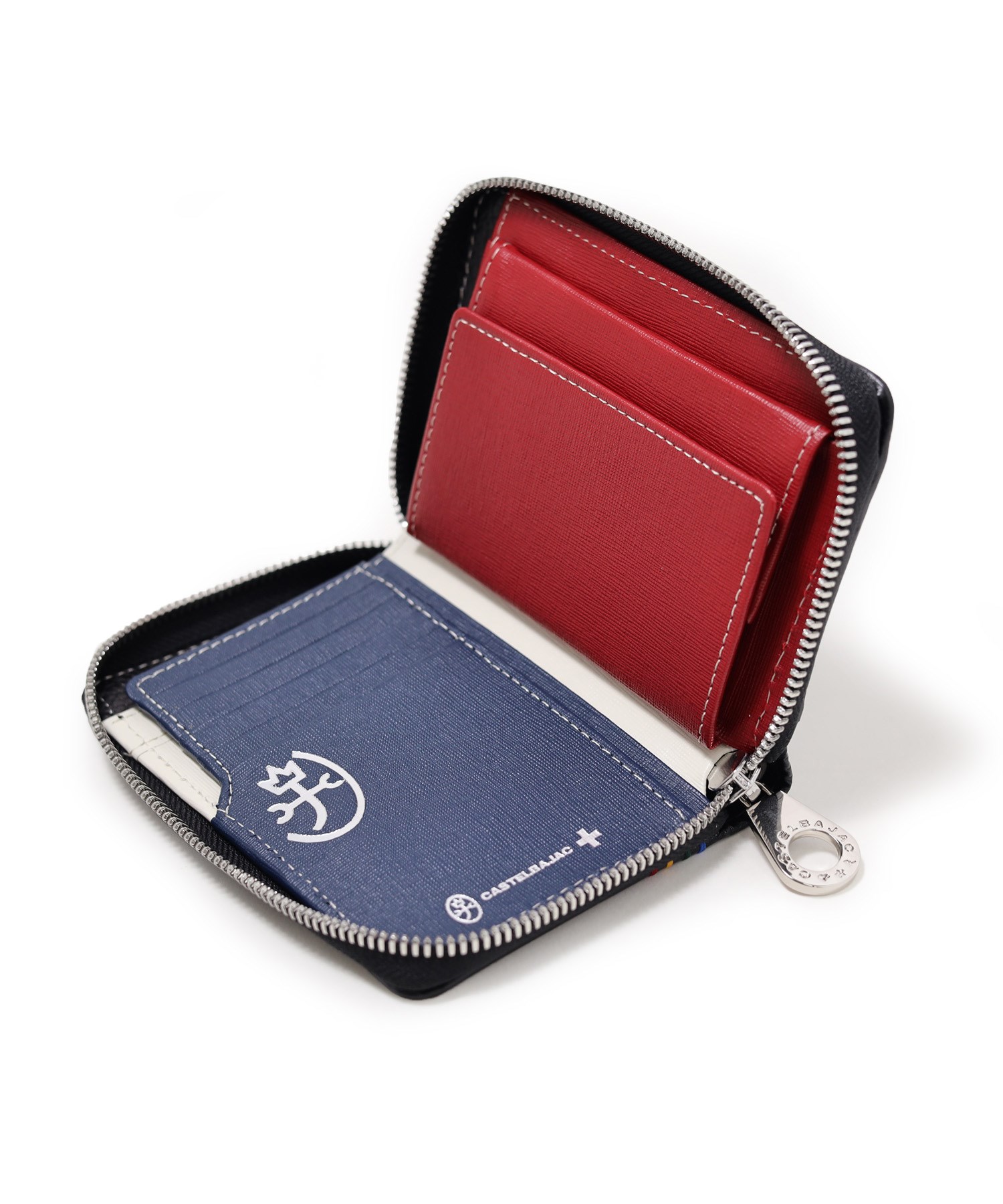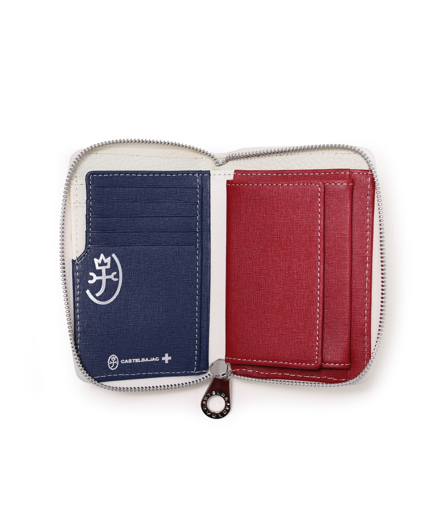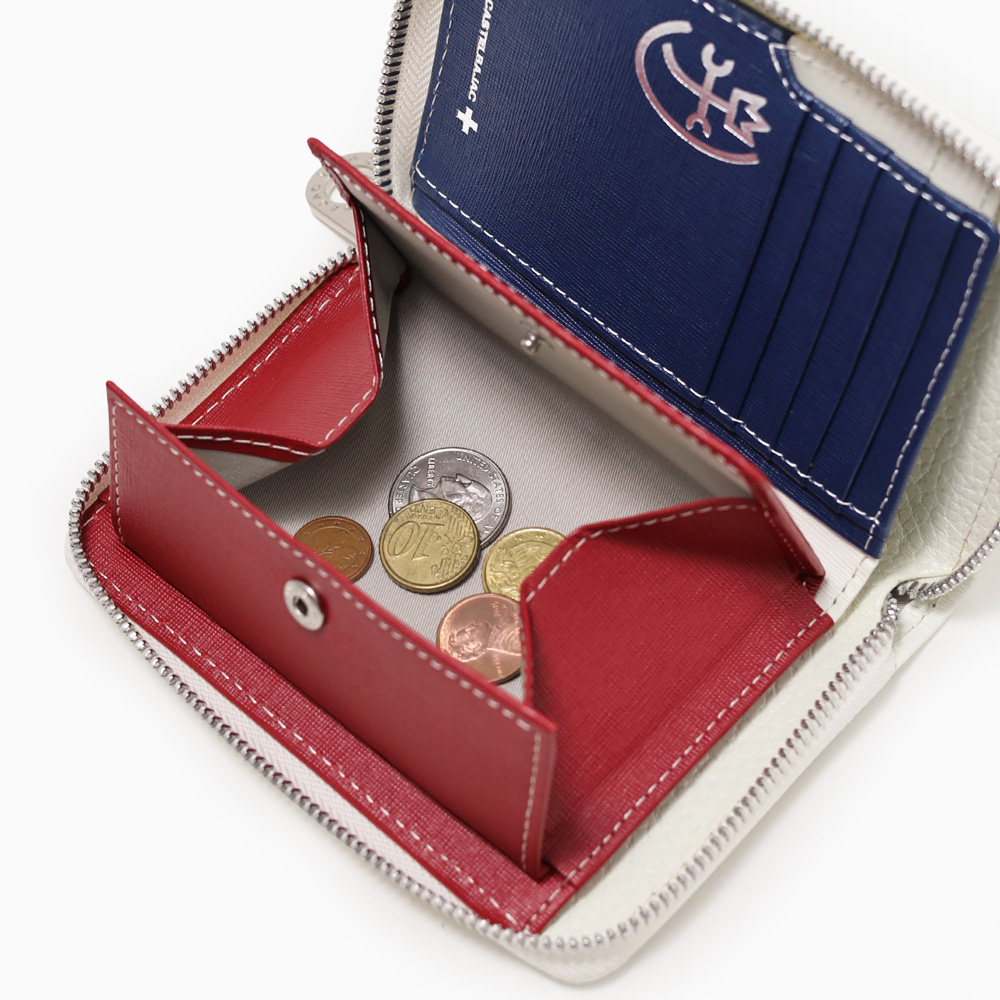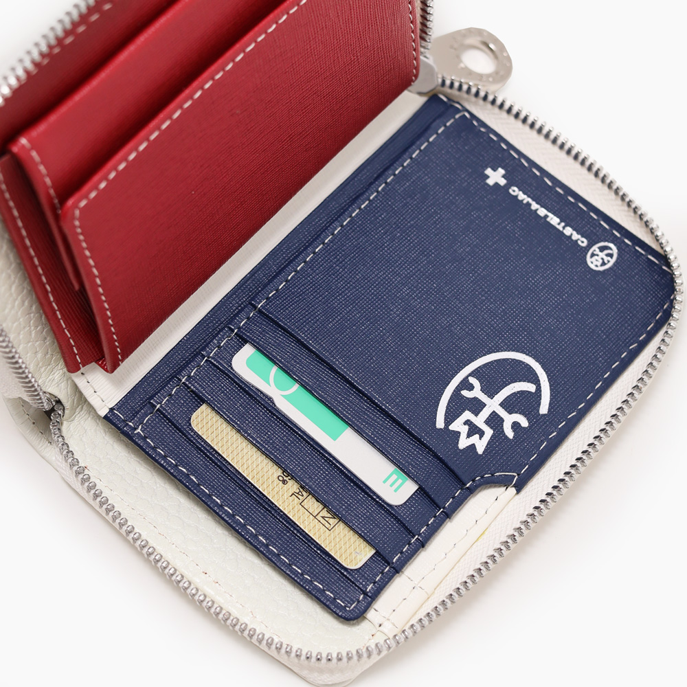 イタリアンショルダーレザーを使用し、4原色カラーをレザーの埋め込みで表現した二つ折り財布。この財布は札入れ部に深さがあり、お札やレシートの収まりが良く、安心して収納できることが魅力です。素材はナチュラルな奥行きのある艶感が魅力で、使い込む程味わい深いエイジングをお楽しみいただけます。カステルバジャックらしい内装のトリコロールカラーもポイントです。