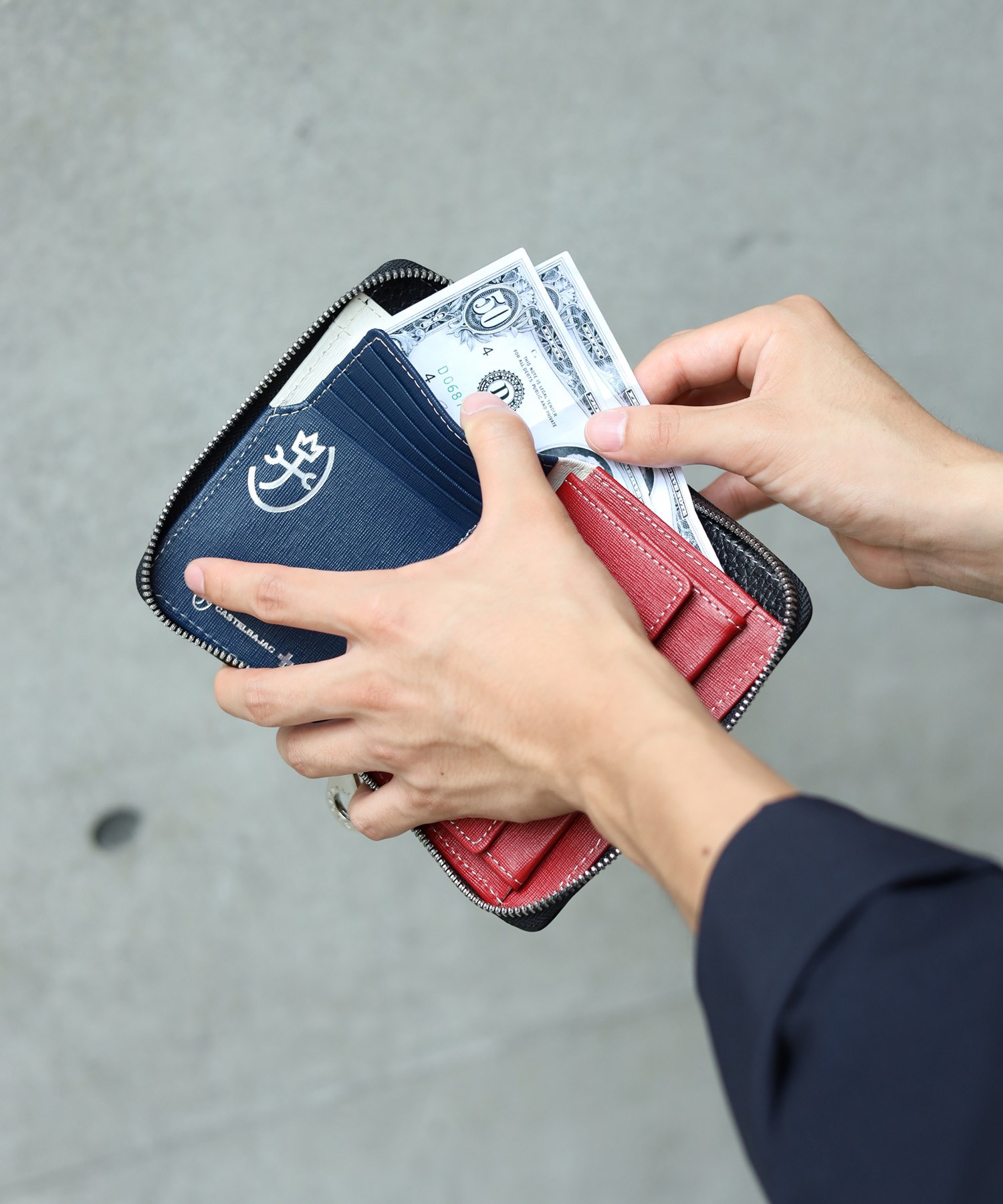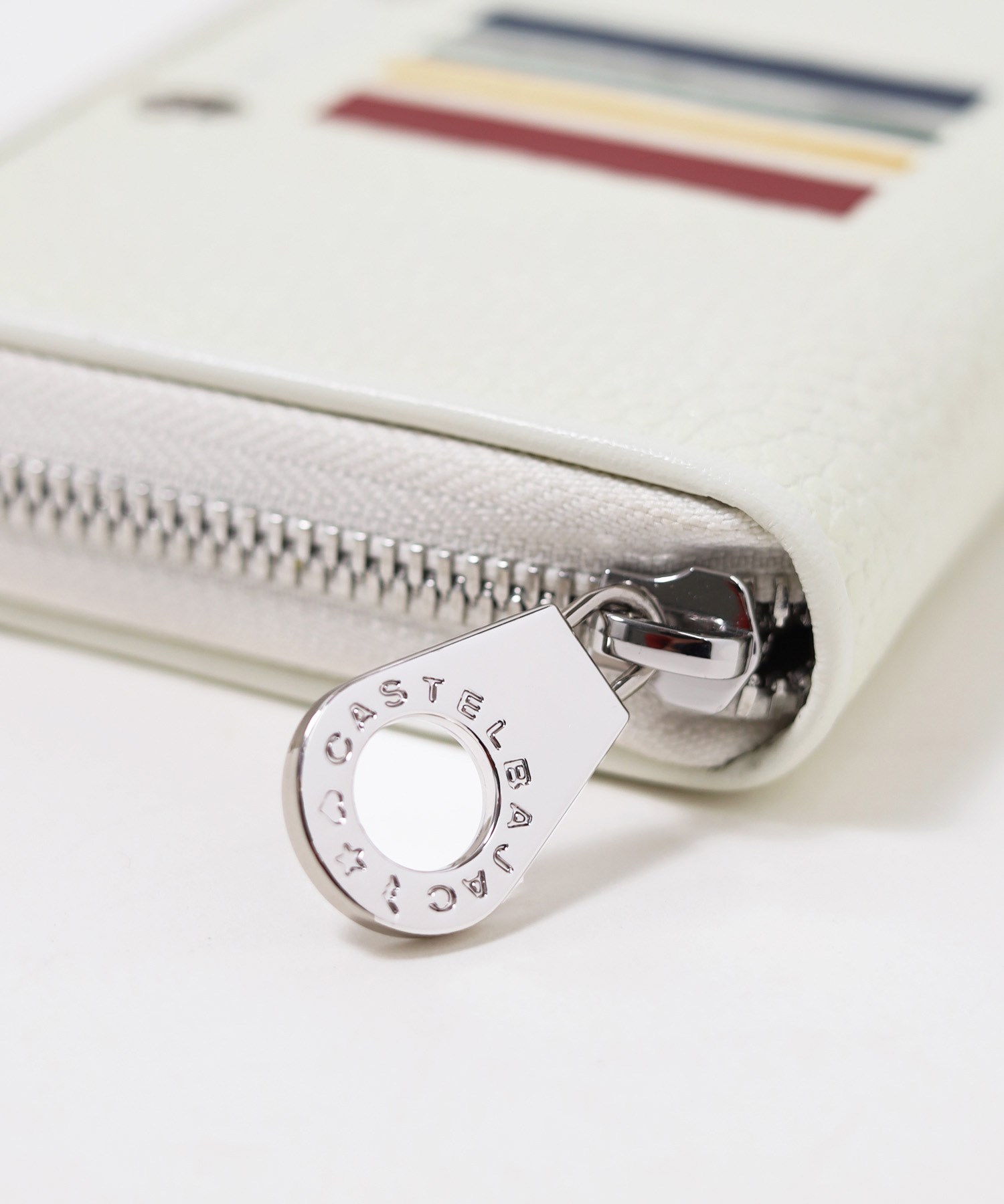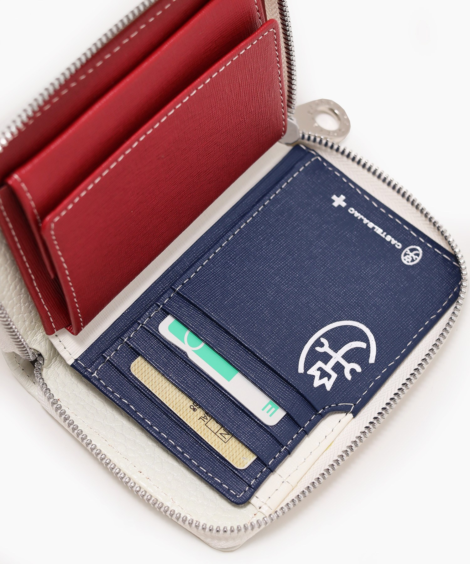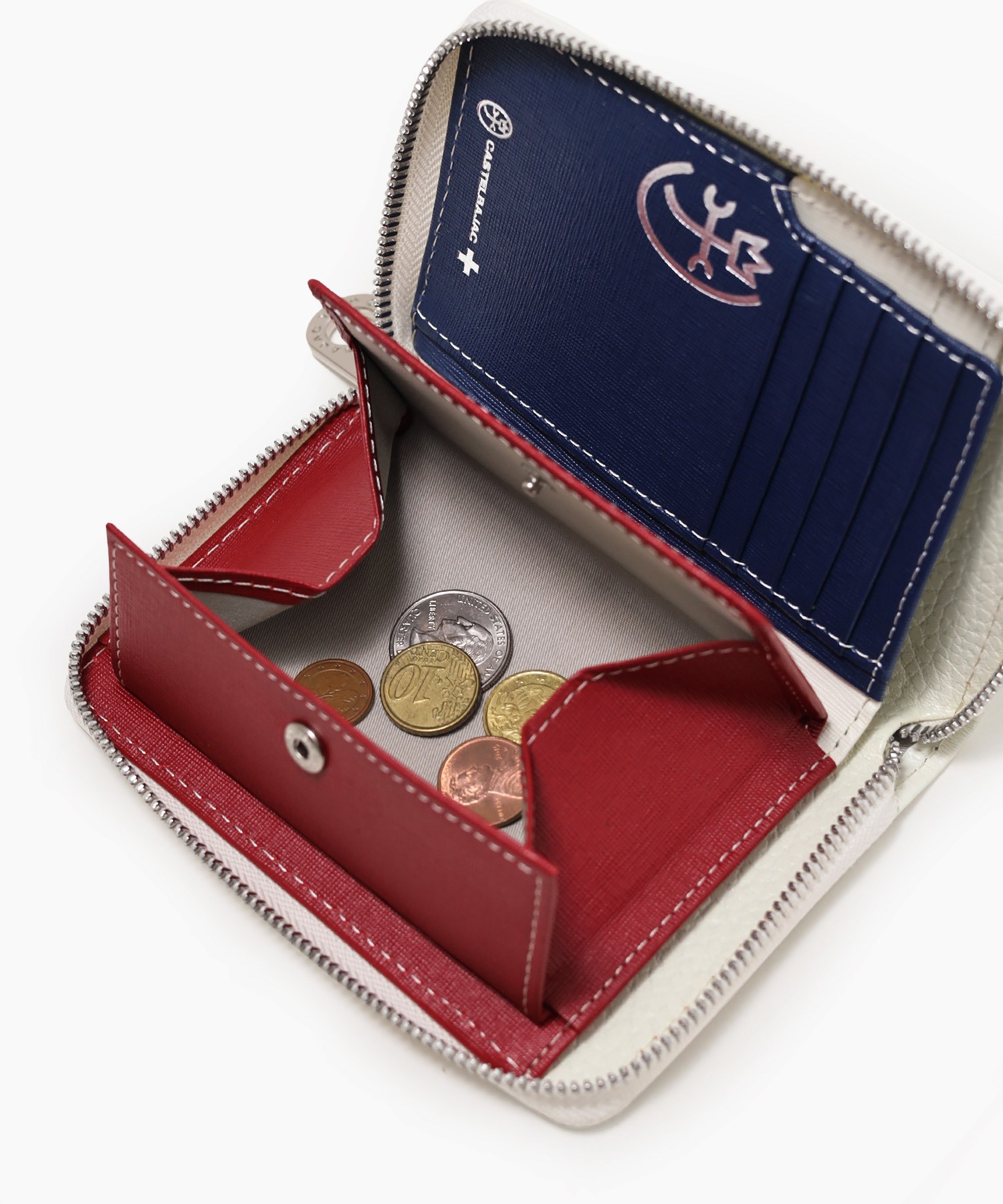 イタリアンショルダーレザーを使用し、4原色カラーをレザーの埋め込みで表現した二つ折り財布。この財布は札入れ部に深さがあり、お札やレシートの収まりが良く、安心して収納できることが魅力です。素材はナチュラルな奥行きのある艶感が魅力で、使い込む程味わい深いエイジングをお楽しみいただけます。カステルバジャックらしい内装のトリコロールカラーもポイントです。