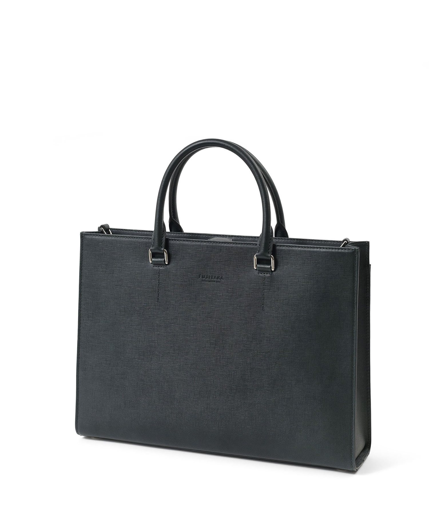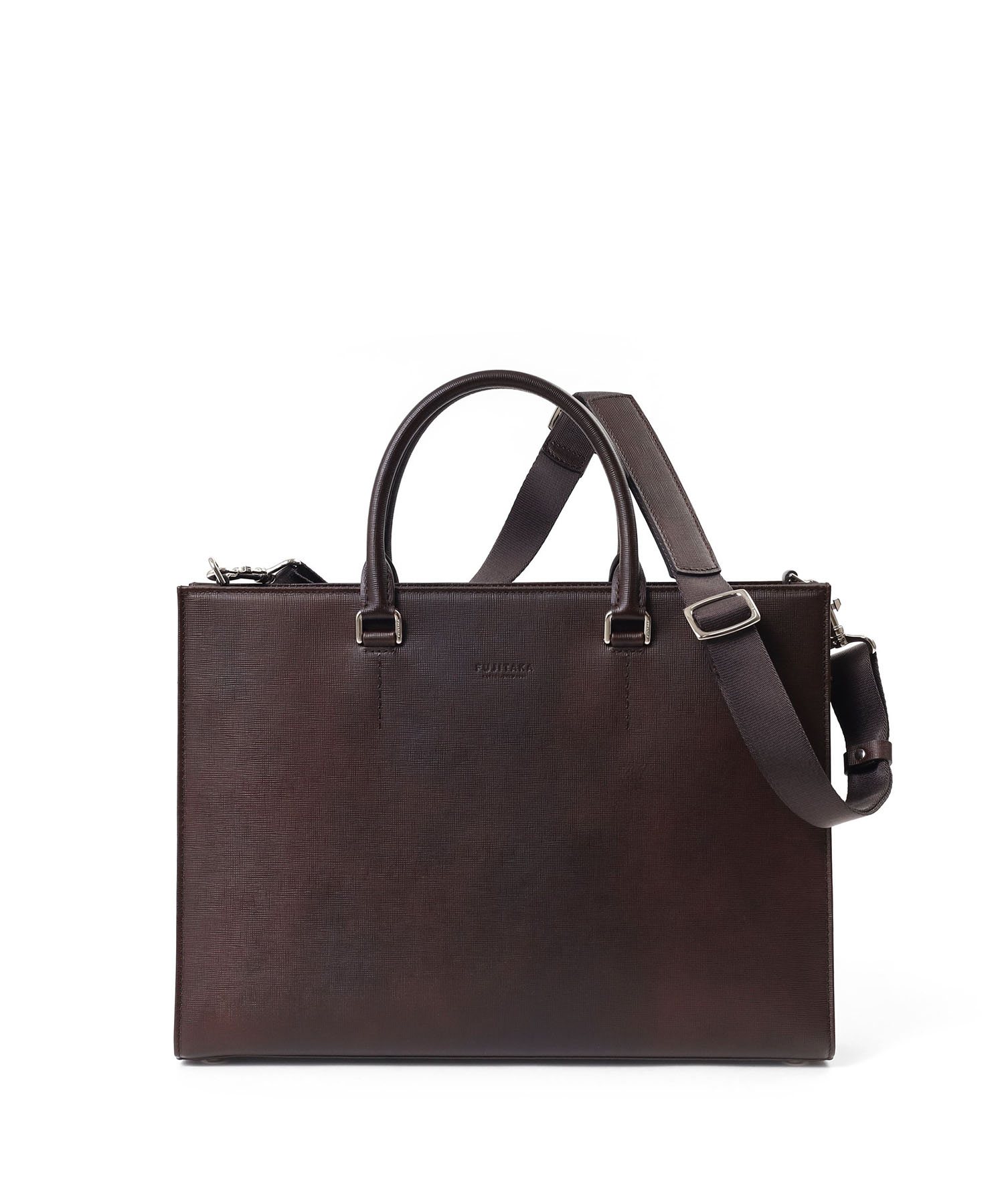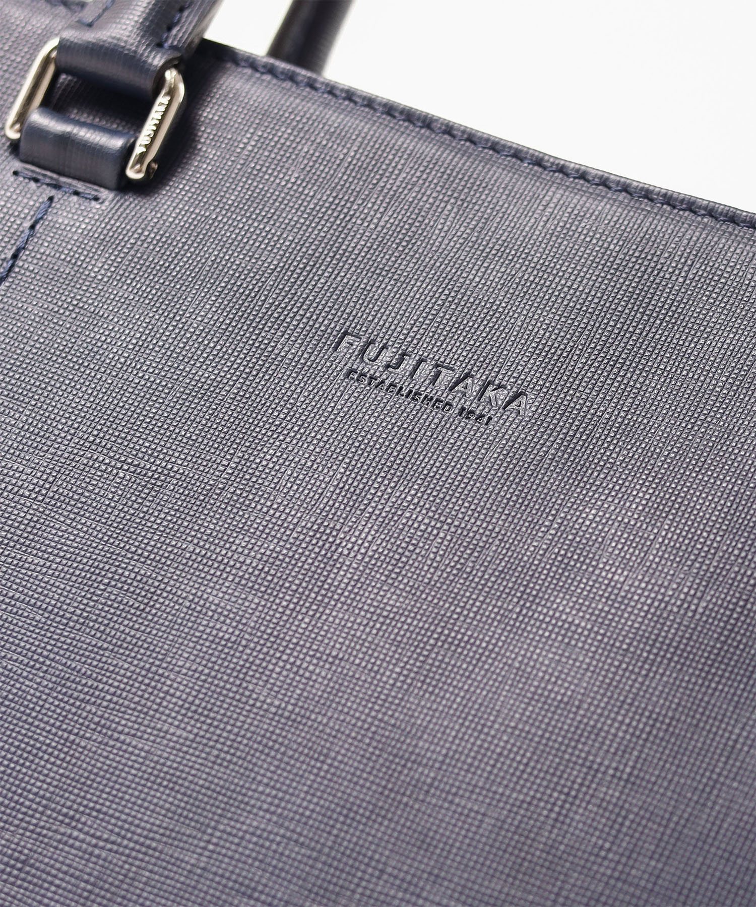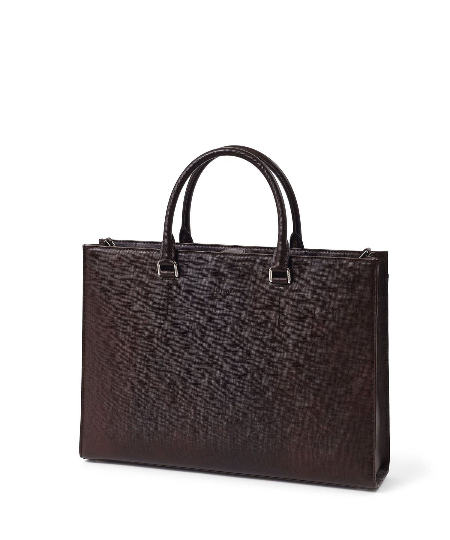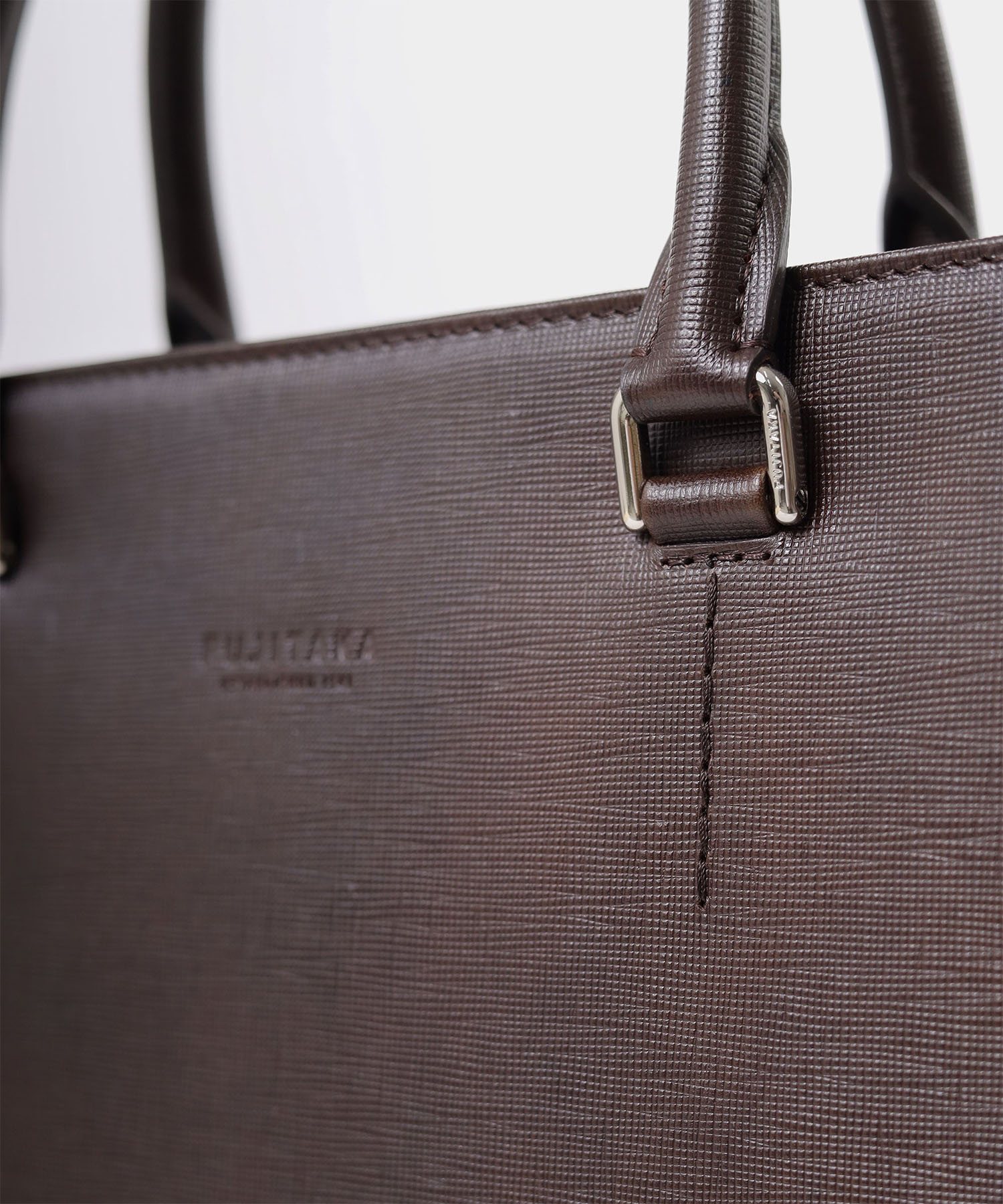 奥行きあるアンティック染色と型押しを施したオリジナルレザーを使用した、FUJITAKA Extra Antiqueシリーズのレザートートブリーフ。クラシックでスタイリッシュな角マチのデザインが特徴で、軽量で持ち運びがしやすいカバンです。メインコンパートメントファスナー部分の金具には、FUJITAKAのシンボルマークが刻印されています。