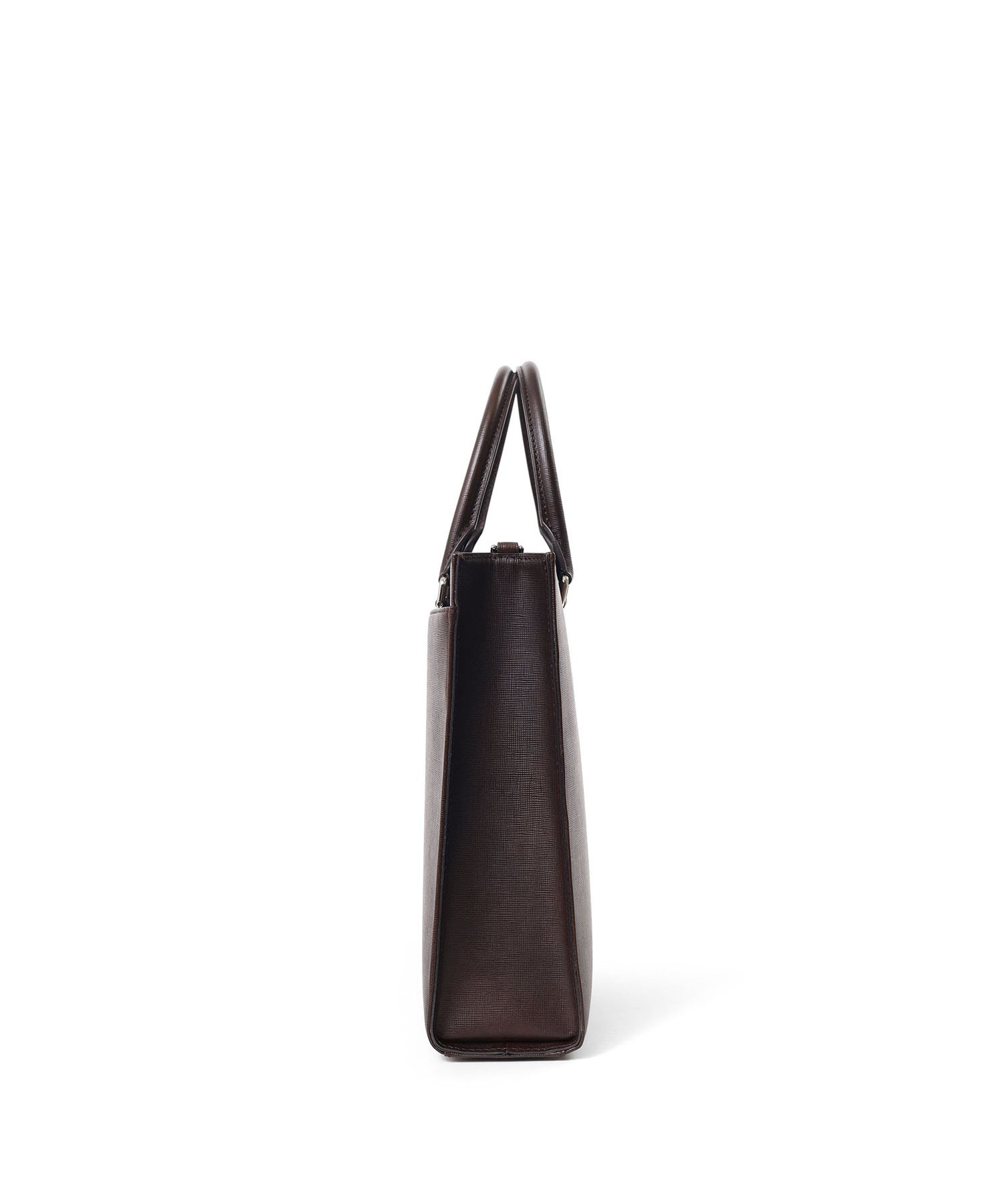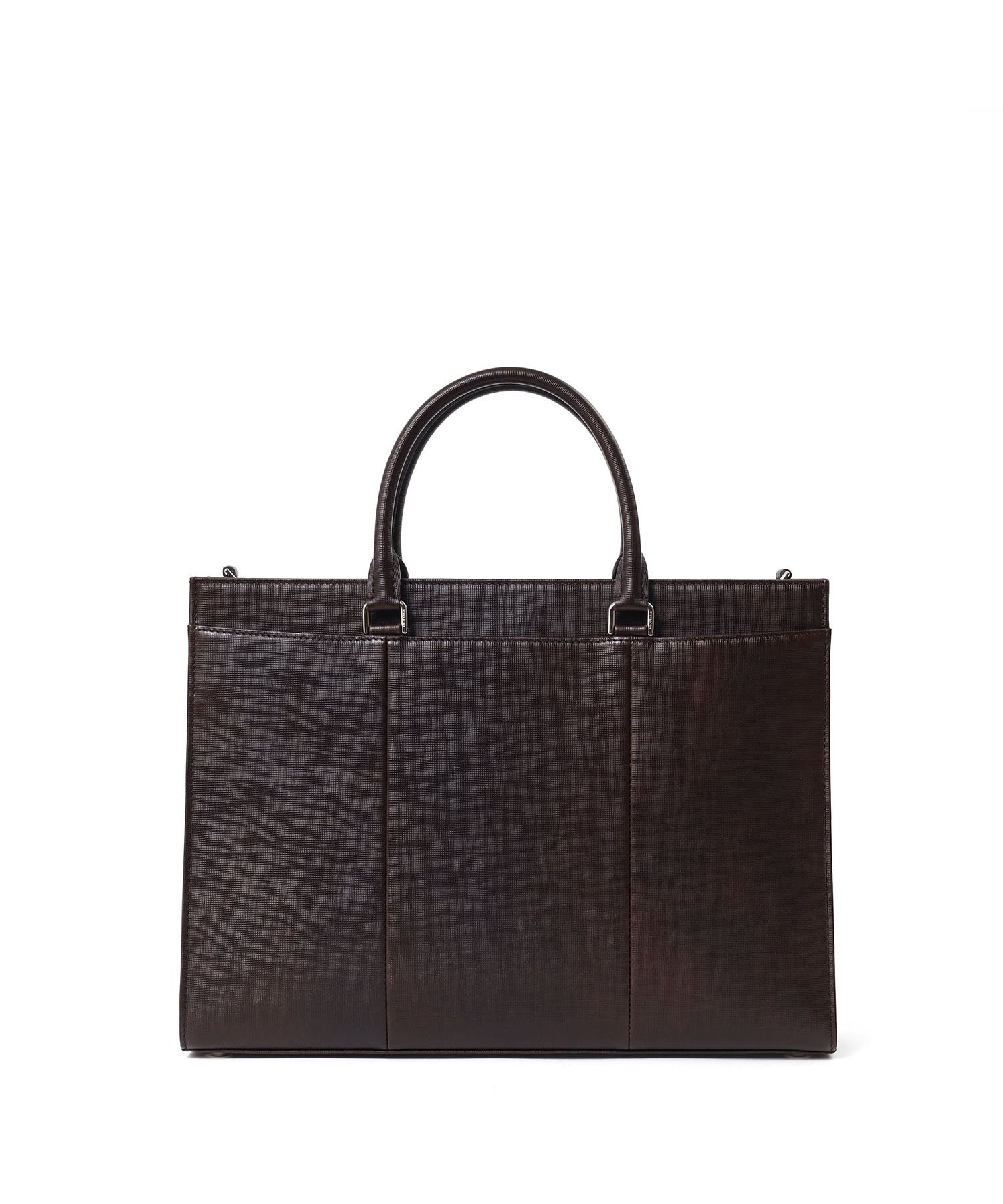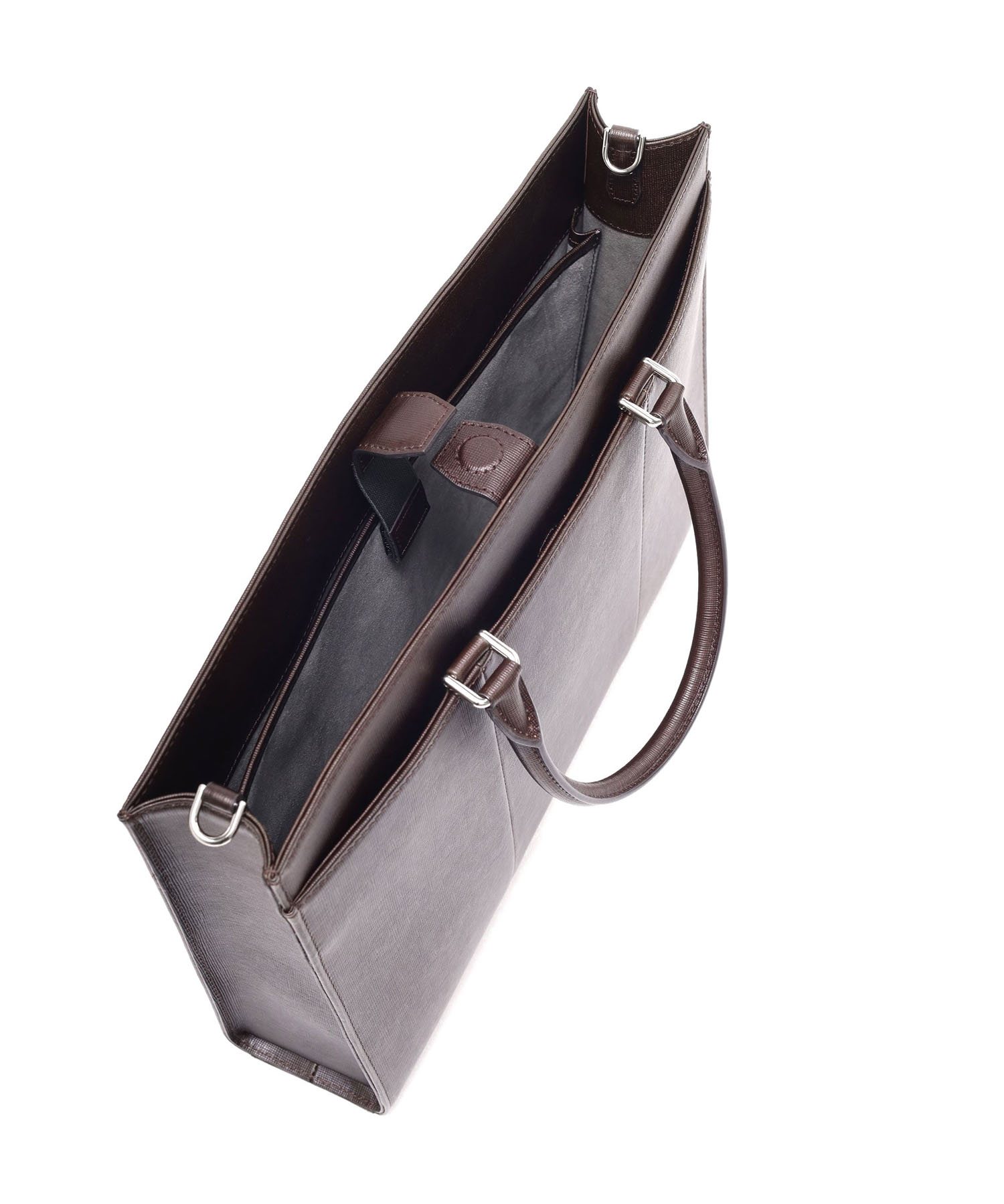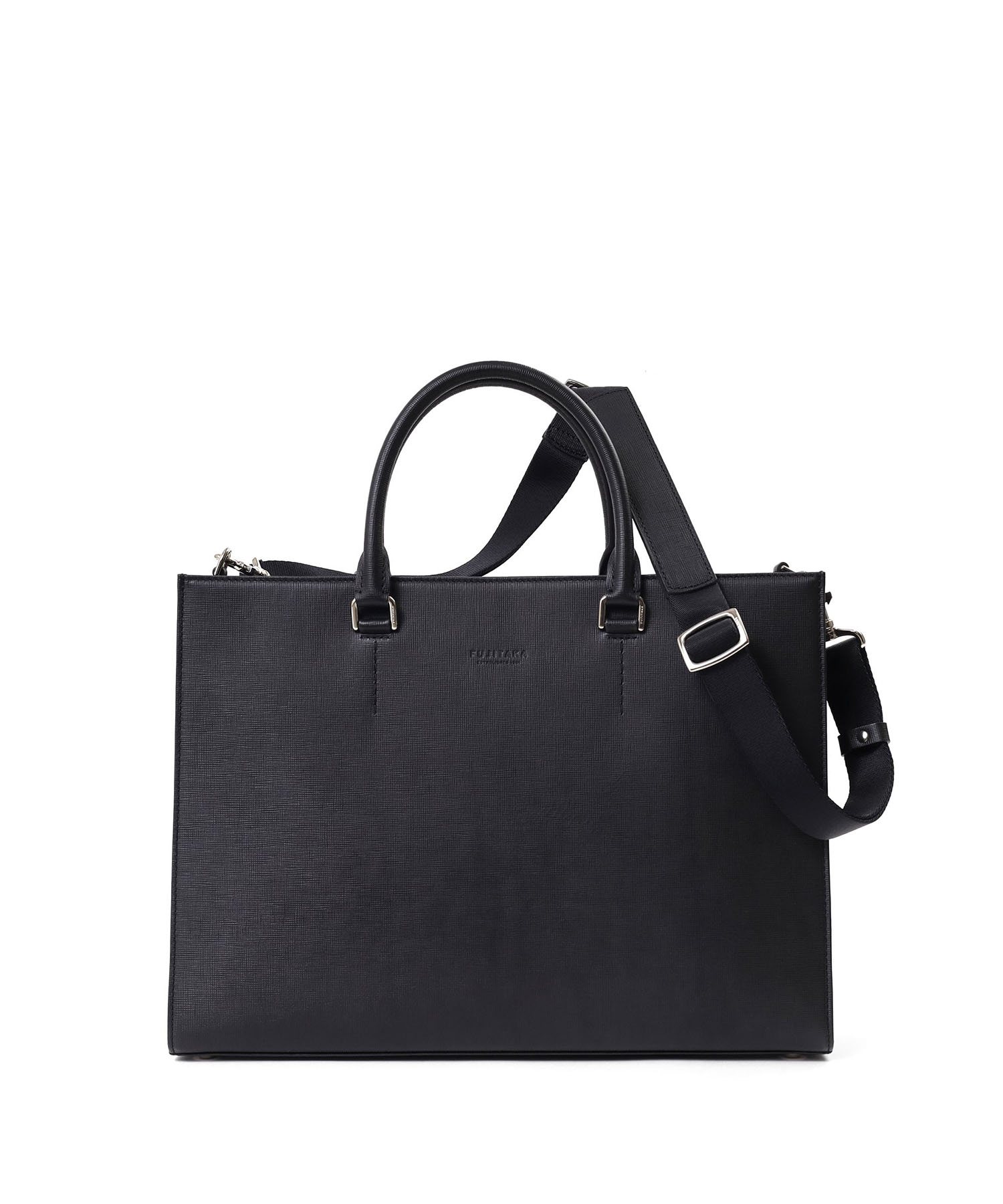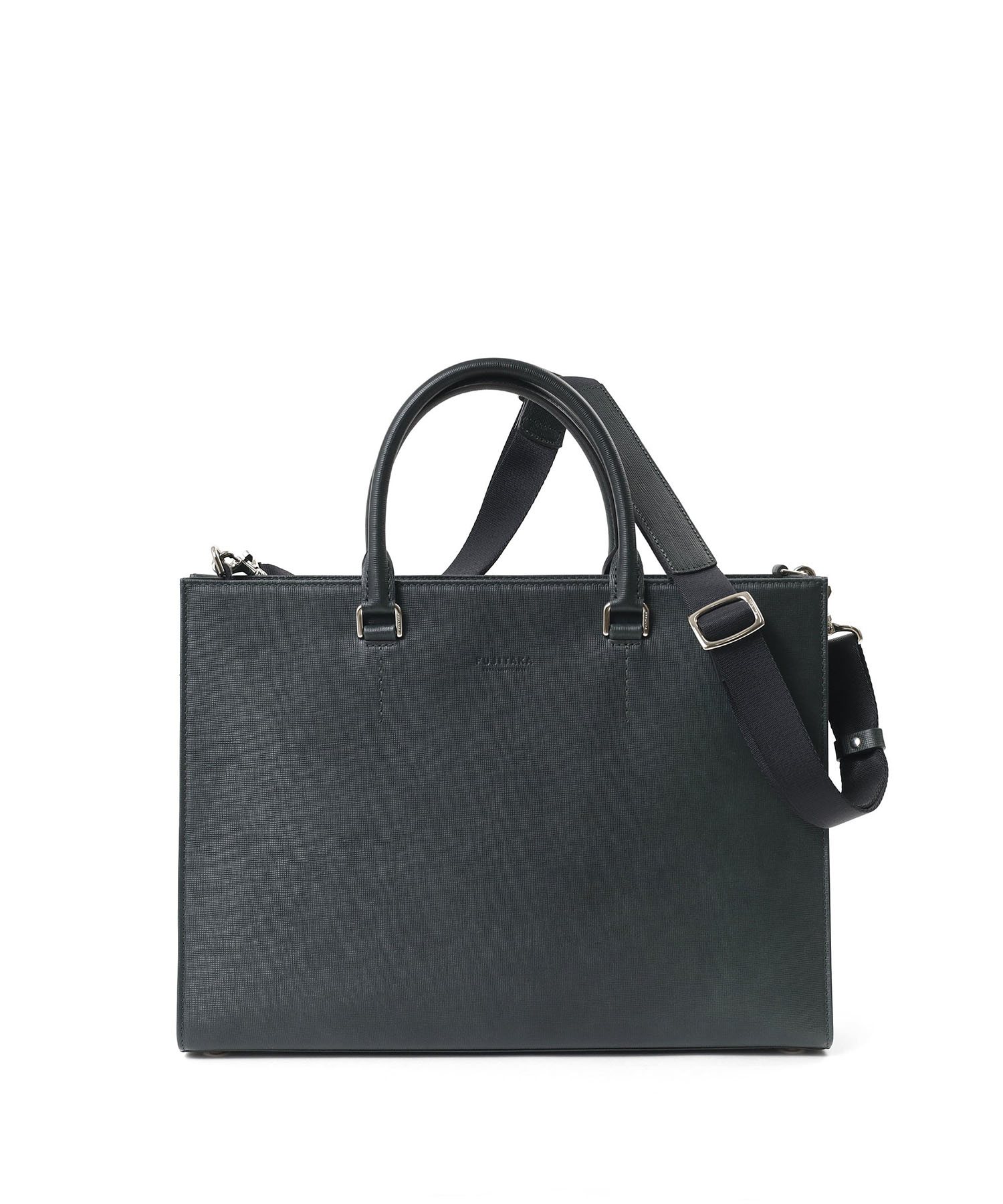 奥行きあるアンティック染色と型押しを施したオリジナルレザーを使用した、FUJITAKA Extra Antiqueシリーズのレザートートブリーフ。クラシックでスタイリッシュな角マチのデザインが特徴で、軽量で持ち運びがしやすいカバンです。メインコンパートメントファスナー部分の金具には、FUJITAKAのシンボルマークが刻印されています。