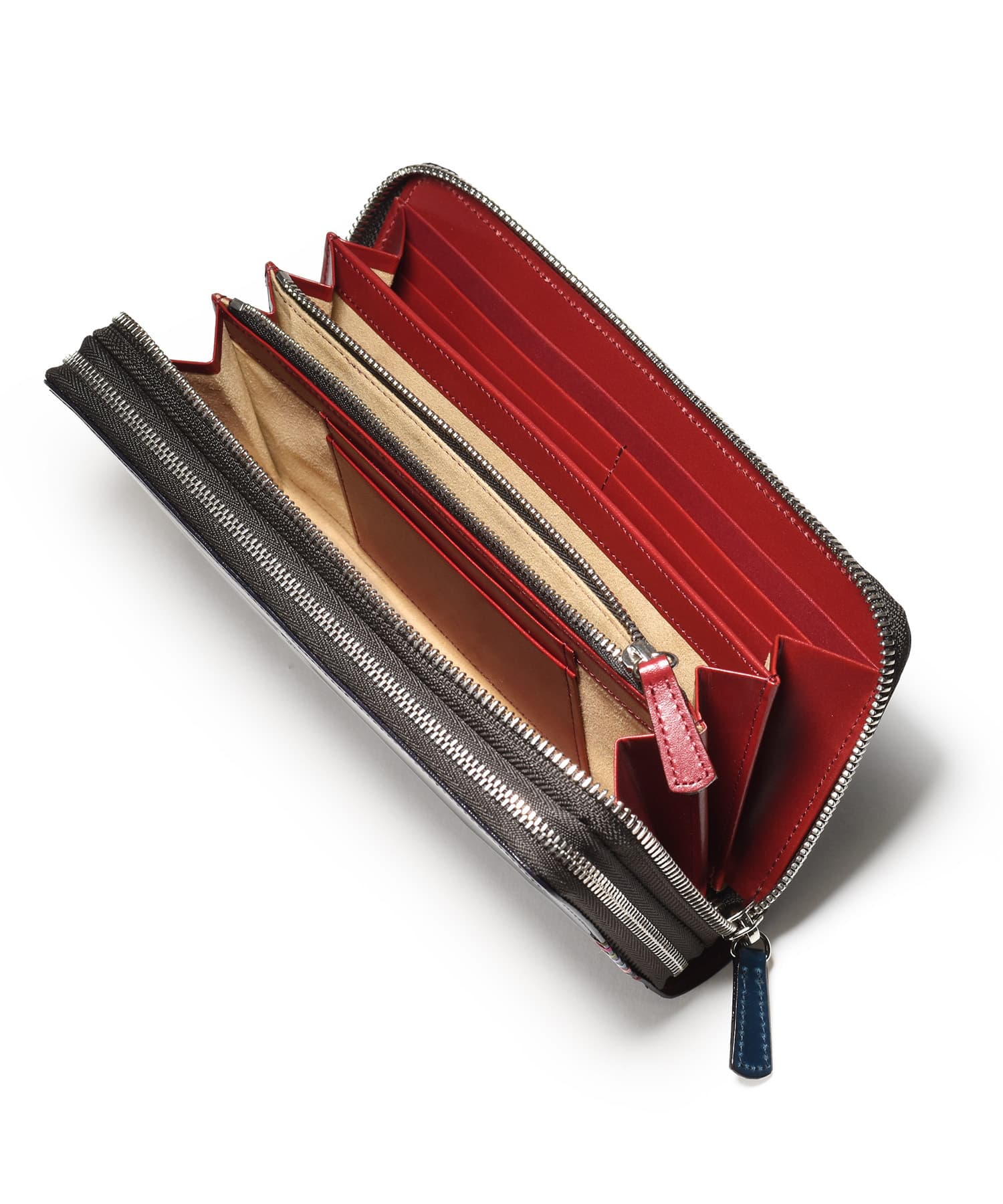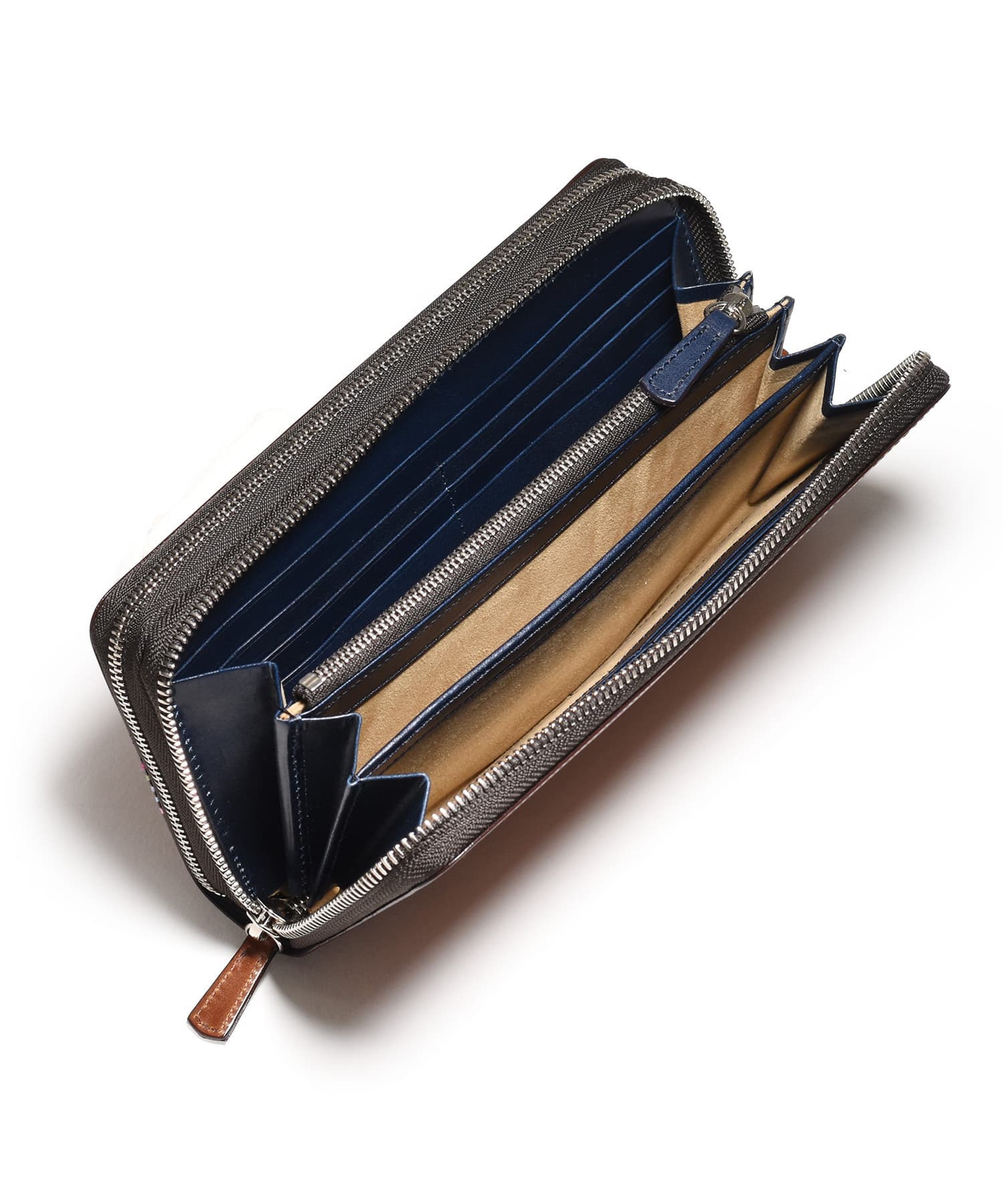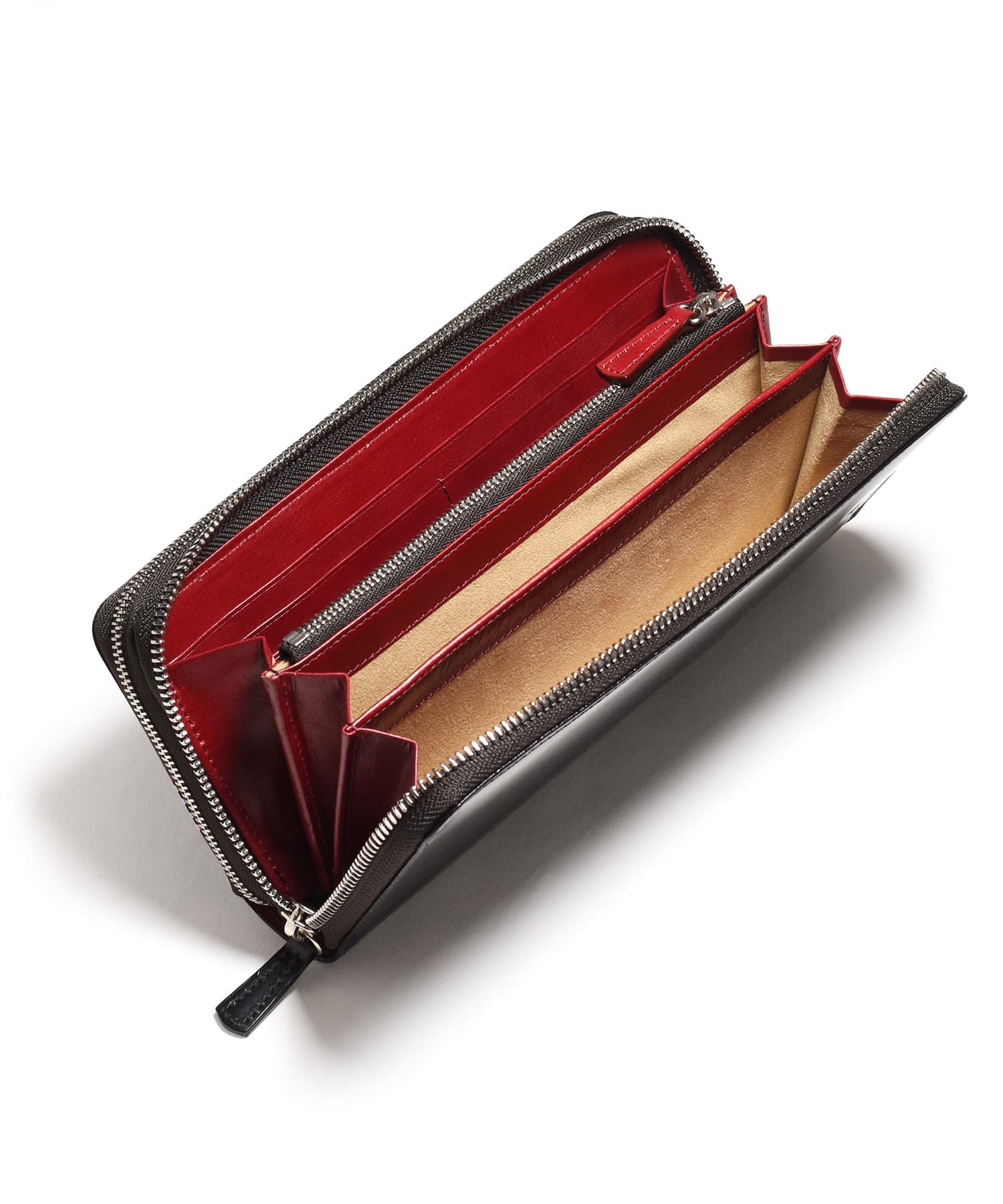 希少なオイルコードバンを主素材とし、内革に発色の良いアニリンレザーを使用したフジタカのフォール小物シリーズのセカンドウォレット。ラウンドファスナーを開けきれば口が大きく開き、出し入れも簡単です。