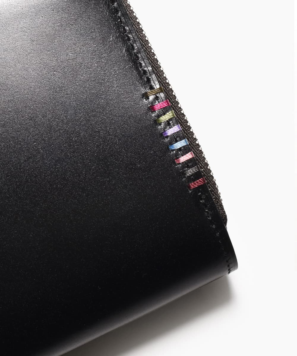 職人が一針一針、丁寧に縫い上げたカラフルなかがりステッチ。日本の”美”を、その絶妙な色合いで奏でる「藤」「桜」「梅」「若竹」「小豆」「銀鼠」「臙脂」「漆喰」「漆黒」などは、日本古来より自然の中にある身近な土・石・草花の色をイメージしたカラーです。主張しすぎない上品な色遣いが、お会計時のお手元をさりげなく彩ります。