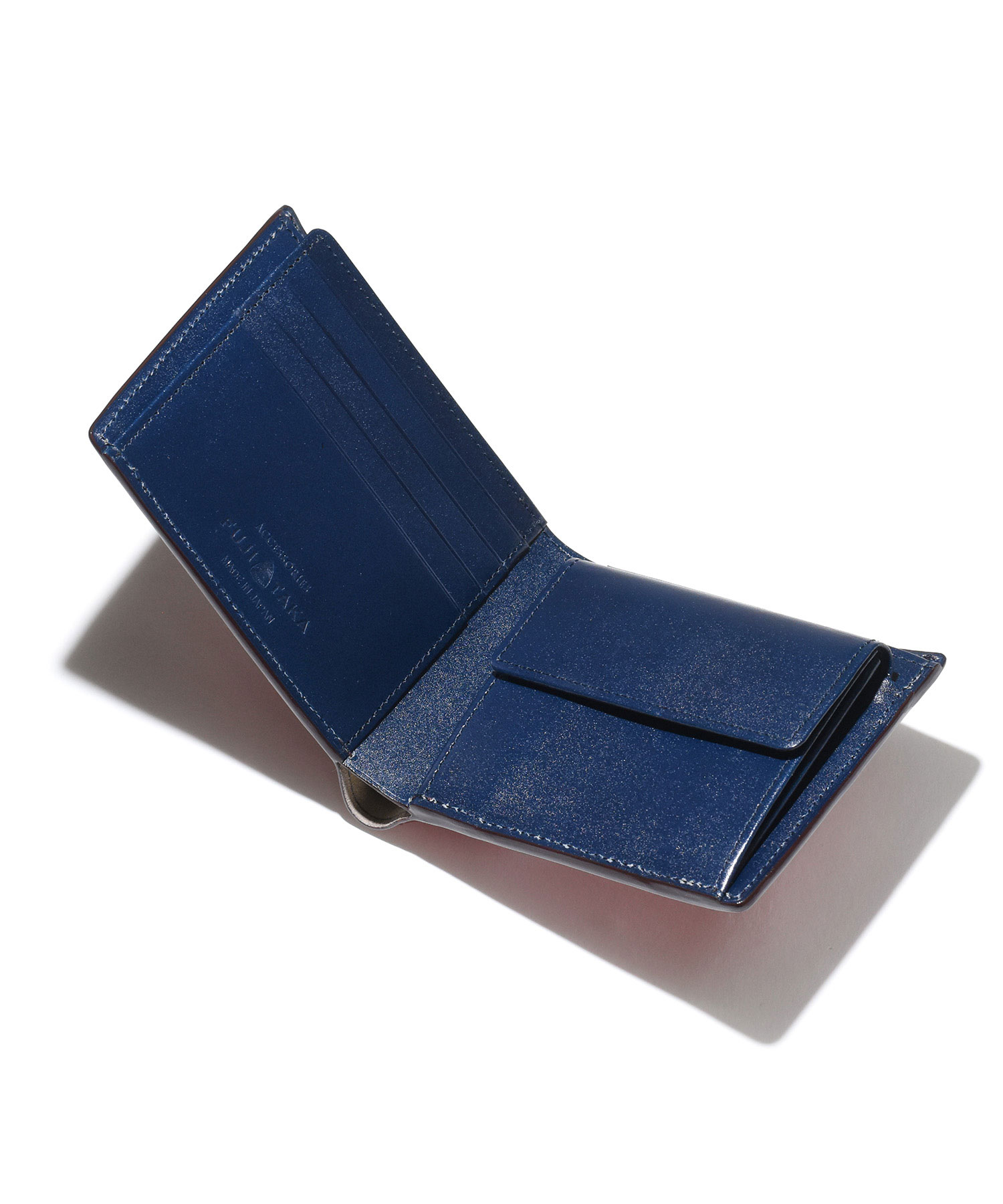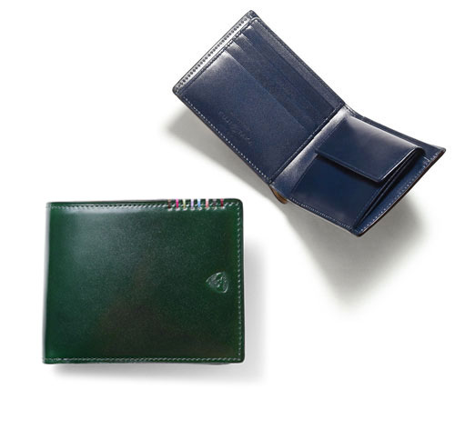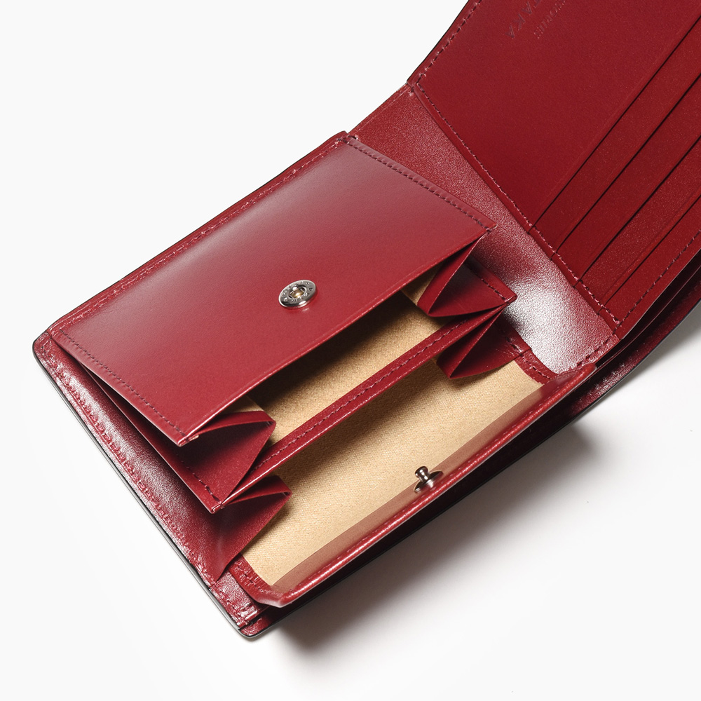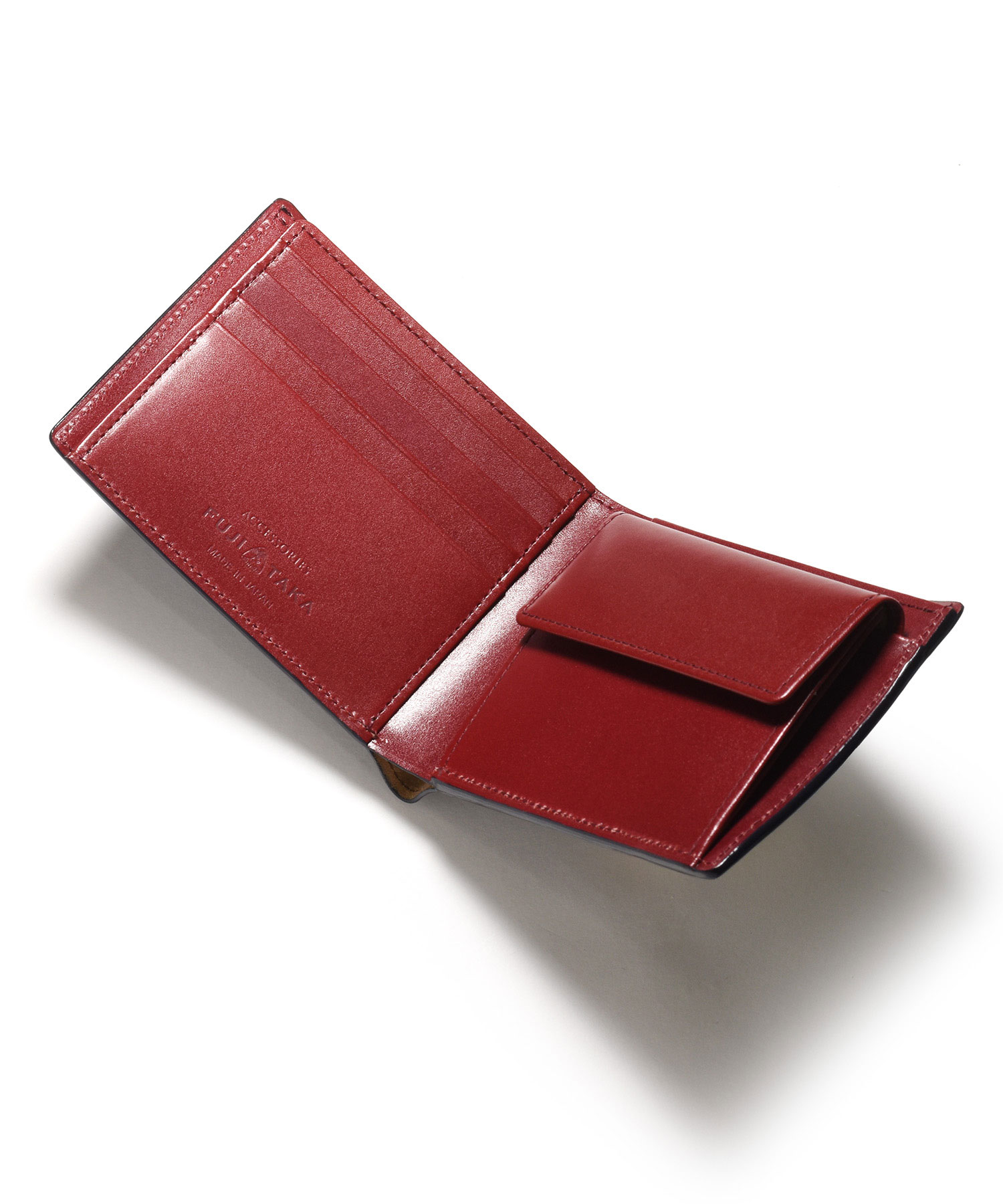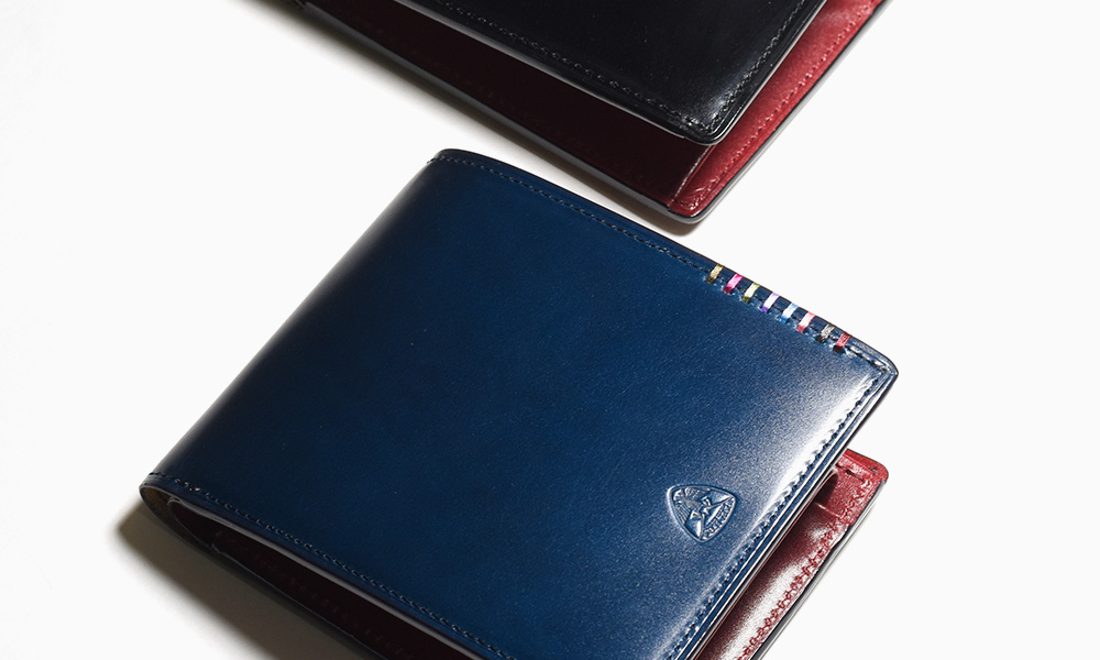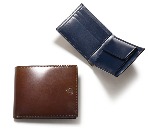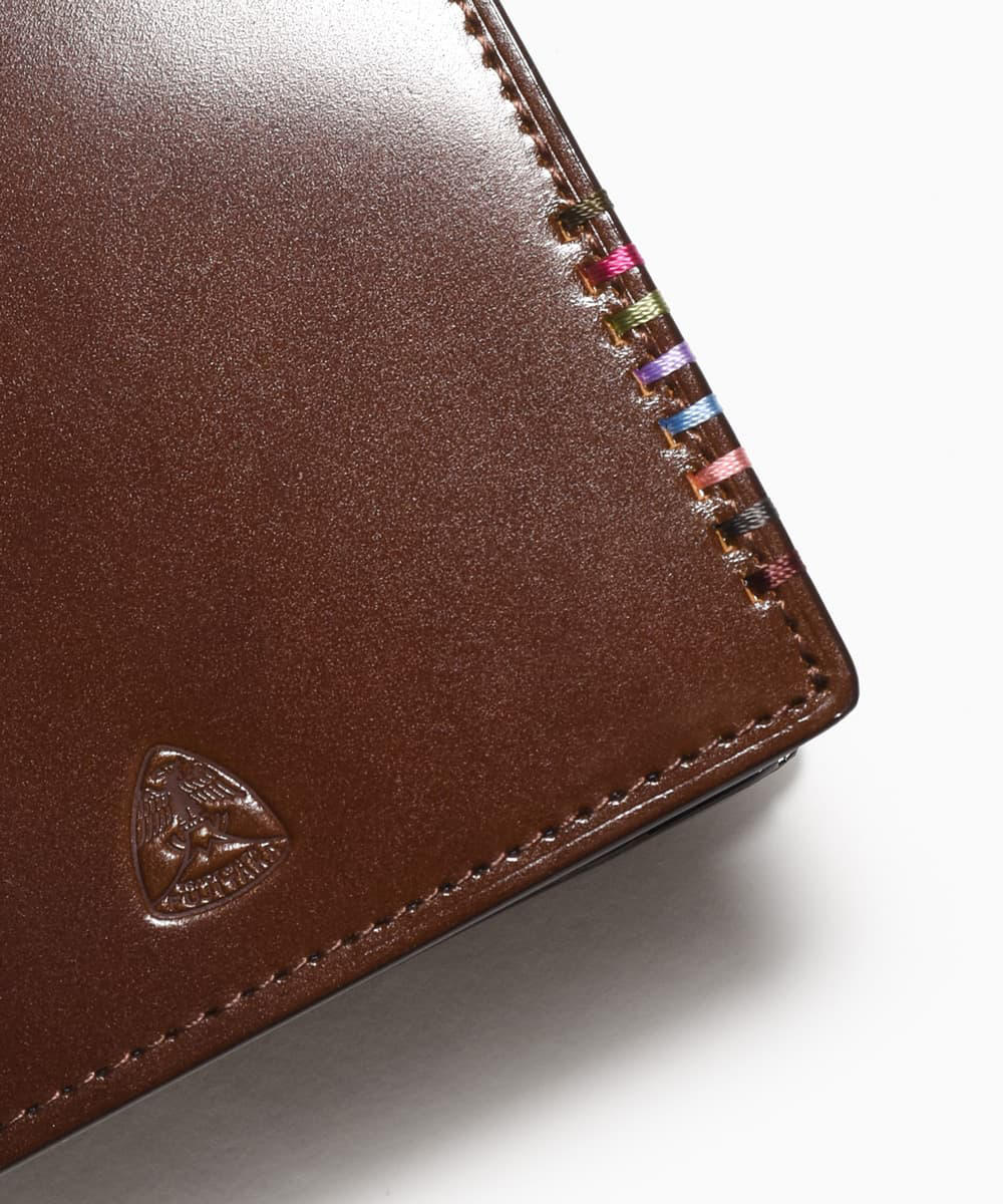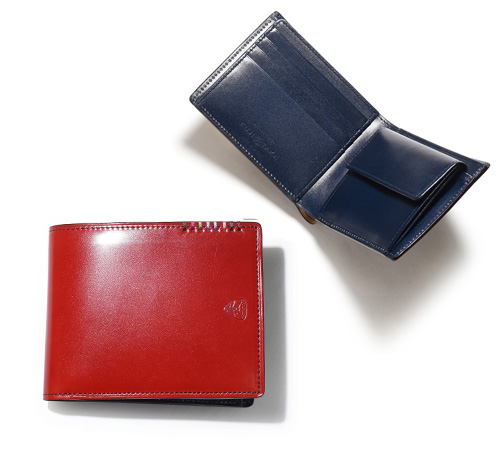 希少なオイルコードバンを主素材とし、内革に発色の良いアニリンレザーを使用したフジタカのフォール小物シリーズの2つ折り財布。アオリ付きのため、カード室が通常よりも多いのが特徴です。