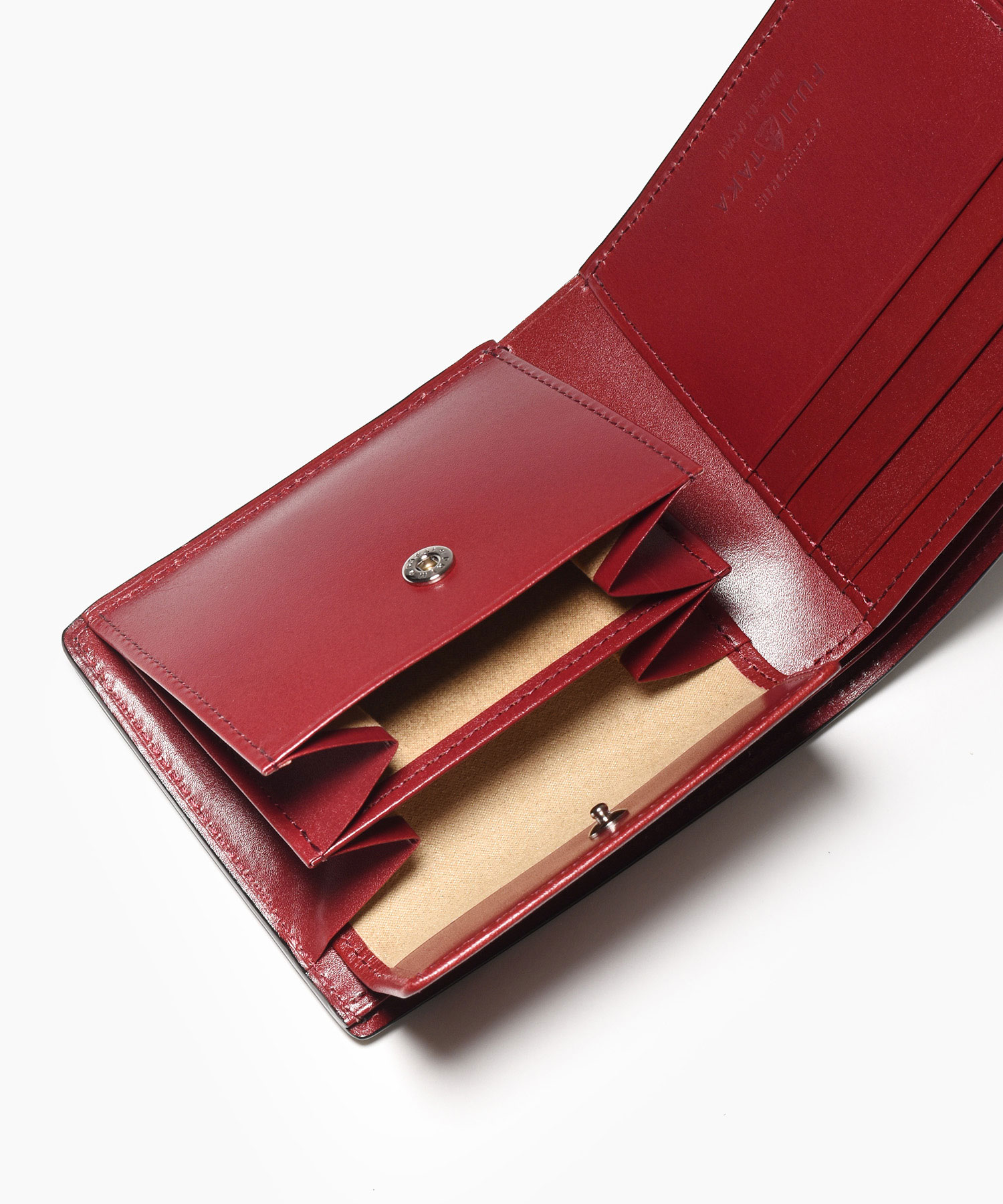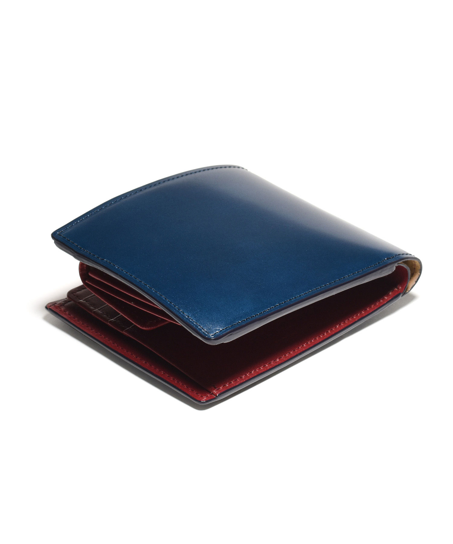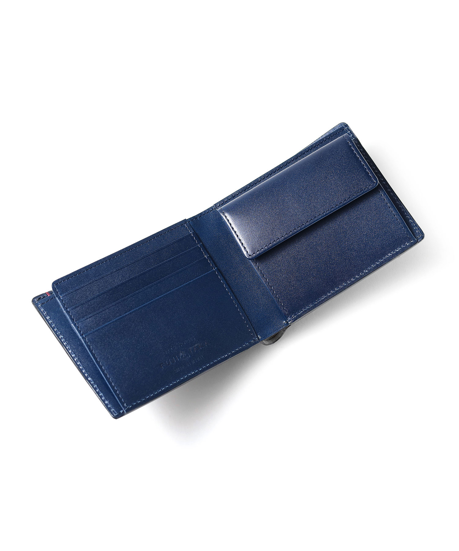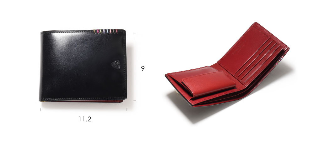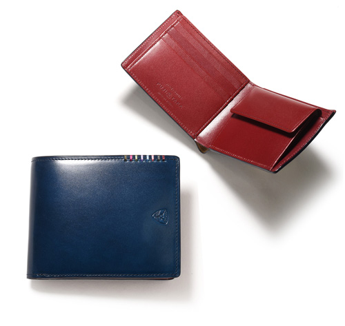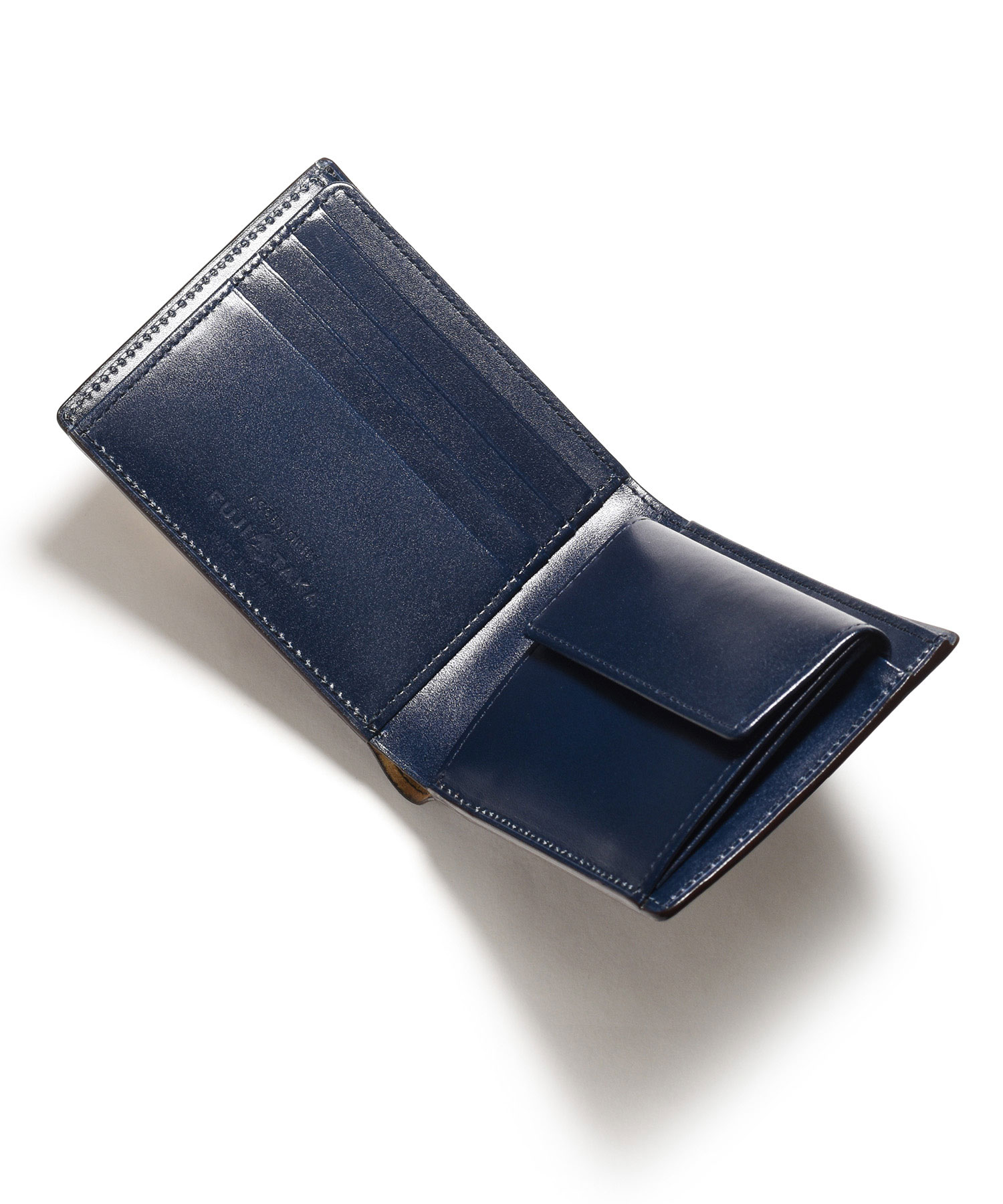 希少なオイルコードバンを主素材とし、内革に発色の良いアニリンレザーを使用したフジタカのフォール小物シリーズの2つ折り財布。アオリ付きのため、カード室が通常よりも多いのが特徴です。