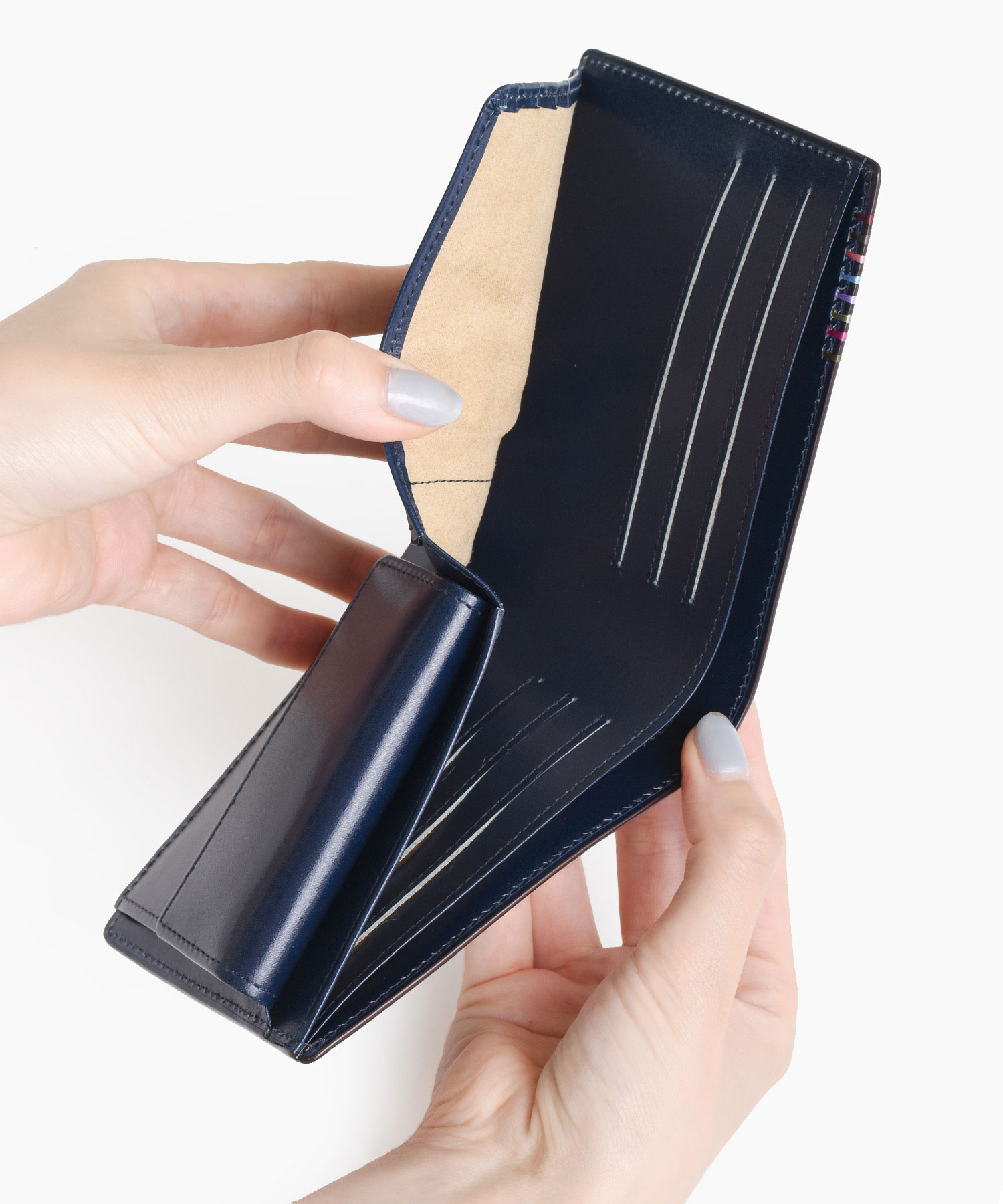 職人が一針一針、丁寧に縫い上げたカラフルなかがりステッチ。日本の”美”を、その絶妙な色合いで奏でる「藤」「桜」「梅」「若竹」「小豆」「銀鼠」「臙脂」「漆喰」「漆黒」などは、日本古来より自然の中にある身近な土・石・草花の色をイメージしたカラーです。主張しすぎない上品な色遣いが、お会計時のお手元をさりげなく彩ります。