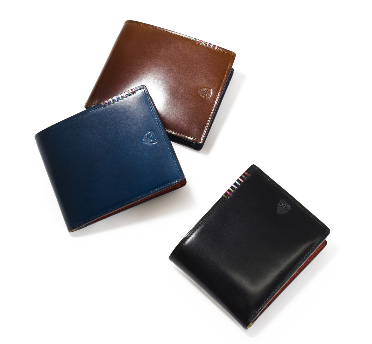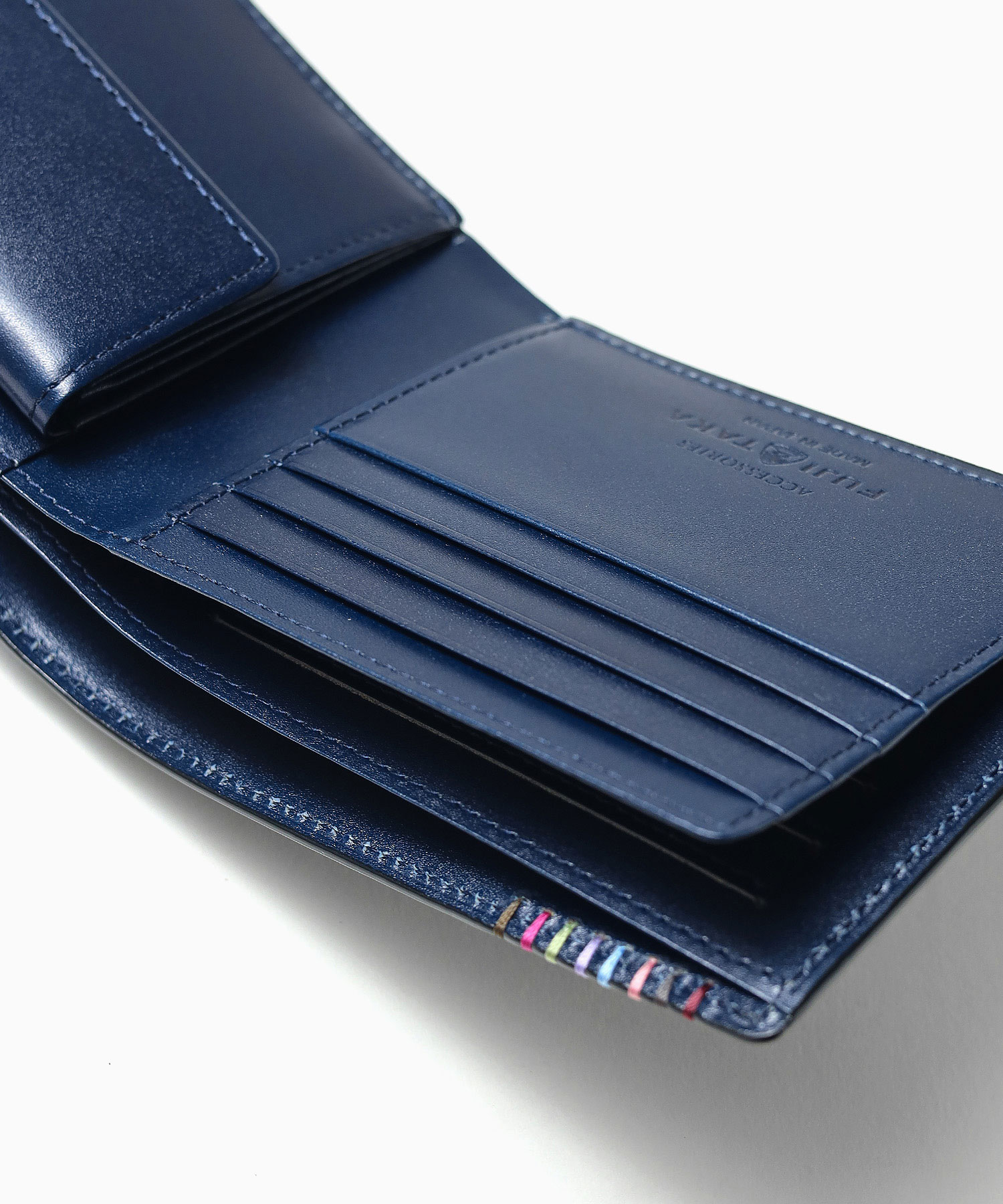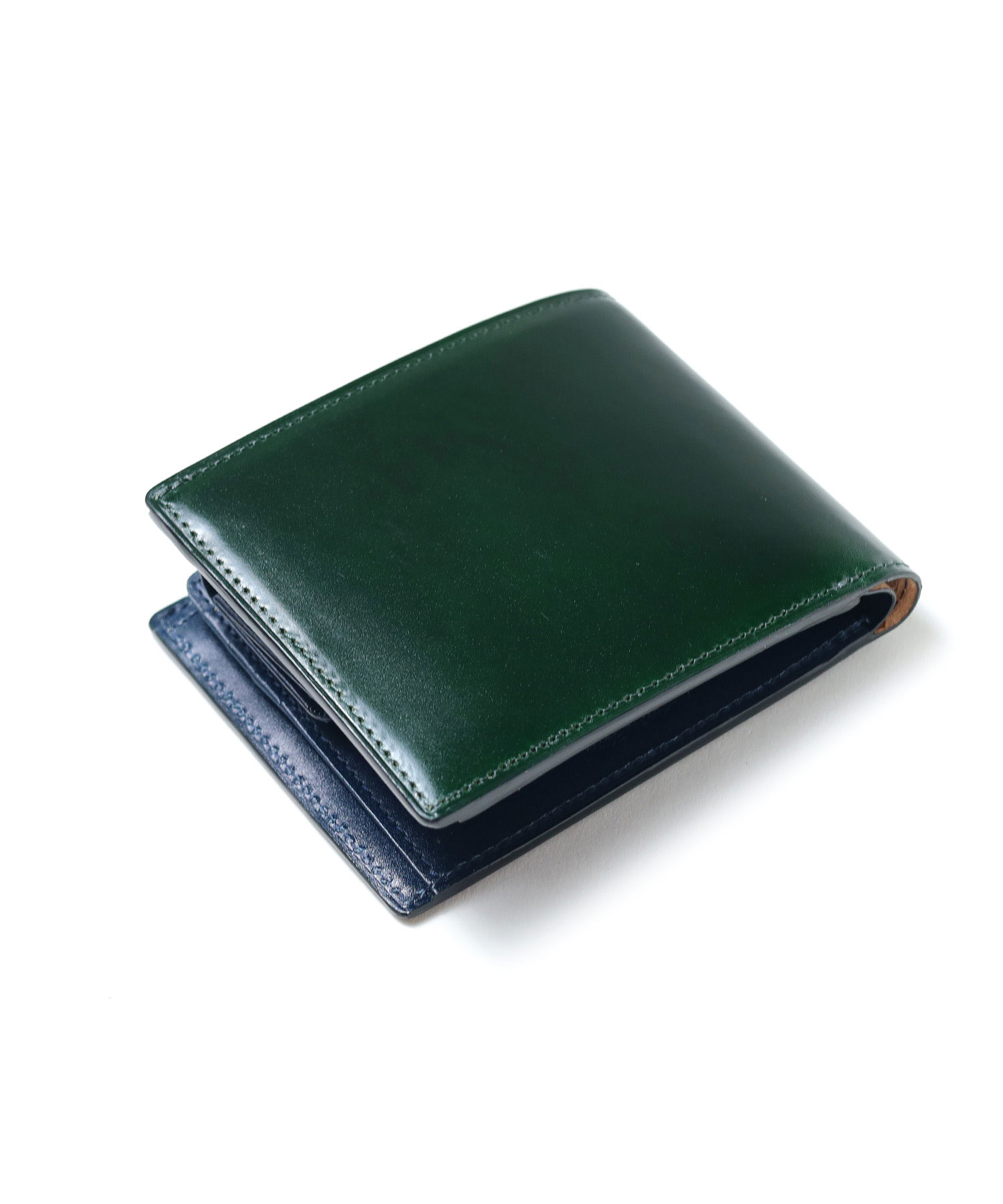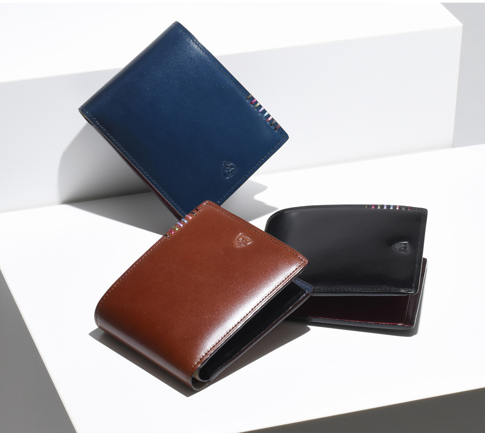 希少なオイルコードバンを主素材とし、内革に発色の良いアニリンレザーを使用したフジタカの『フォール 二つ折り財布』。内革の色がそれぞれ異なるバイカラー。アオリ付きのため、カード室が通常より多いのも特徴です。