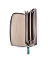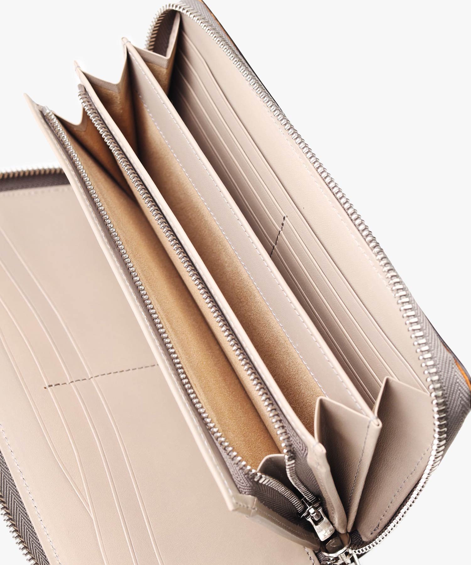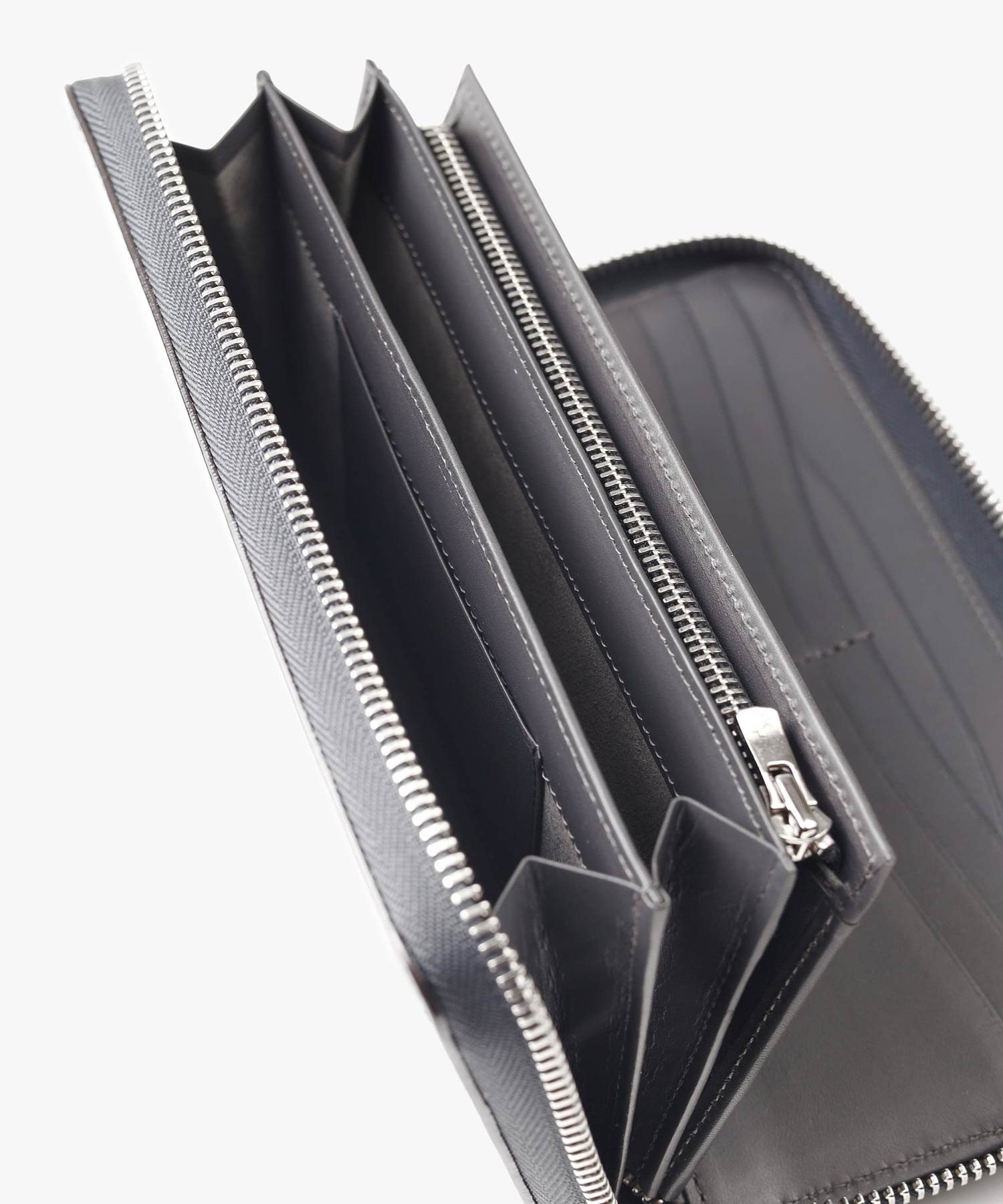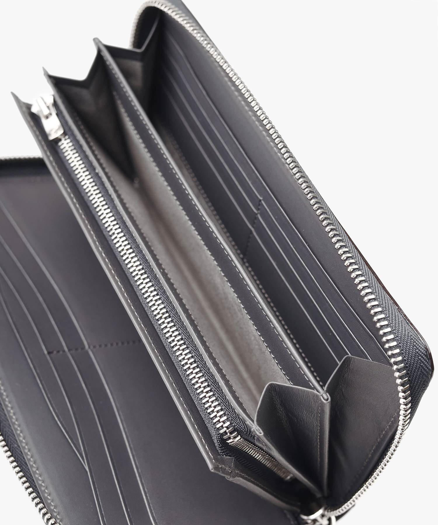 中身が見やすいフルオープンタイプのラウンドファスナー長財布です。財布を開くと、中にはずらりとカード収納類が並んでいます。