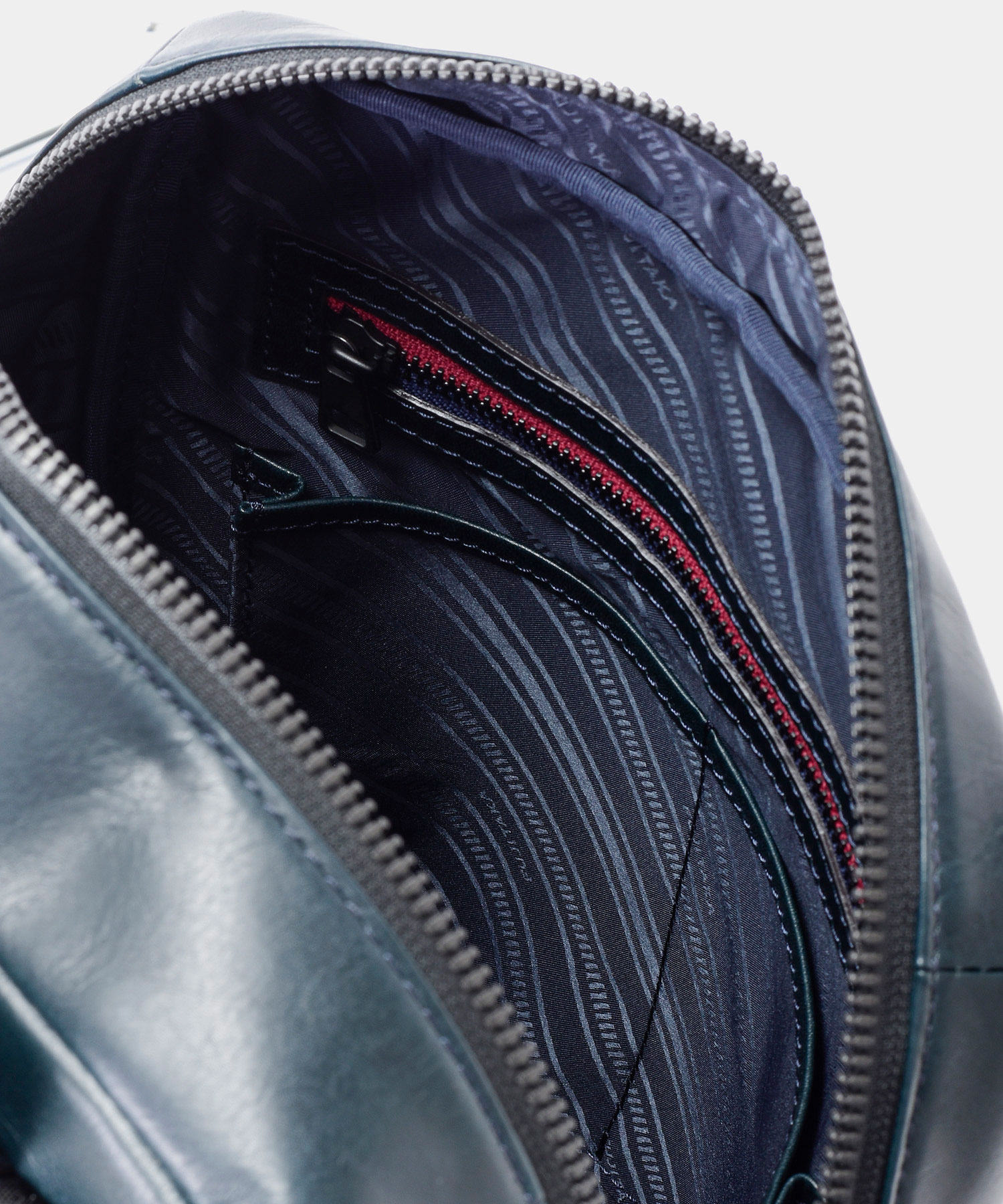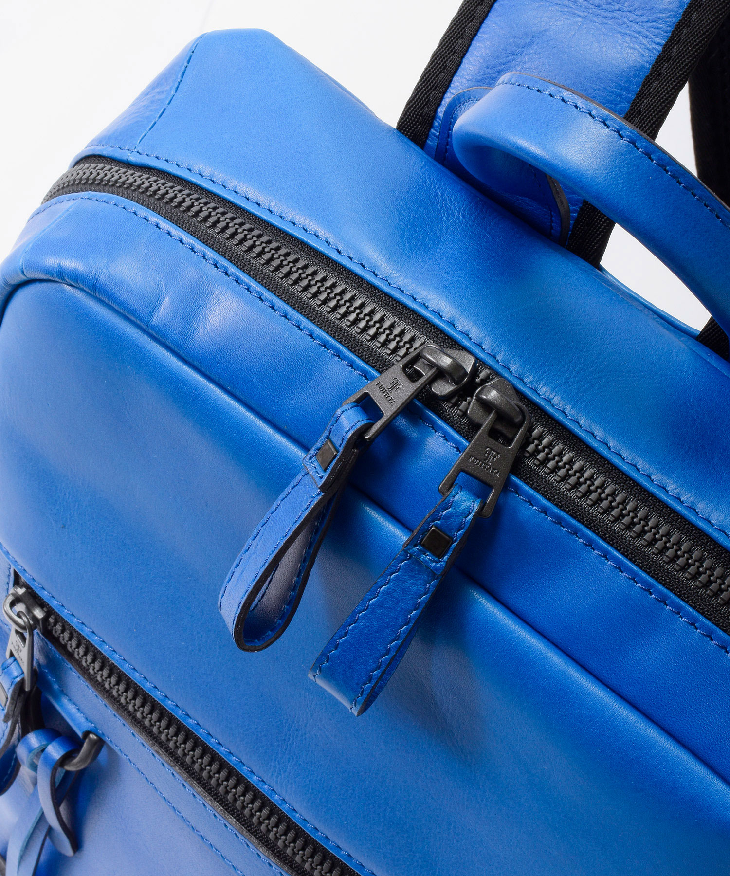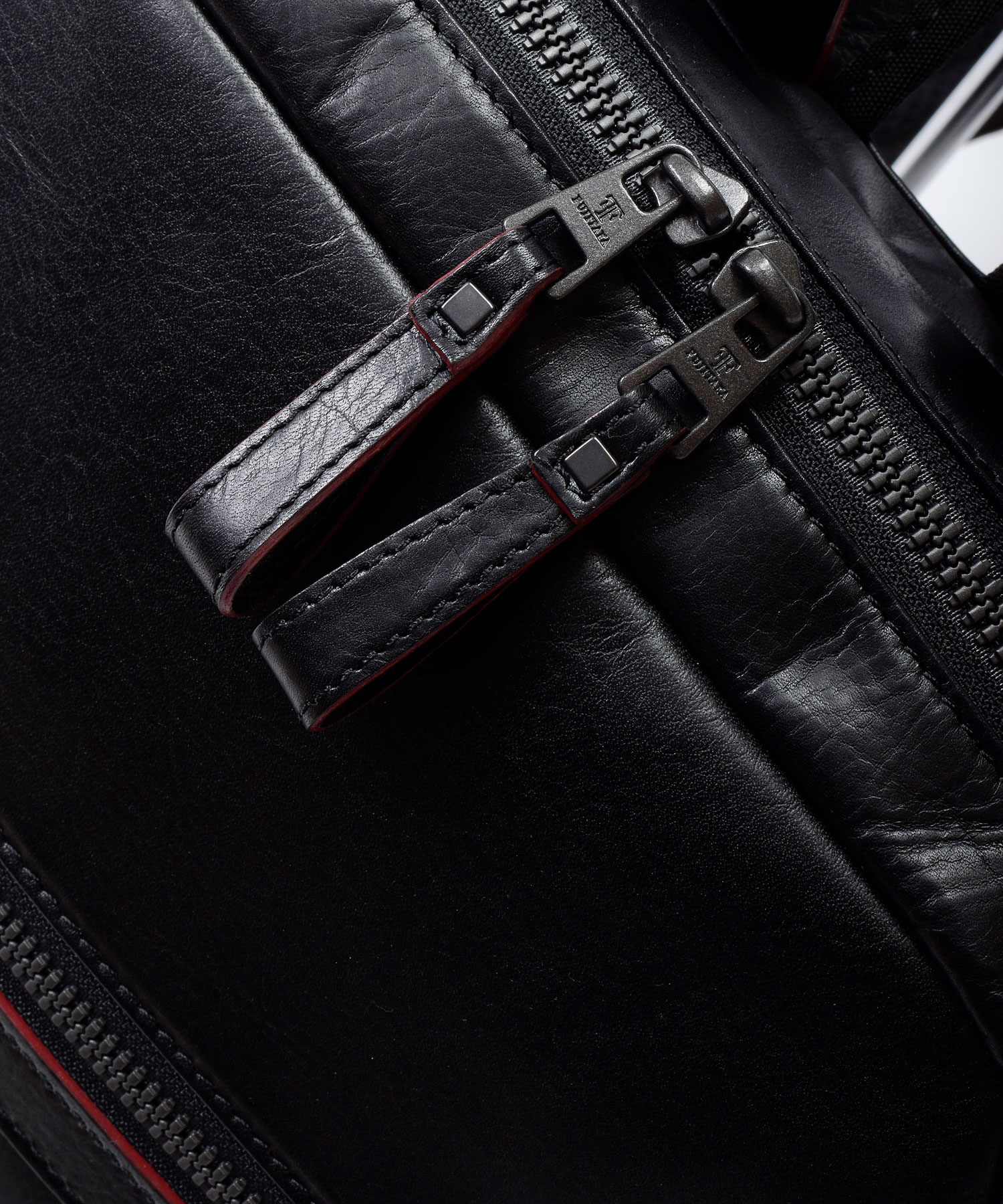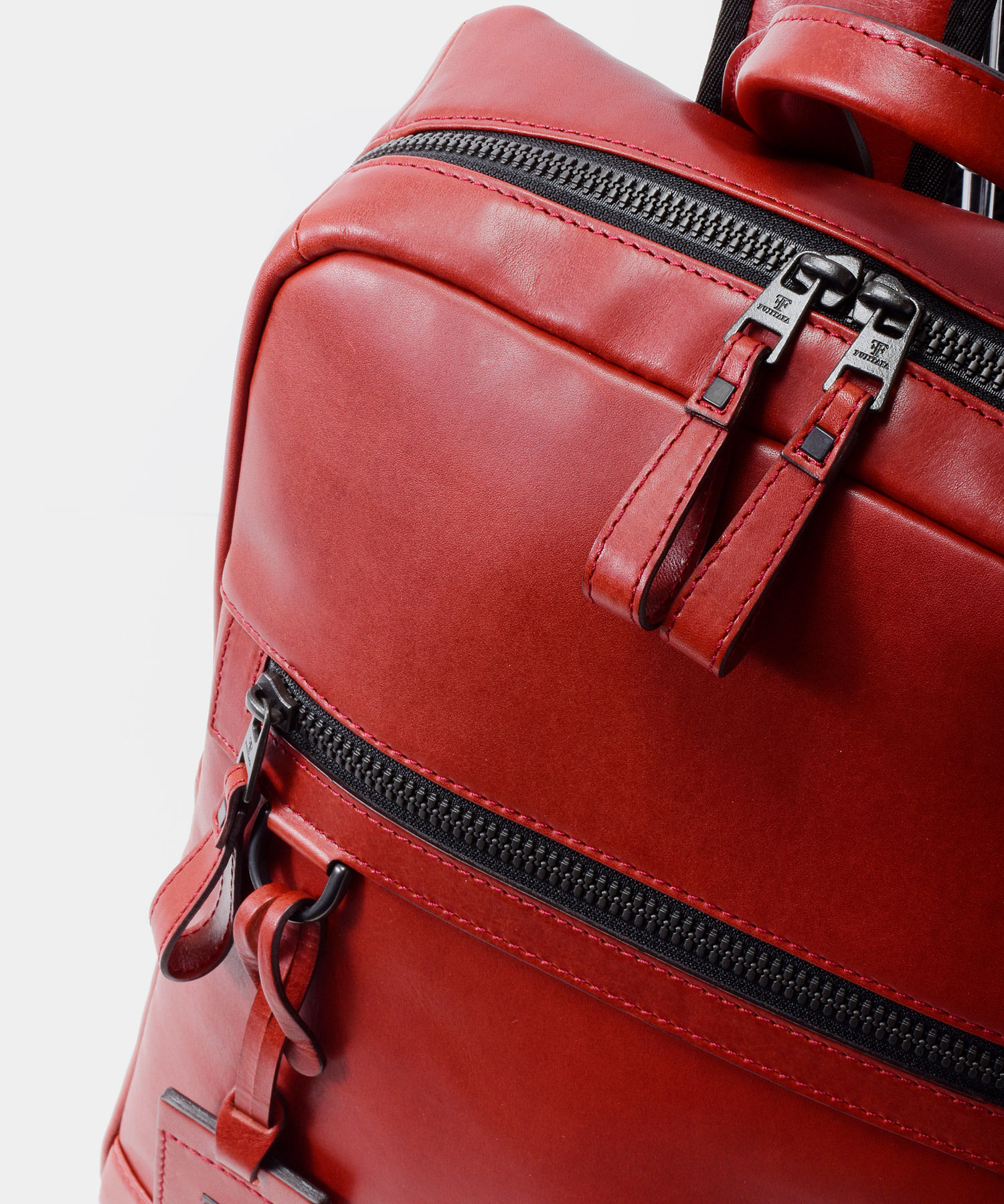 厳選された上質な原皮にオイルを含ませて、アニリン染料で染色したレザー。ブランドのコンセプトカラーでもある[日本古来の伝統色] 深い赤色と渋い藍色、そして黒色を、深みと透明感のある色合いで表現しました。地シボの凸部分を焦がしてから丁寧にこなしたソフトな革の味わいは、コシがありながらもしなやかな質感が魅力。エイジングによって、さらにツヤが増していきます。マットなブラックで統一された金具やファスナーが、モダンでクールな印象を生み出します。