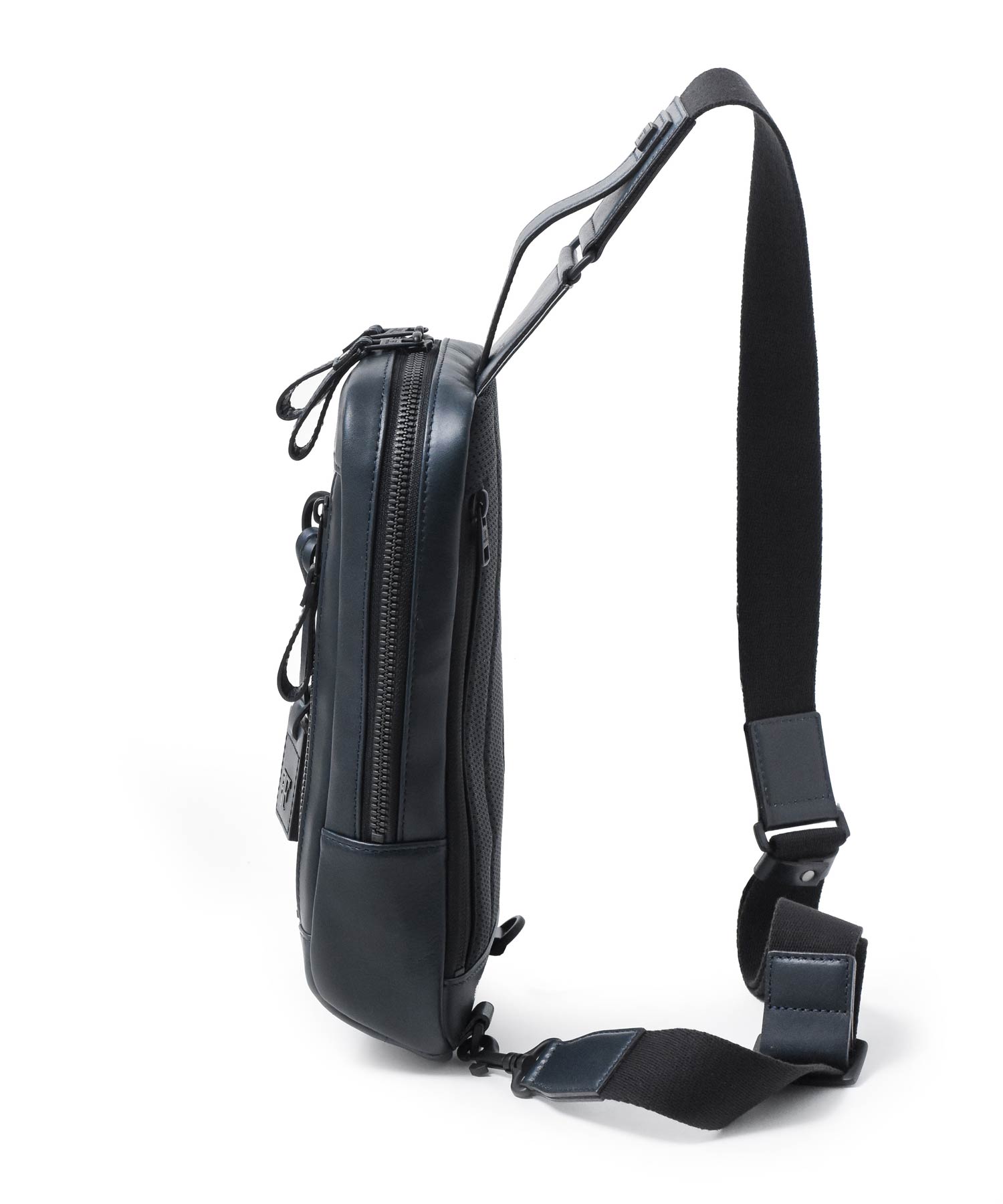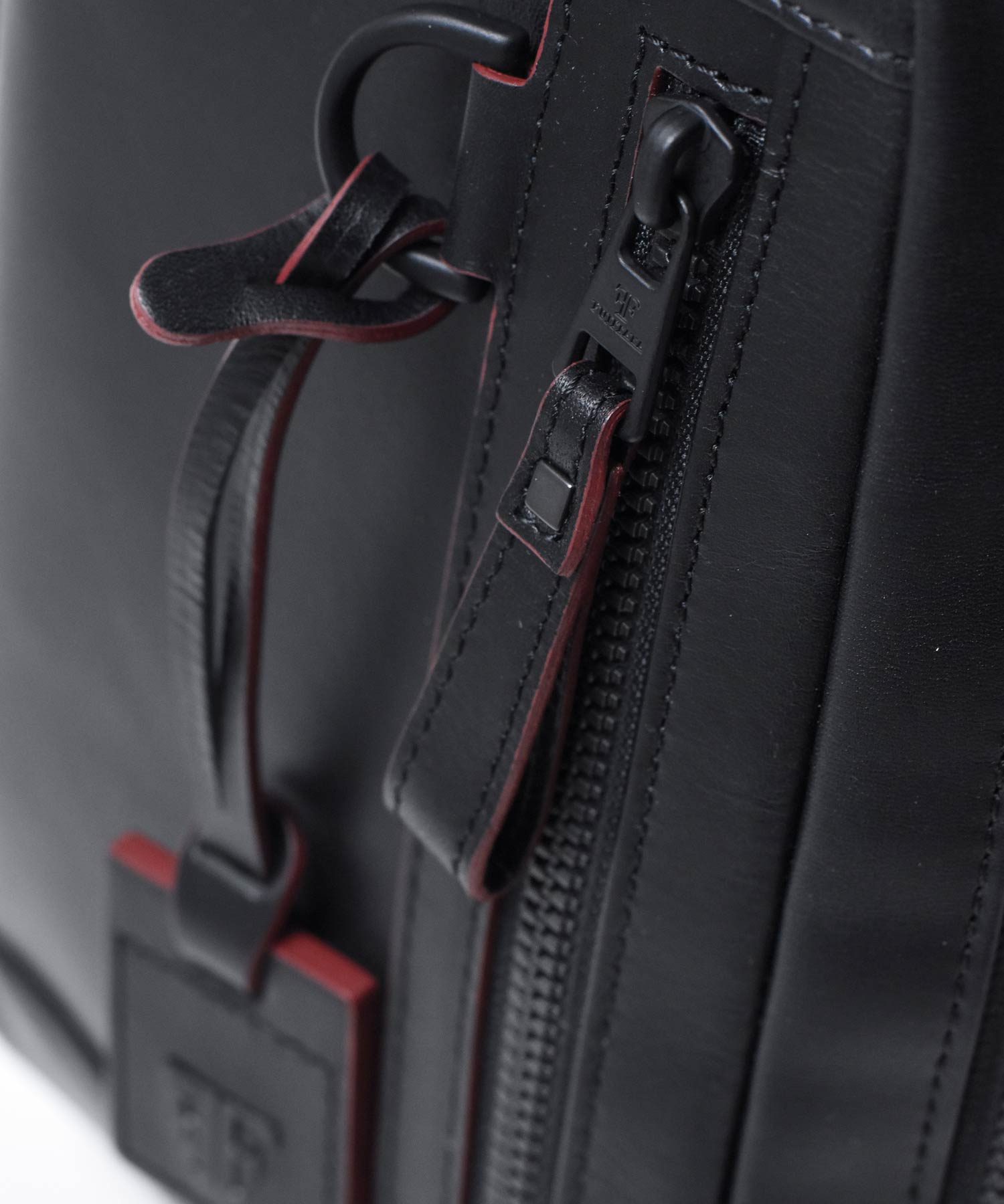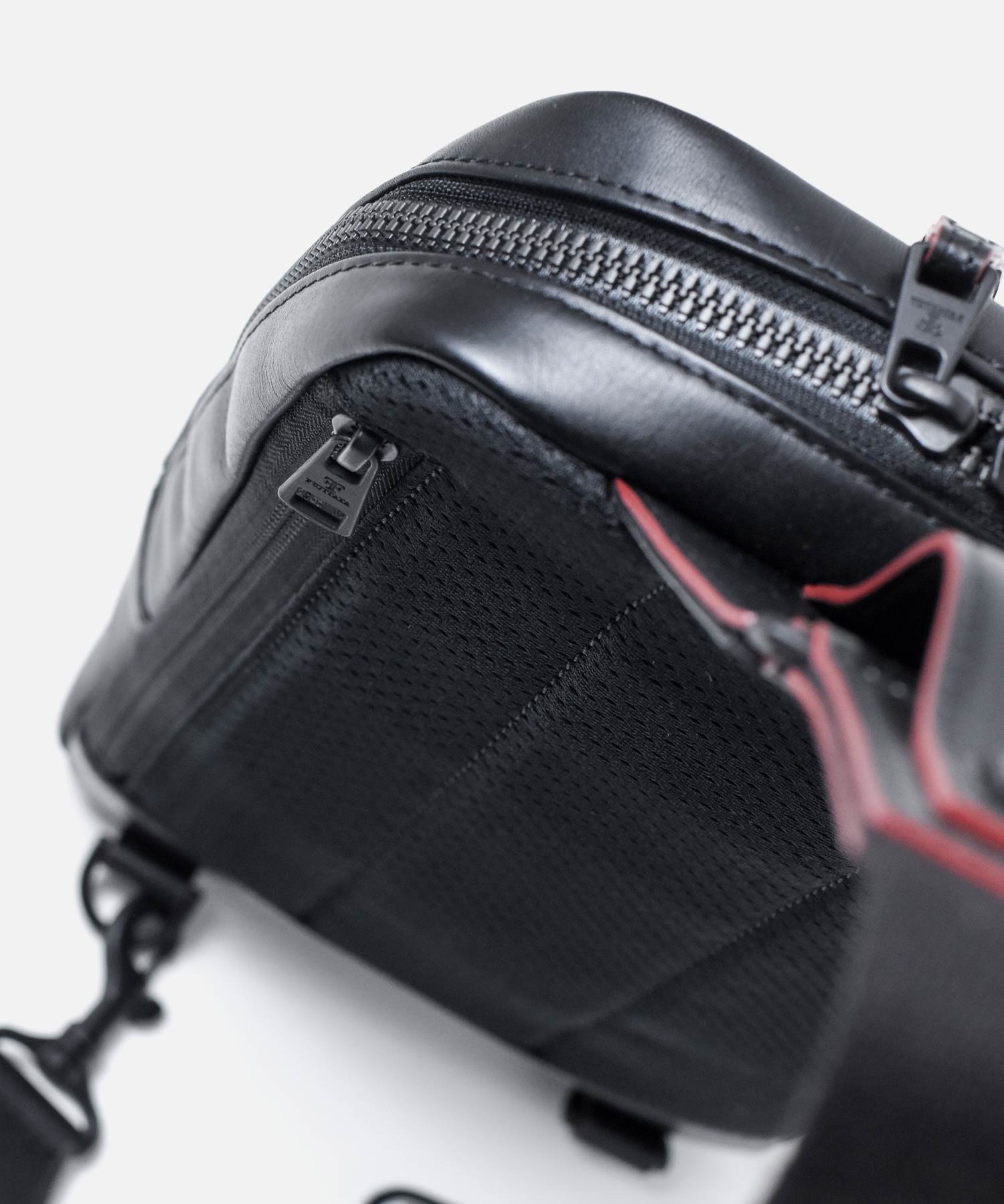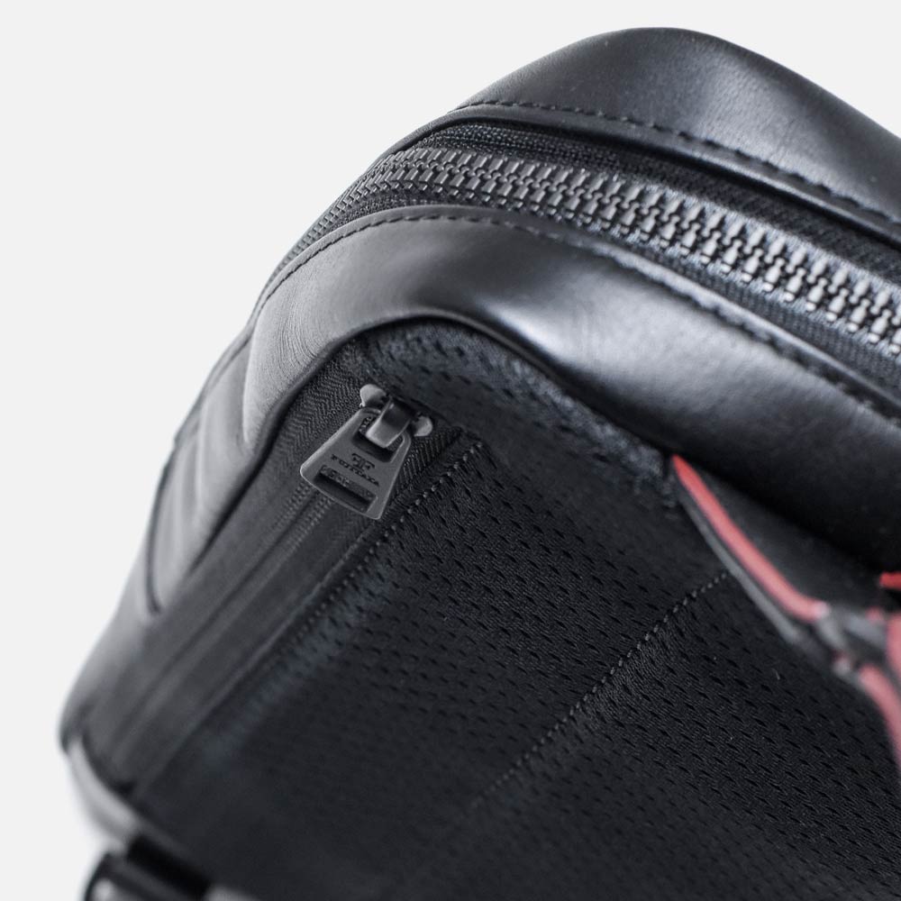マットなブラックで統一された金具やファスナーはモダンでクールな印象を生み出します。