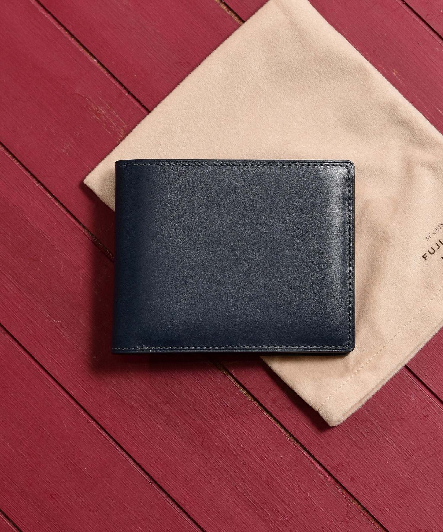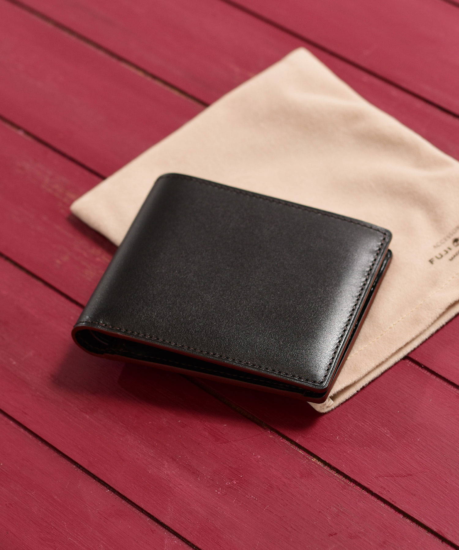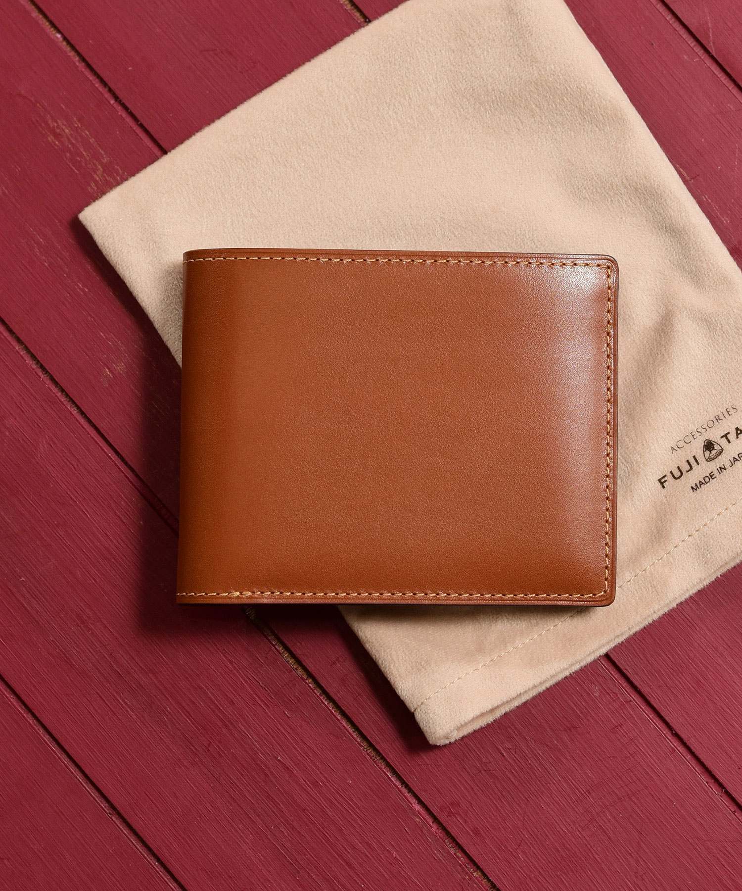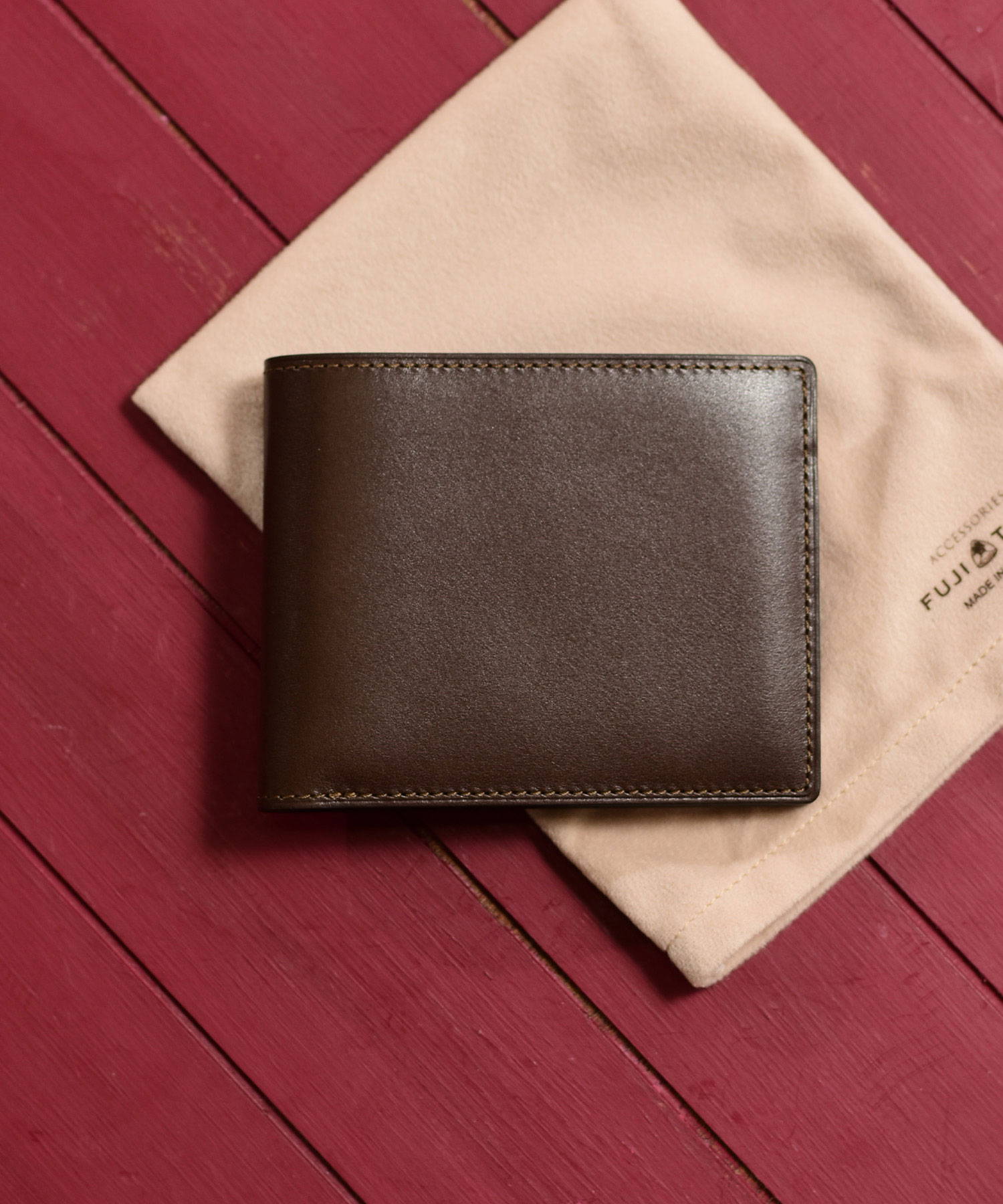 フランスデュプイ社の最高級ボックスカーフでつくられたフジタカの二つ折り財布。最高級カーフの専門タンナーであるフランスデュプイ社"シャトーブリアン"を使用し通常のボックスカーフよりも銀面が柔らかく優しいタッチ感やキメの細かい美しい肌目が魅力の二つ折り財布です。