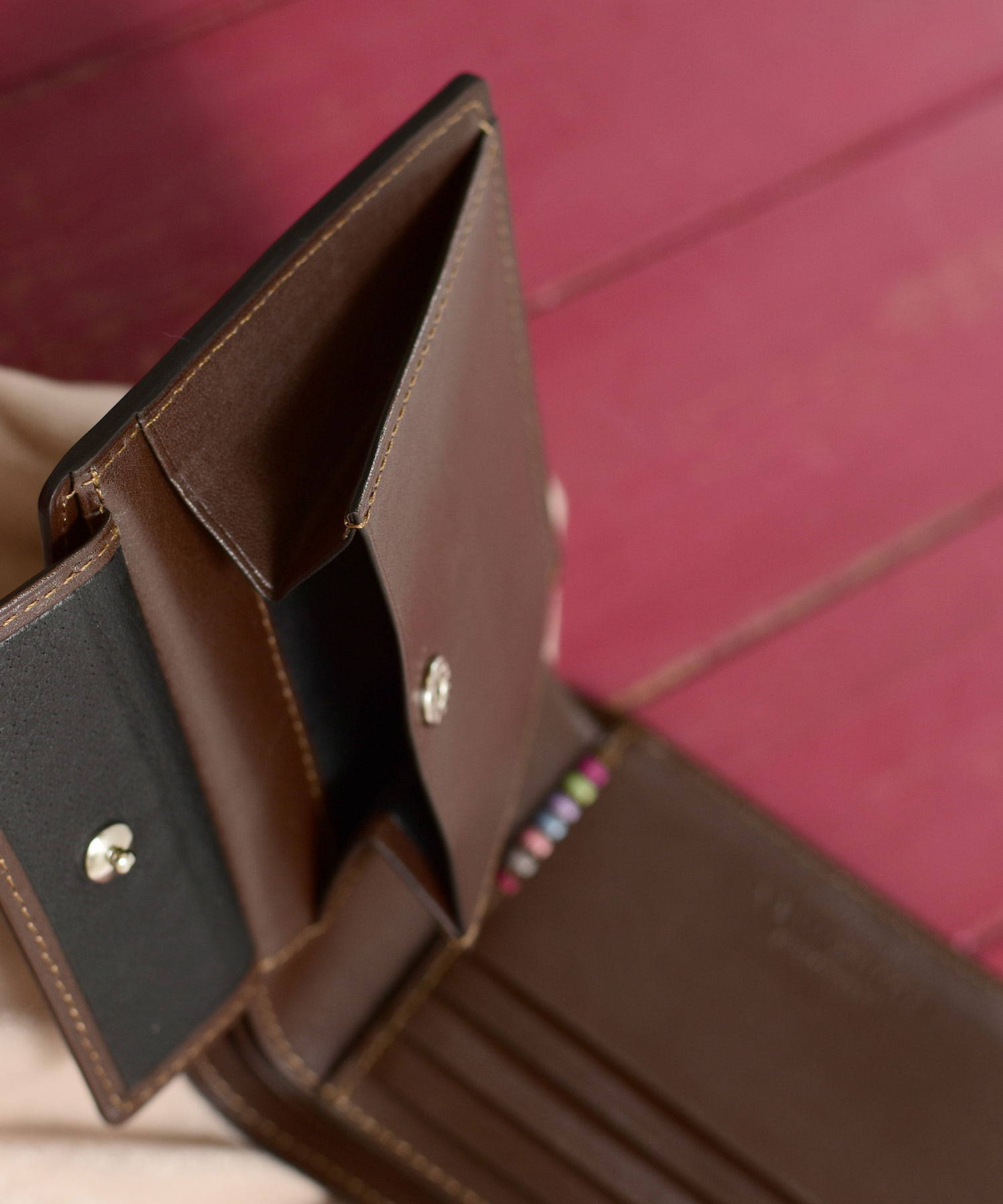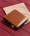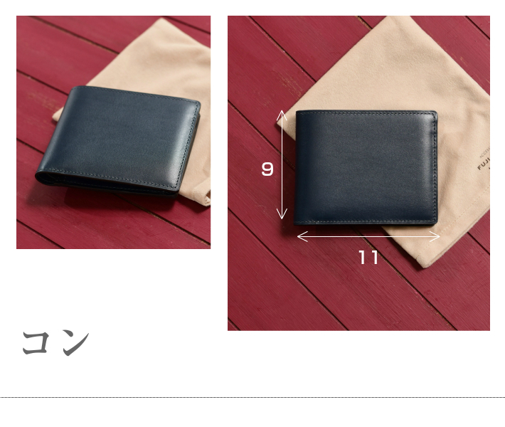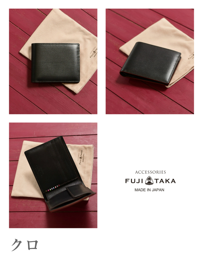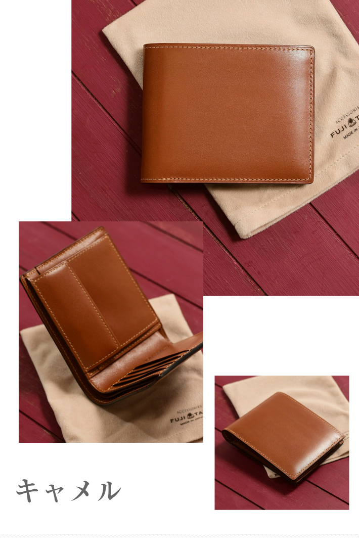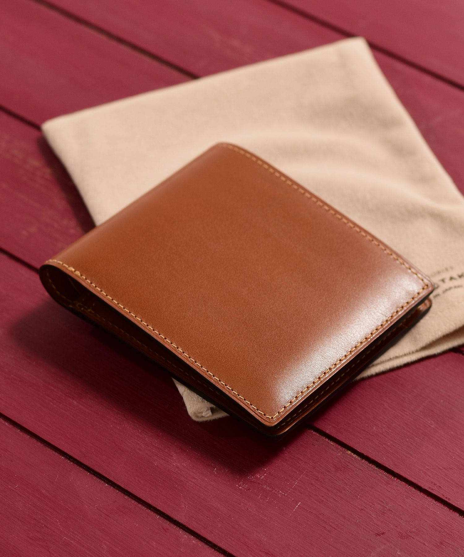 フランスデュプイ社の最高級ボックスカーフでつくられたフジタカの二つ折り財布。最高級カーフの専門タンナーであるフランスデュプイ社"シャトーブリアン"を使用し通常のボックスカーフよりも銀面が柔らかく優しいタッチ感やキメの細かい美しい肌目が魅力の二つ折り財布です。