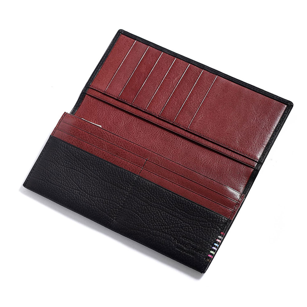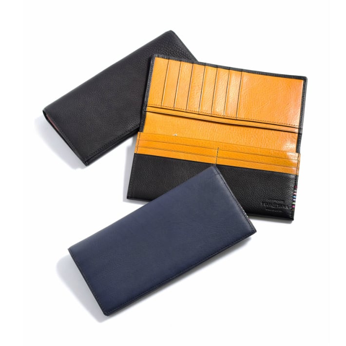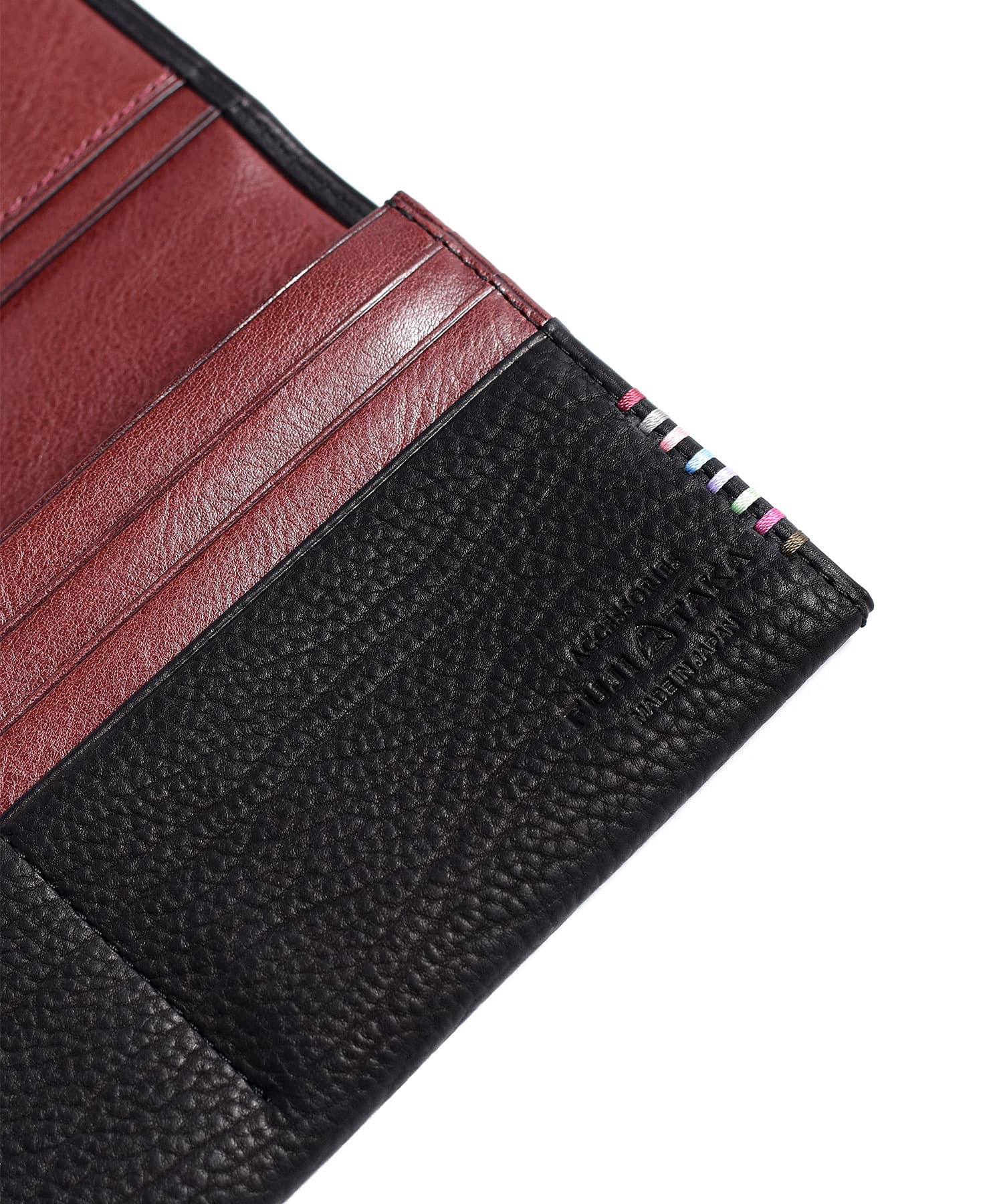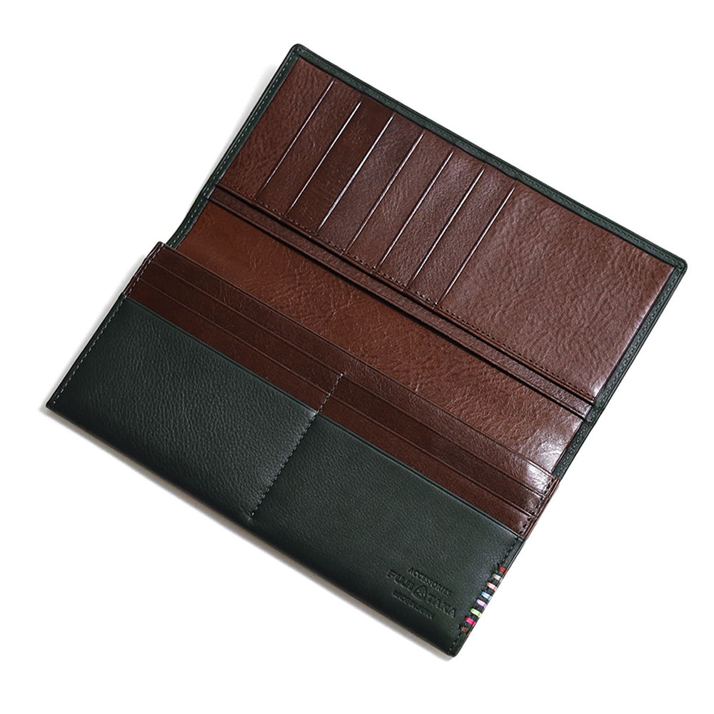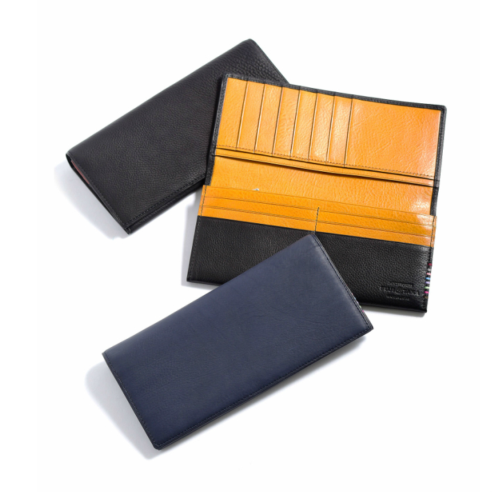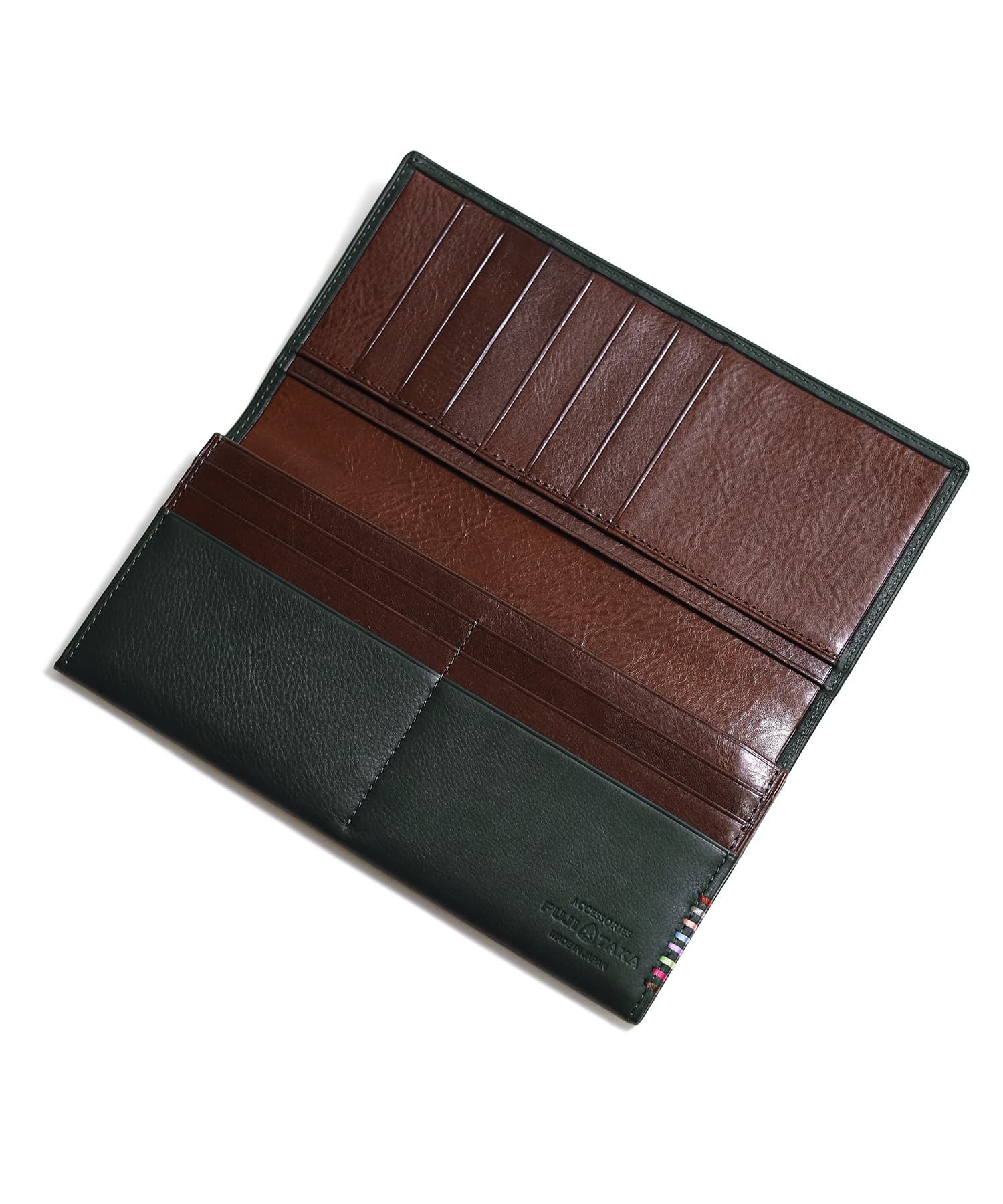 国産カーフ×イタリアンレザーのコンビネーションで仕上げられたFUJITAKA ACCESSORIESのバイカラーデザインが美しい長財布。フジタカのイメージカラーのかがりステッチがデザインのワンポイント。日本独特の優しい色合いがお手元をさりげなく彩ります。
