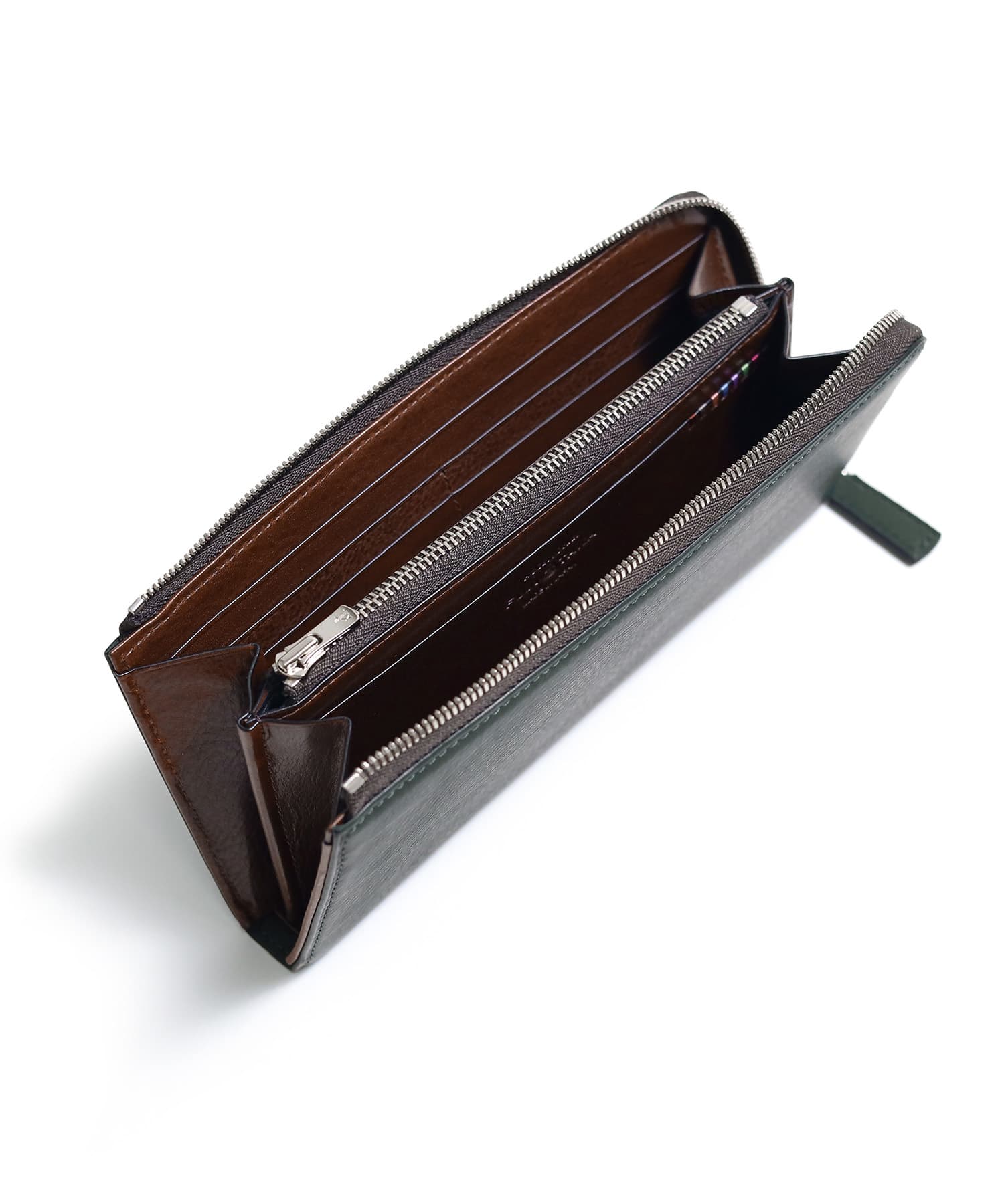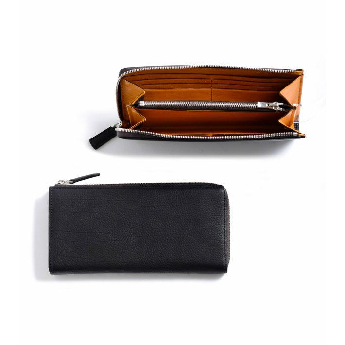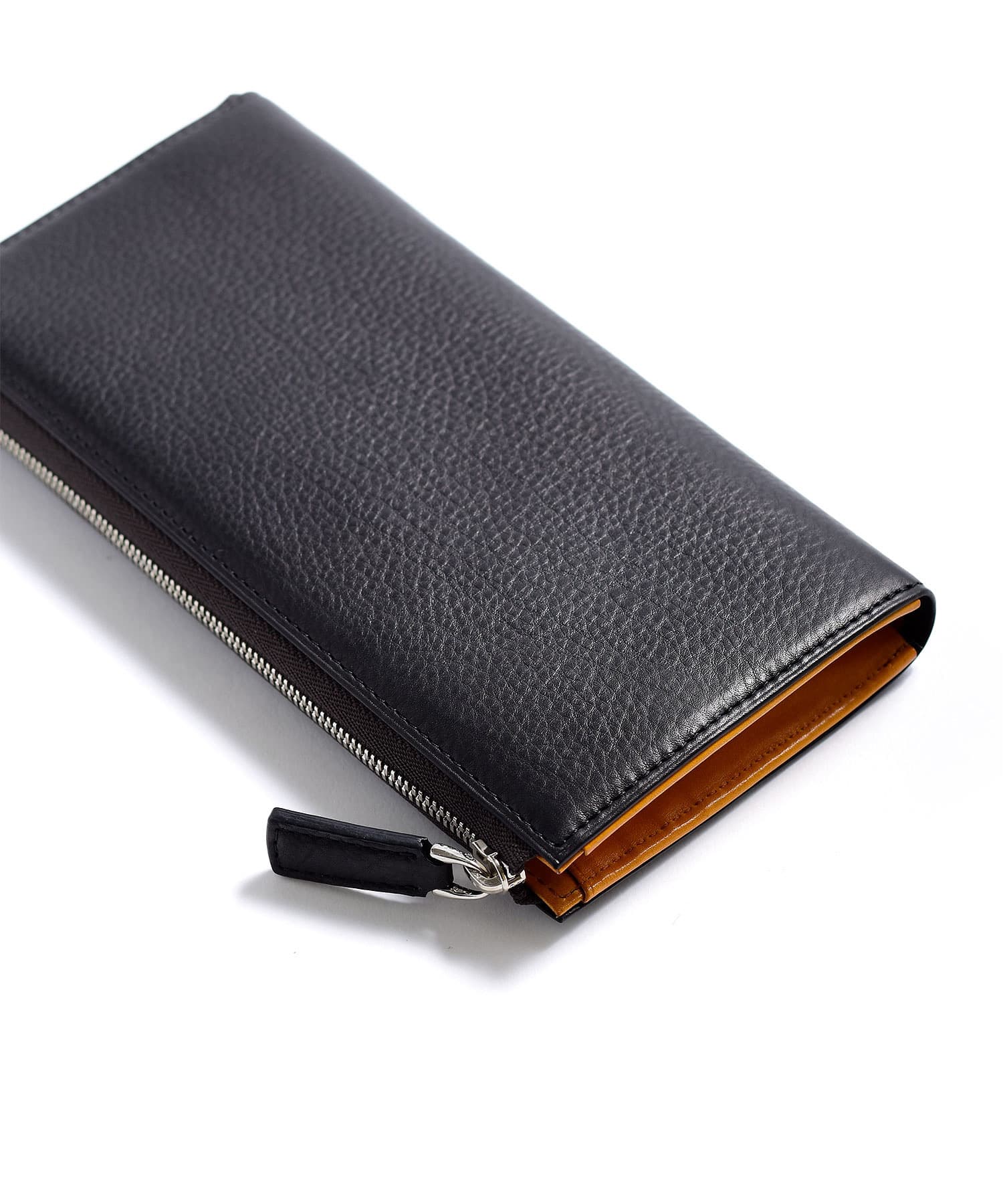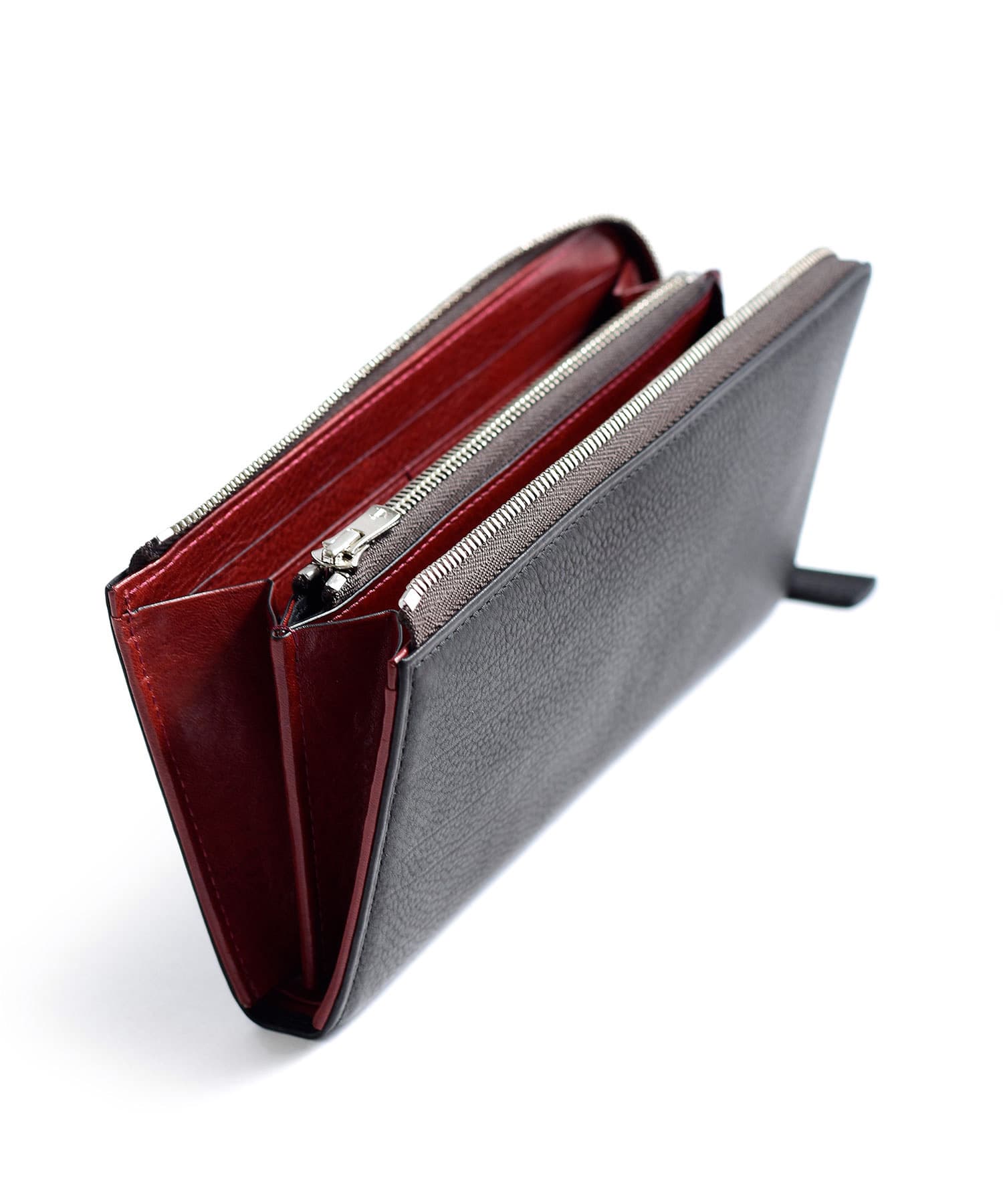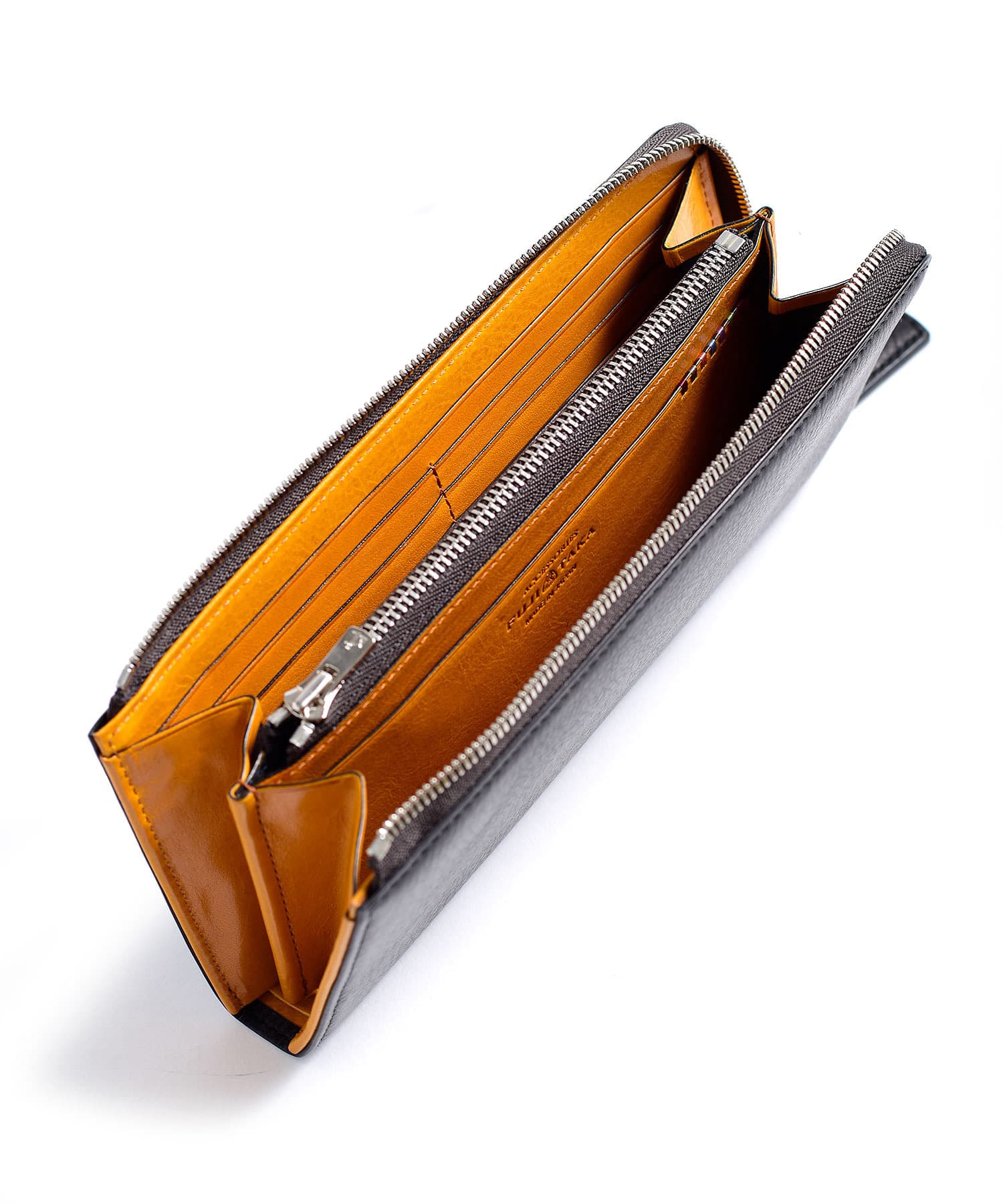 国産カーフ×イタリアンレザーのコラボレーション小物。外革と内革のバイカラーのデザインが美しいL字ファスナータイプの長財布です。