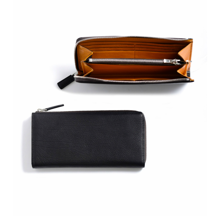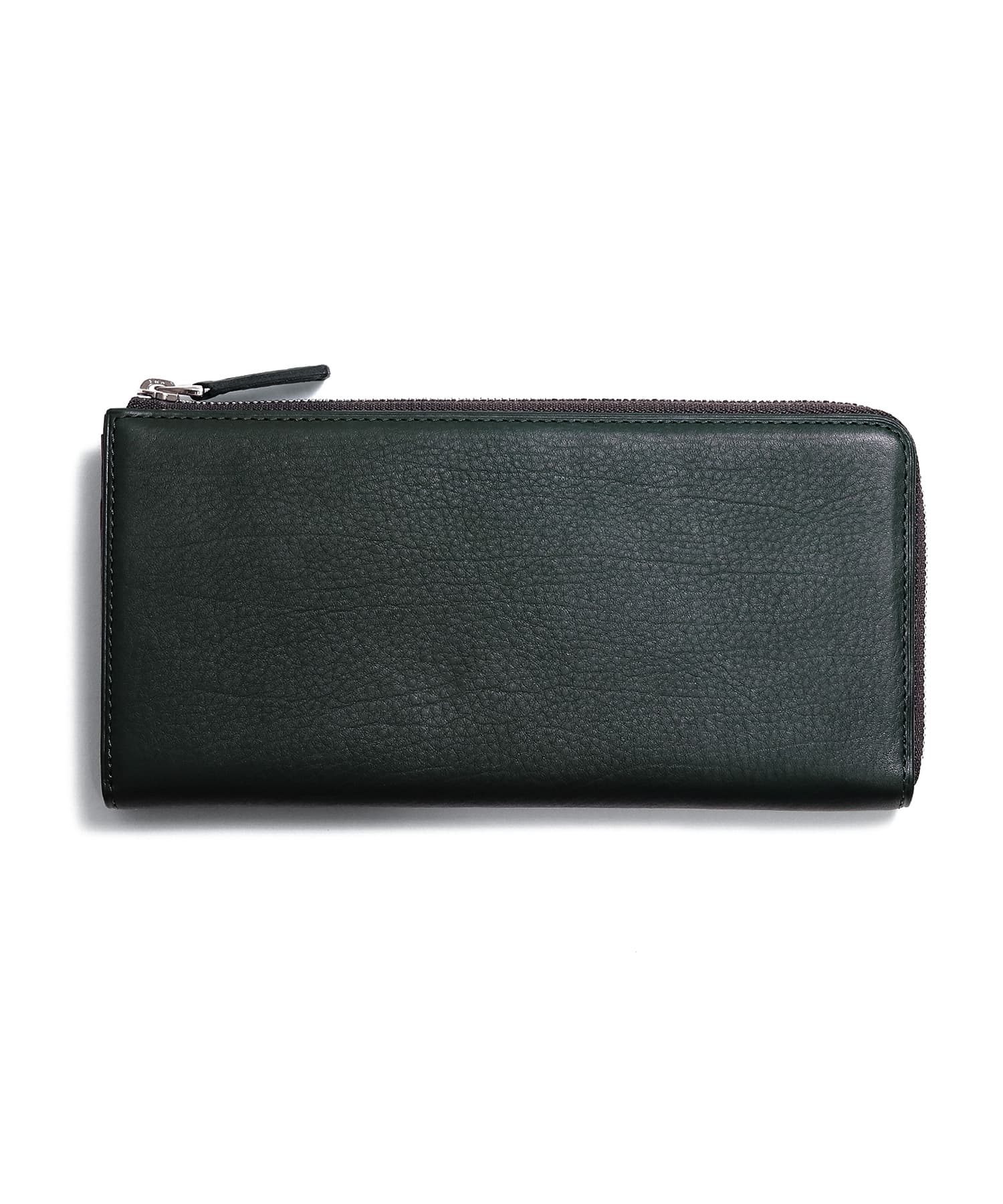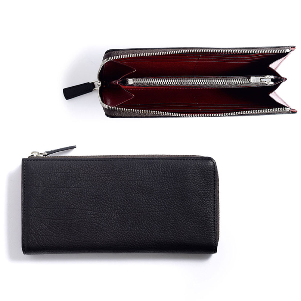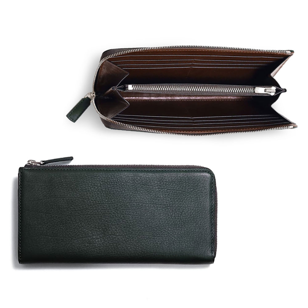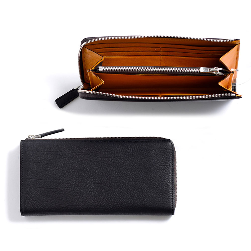 国産カーフ×イタリアンレザーのコラボレーション小物。外革と内革のバイカラーのデザインが美しいL字ファスナータイプの長財布です。