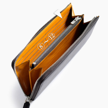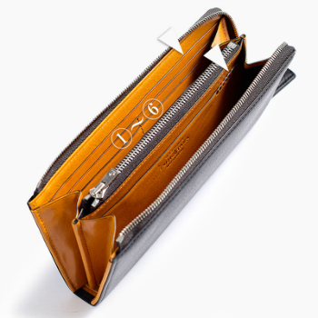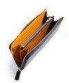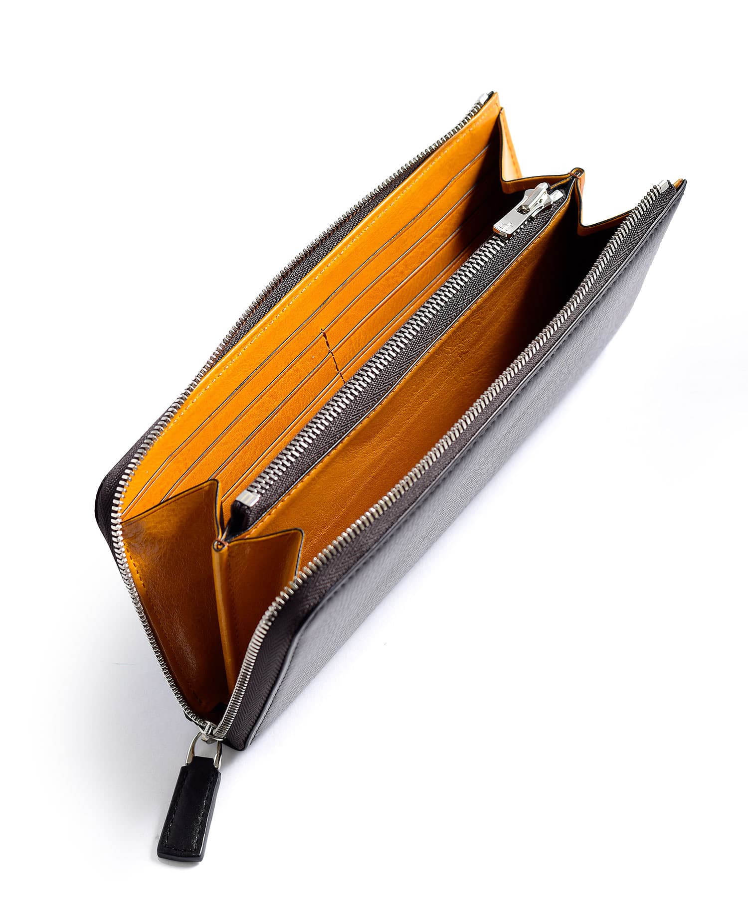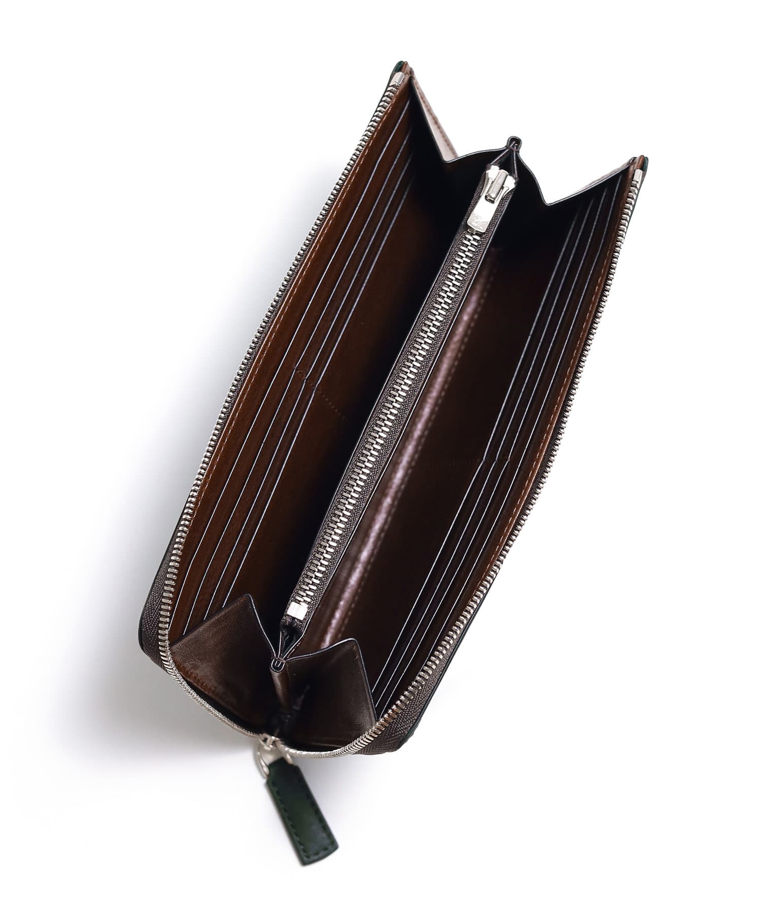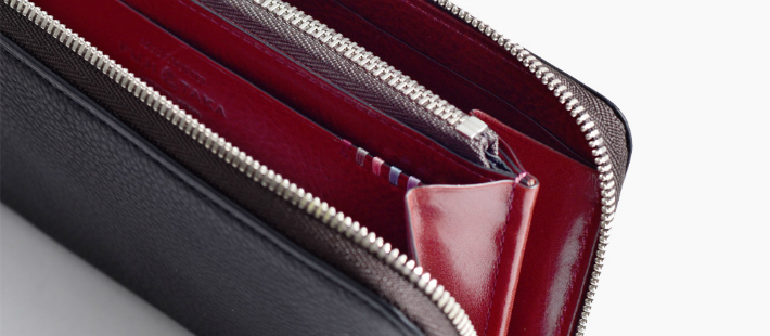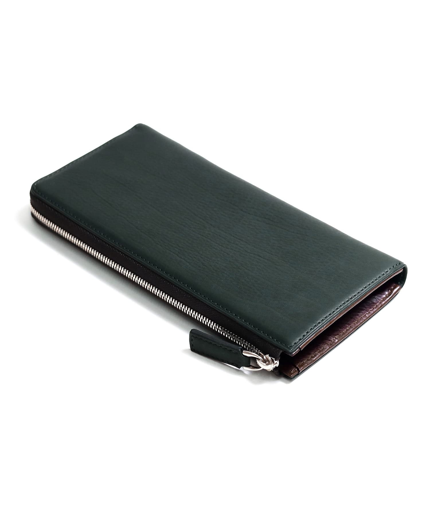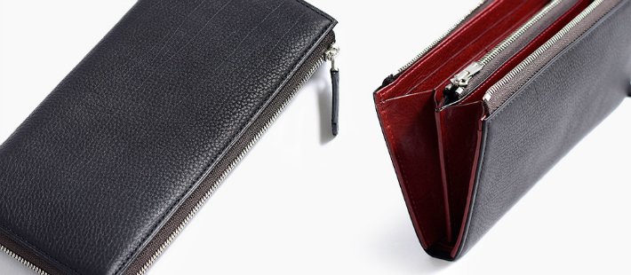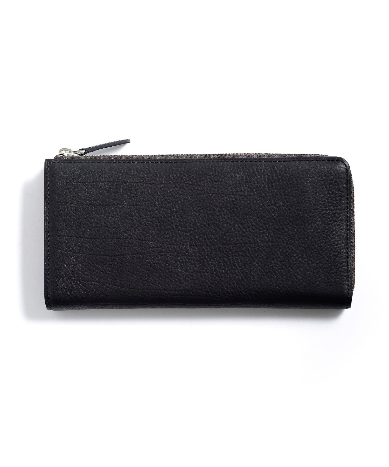 国産カーフ×イタリアンレザーのコラボレーション小物。外革と内革のバイカラーのデザインが美しいL字ファスナータイプの長財布です。