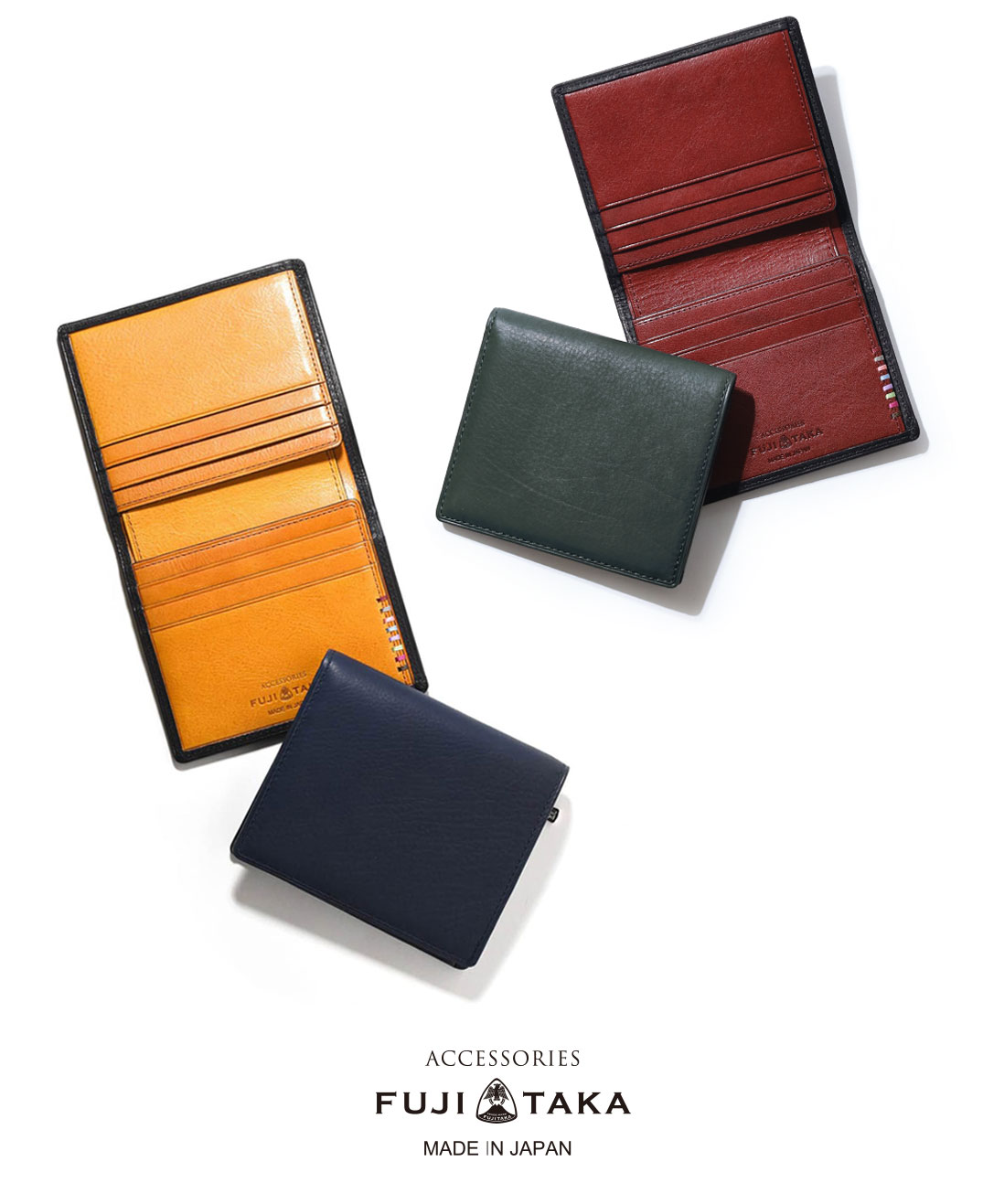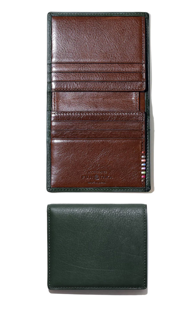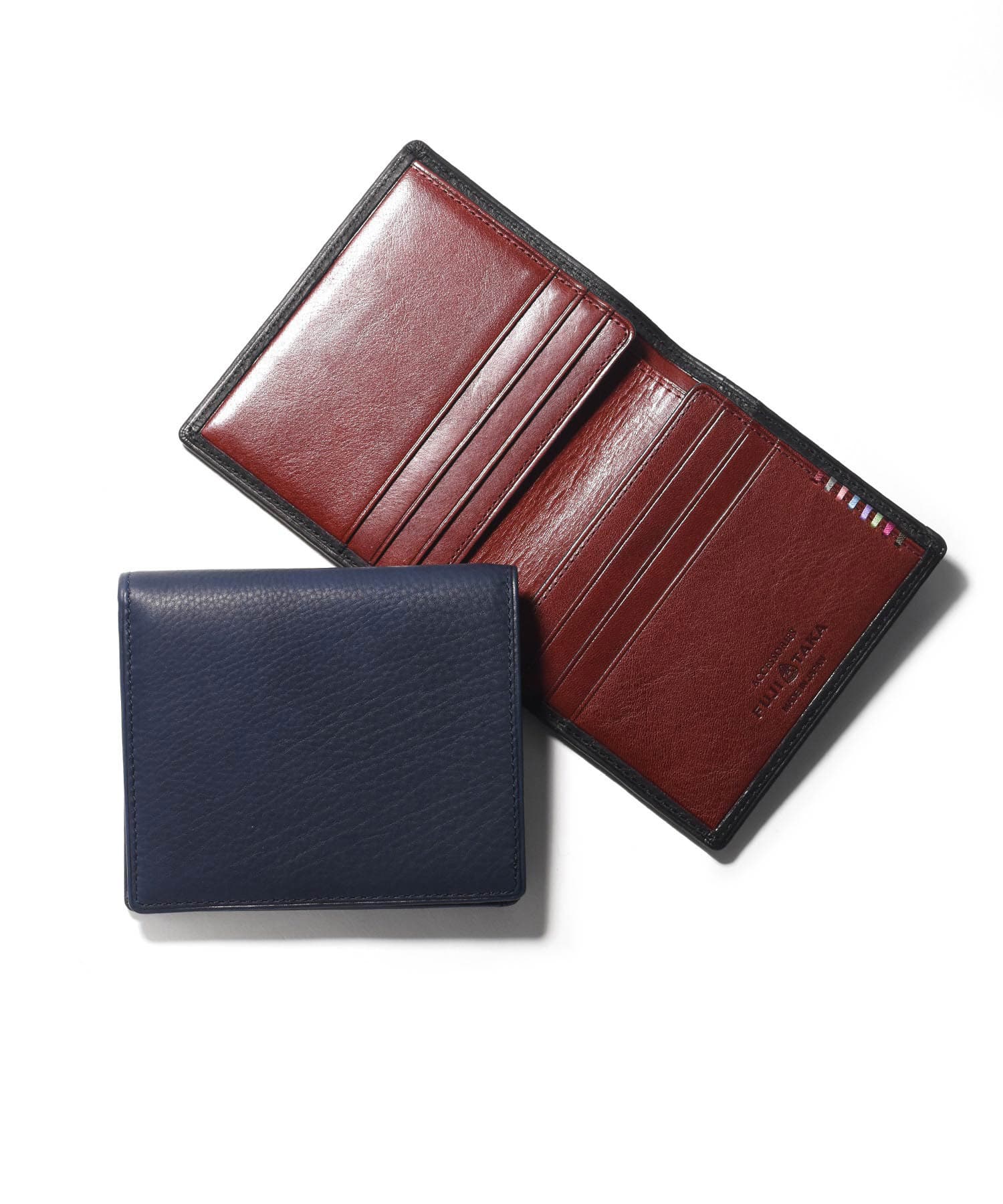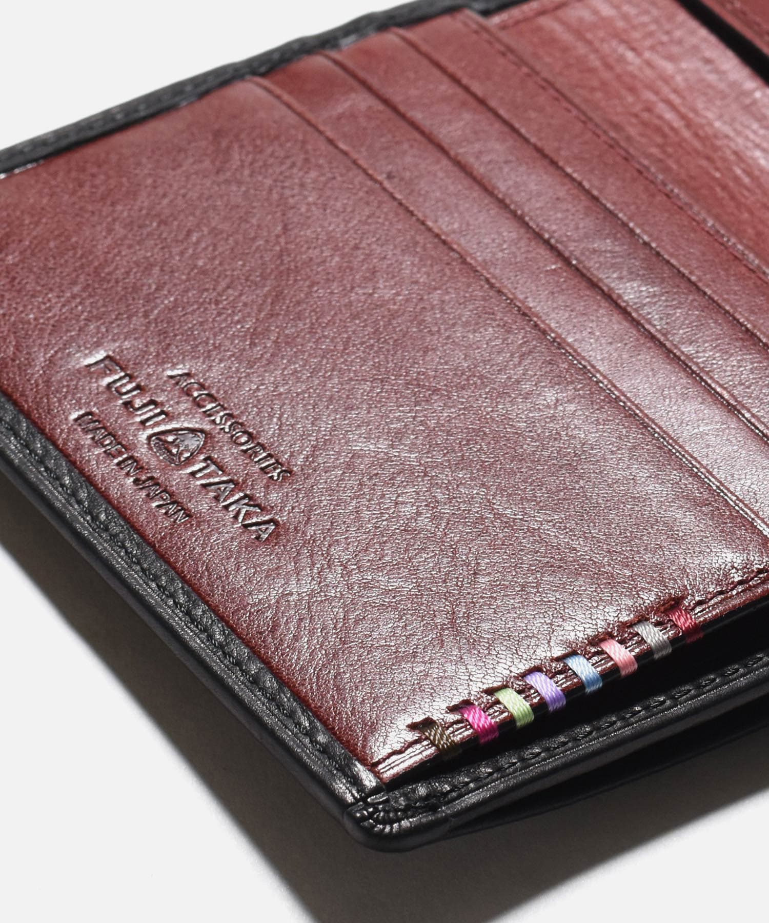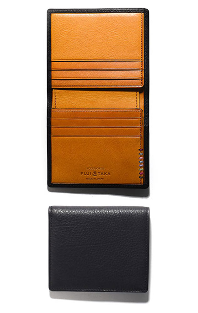 国産カーフ×イタリアンレザーのコラボレーション小物。 外革と内革のバイカラーのデザインが美しいフジタカアクセサリーズのコンパクトな二つ折り財布。