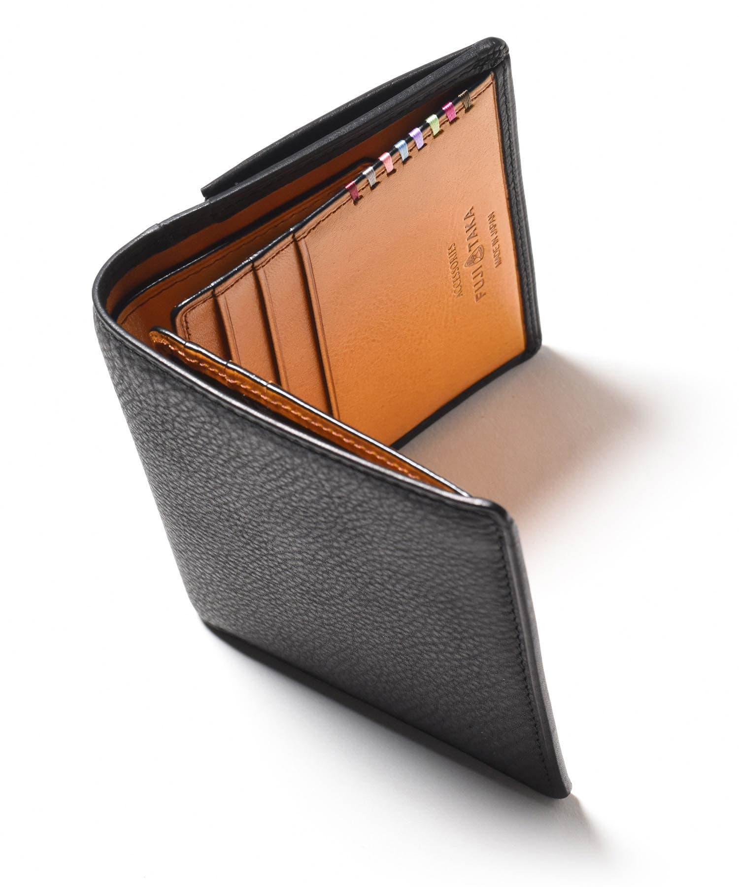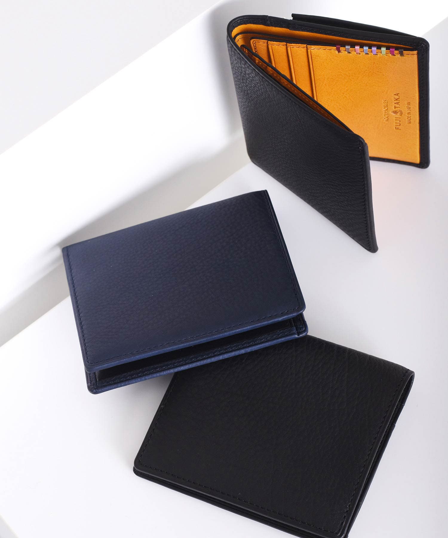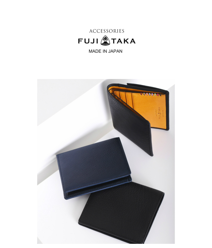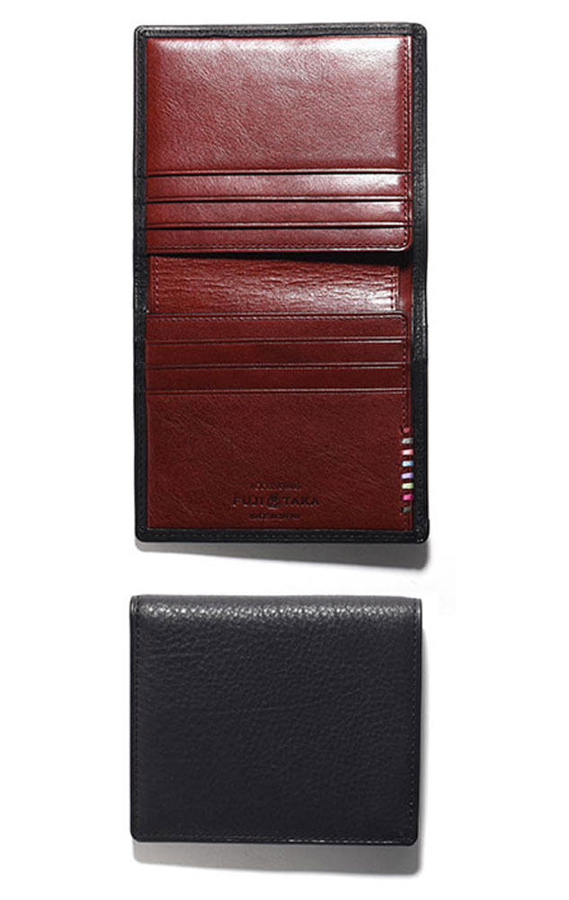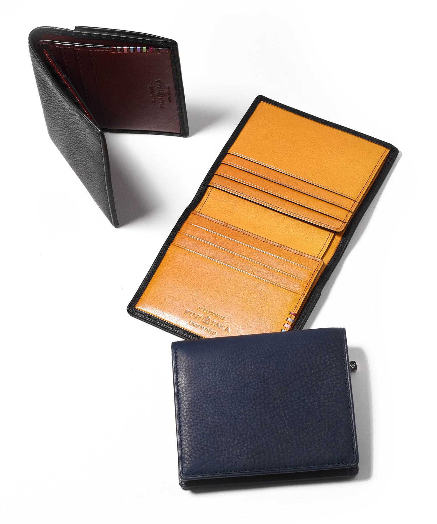 国産カーフ×イタリアンレザーのコラボレーション小物。 外革と内革のバイカラーのデザインが美しいフジタカアクセサリーズのコンパクトな二つ折り財布。