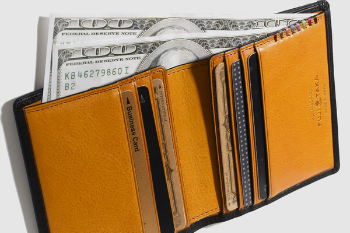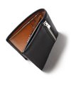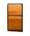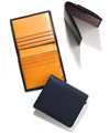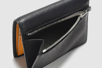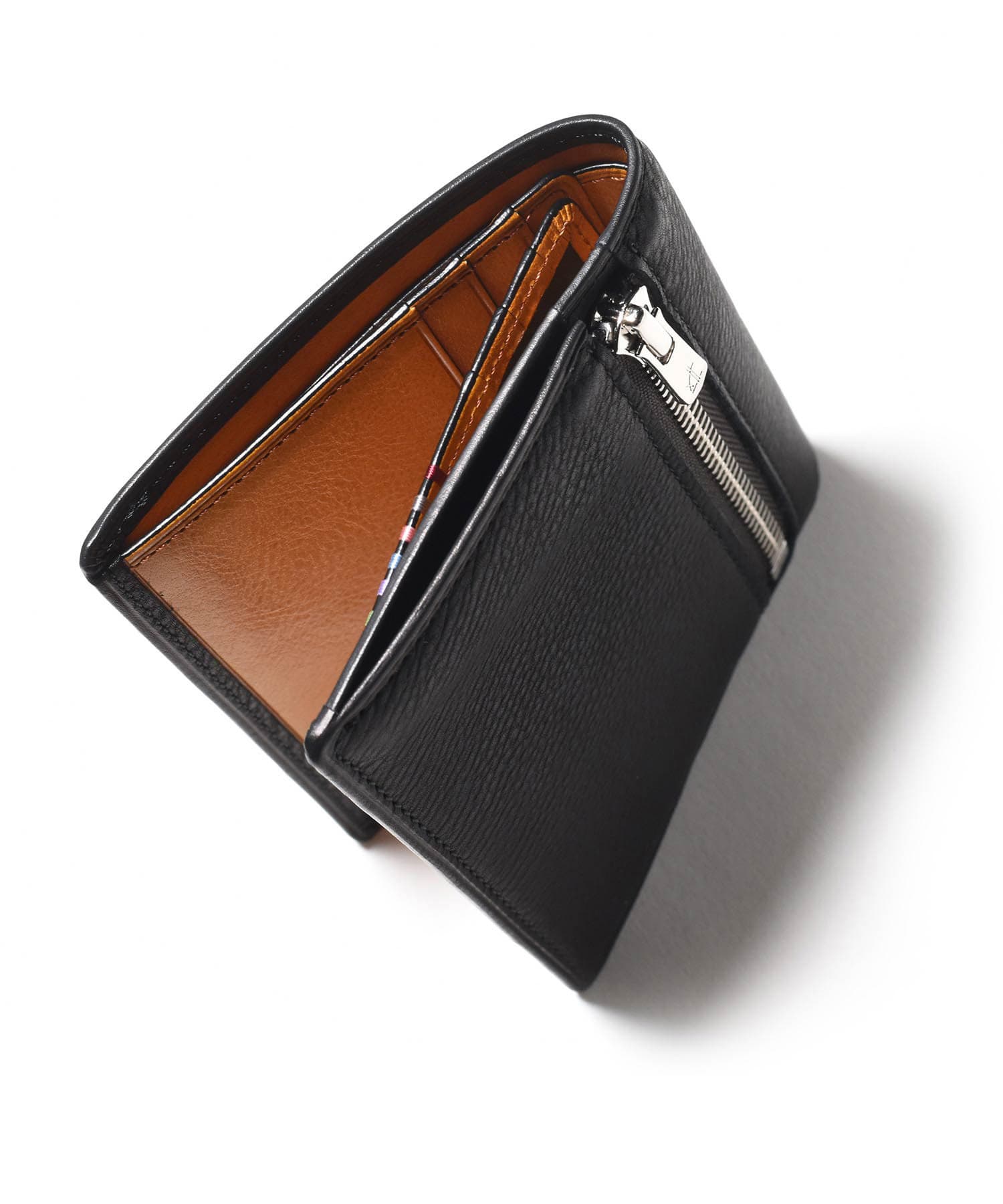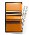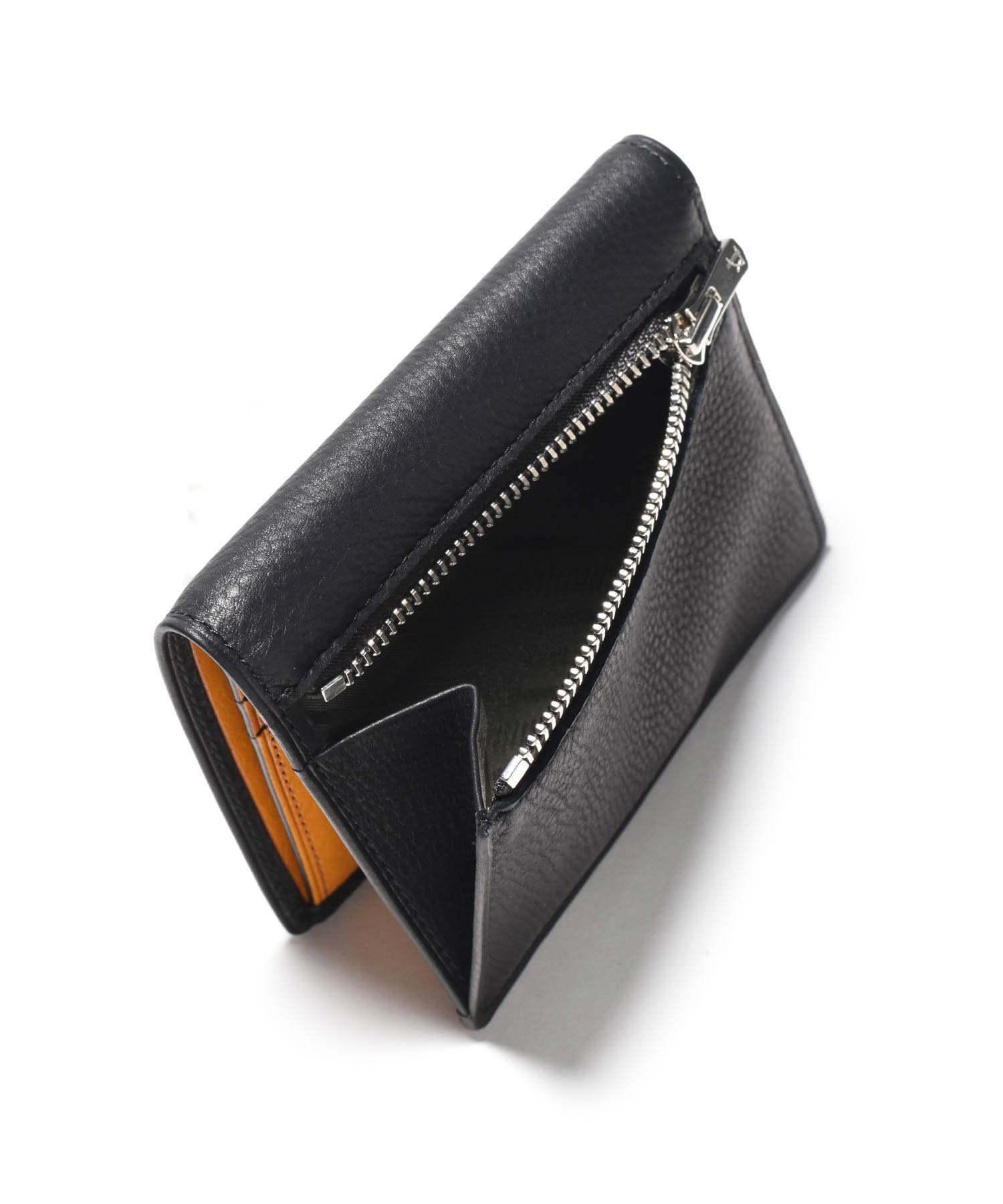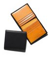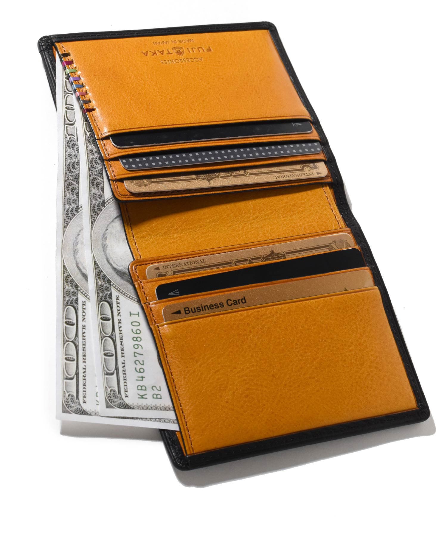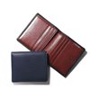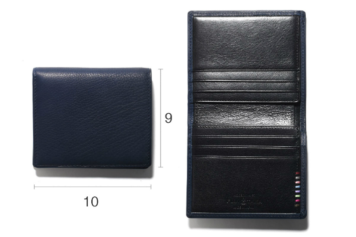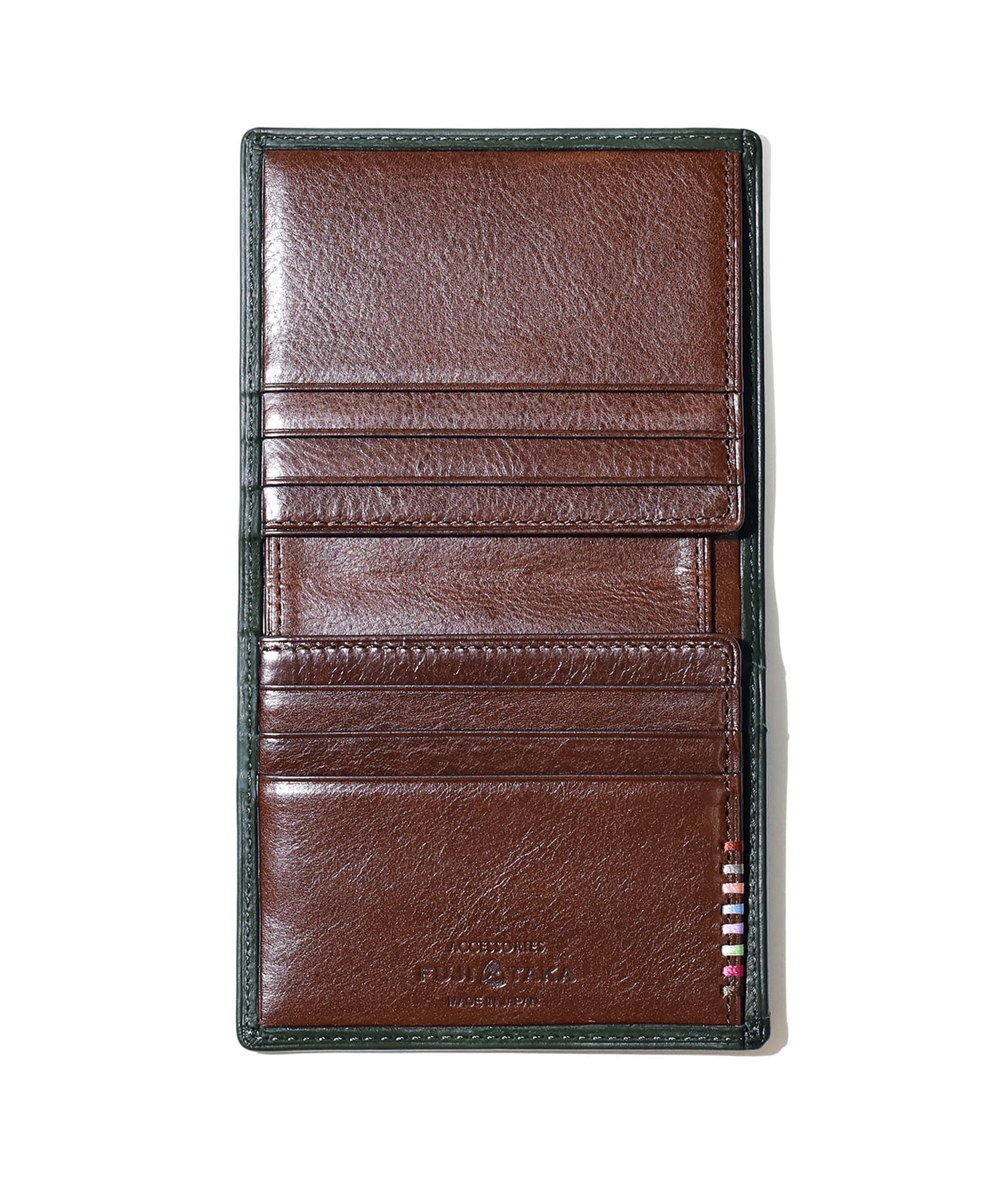 国産カーフ×イタリアンレザーのコラボレーション小物。 外革と内革のバイカラーのデザインが美しいフジタカアクセサリーズのコンパクトな二つ折り財布。