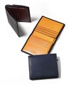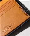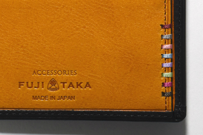 国産カーフ×イタリアンレザーのコンビネーションで仕上げられたフジタカアクセサリーズのバイカラーデザインが美しいコンパクトな二つ折り財布。フジタカのイメージカラーをかがりステッチで表現。日本独特の優しい色合いがお手元をさりげなく彩ります。