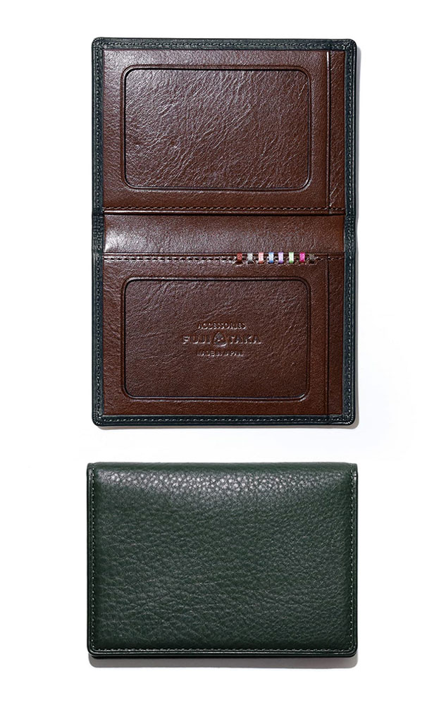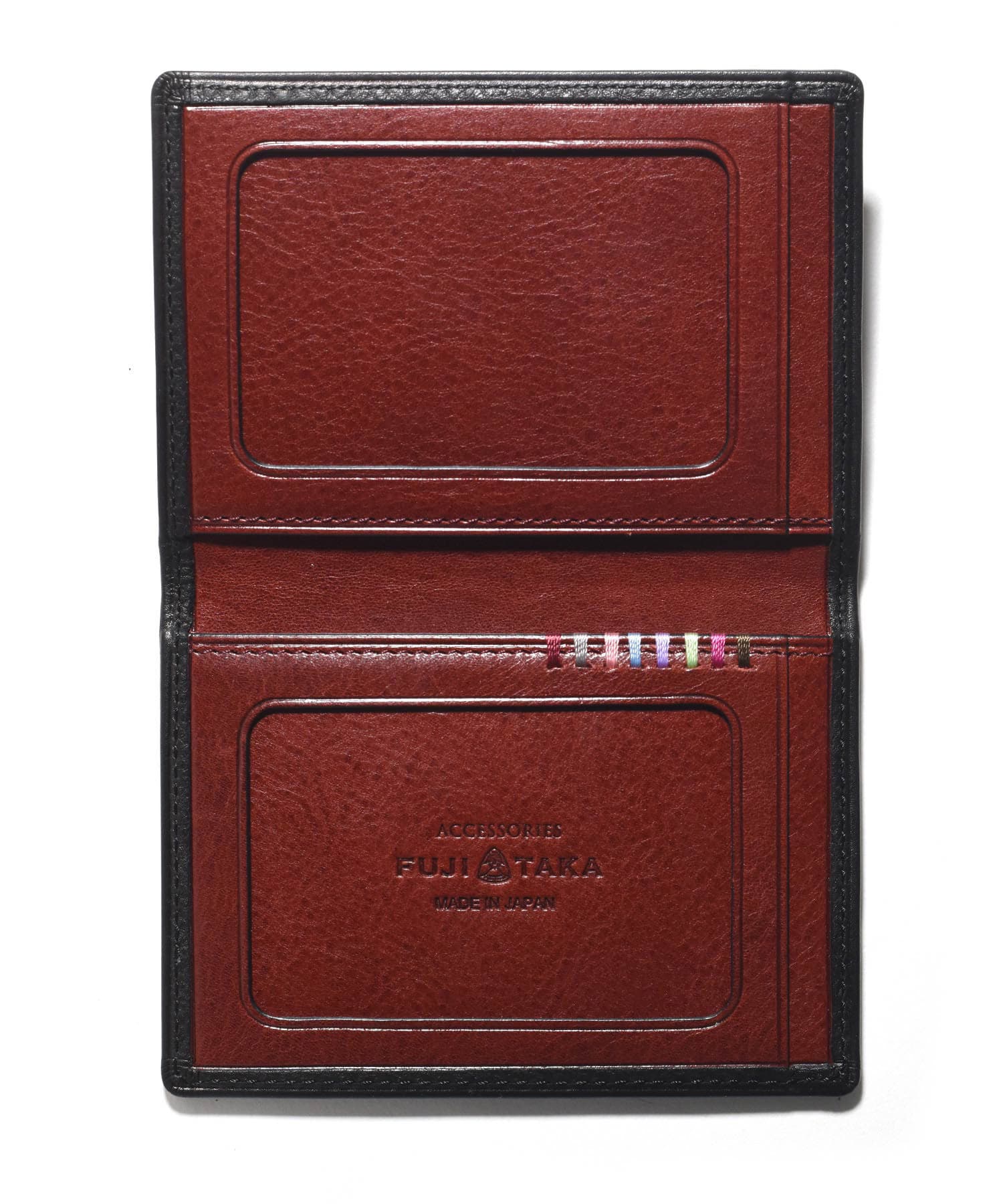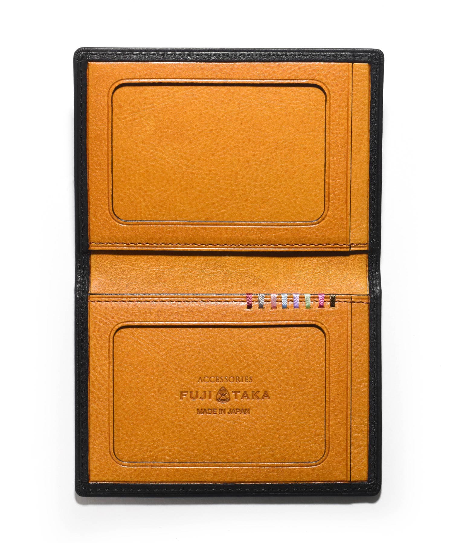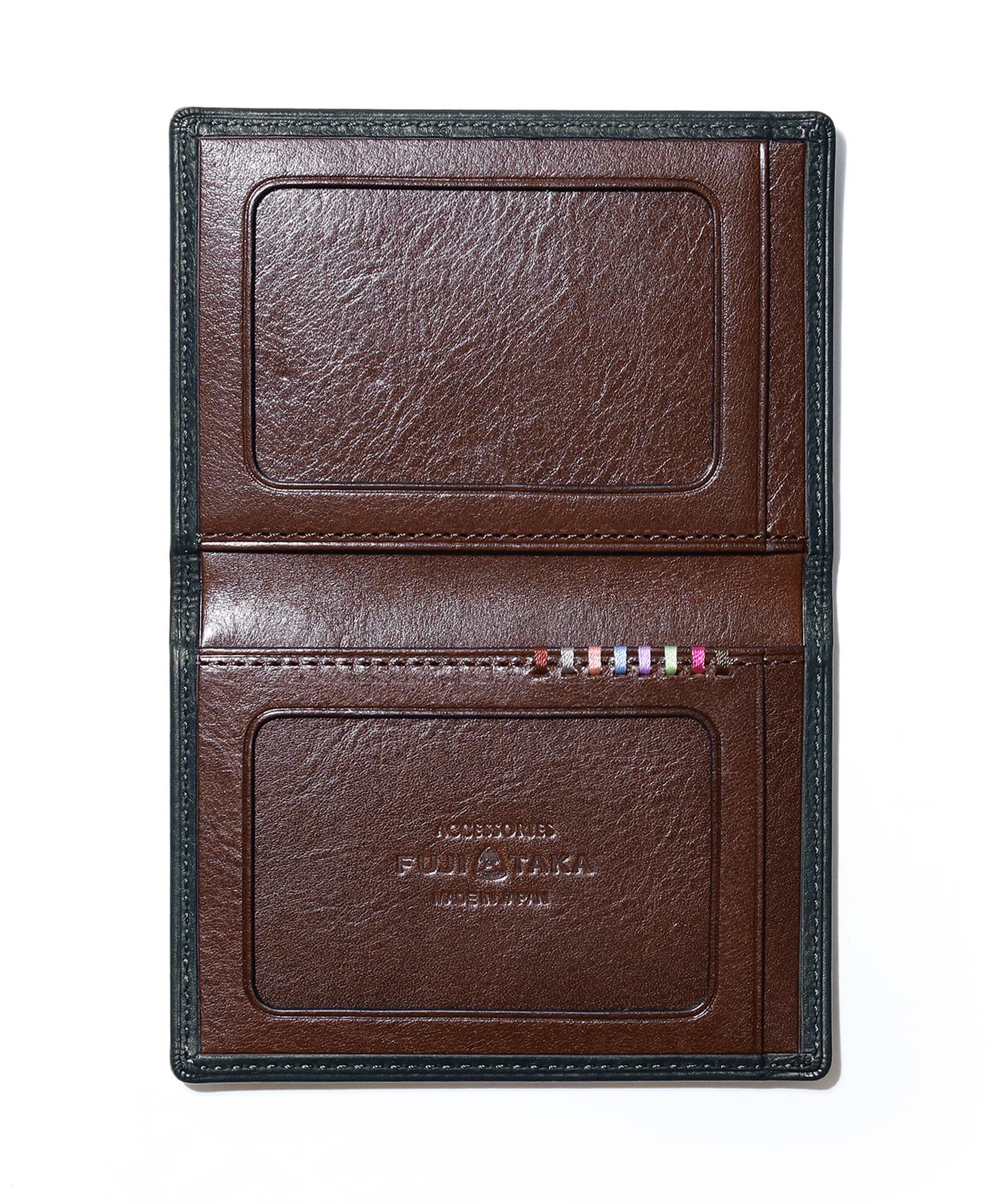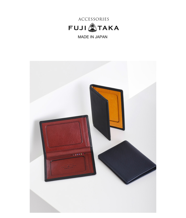 国産カーフ×イタリアンレザーのコンビネーションで仕上げられたフジタカアクセサリーズのバイカラーデザインが美しい2面パスケース。フジタカのイメージカラーをかがりステッチで表現。日本独特の優しい色合いがお手元をさりげなく彩ります。