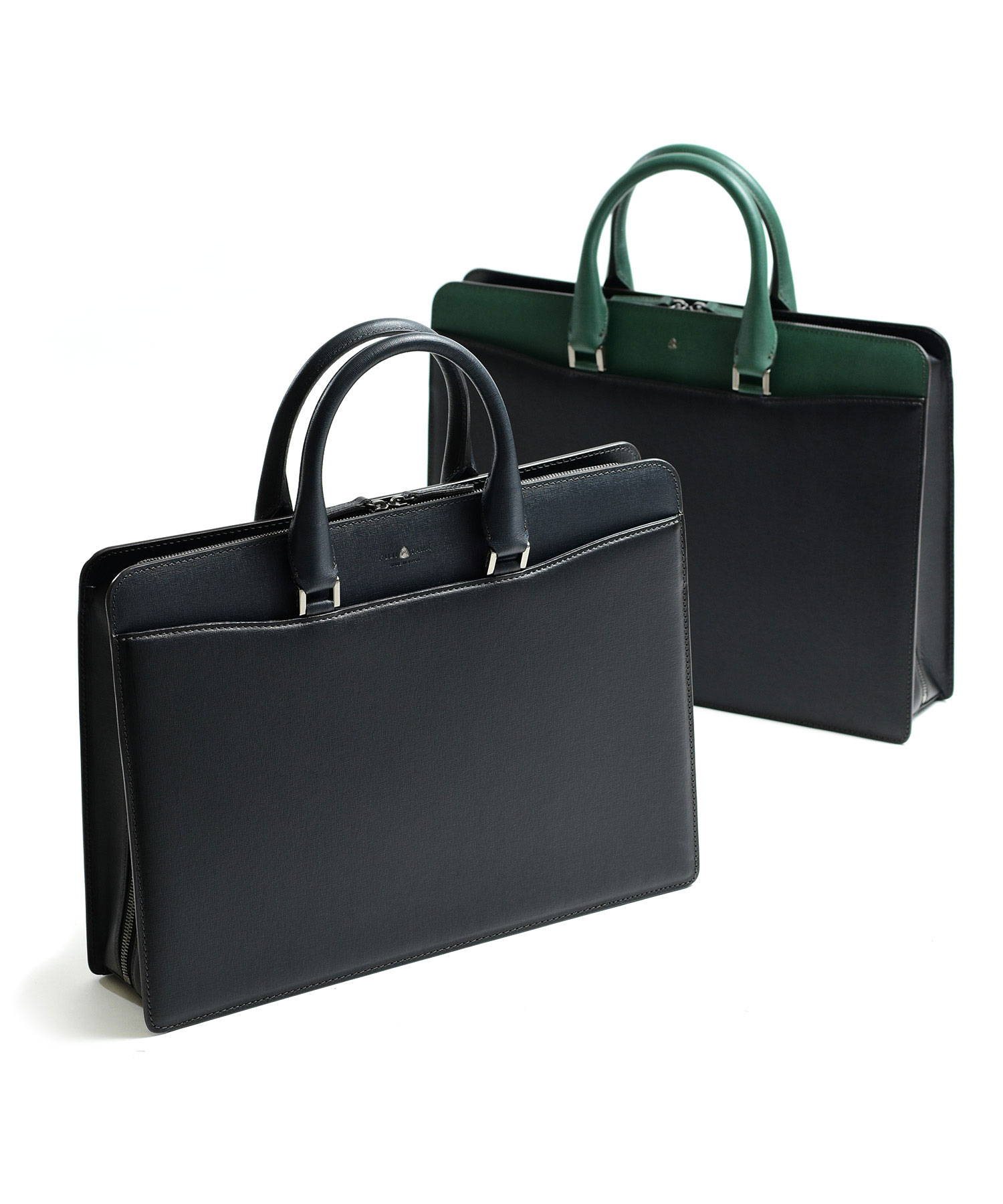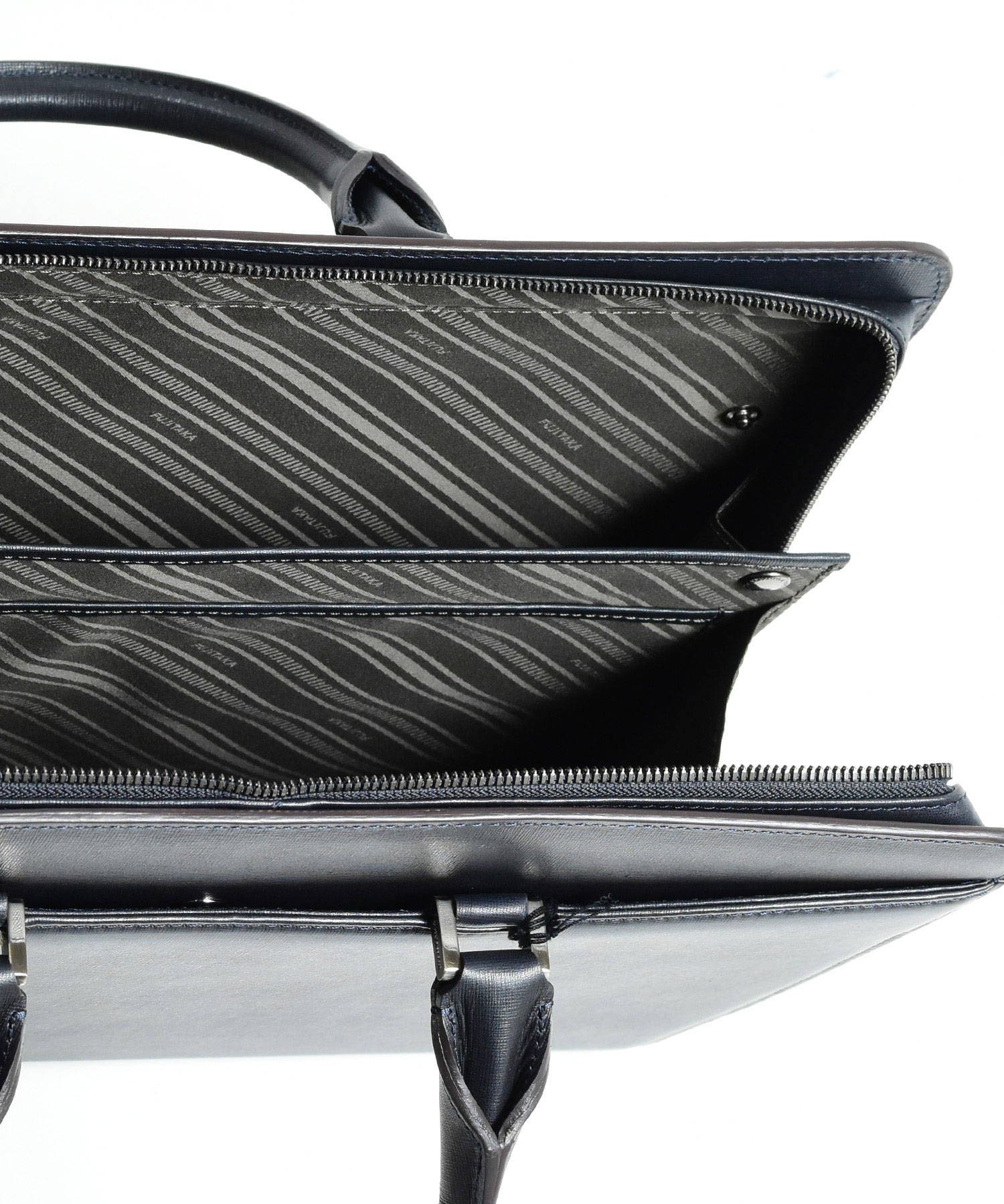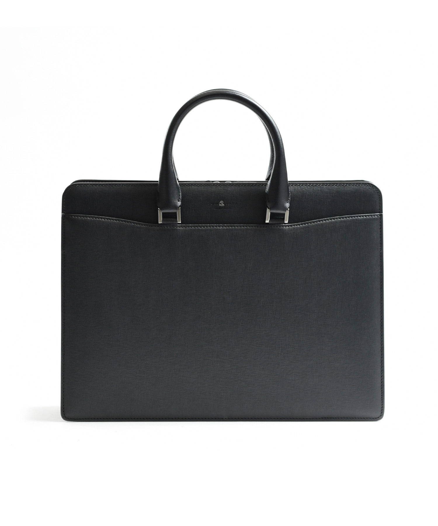 メインルームはA4サイズを収納可能。内装にはファスナーポケットやマチ付きのポケット、ペン差しなど、ビジネスに欠かせないものを整理しやすい収納が揃っています。鞄外側の前面、背面ともにあおりポケット付き。新聞や雑誌、パスケースなどを入れておくとさっと取り出せて便利です。ファスナーが天面と側面両側に通っています。下までおろすことで口が大きく開くため、出し入れもしやすくなります。