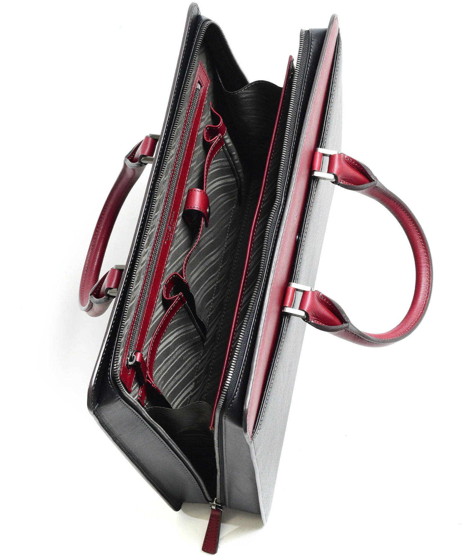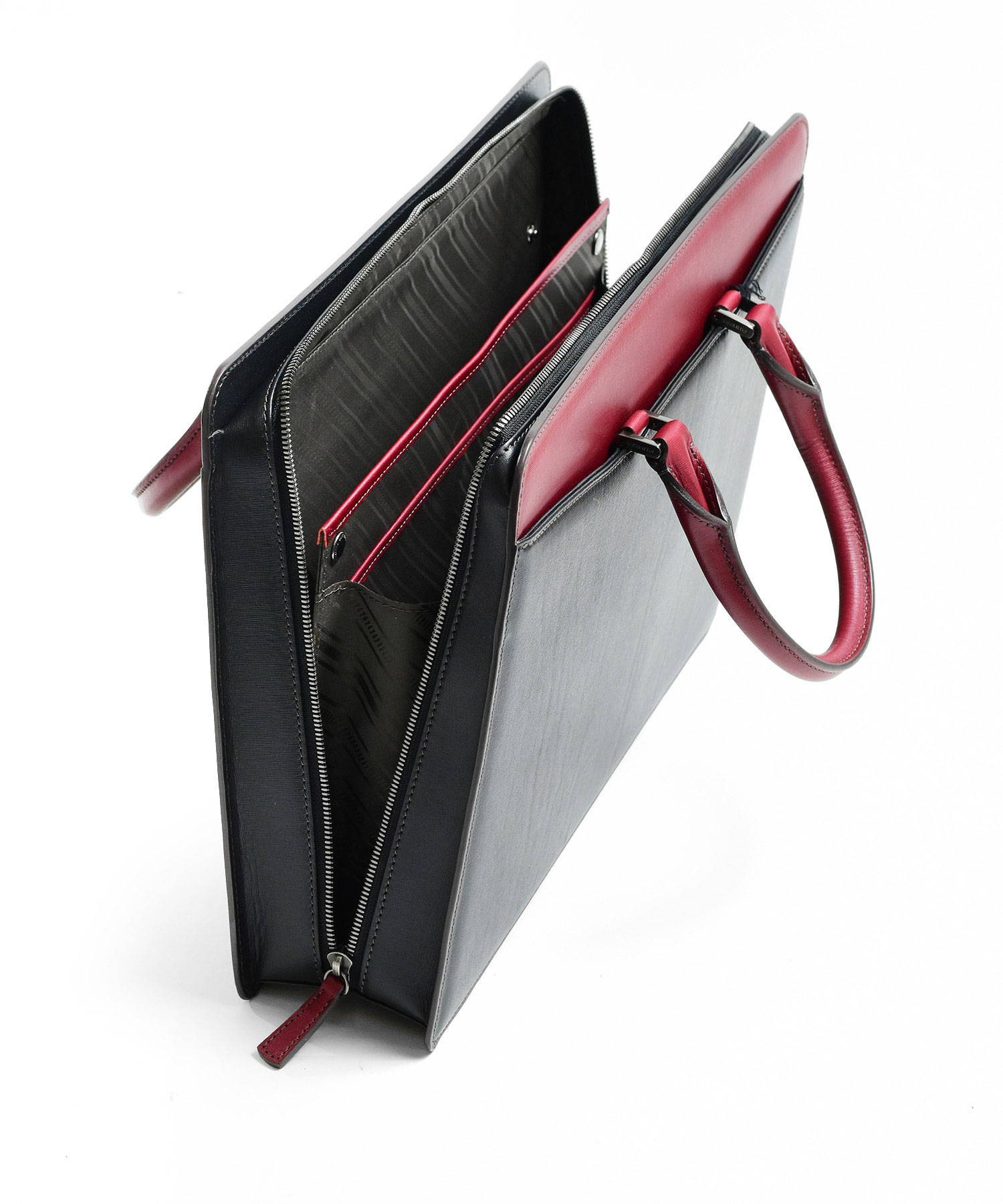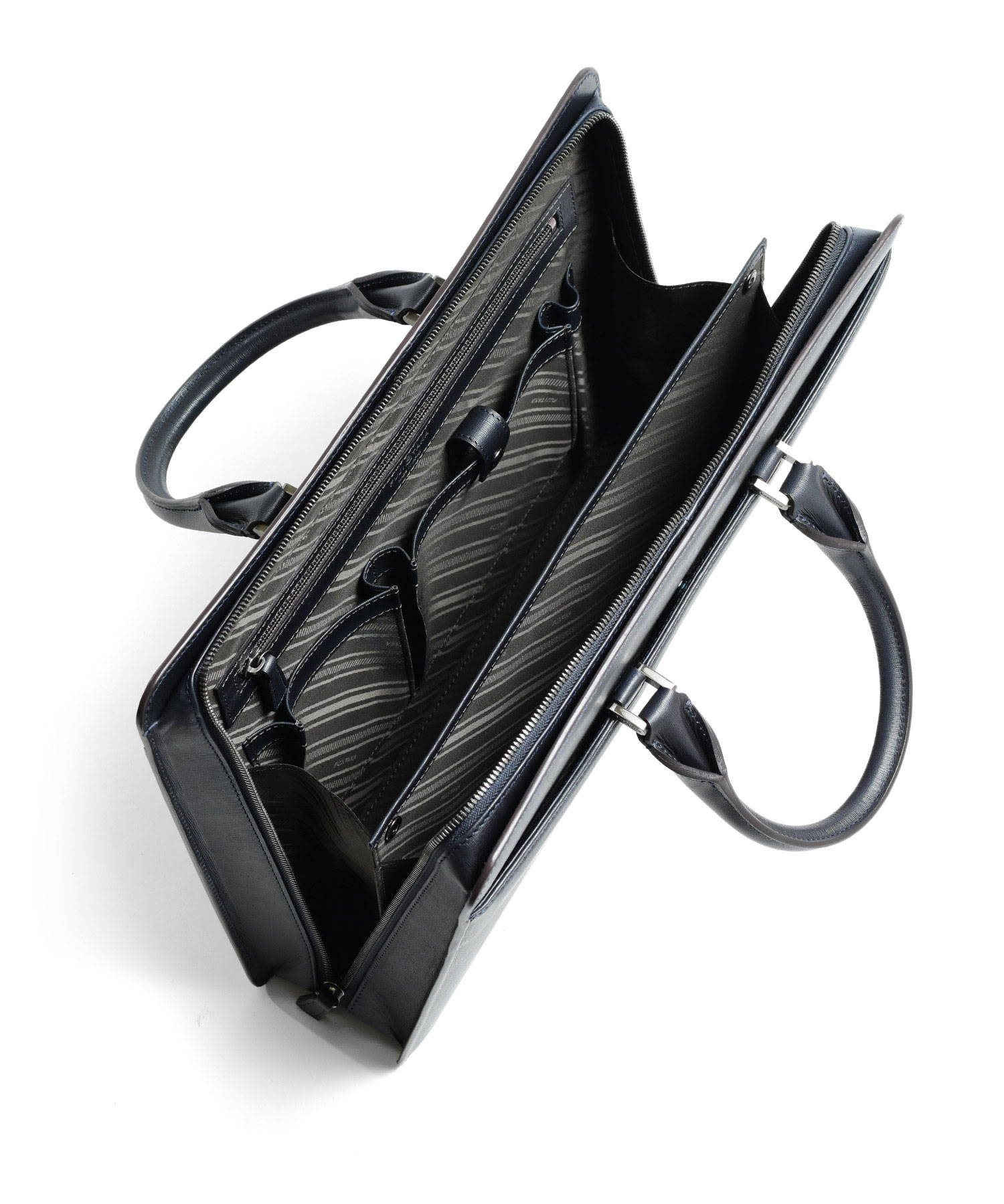 メインルームはA4サイズを収納可能。内装にはファスナーポケットやマチ付きのポケット、ペン差しなど、ビジネスに欠かせないものを整理しやすい収納が揃っています。鞄外側の前面、背面ともにあおりポケット付き。新聞や雑誌、パスケースなどを入れておくとさっと取り出せて便利です。ファスナーが天面と側面両側に通っています。下までおろすことで口が大きく開くため、出し入れもしやすくなります。