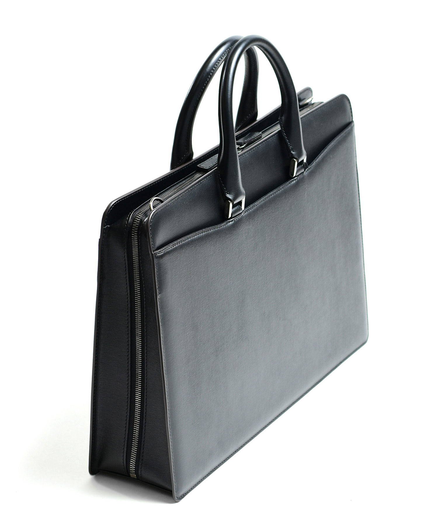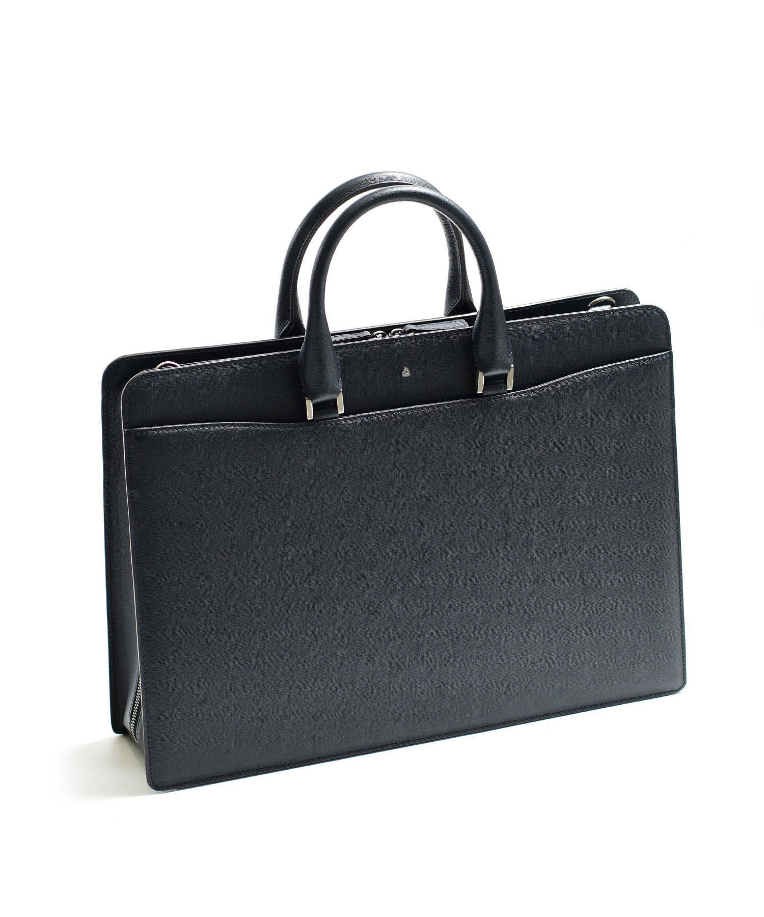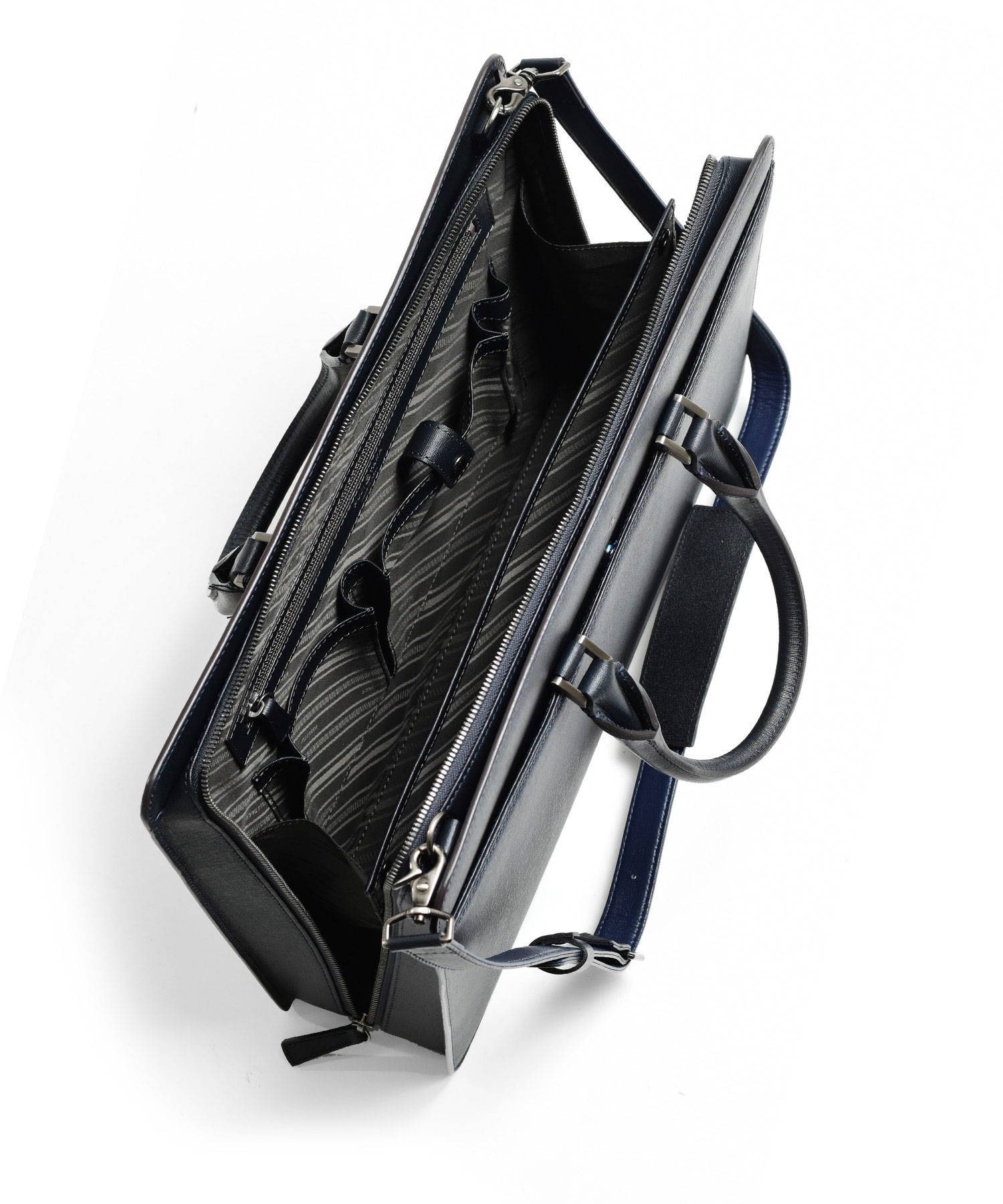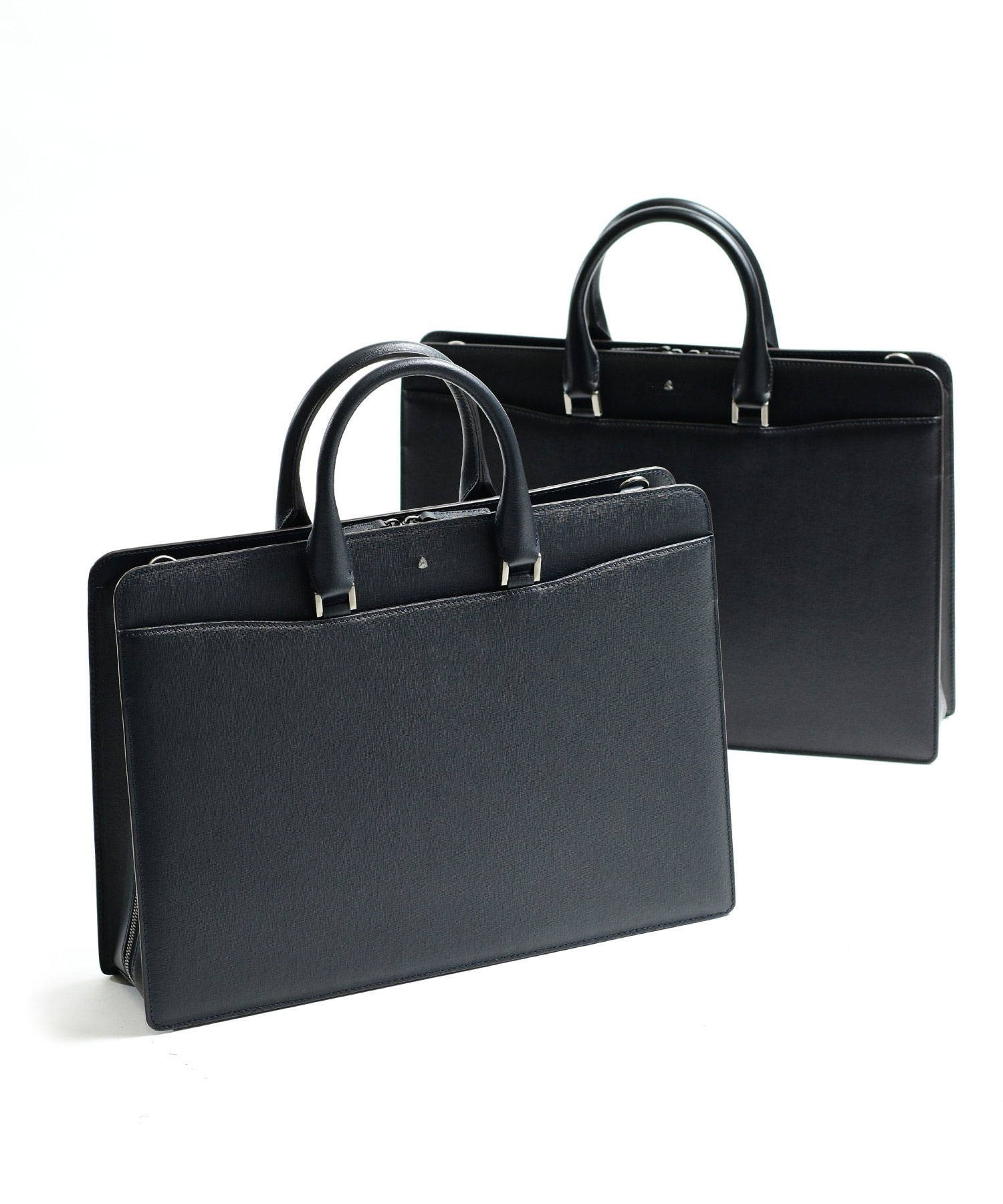 メインルームはB4サイズを収納可能。内装にはファスナーポケットやマチ付きのポケット、ペン差しなど、ビジネスに欠かせないものを整理しやすい収納が揃っています。鞄外側の前面、背面ともにあおりポケット付き。新聞や雑誌、パスケースなどを入れておくとさっと取り出せて便利です。ファスナーが天面と側面両側に通っています。下までおろすことで口が大きく開くため、出し入れもしやすくなります。