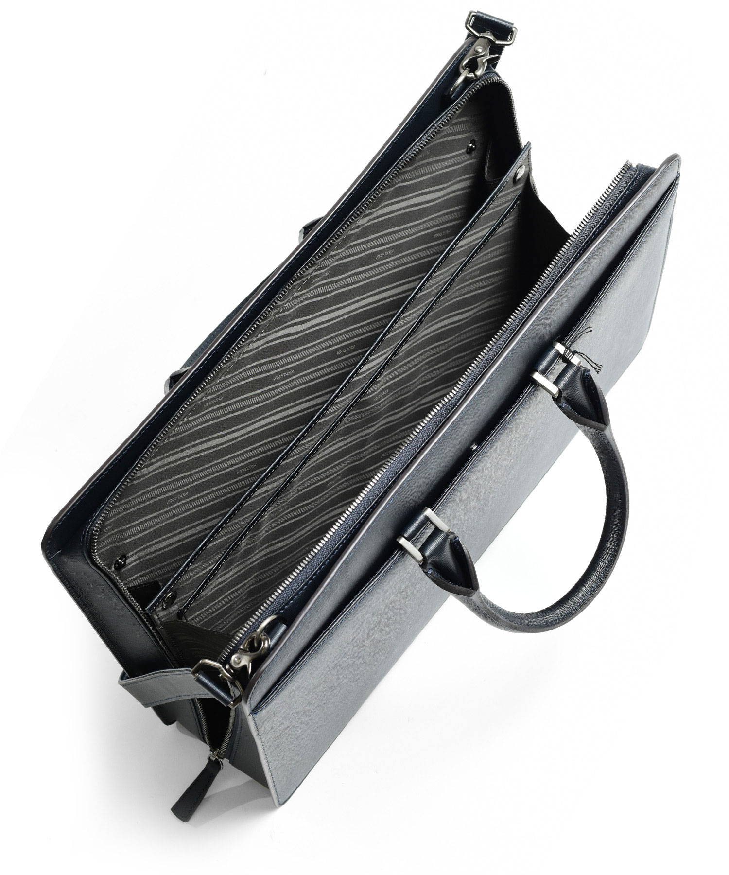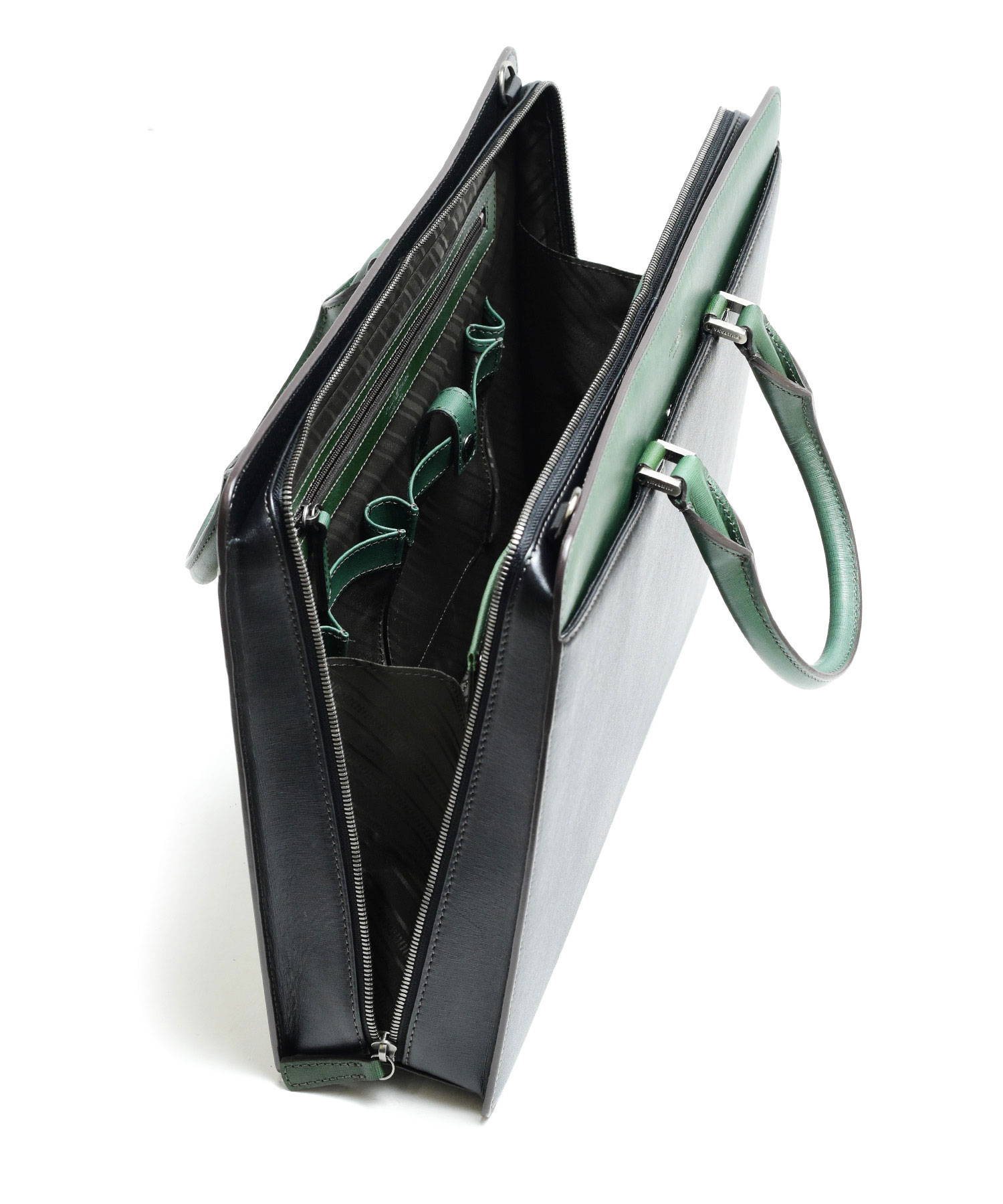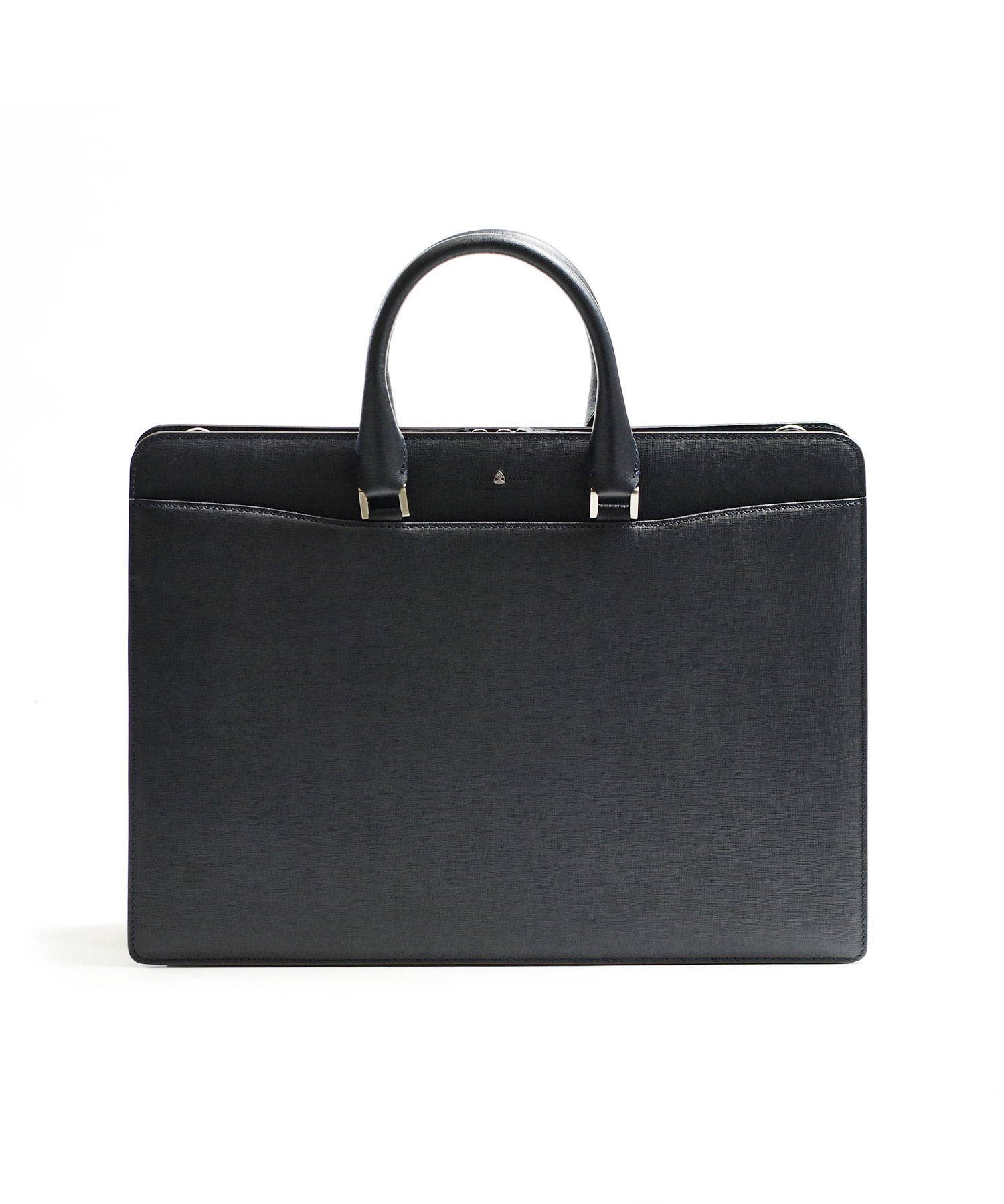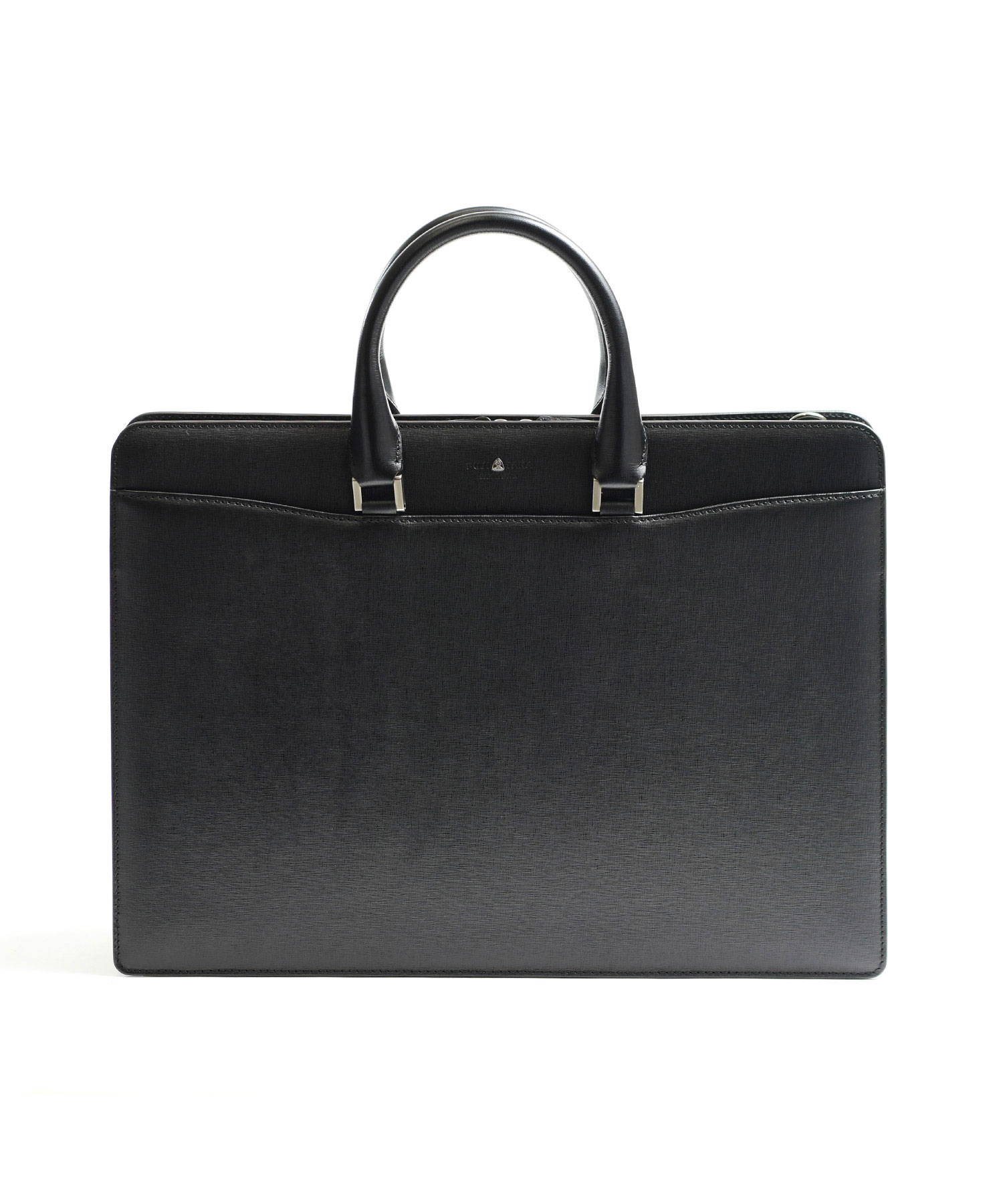 メインルームはB4サイズを収納可能。内装にはファスナーポケットやマチ付きのポケット、ペン差しなど、ビジネスに欠かせないものを整理しやすい収納が揃っています。鞄外側の前面、背面ともにあおりポケット付き。新聞や雑誌、パスケースなどを入れておくとさっと取り出せて便利です。ファスナーが天面と側面両側に通っています。下までおろすことで口が大きく開くため、出し入れもしやすくなります。
