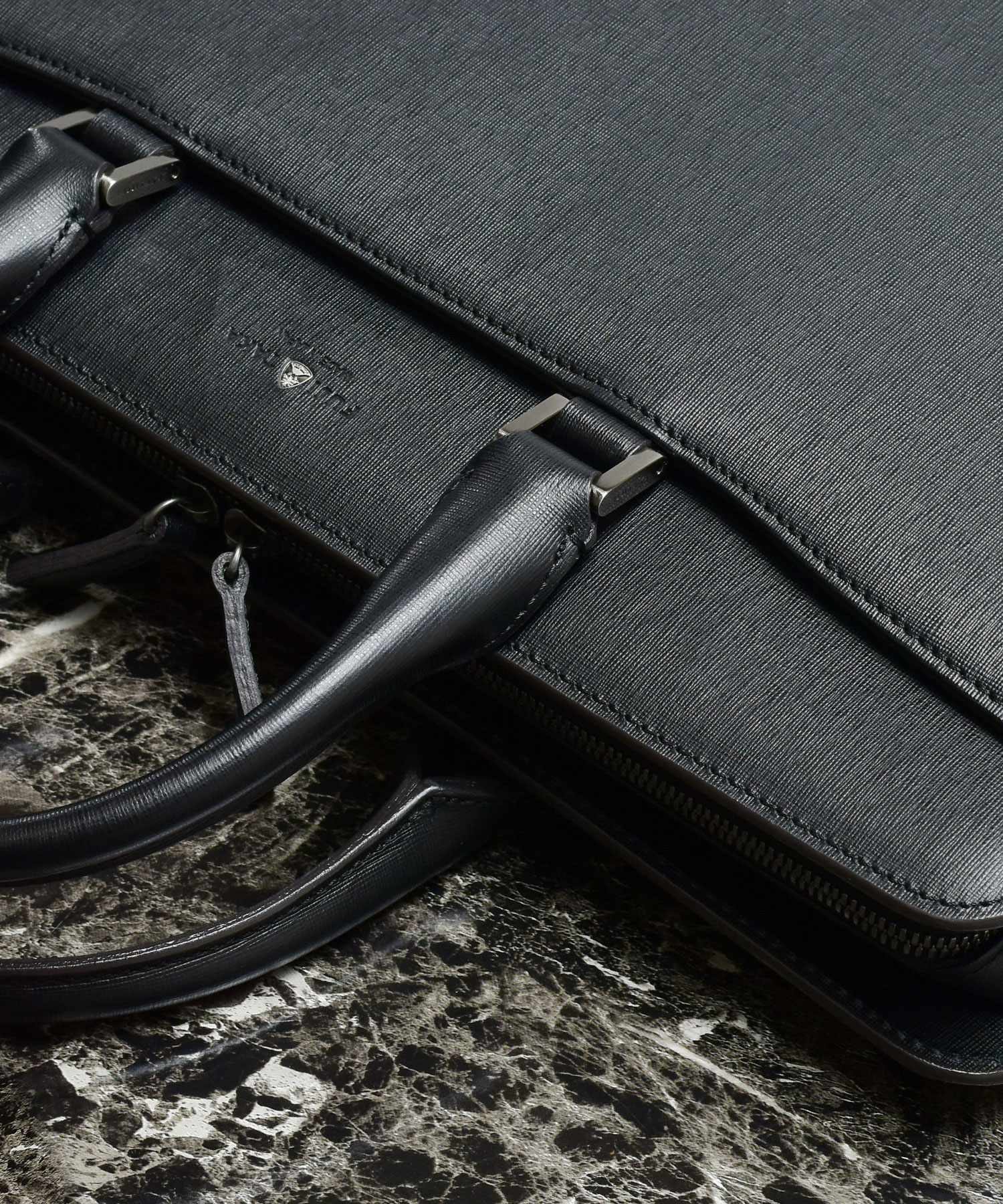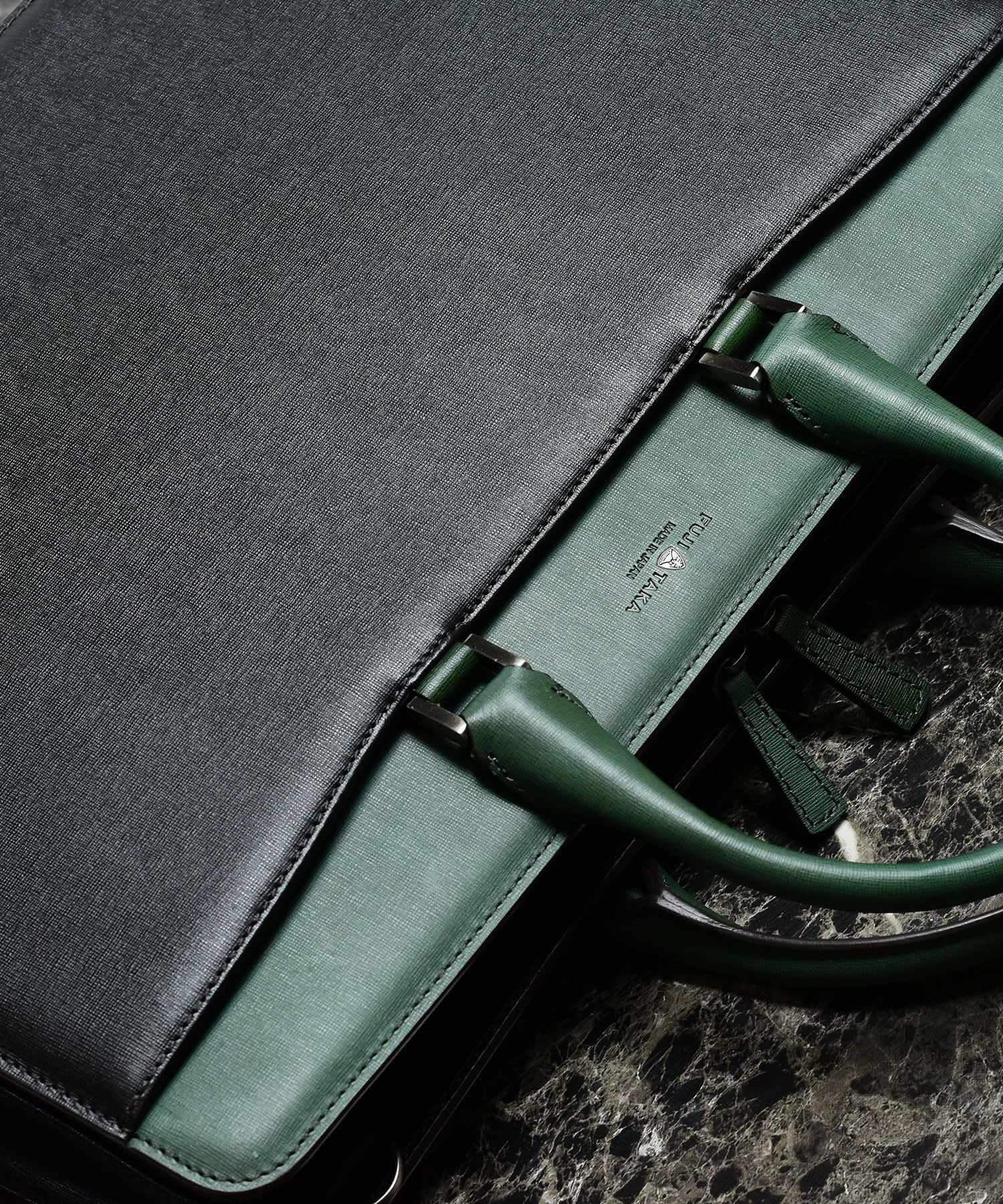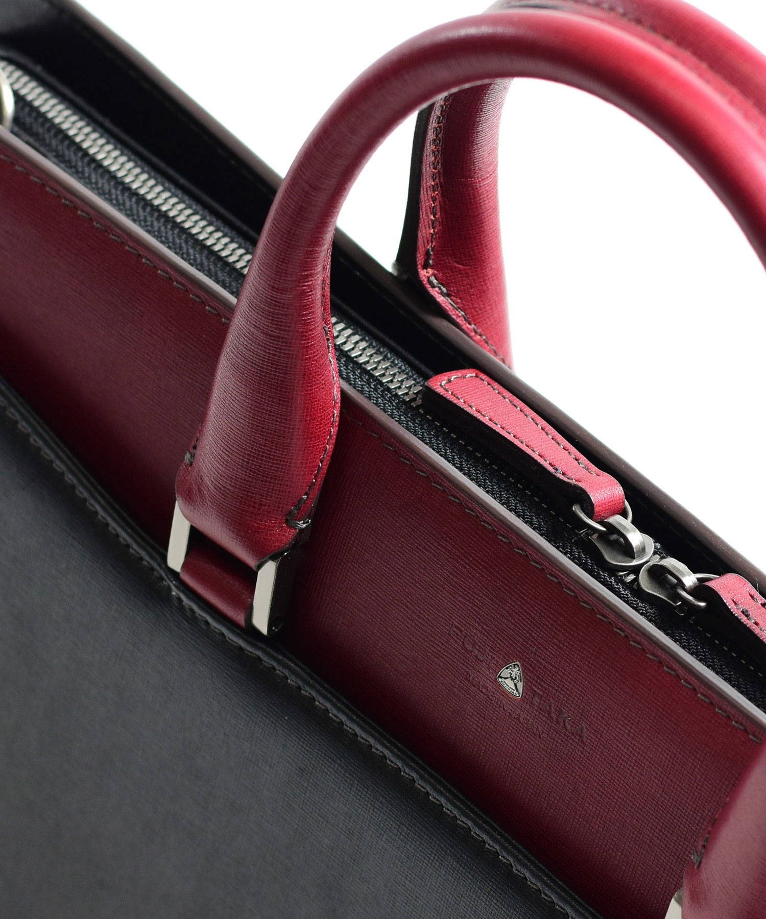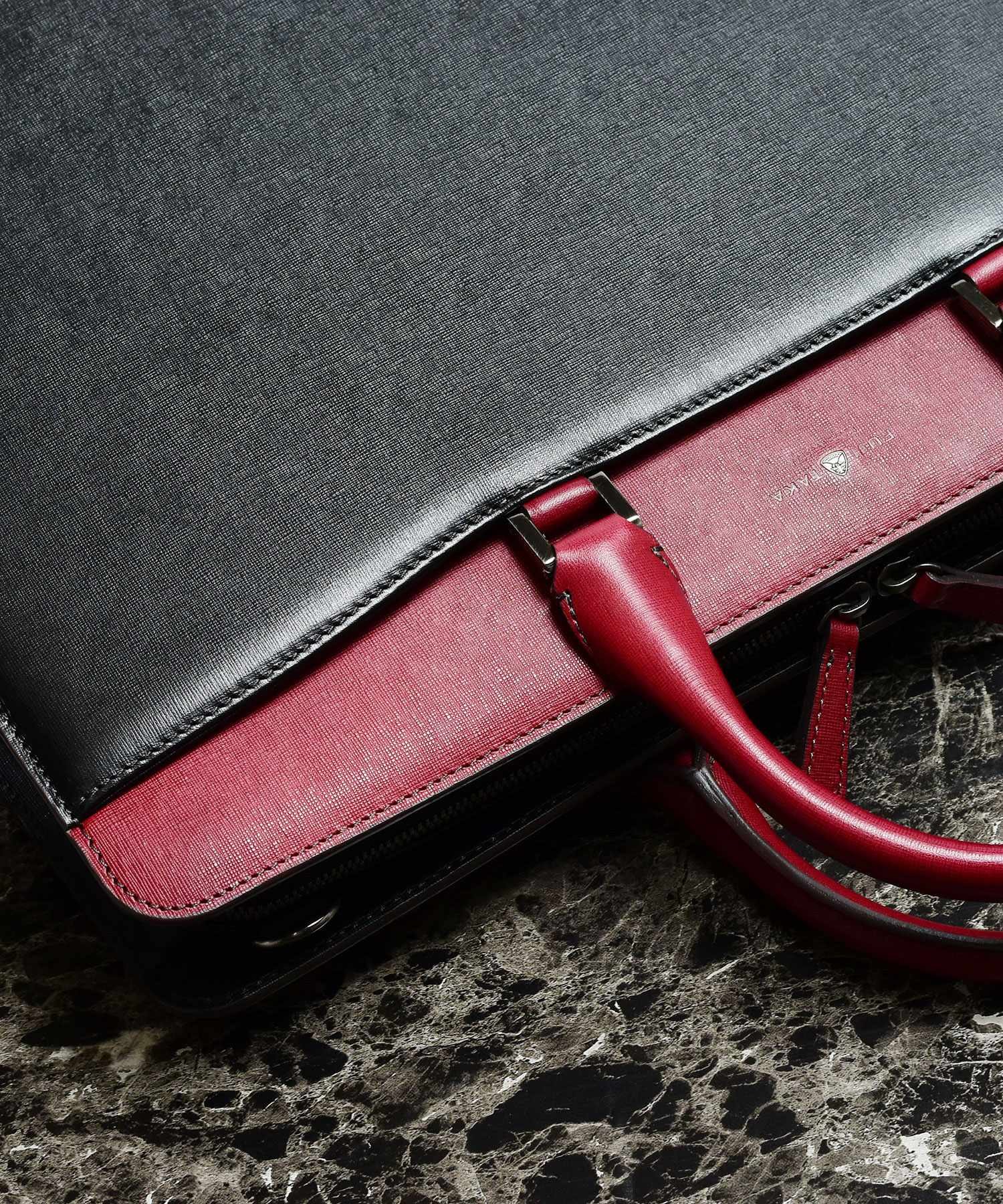 フジタカの【ディアマン】は「逆さ富士」をイメージしたカッティングデザインが特徴のシリーズ。荷物の多い時にも活躍するB4サイズのビジネスバッグです。本体に使用されているのは【ディアマン】シリーズの為にオリジナルで開発された純国産レザー。国産鞣しの最高峰とされるタンナーで丁寧にじっくりとつくり込まれています。