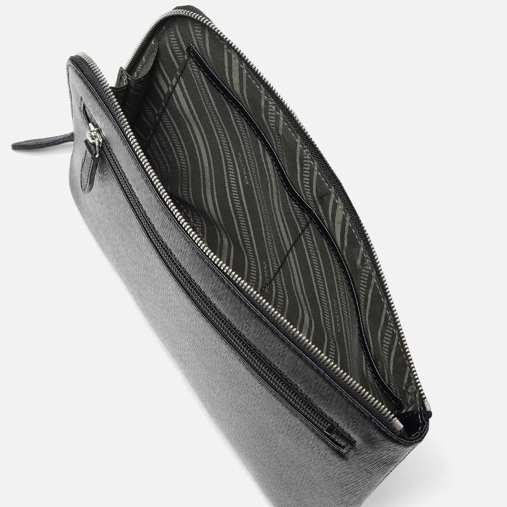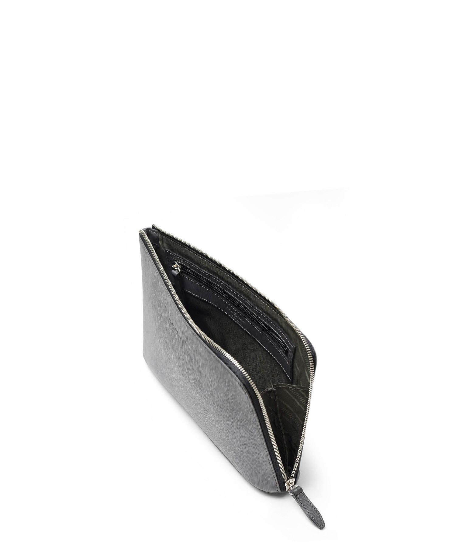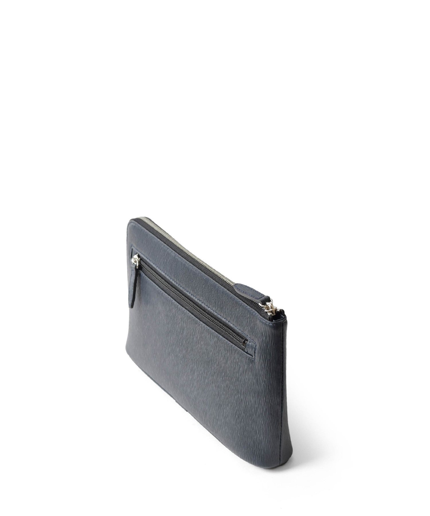 すっきりとしたデザインながら、L字に通ったファスナーのおかげで口開きの良い仕様。中身が見やすく、かつ荷物の出し入れもスムーズに行えます。長札や祝儀袋、袱紗など収納可能なサイズ感です。クラッチバッグの背面にファスナーポケット、内装にはファスナーポケット、オープンポケットが2つあります。