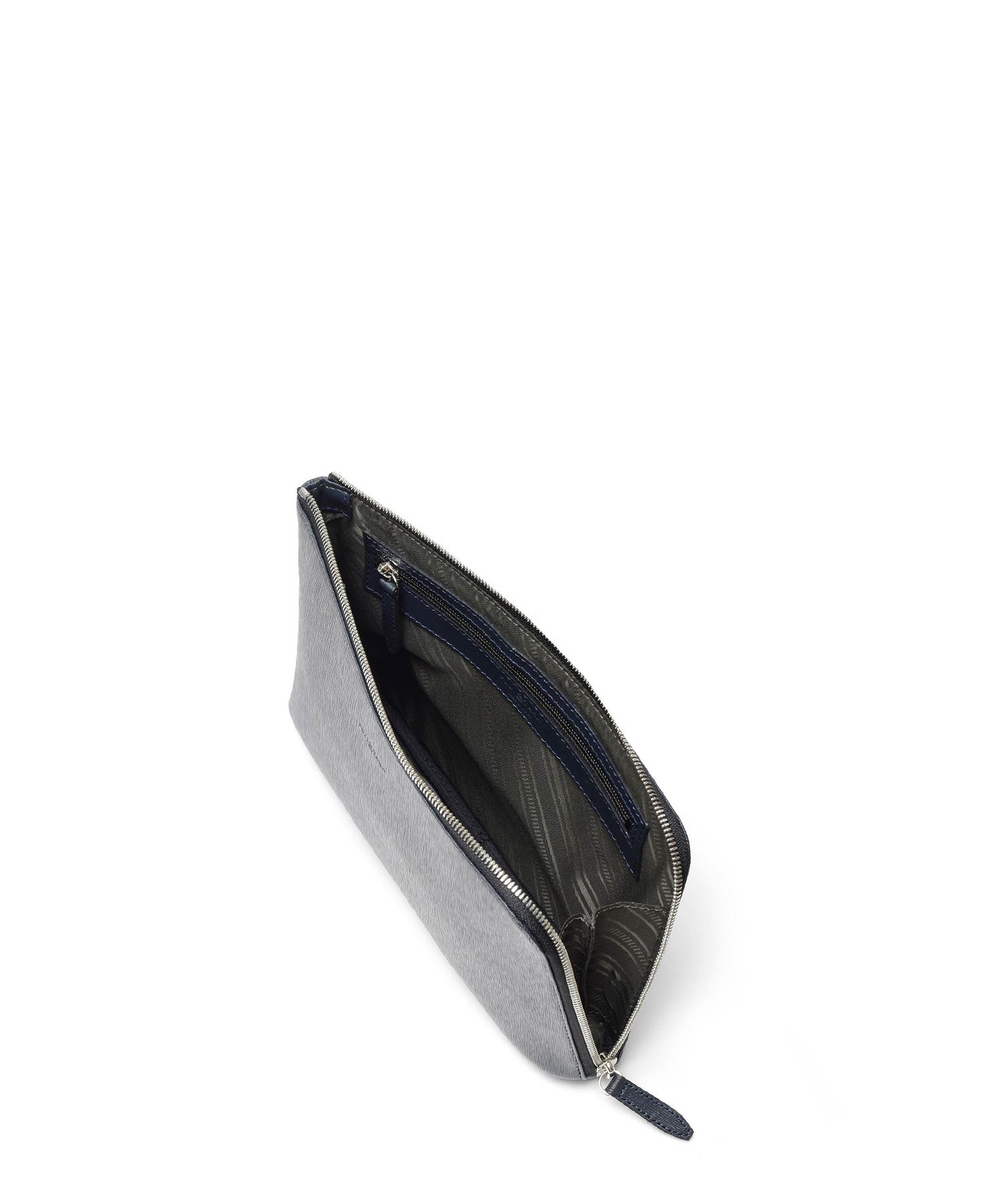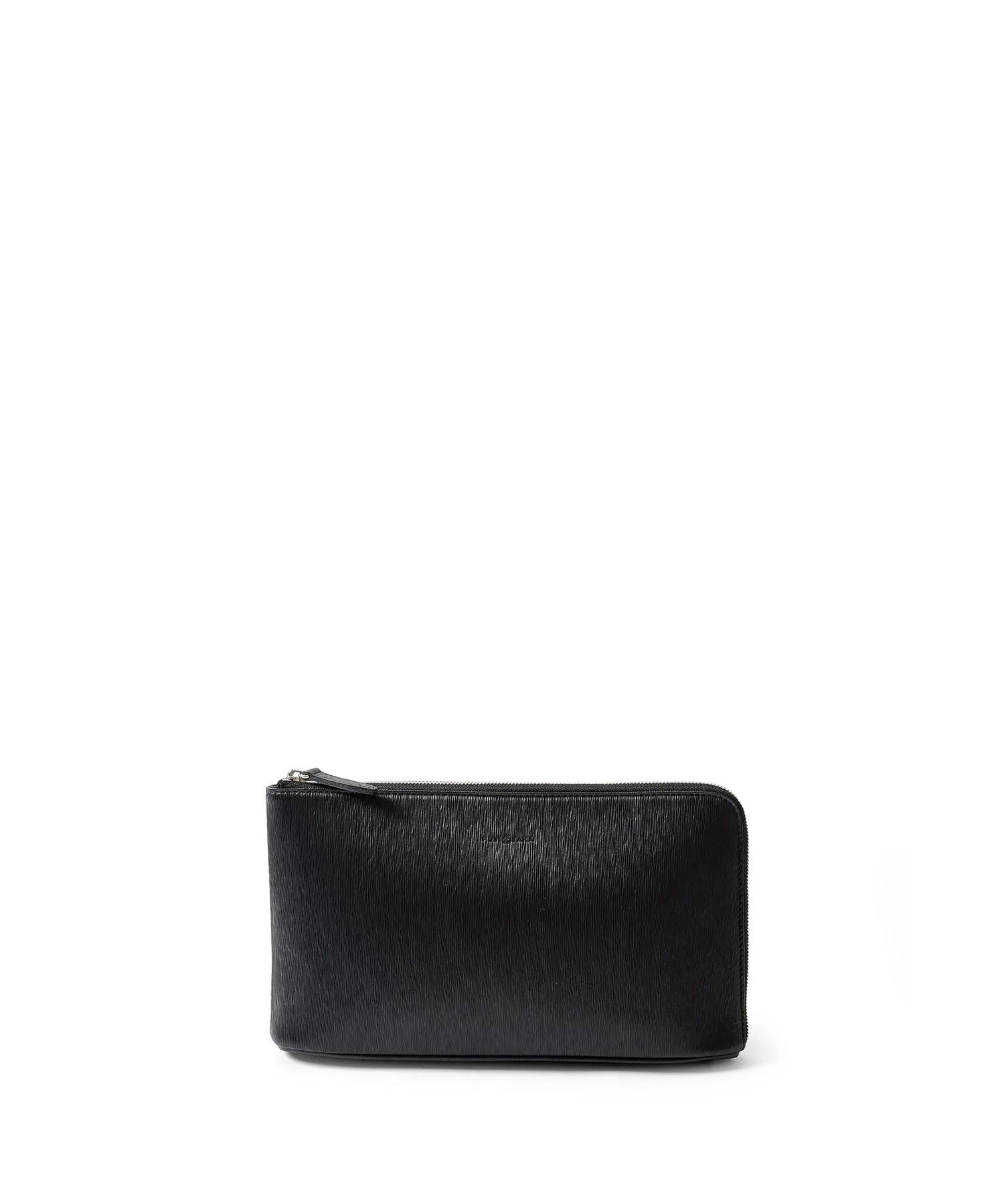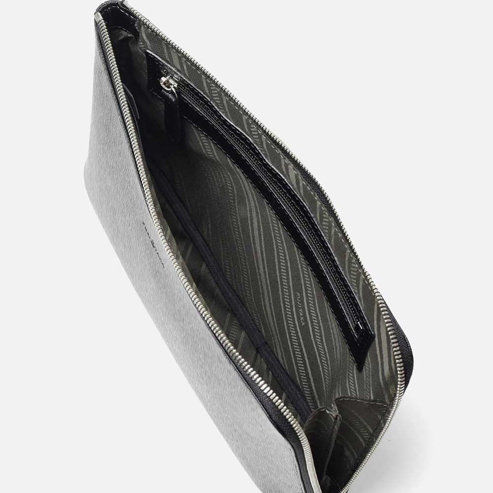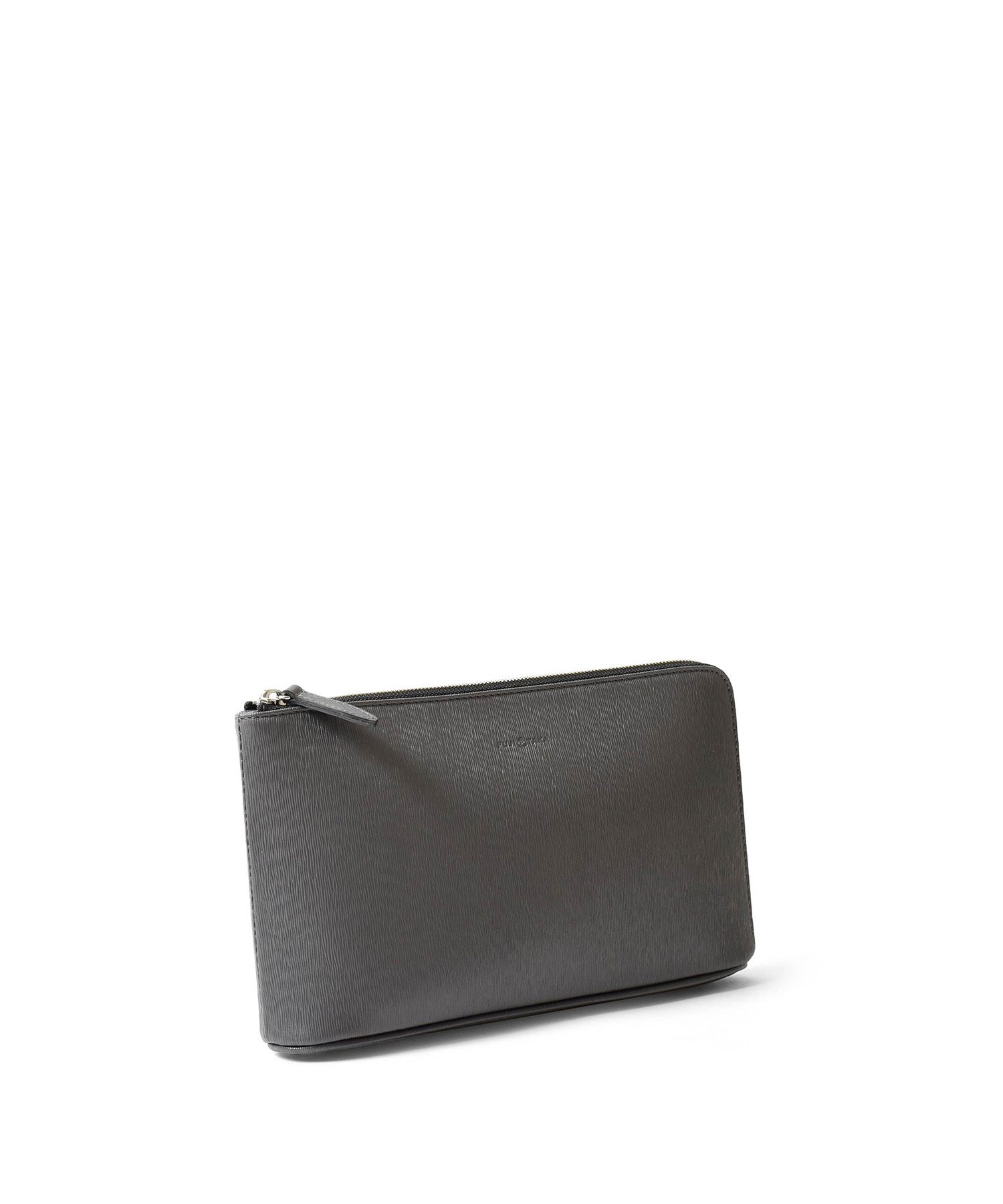すっきりとしたデザインながら、L字に通ったファスナーのおかげで口開きの良い仕様。中身が見やすく、かつ荷物の出し入れもスムーズに行えます。長札や祝儀袋、袱紗など収納可能なサイズ感です。クラッチバッグの背面にファスナーポケット、内装にはファスナーポケット、オープンポケットが2つあります。