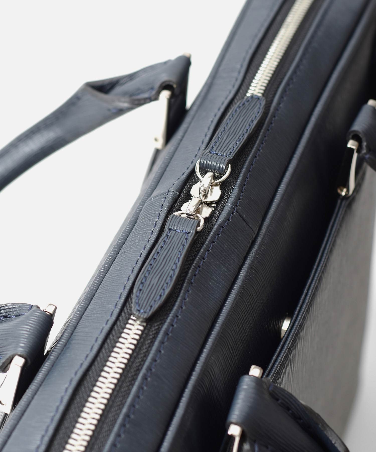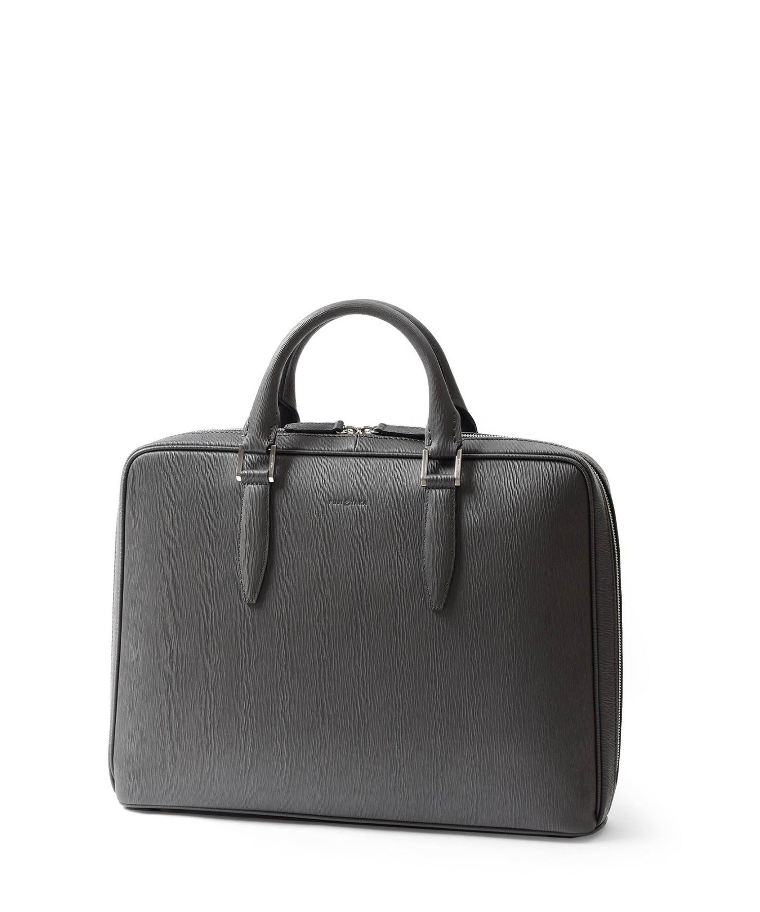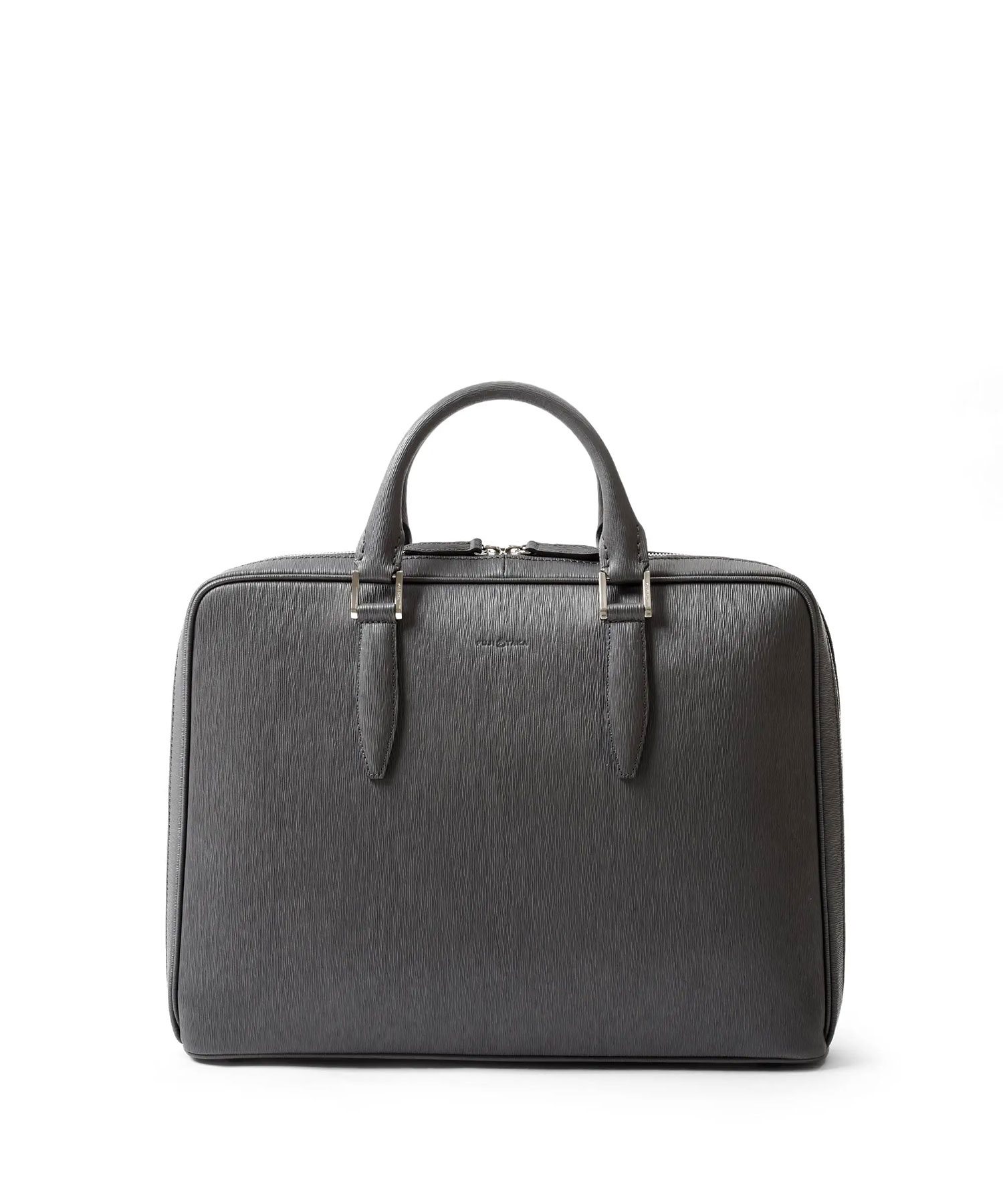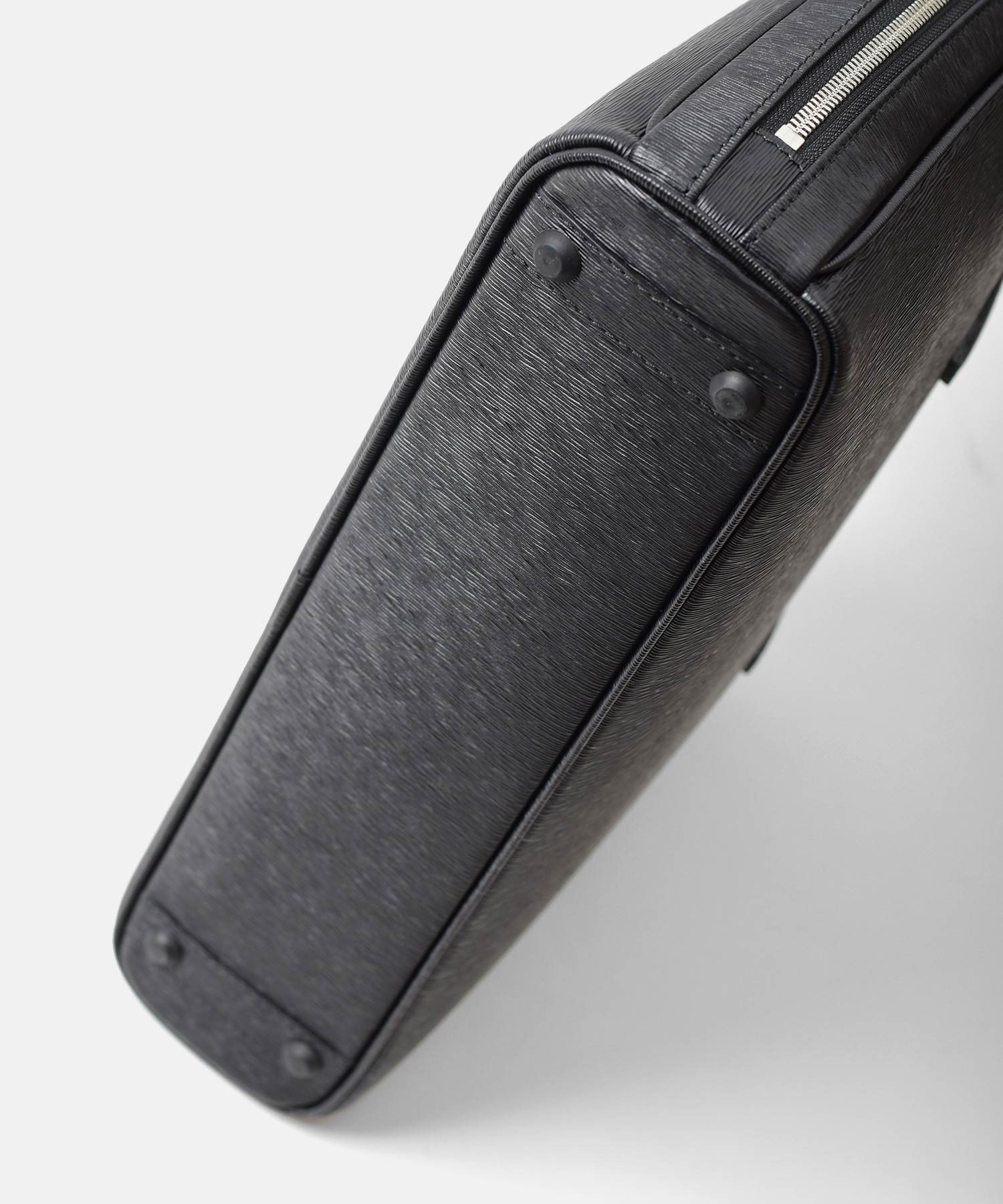 厳選された国産原皮にスコッチガード加工(3M)を施した防水レザーを使用した、フジタカのA4レザービジネスバッグ。上品なエンボス加工により、透明感と奥行きを出し高級感を感じられる表情に仕上げました。職人の高い技術で施された底部分をぐるりと一周する縫製、「パイピング」によってしっかりと自立する作りです。