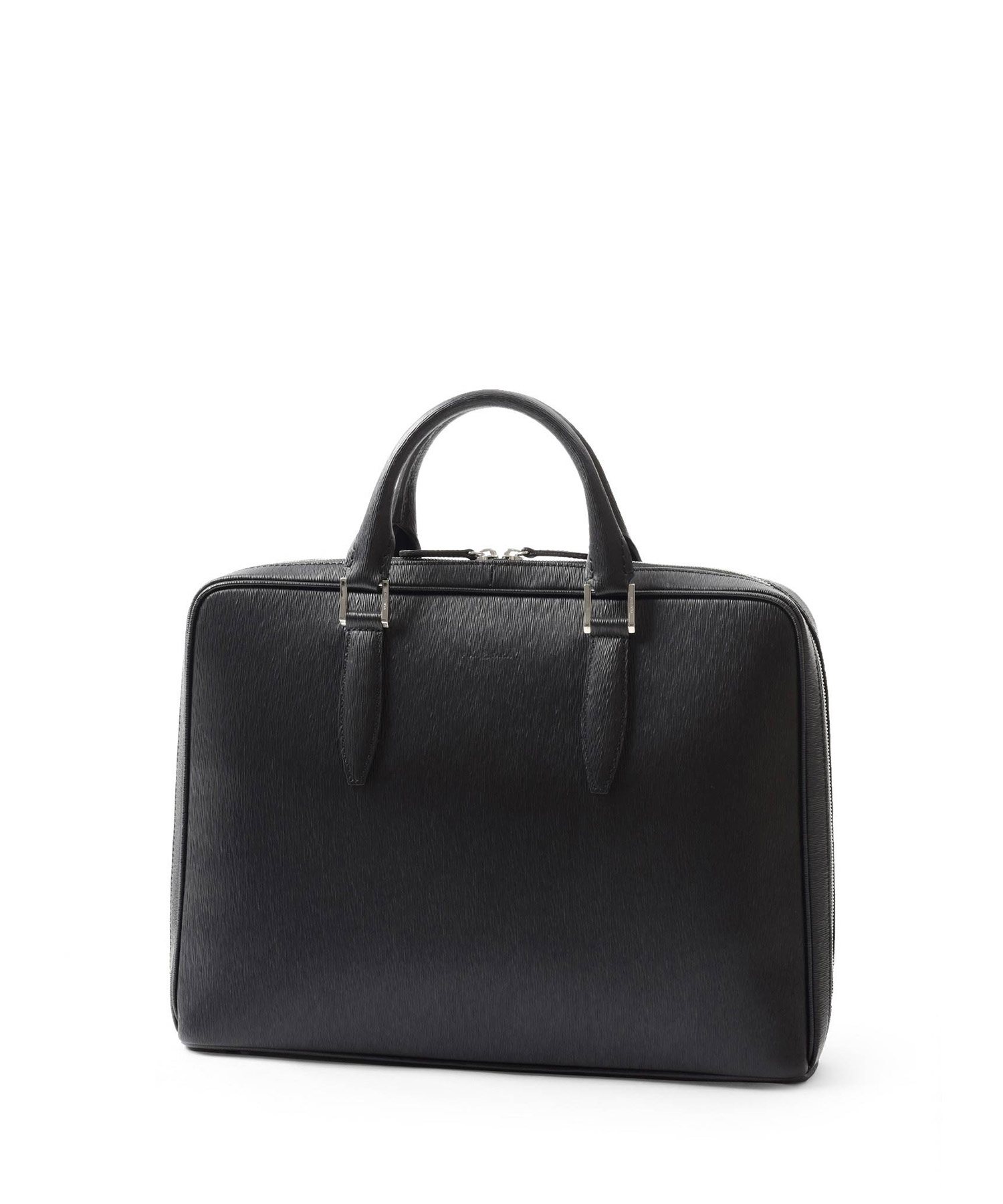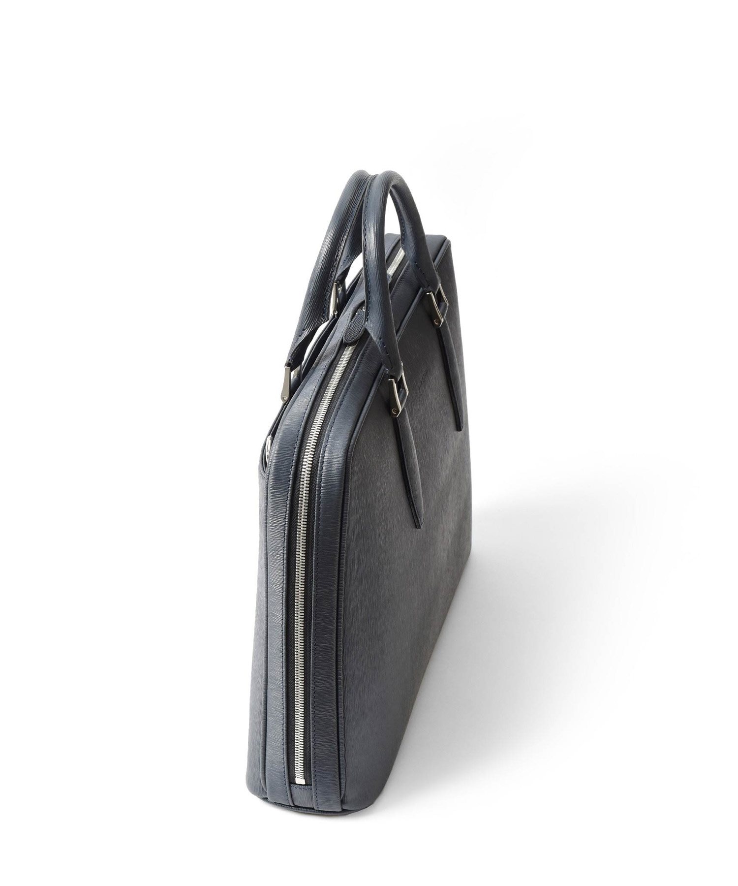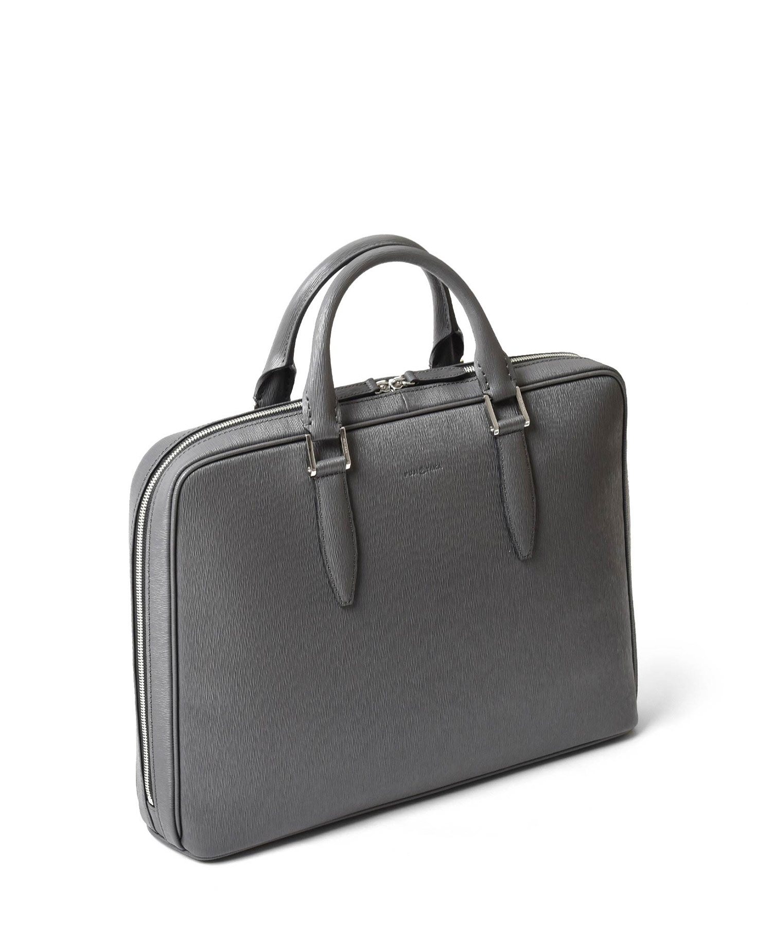 厳選された国産原皮にスコッチガード加工(3M)を施した防水レザーを使用した、フジタカのA4レザービジネスバッグ。上品なエンボス加工により、透明感と奥行きを出し高級感を感じられる表情に仕上げました。職人の高い技術で施された底部分をぐるりと一周する縫製、「パイピング」によってしっかりと自立する作りです。