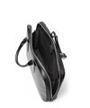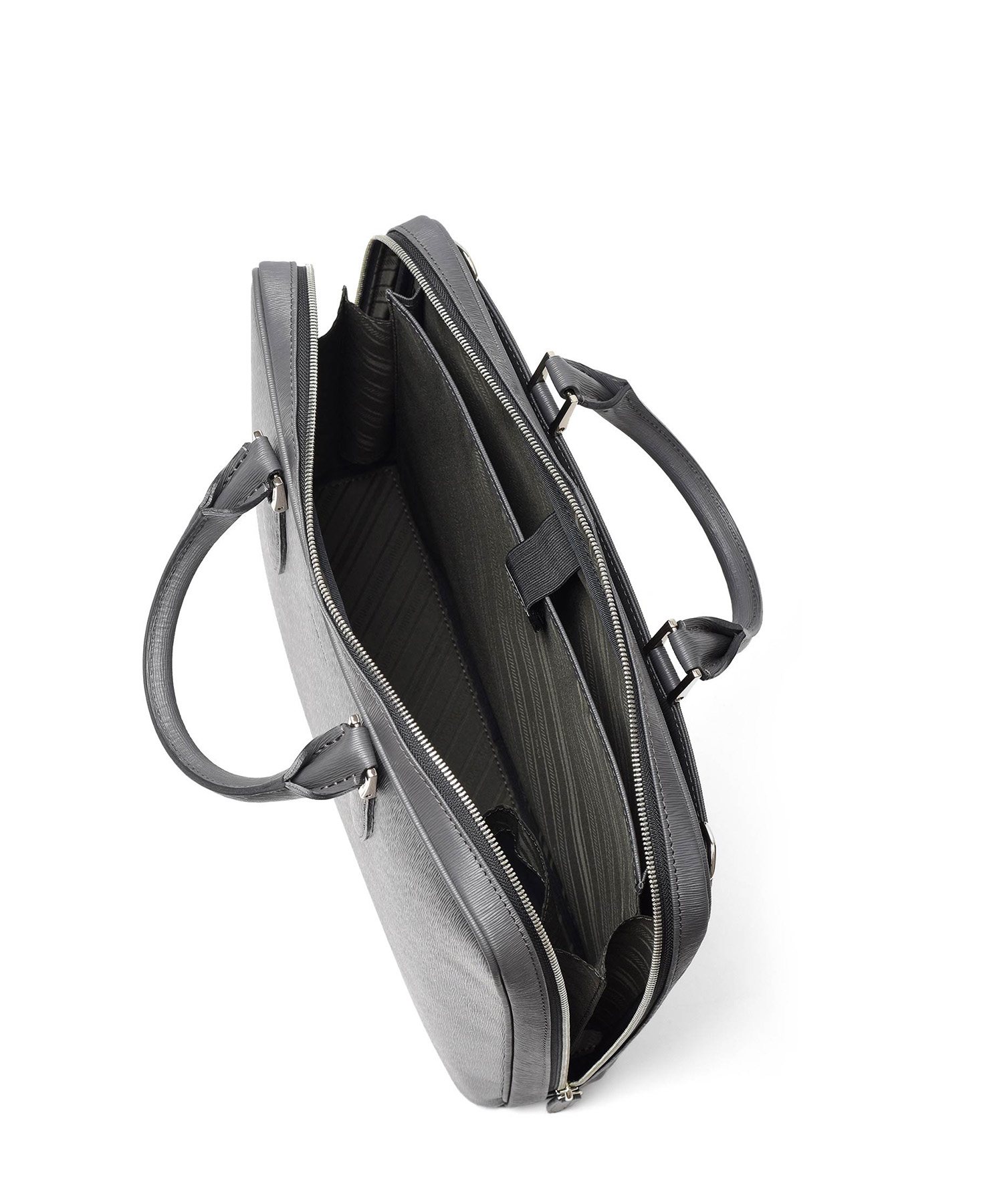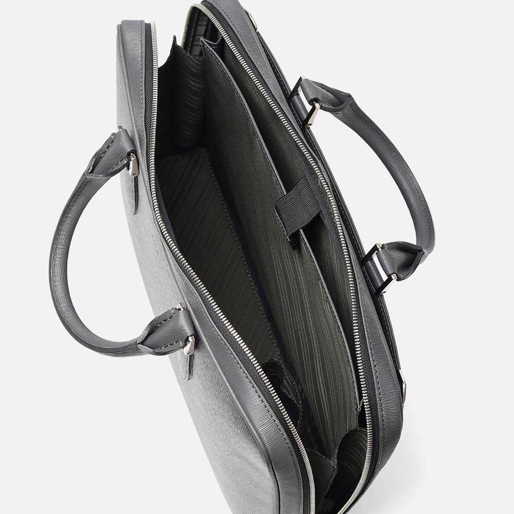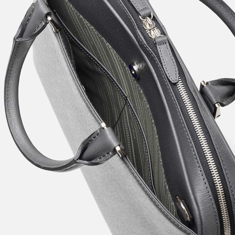 すっきりとしたデザインながら、A4サイズがおさまるビジネスバッグです。内装にはクッションポケット、ファスナーポケット、オープンポケットが2つ、ペンさし、ペットボトルホルダーを装備しています。衝撃を和らげるクッションポケットは、ノートパソコンやタブレット型端末の収納に最適で、13.3インチPCに対応しています。