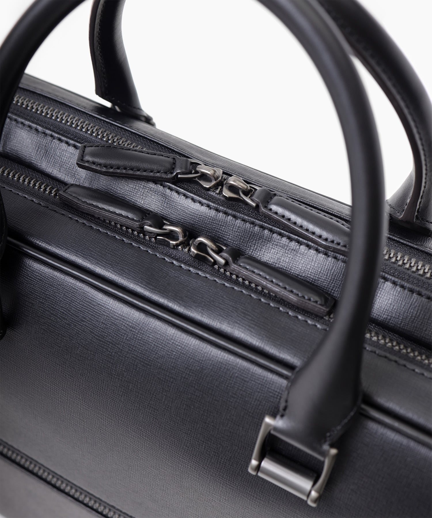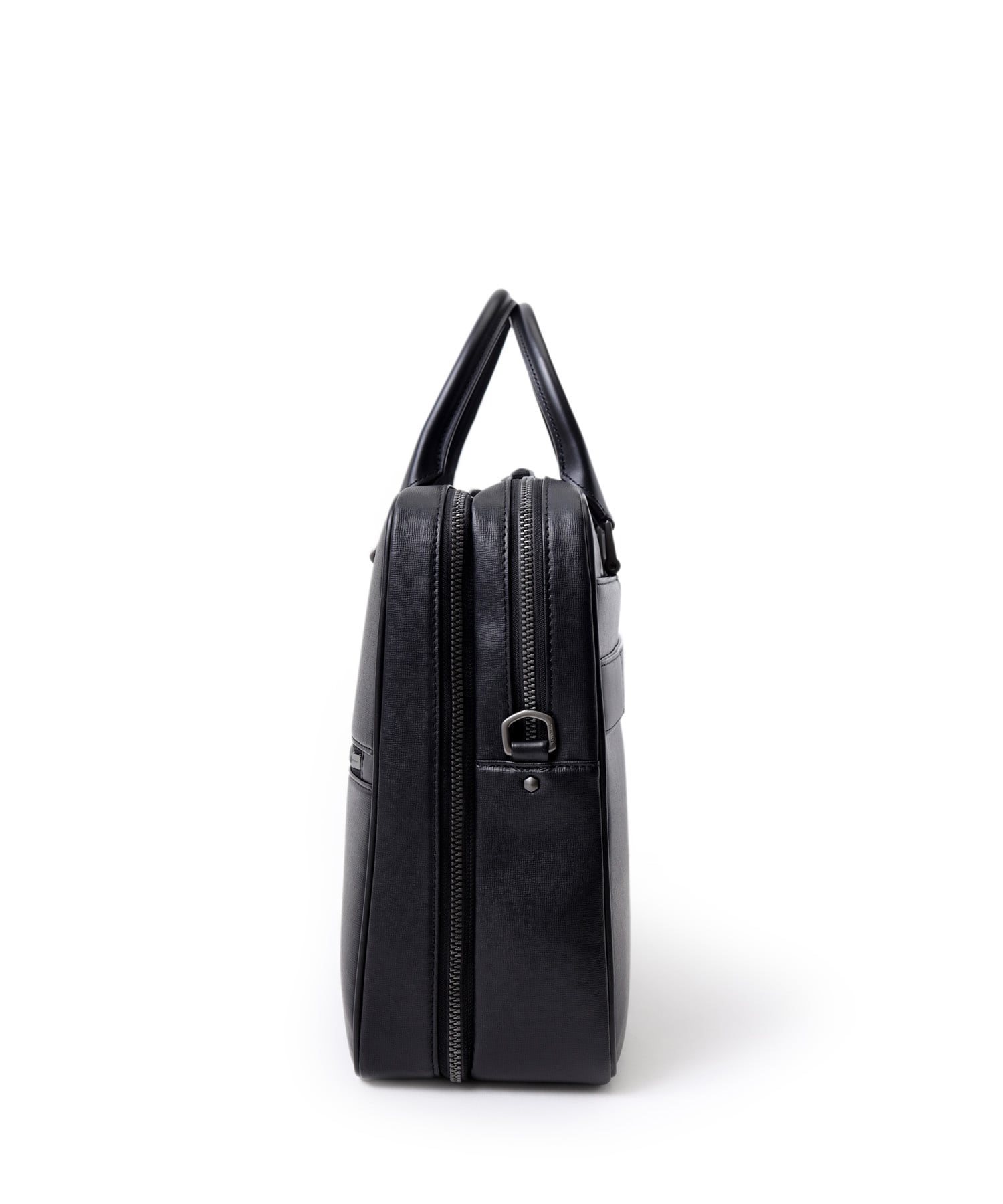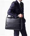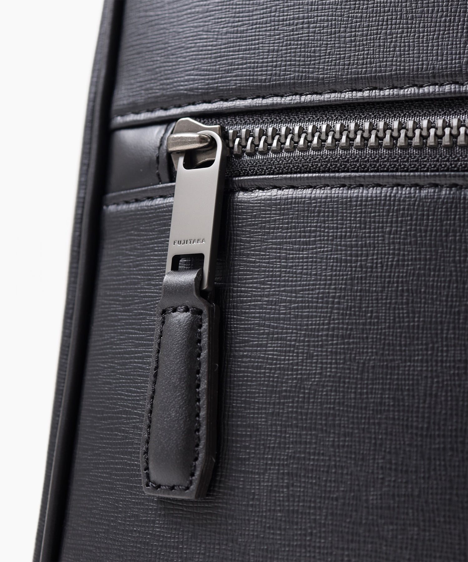 「クラリーノ」を使った、FUJITAKAのA4サイズのビジネスバッグ。ダブルファスナータイプです。この素材は、型崩れしにくく高級感があり、丸みを帯びた風合いが特徴で、天然皮革に近い一体感のあるなじみを再現しています。