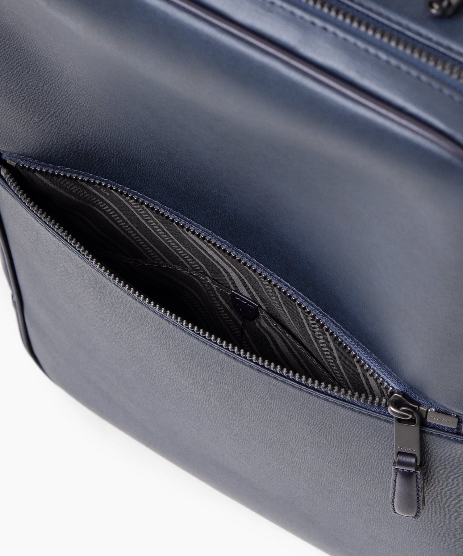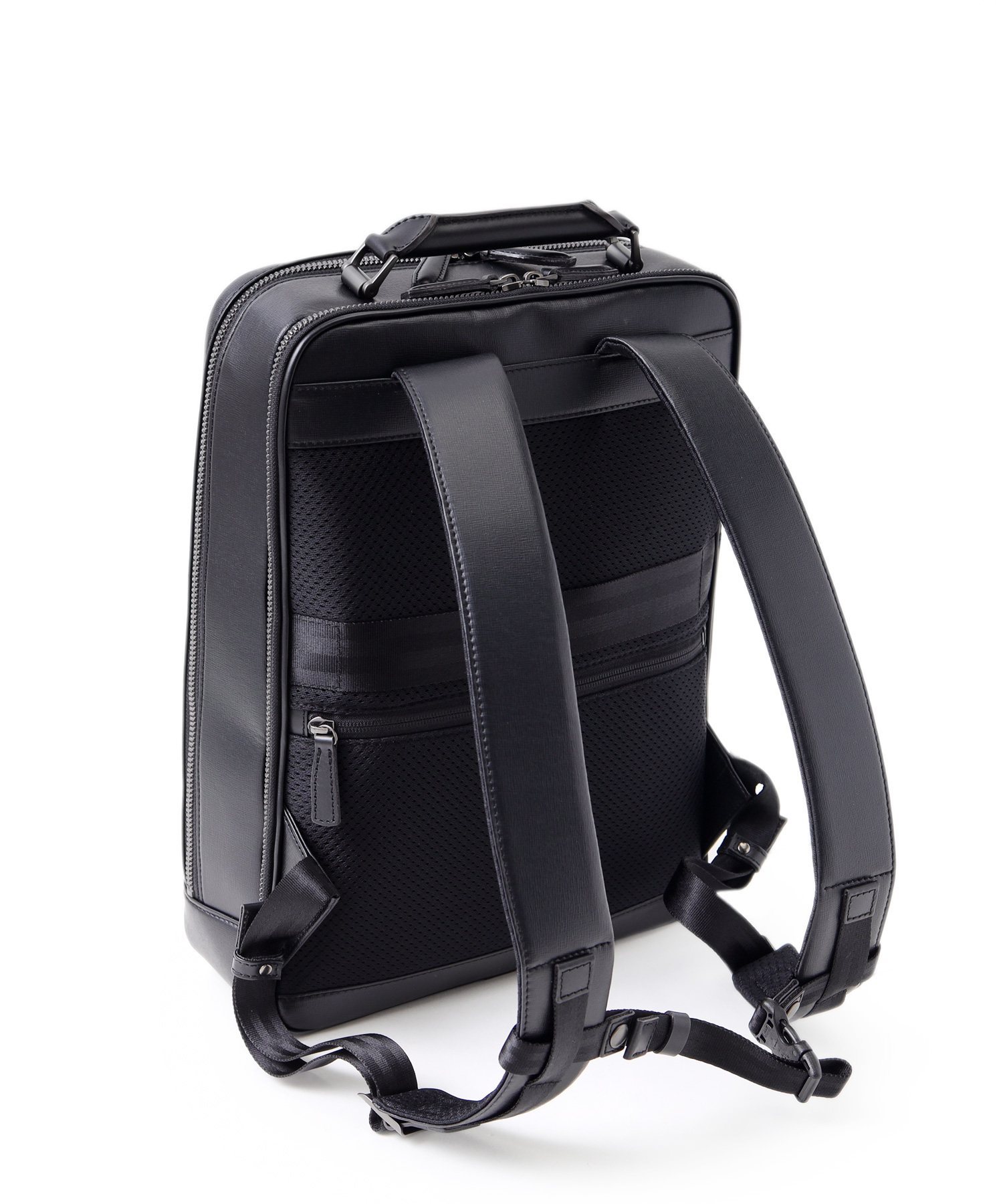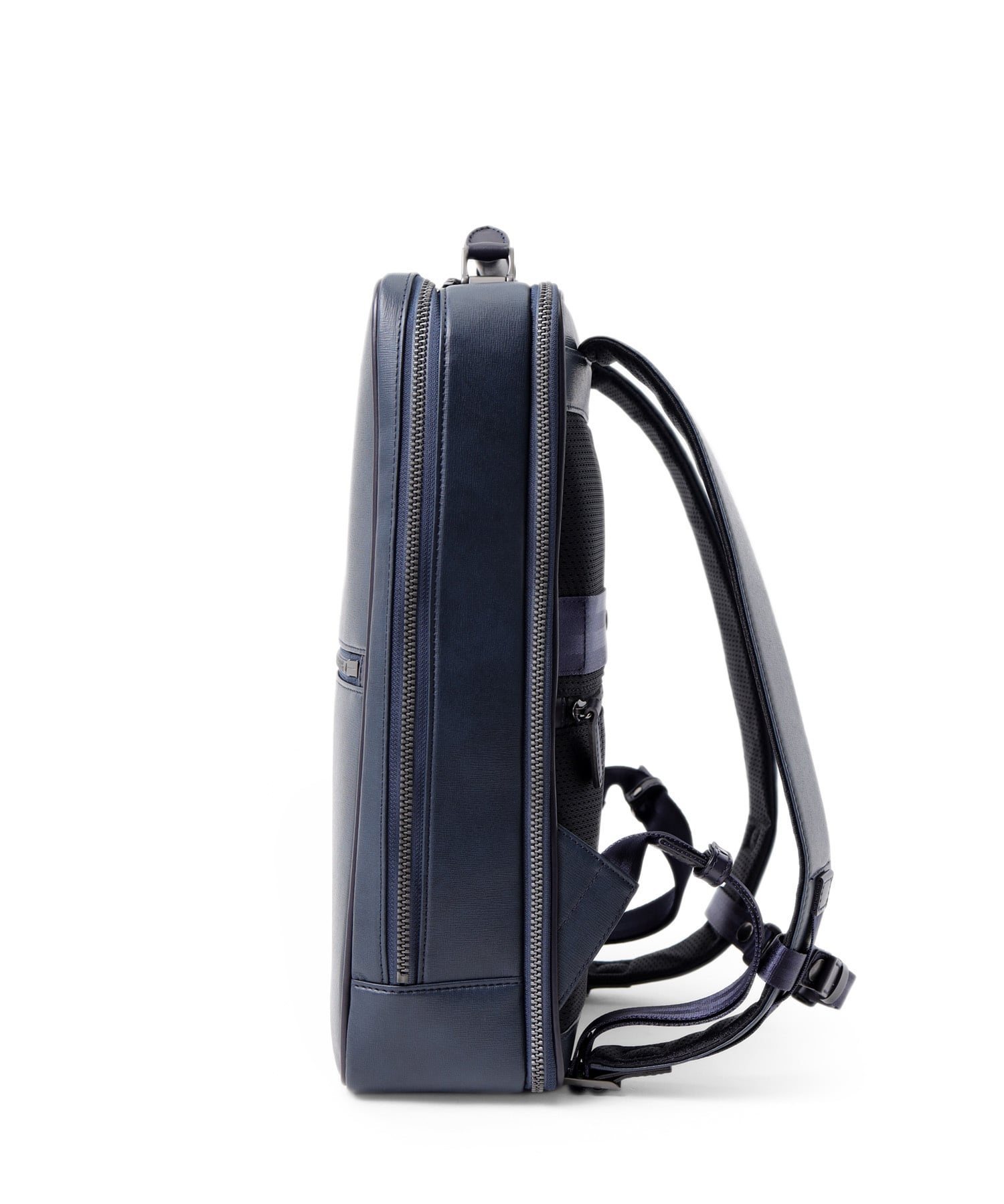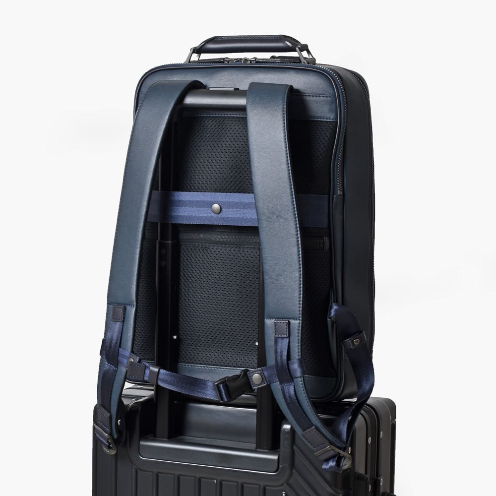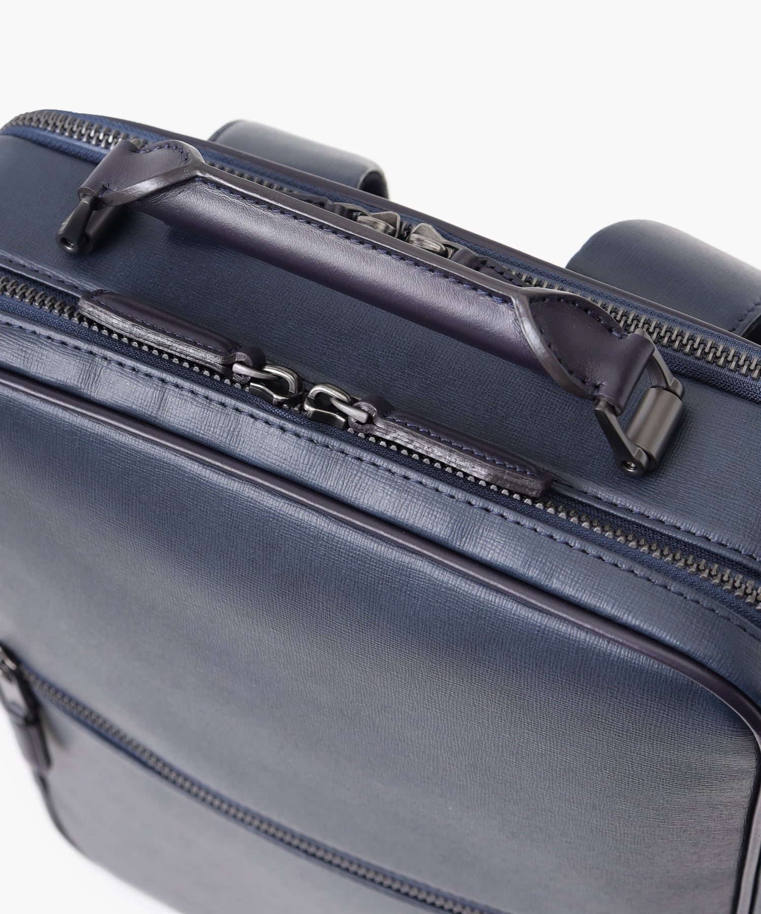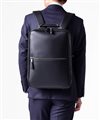 「クラリーノ」を使った、FUJITAKAのA4サイズのビジネスリュック。この素材は、型崩れしにくく高級感があり、丸みを帯びた風合いが特徴で、天然皮革に近い一体感のあるなじみを再現しています。