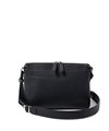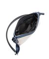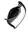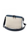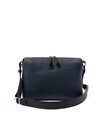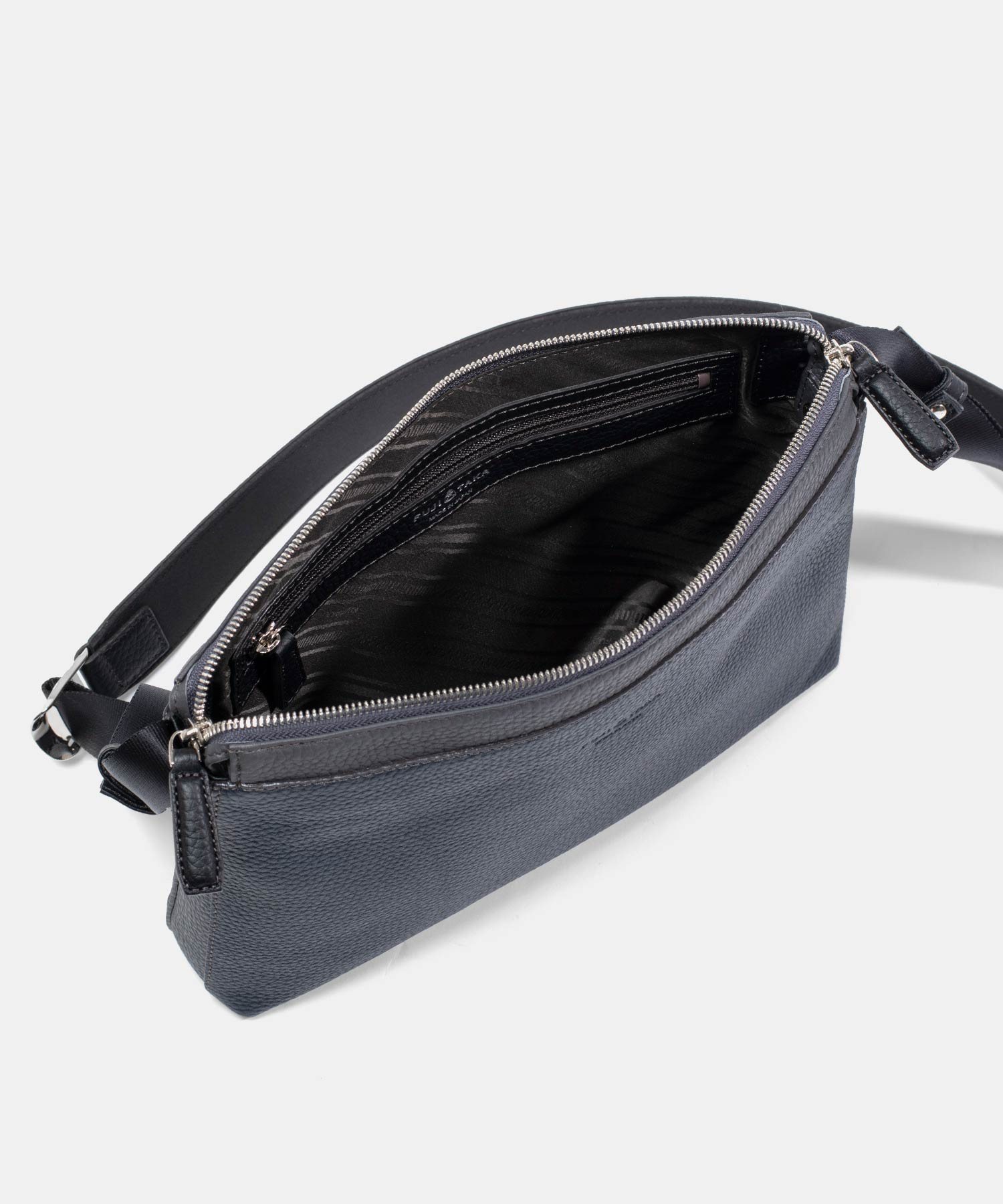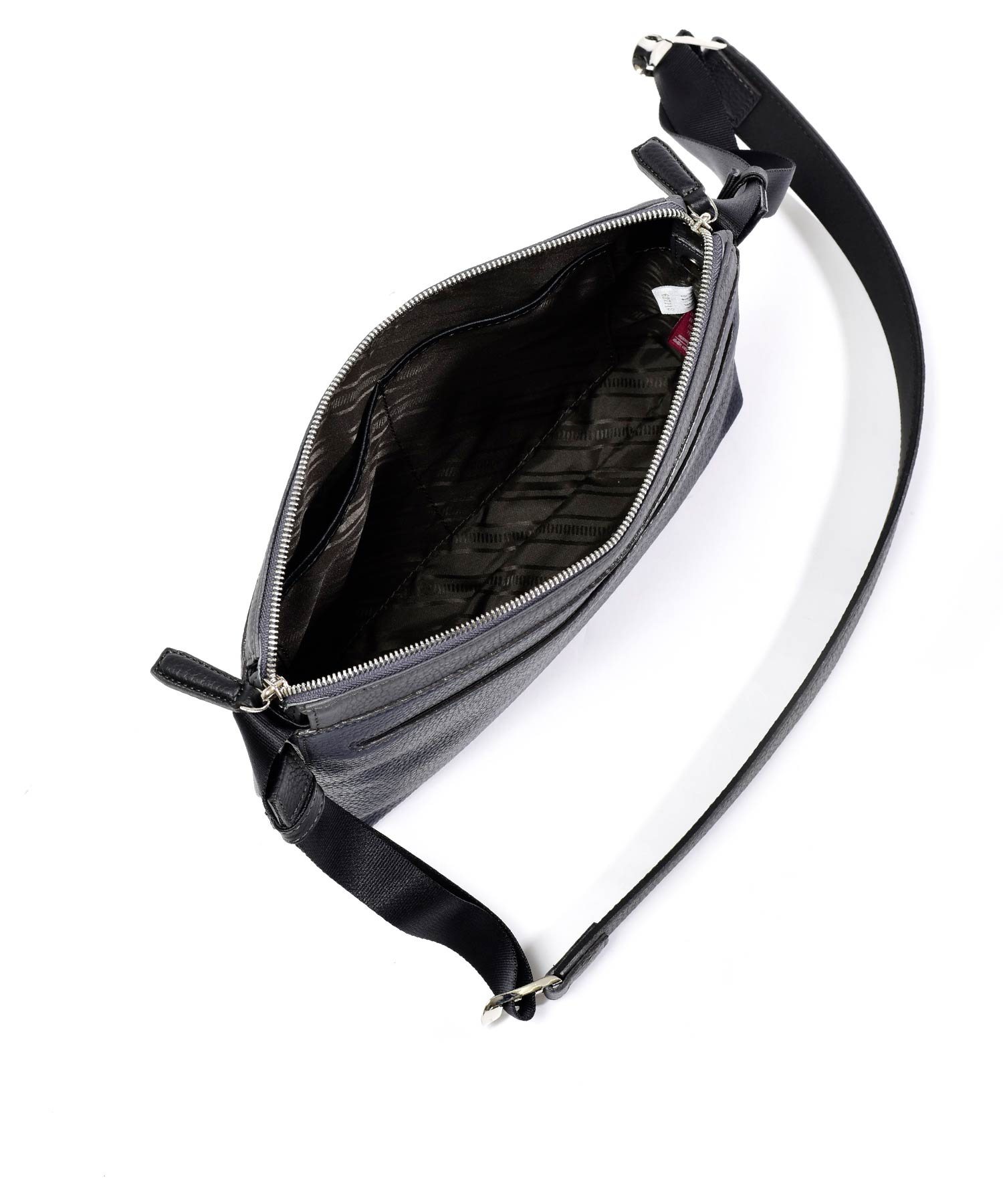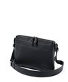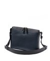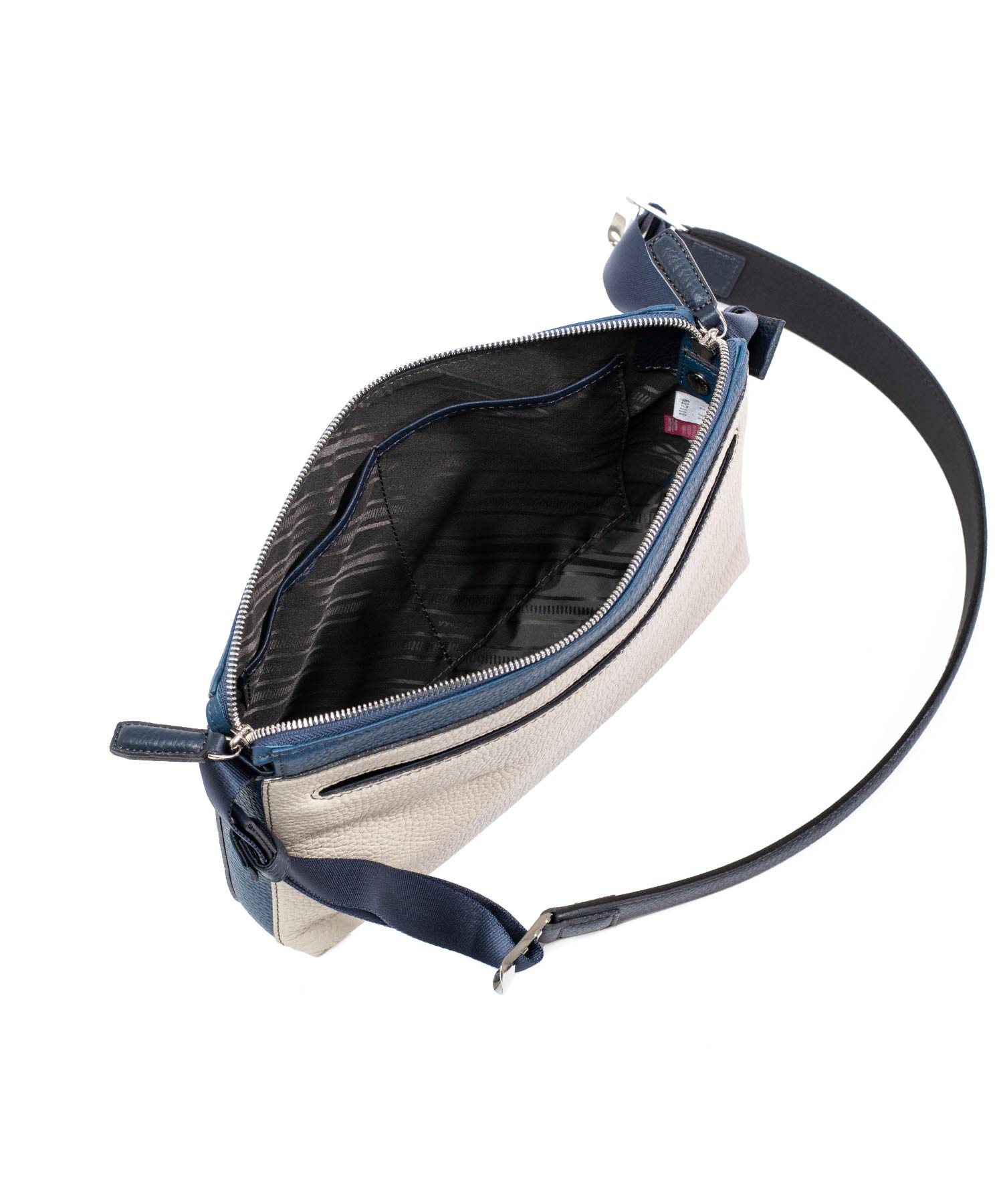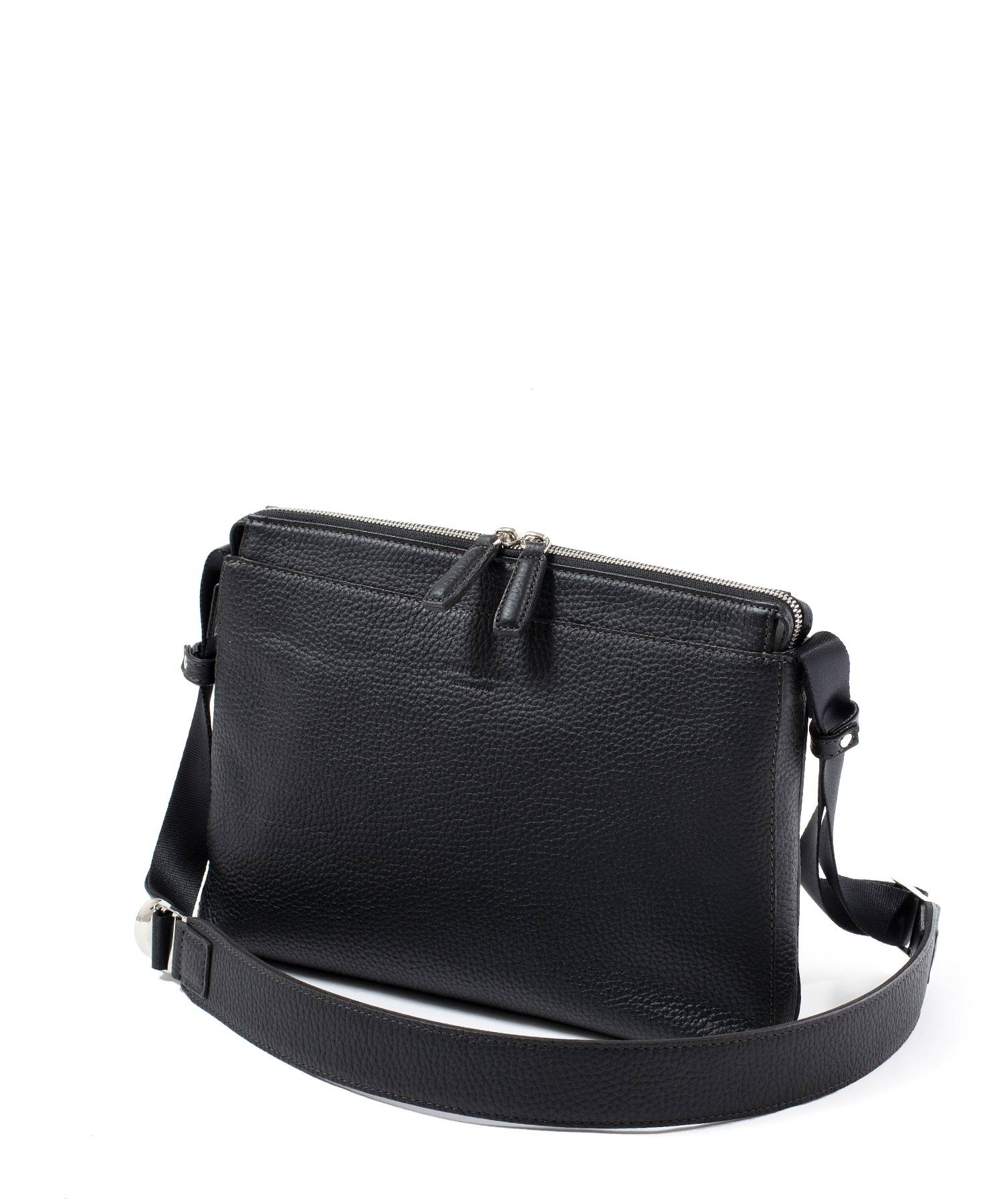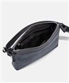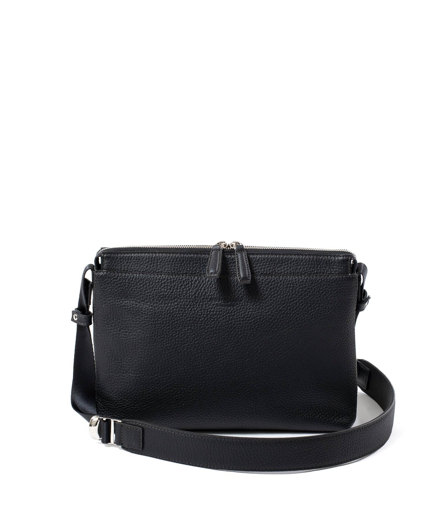 コンパクトなサコッシュ型ショルダーバッグ。内装にファスナーポケット、小ポケットが2つ、背面にポケットが1つあります。背面ポケットは幅約24cmで、埋め込み式のマグホックでの開閉となります。ショルダーベルトは中心部が革素材になっており、その両端の金具を使って長さを調整頂けます。
