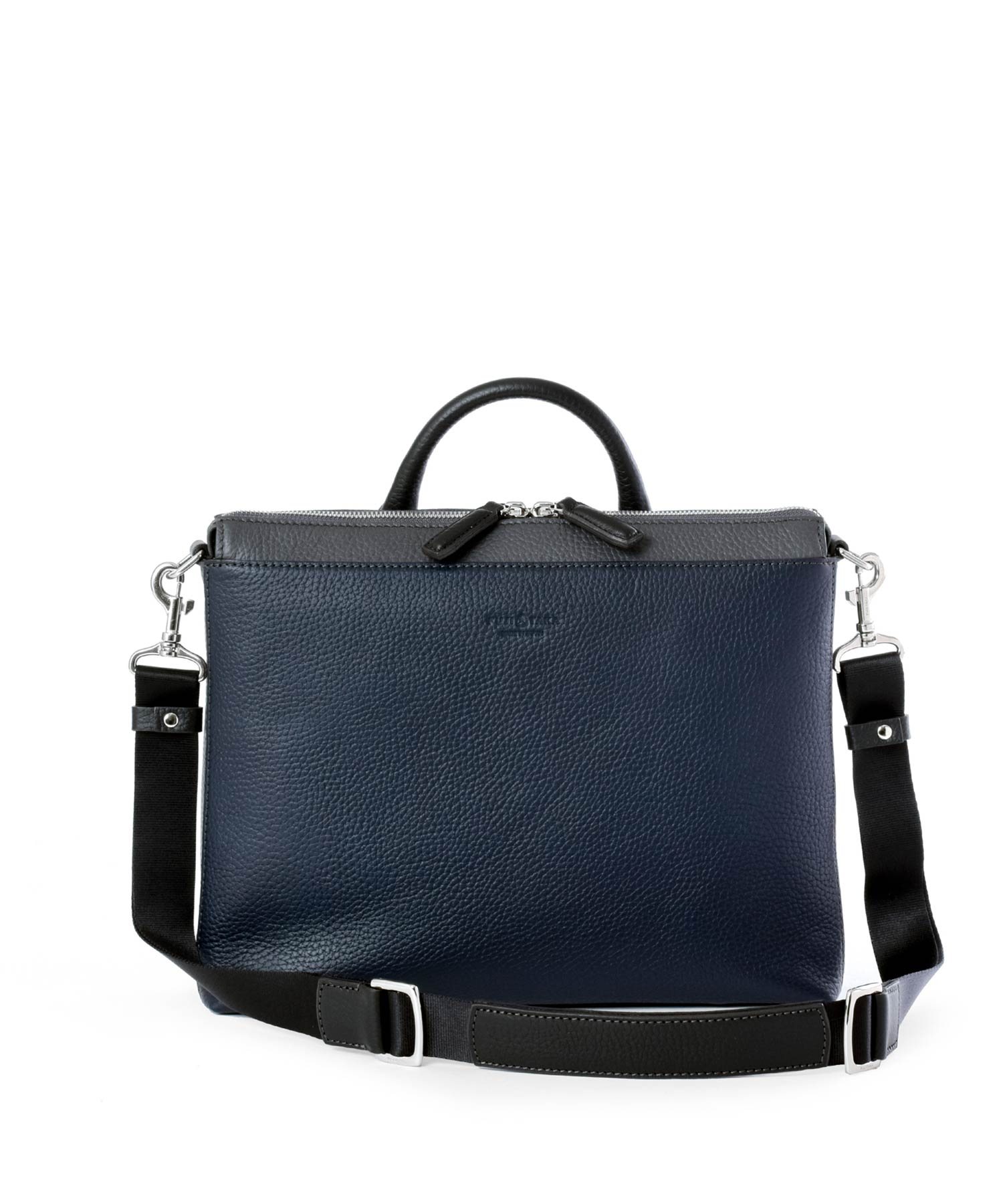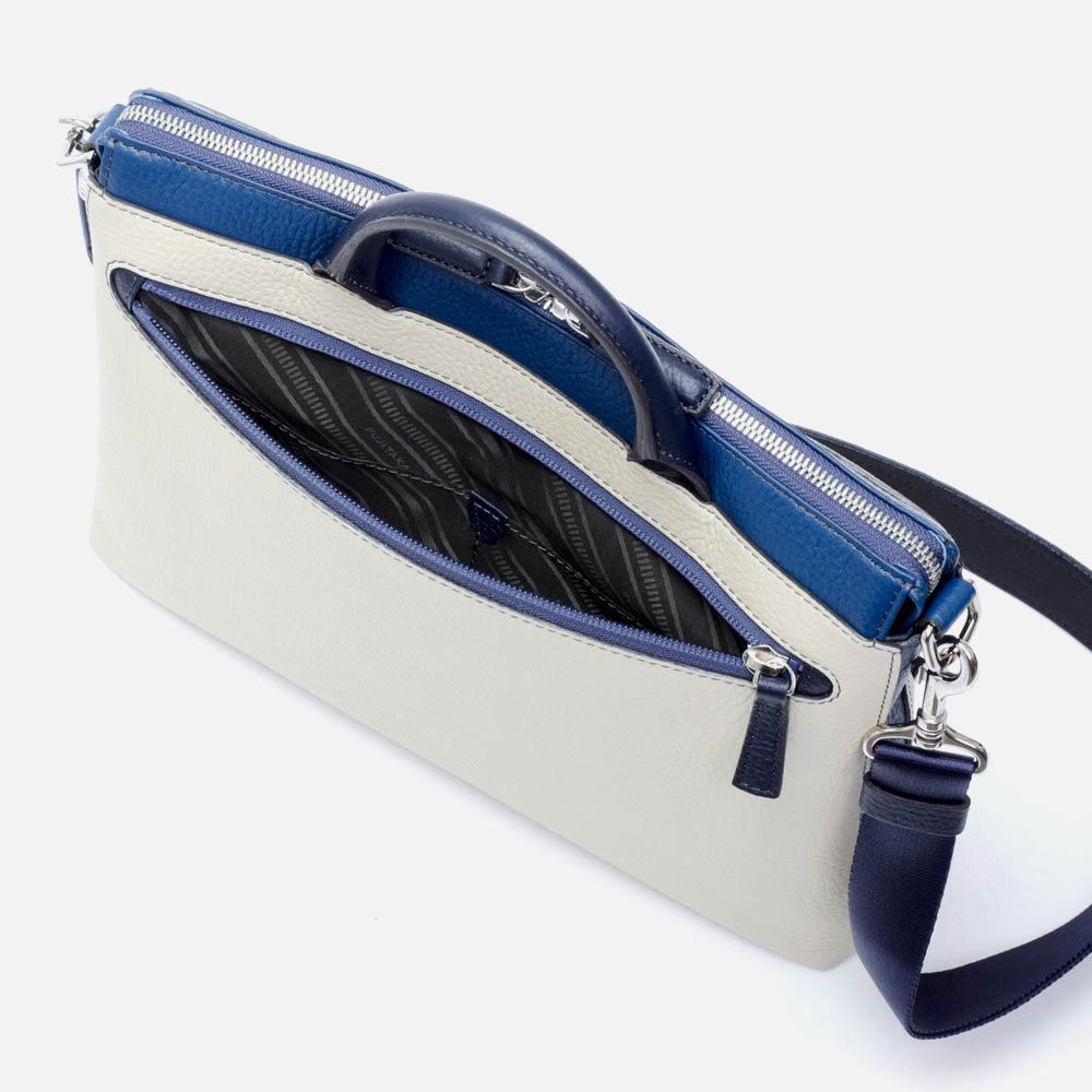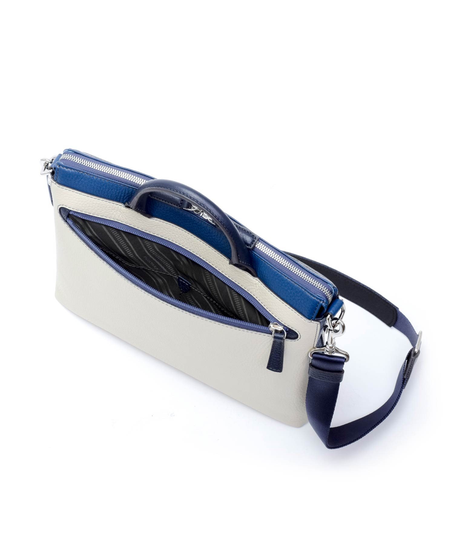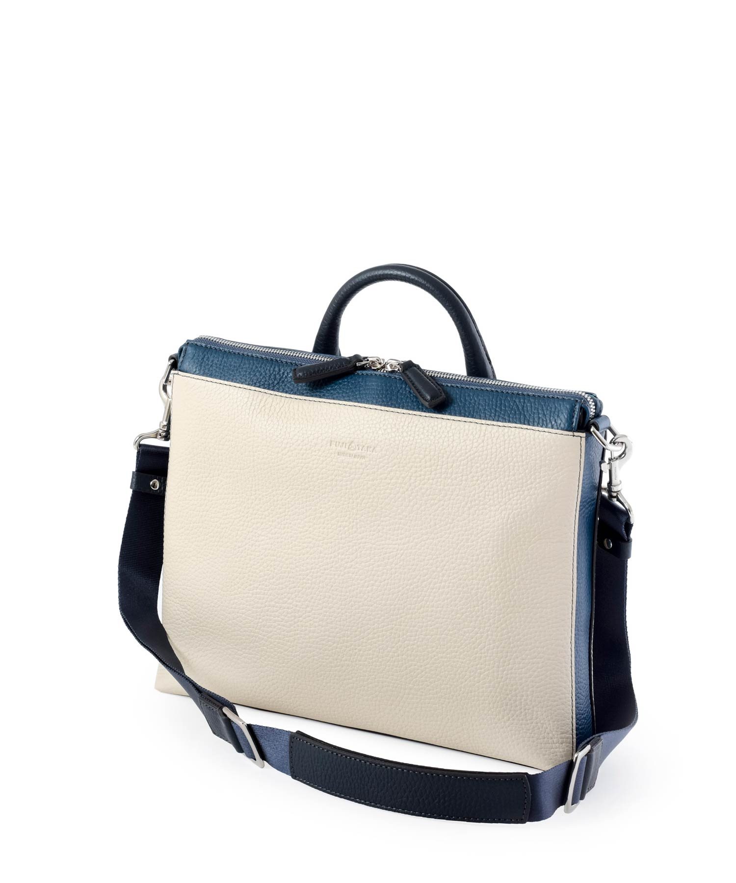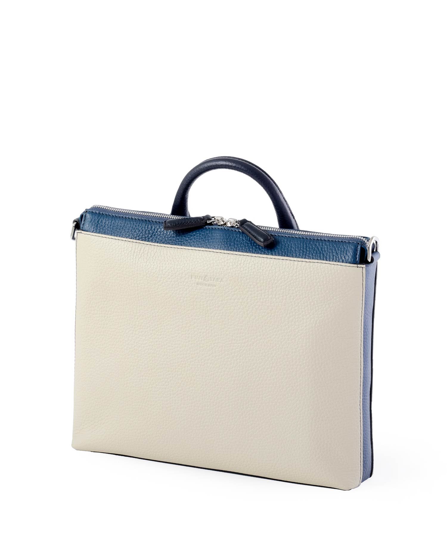 本体素材は柔らかな手触りが特徴の本革をカラーコンビで表現しています。職人の技術により、ボリュームのある立体的なシボ感を活かしながらも軽量に仕立て、ソフトでありながら自立するよう工夫した設計にしています。