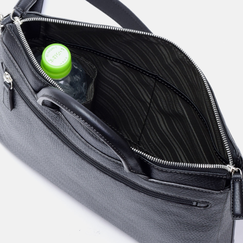 コンパクトなサイズ感ですが、収納機能を豊富に設けたショルダーバッグです。メインルームはB5のクリアファイル書類が入りタブレット端末もゆったりと入ります。ファスナーポケット、小ポケット2つを装備。ペットボトルホルダーもあるので、500mlペットボトルも立てて収納可能です。