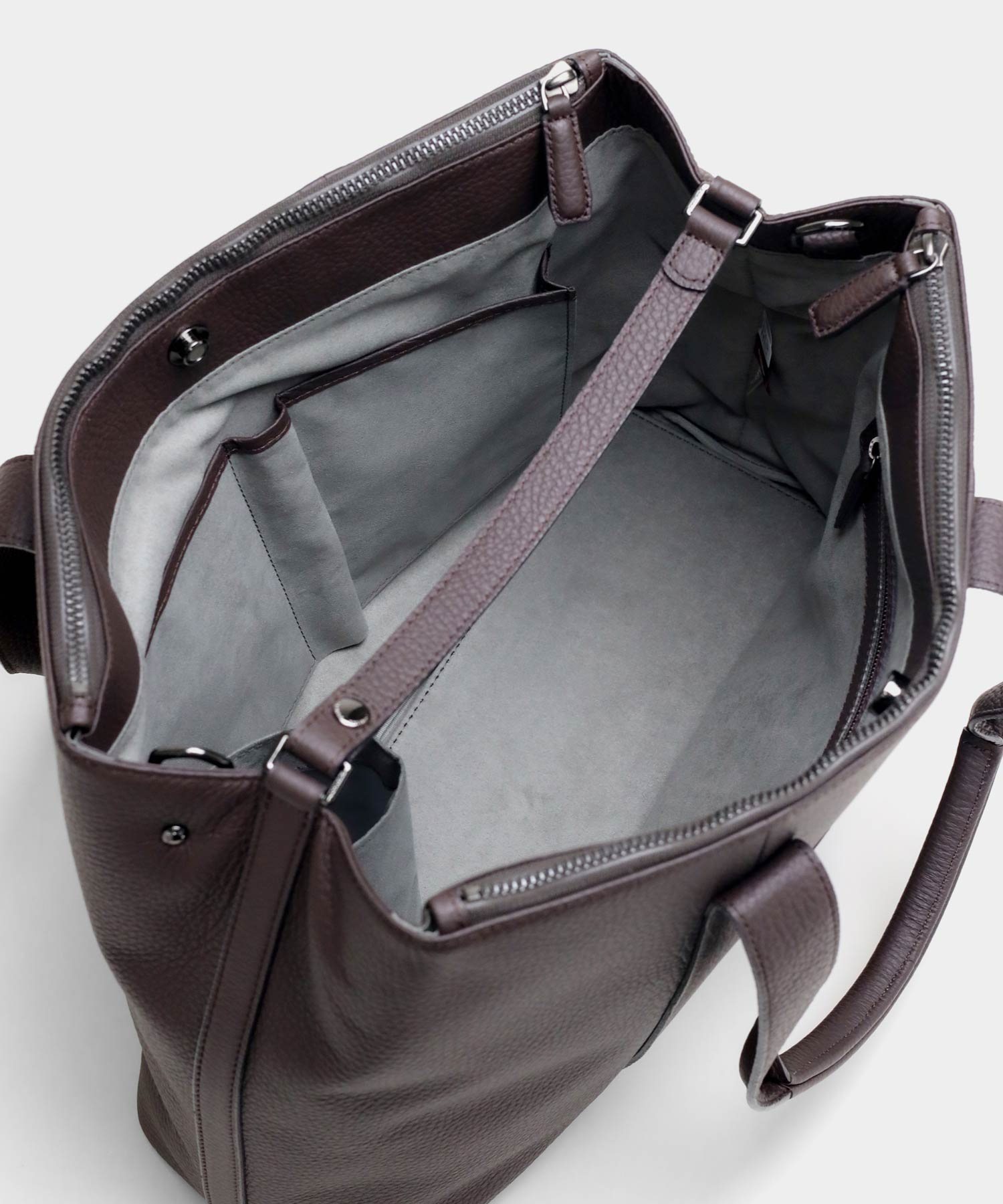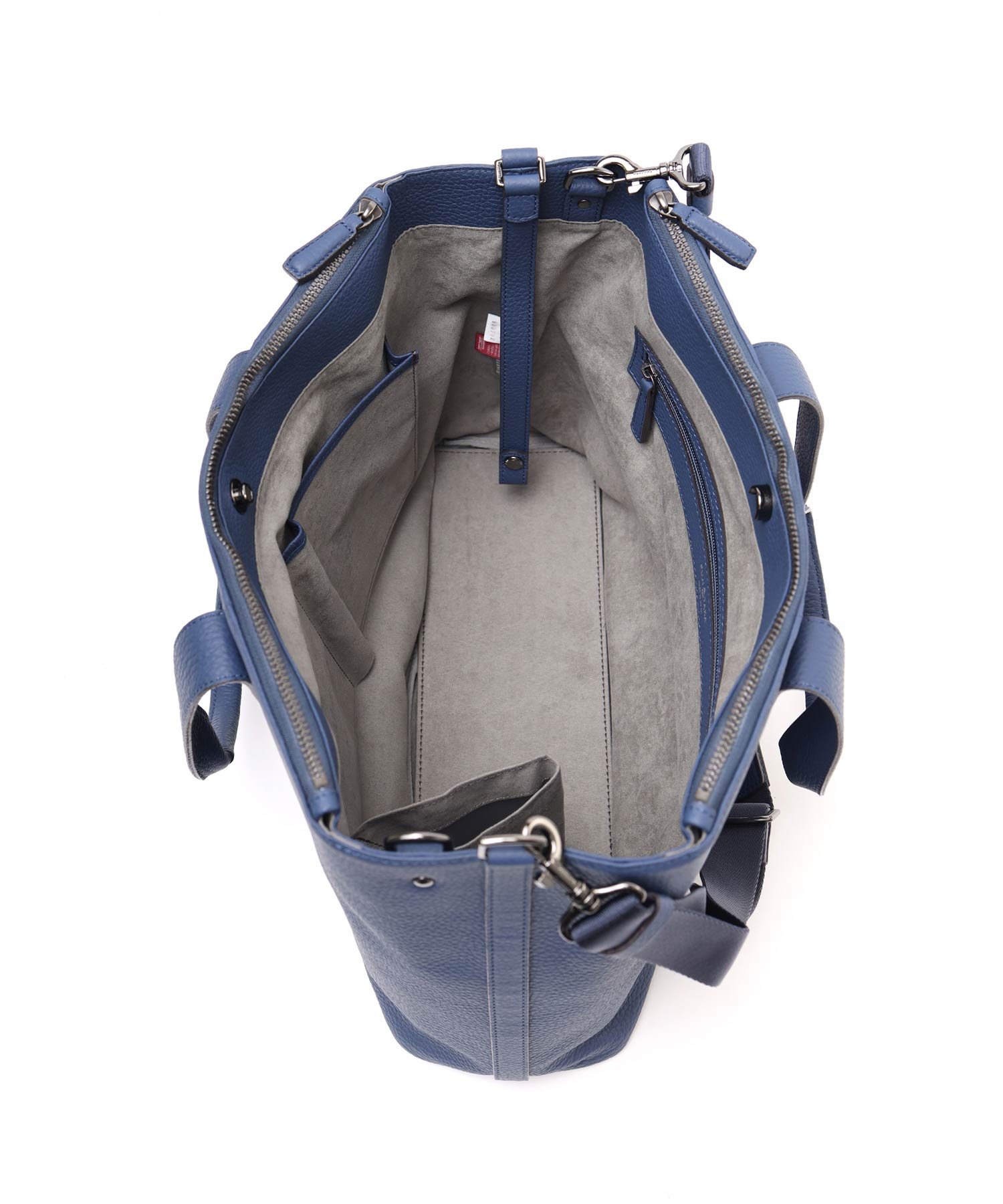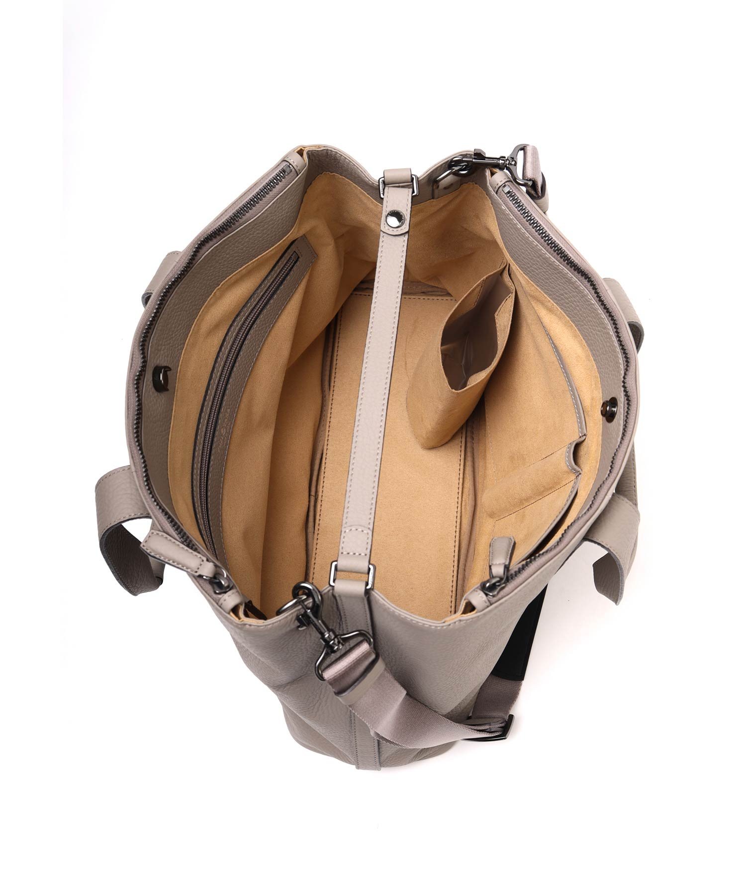B4サイズのレザートートバッグです。メインルーム内はファスナーポケット、小ポケットが2つ、ペンさし、ペットボトルホルダーがあります。前後にファスナー式のコンパートメントがあるトリプルルーム仕様で、背側ファスナーの内側にはさらに小ポケットが2つあります。鞄の背側にミニポケット付き。