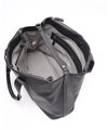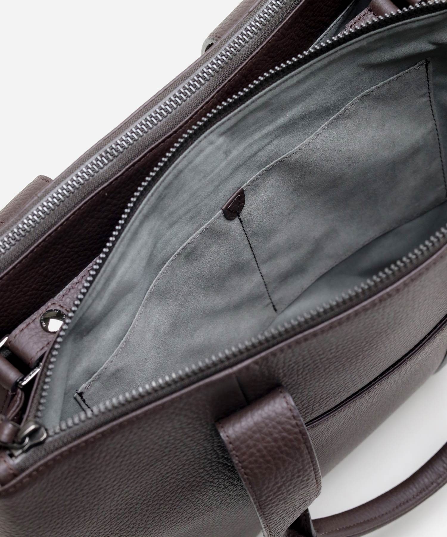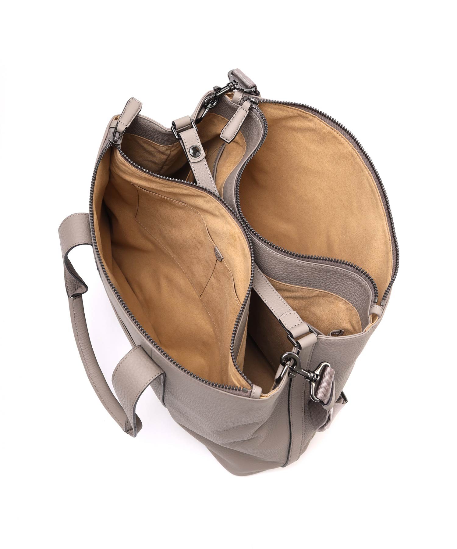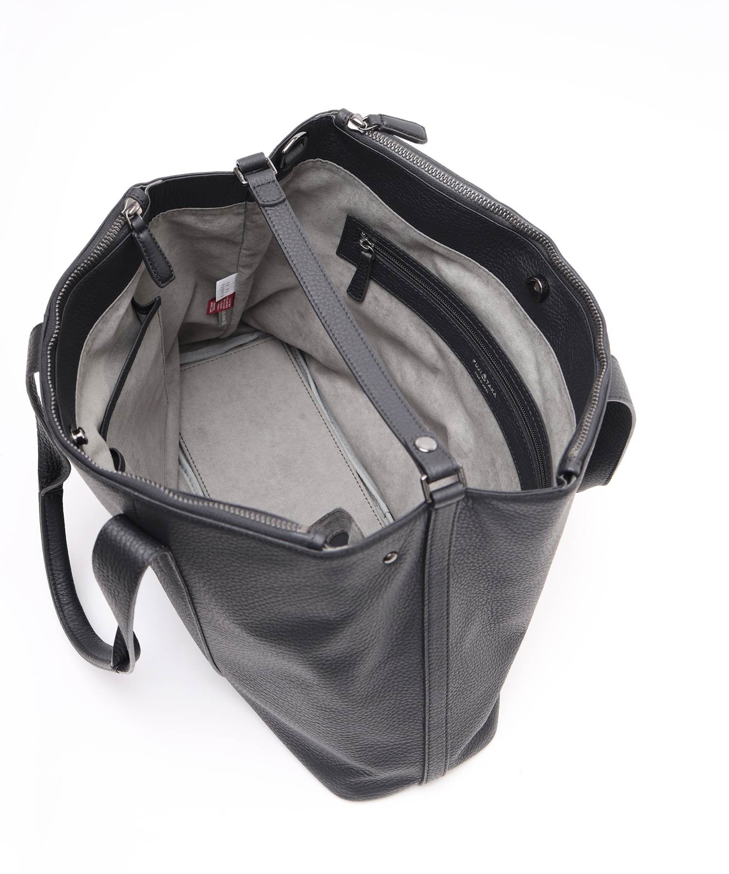 B4サイズのレザートートバッグです。メインルーム内はファスナーポケット、小ポケットが2つ、ペンさし、ペットボトルホルダーがあります。前後にファスナー式のコンパートメントがあるトリプルルーム仕様で、背側ファスナーの内側にはさらに小ポケットが2つあります。鞄の背側にミニポケット付き。