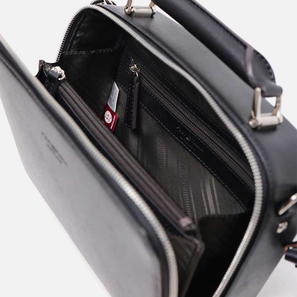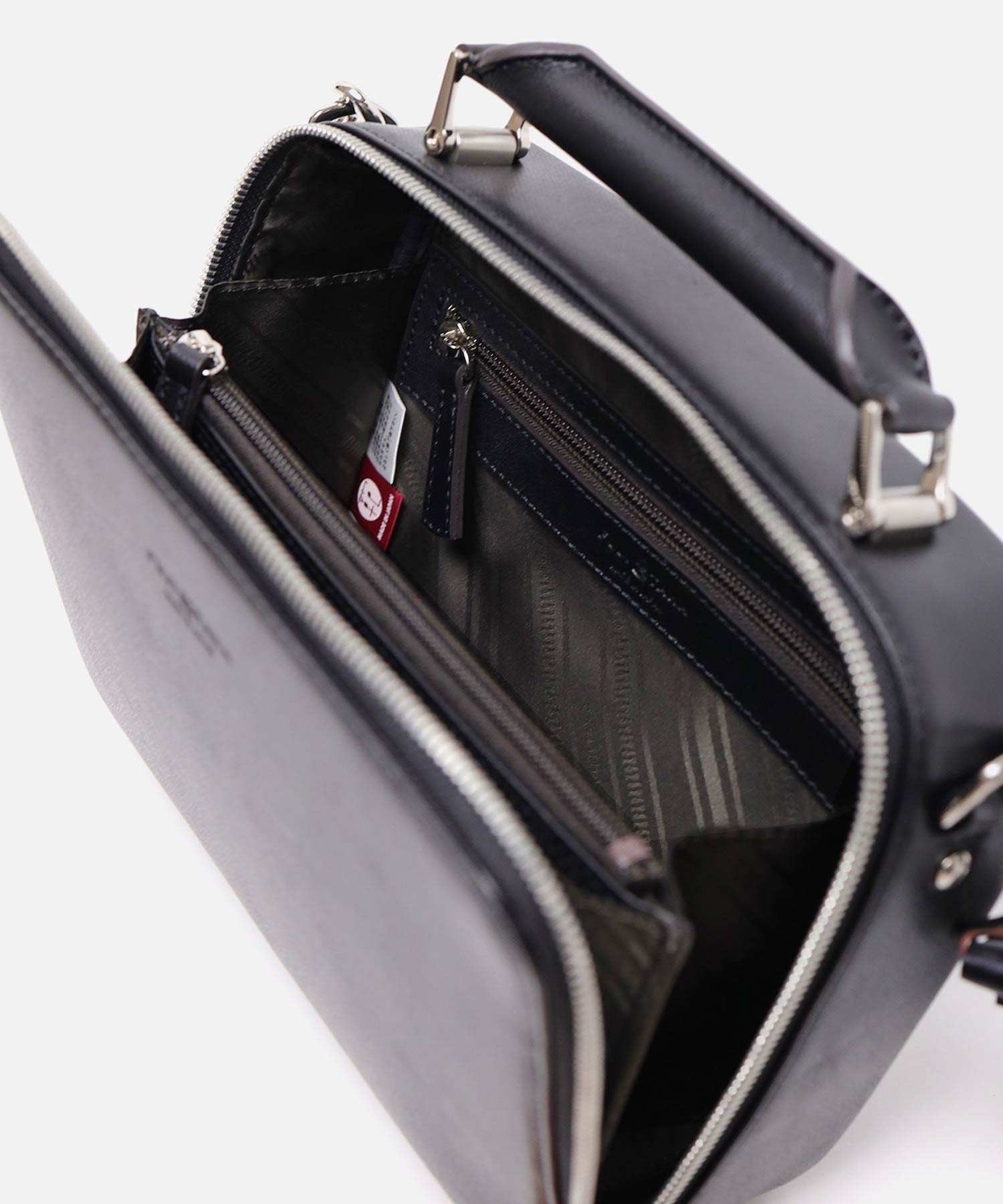 オリジナル金具と型押しレザーがスタイリッシュモダンな品格ただよう斜め掛けにもネックショルダーにも対応するフジタカ スクエアショルダーバッグ。ハンドル付きの高級感あるミニバッグです。