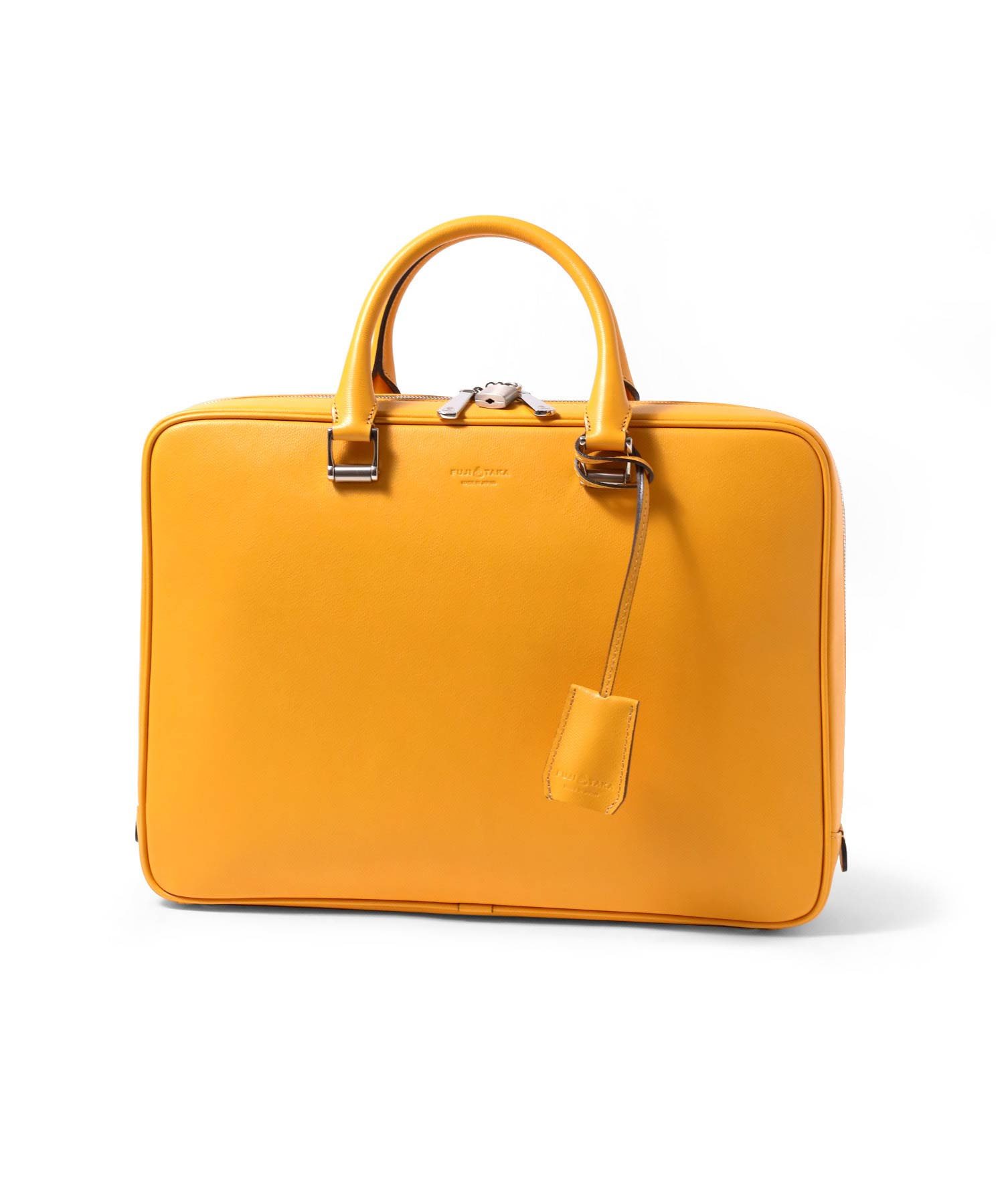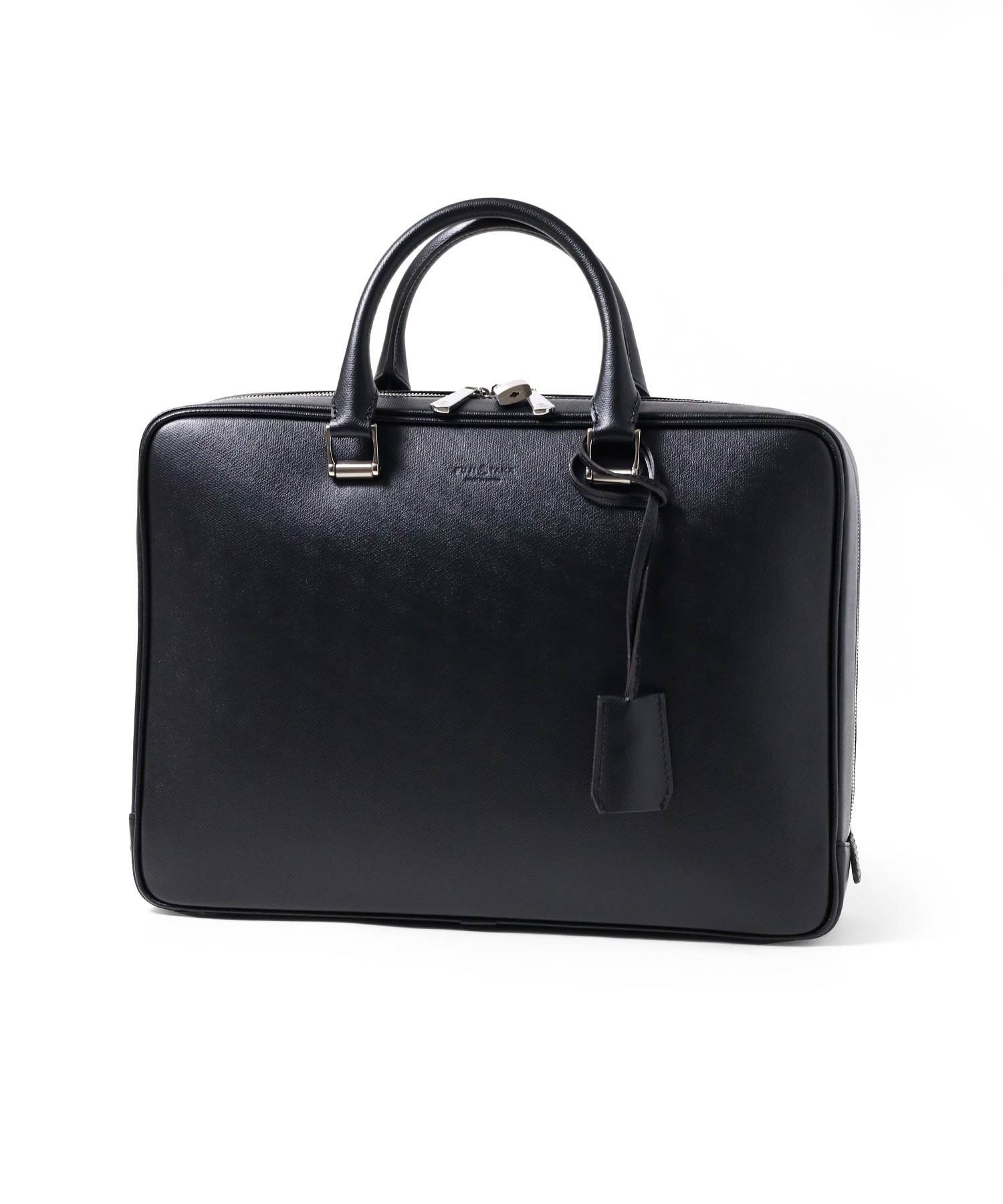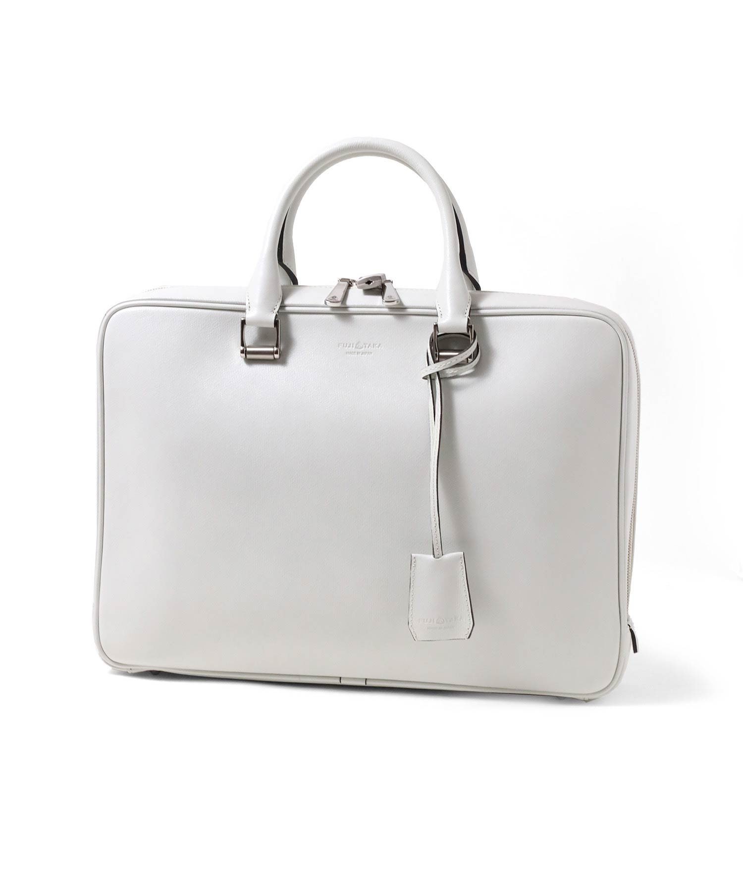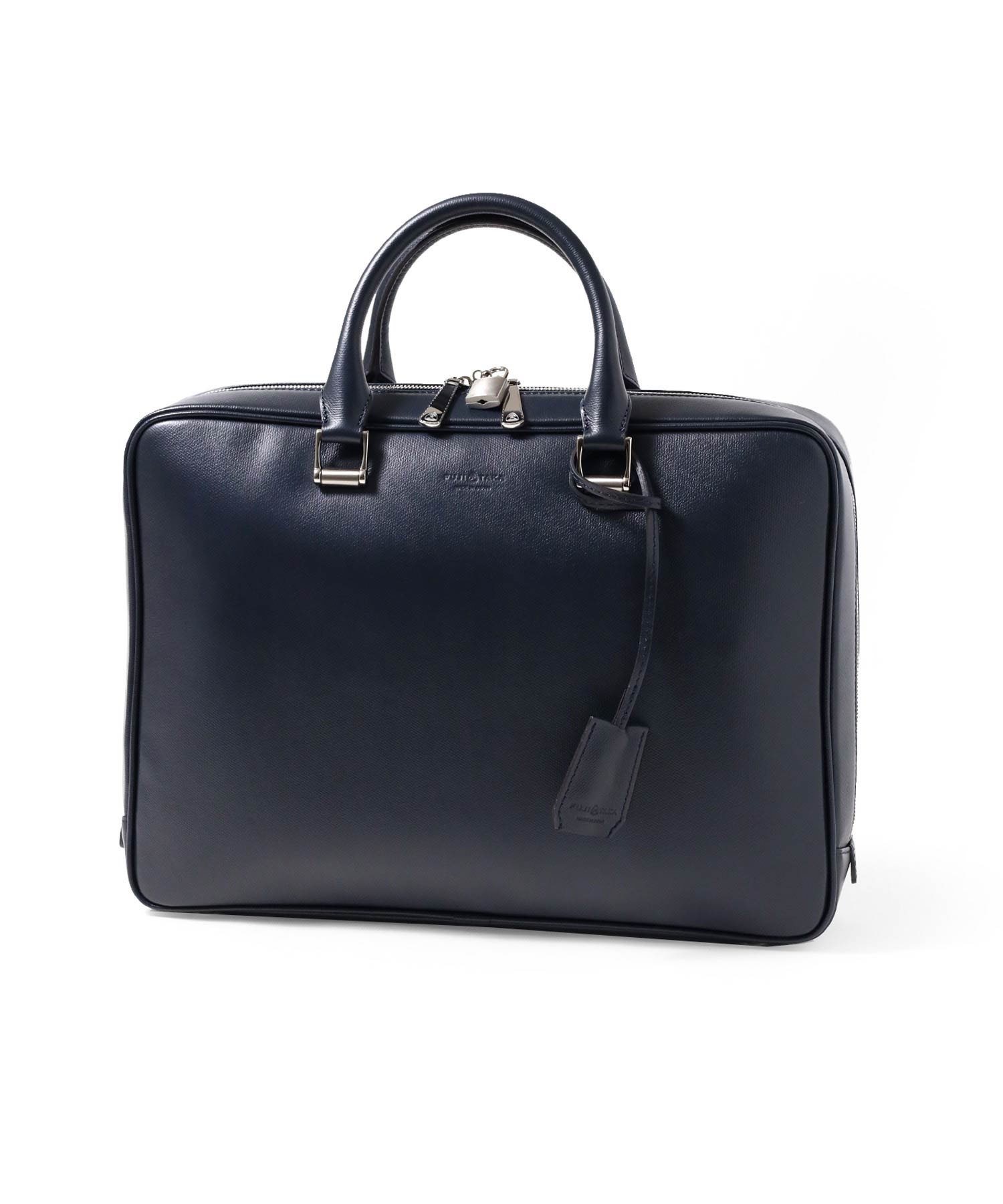 上品さと高級感をあわせもったフジタカのA4サイズのビジネスバッグ。ファスナーを両サイドまでぐるっと落とした三方開きの仕様は、口開きを良くしビジネスシーンでの使いやすさも考慮した、フジタカならではのデザインです。厳選された上質な北米の原皮にこだわり、技術の高さで定評のある日本のタンナーで染色し、防水(スコッチガード)加工を施した牛革をメイン素材に採用しています。