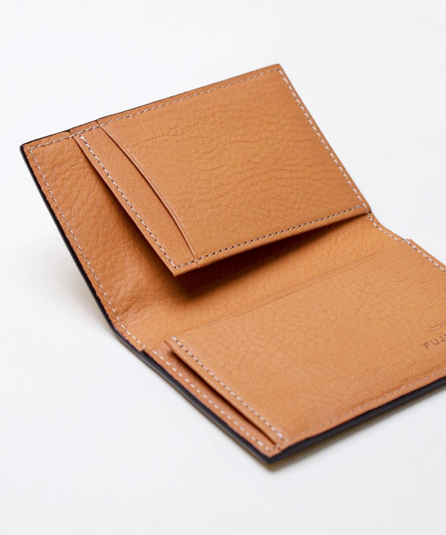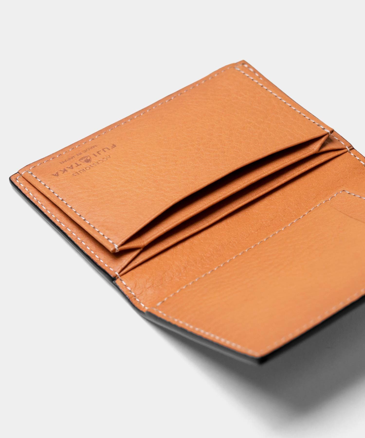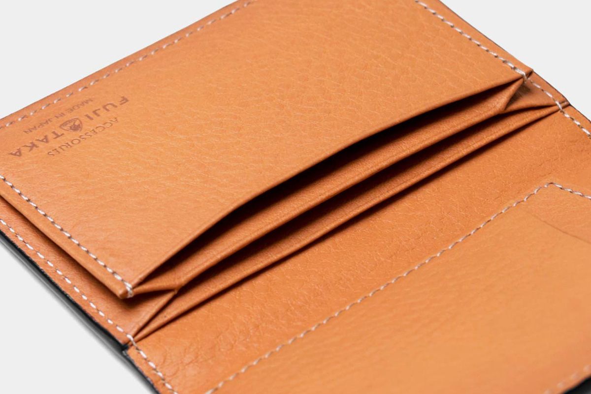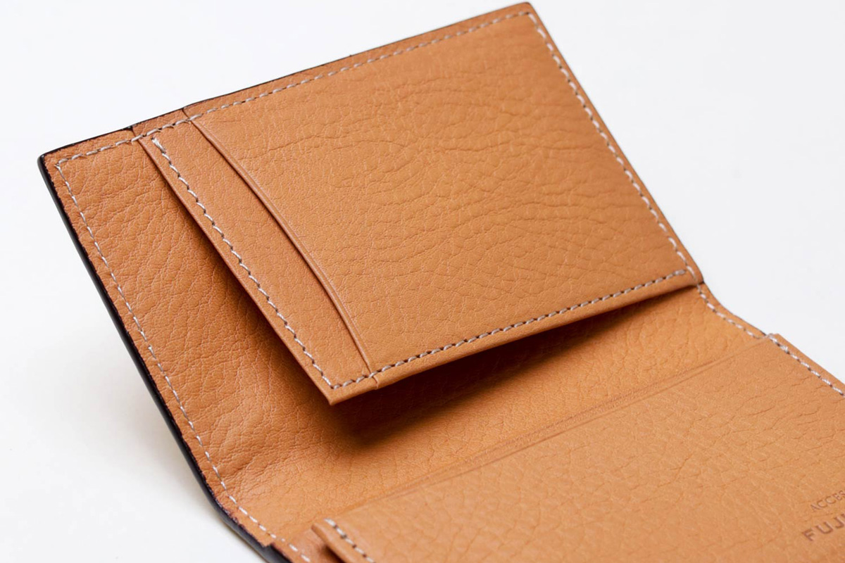 風琴マチを採用しており、薄いにも関わらず出し入れのしやすい作りです。マチは内側に折り込む仕様ですが、風琴マチは外側に折られているため有効幅が広くなり、収納力に優れています。また薄くつくることが可能になります。日本独自の伝統技法で、正確で緻密な職人の技があってこそ実現します。