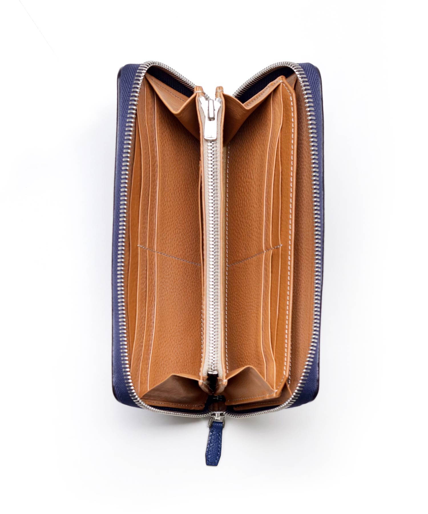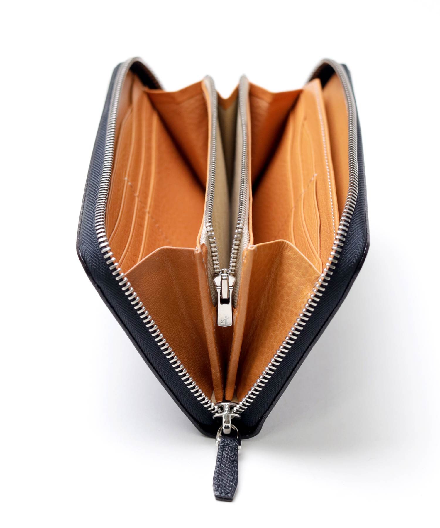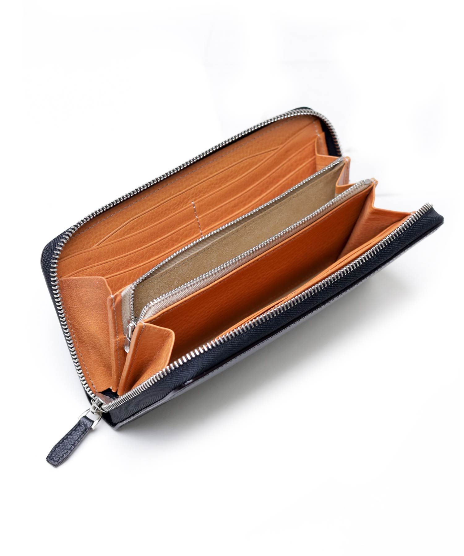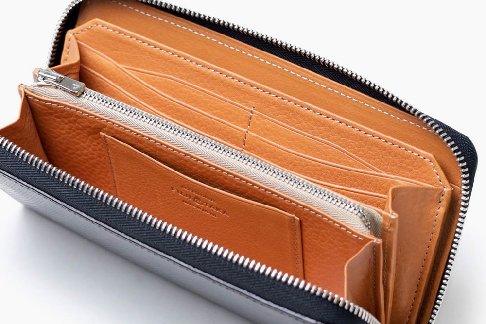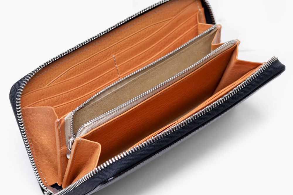 風琴マチを採用しており、薄いにも関わらず出し入れのしやすい作りです。マチは内側に折り込む仕様ですが、風琴マチは外側に折られているため有効幅が広くなり、収納力に優れています。また薄くつくることが可能になります。日本独自の伝統技法で、正確で緻密な職人の技があってこそ実現します。