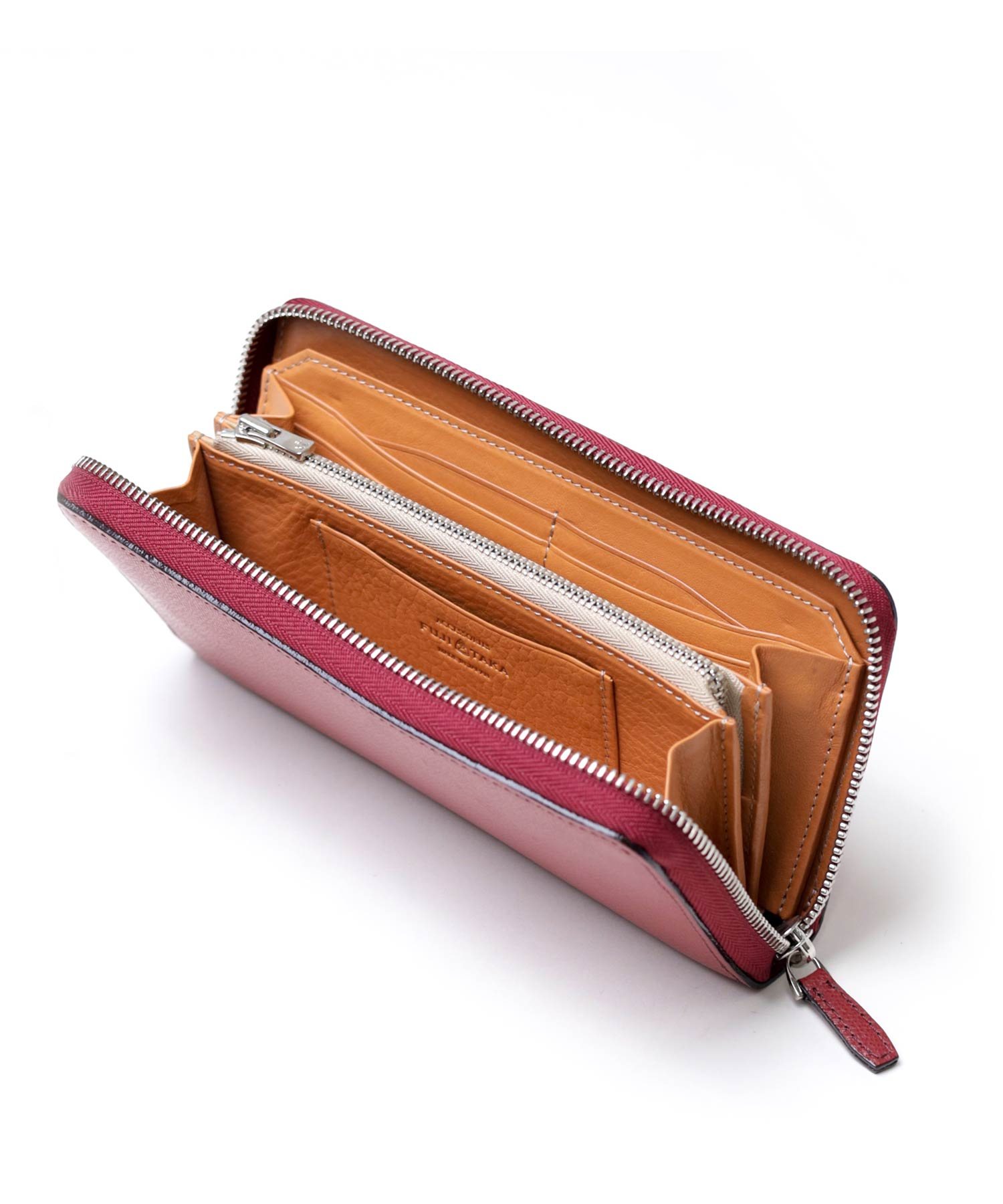 型押しながらもソフトな吟面のタッチ感やもっちりとした風合い、吟浮きが極端に少ない等、丁寧に作り込んだ国内最高峰の型押し素材を使ったFUJITAKAの風琴マチ仕様のラウンドファスナー長財布。