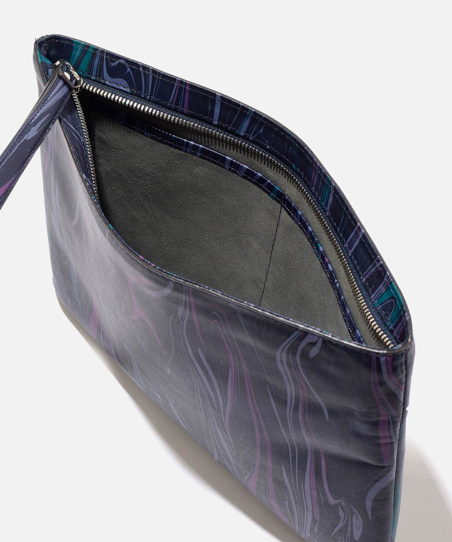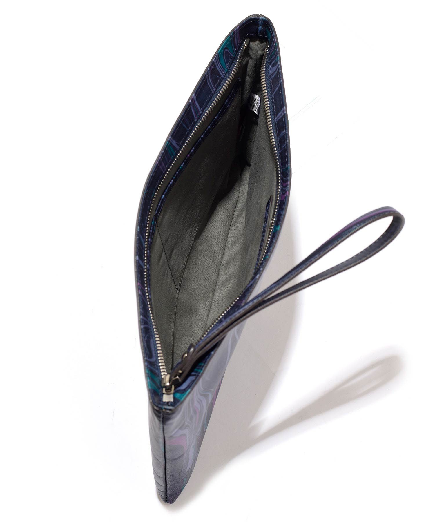 B5サイズのメインルームには長財布やその他貴重品などを入れて持ち歩くことができます。スエード調生地を使用している内装にはファスナーポケット、オープンポケットが2つあります。
