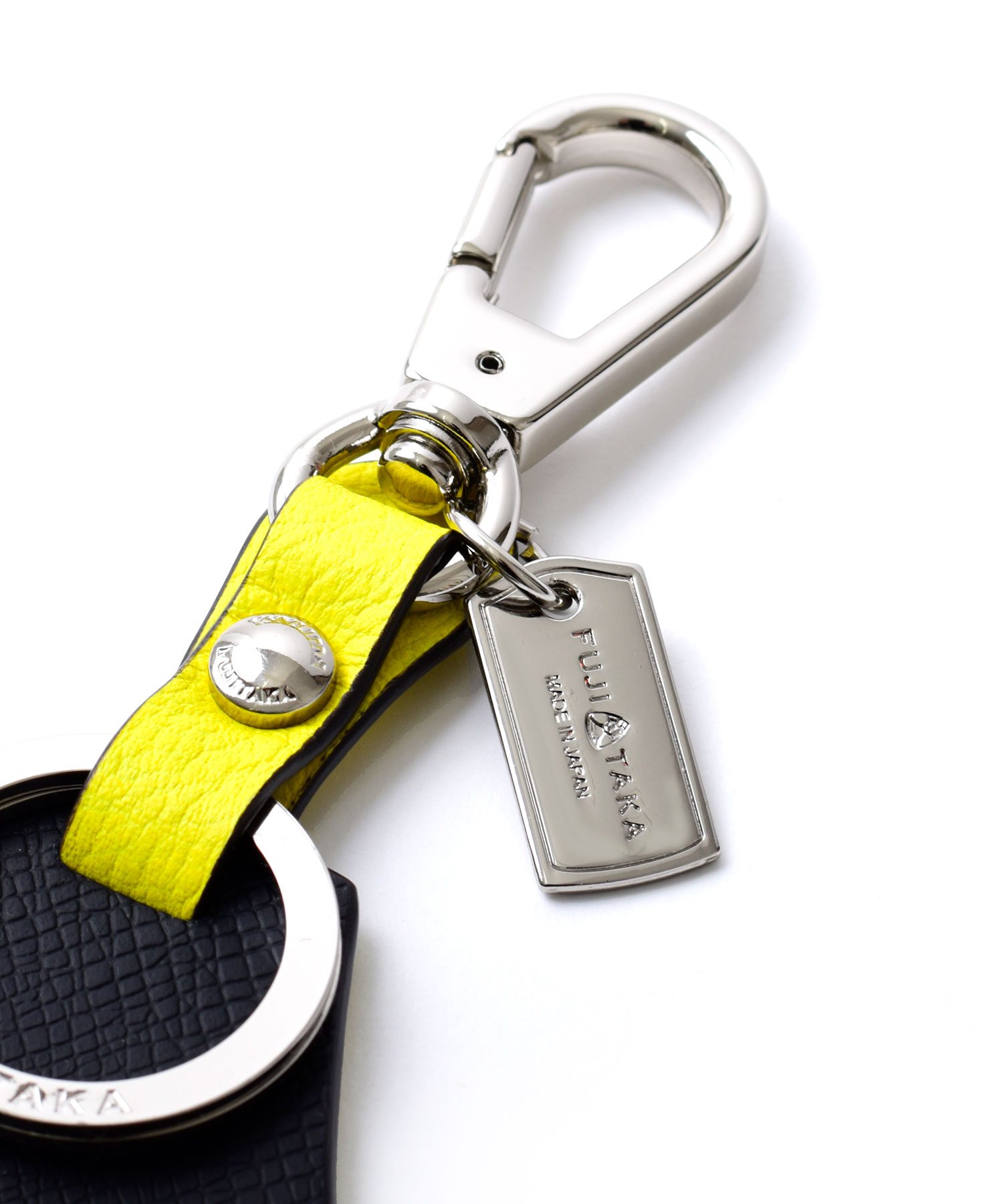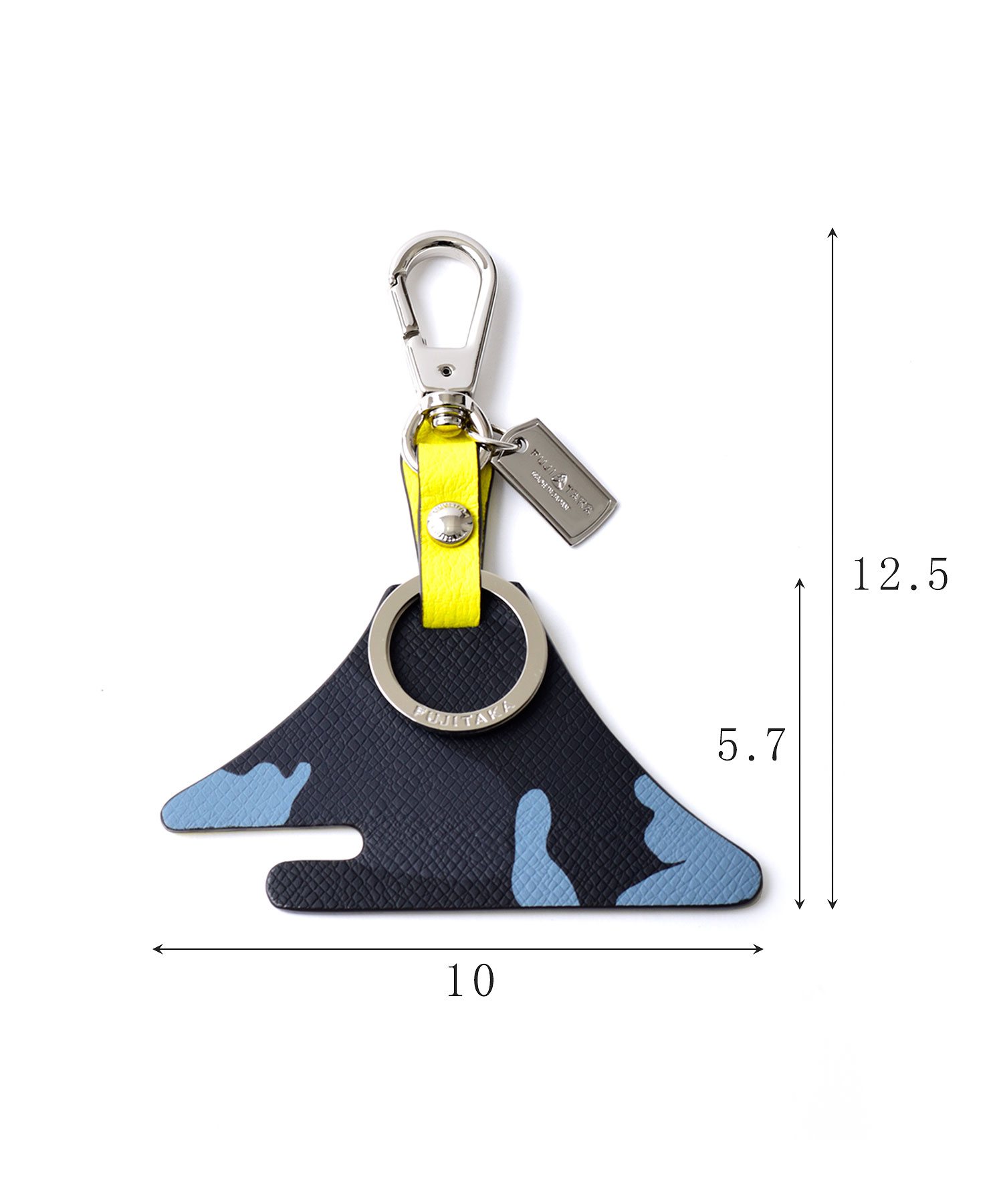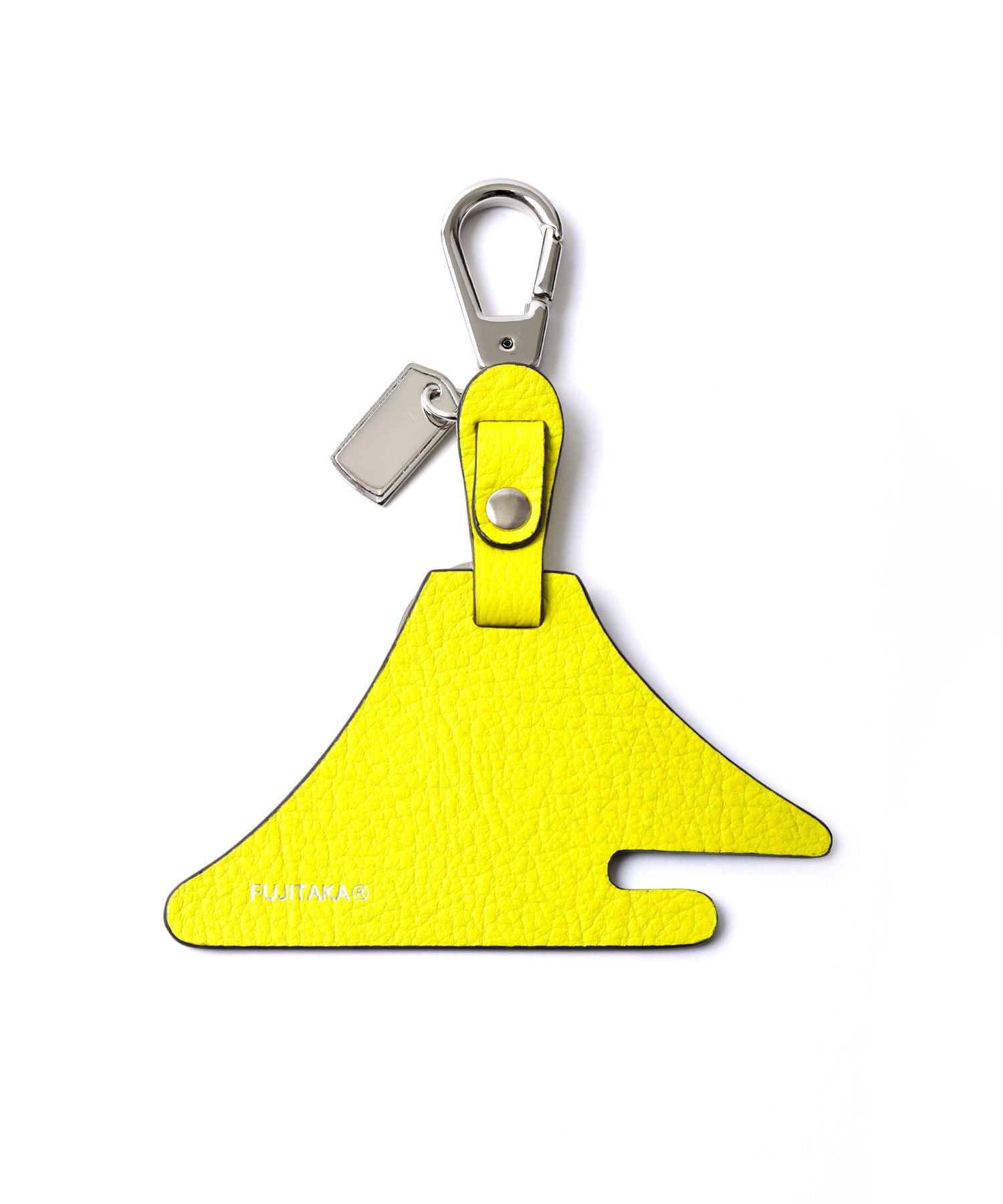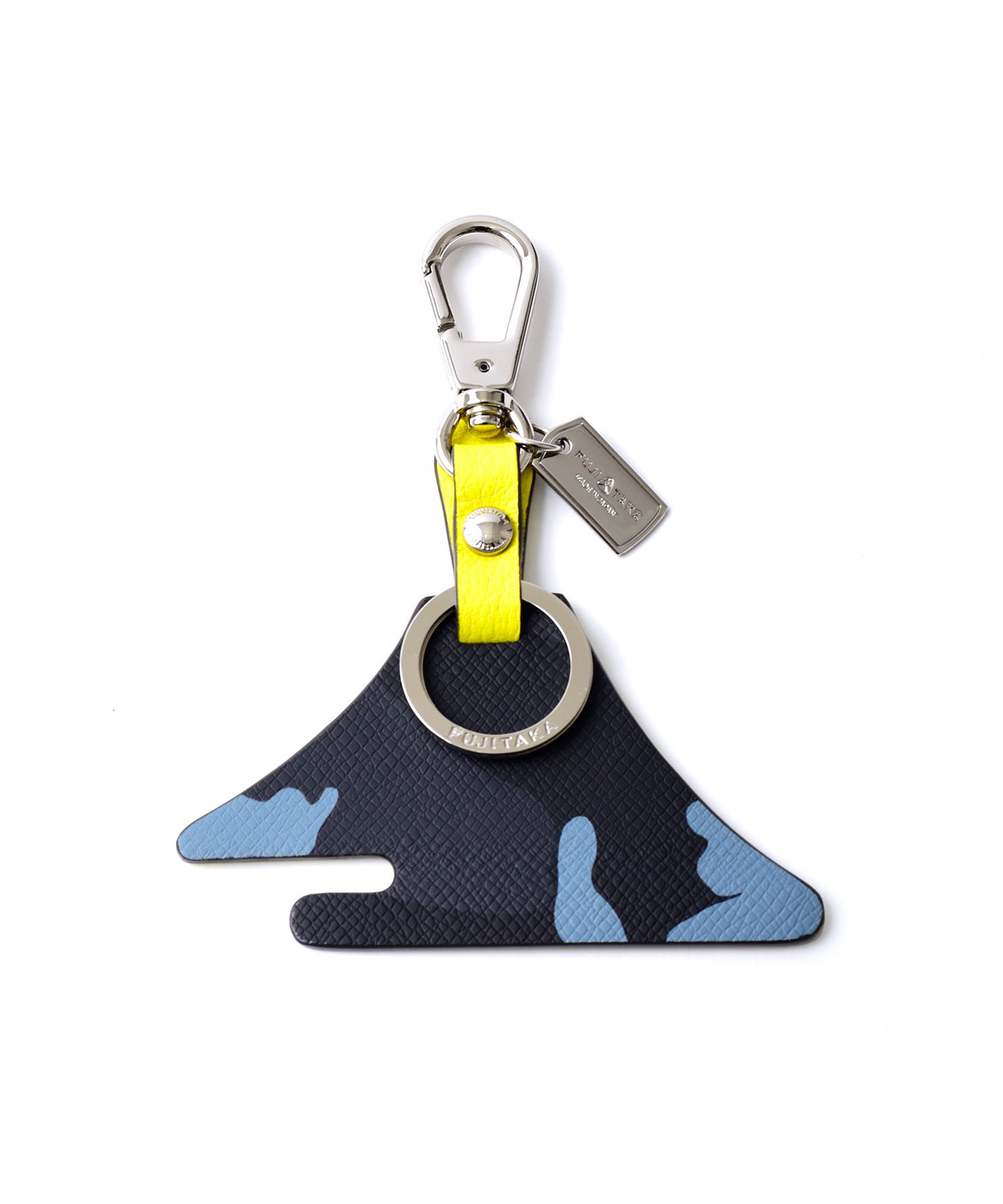 フジタカオリジナルの紋章である【富士山】をかたどった、フジタカのキーホルダー。シンプルで上品な型押しを施し、高級感のある仕上がりになっています。表裏で違ったカラーを楽しめるのもポイント。二重リングとナスカンが付いているので様々な場所に付けていただけます。