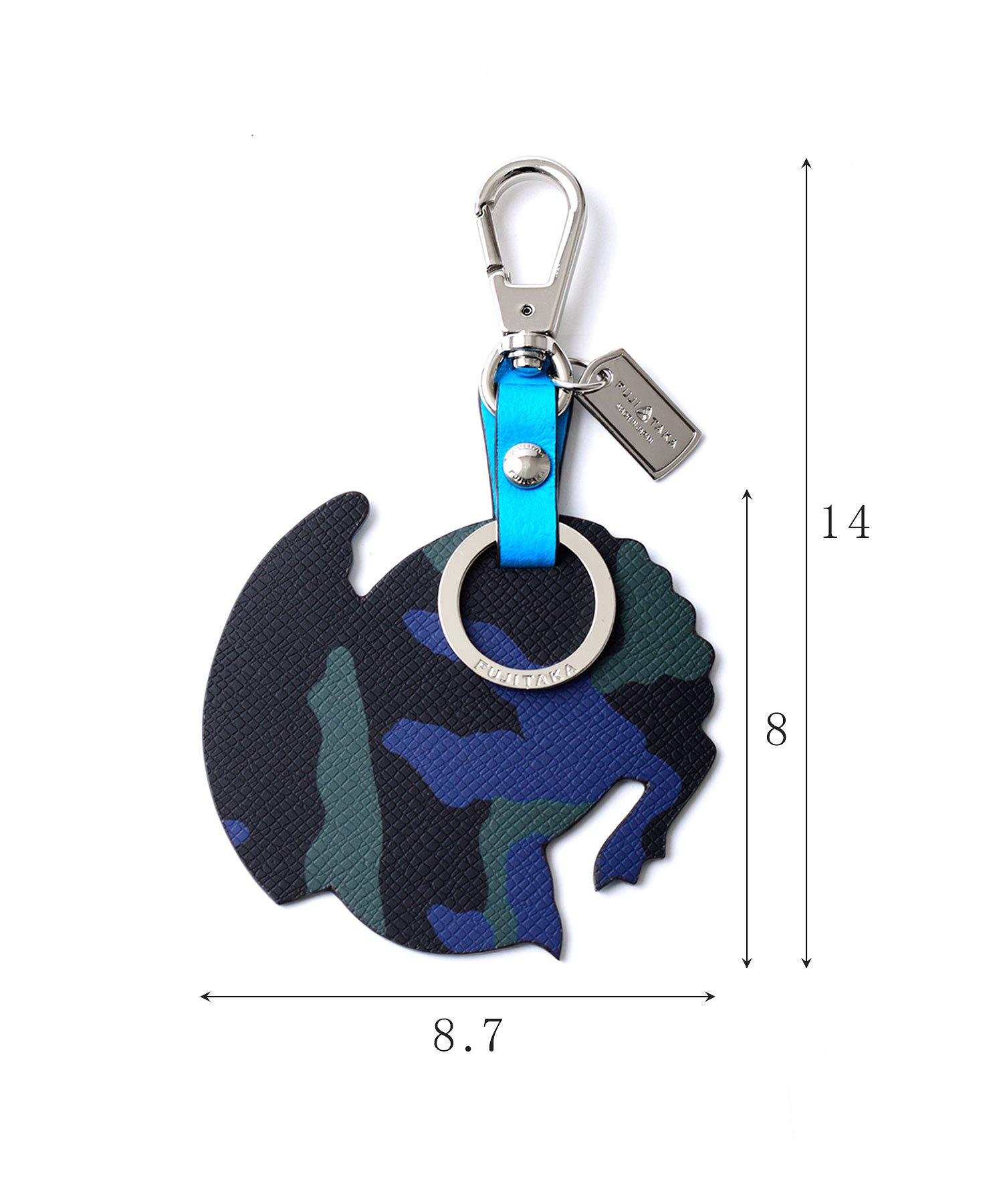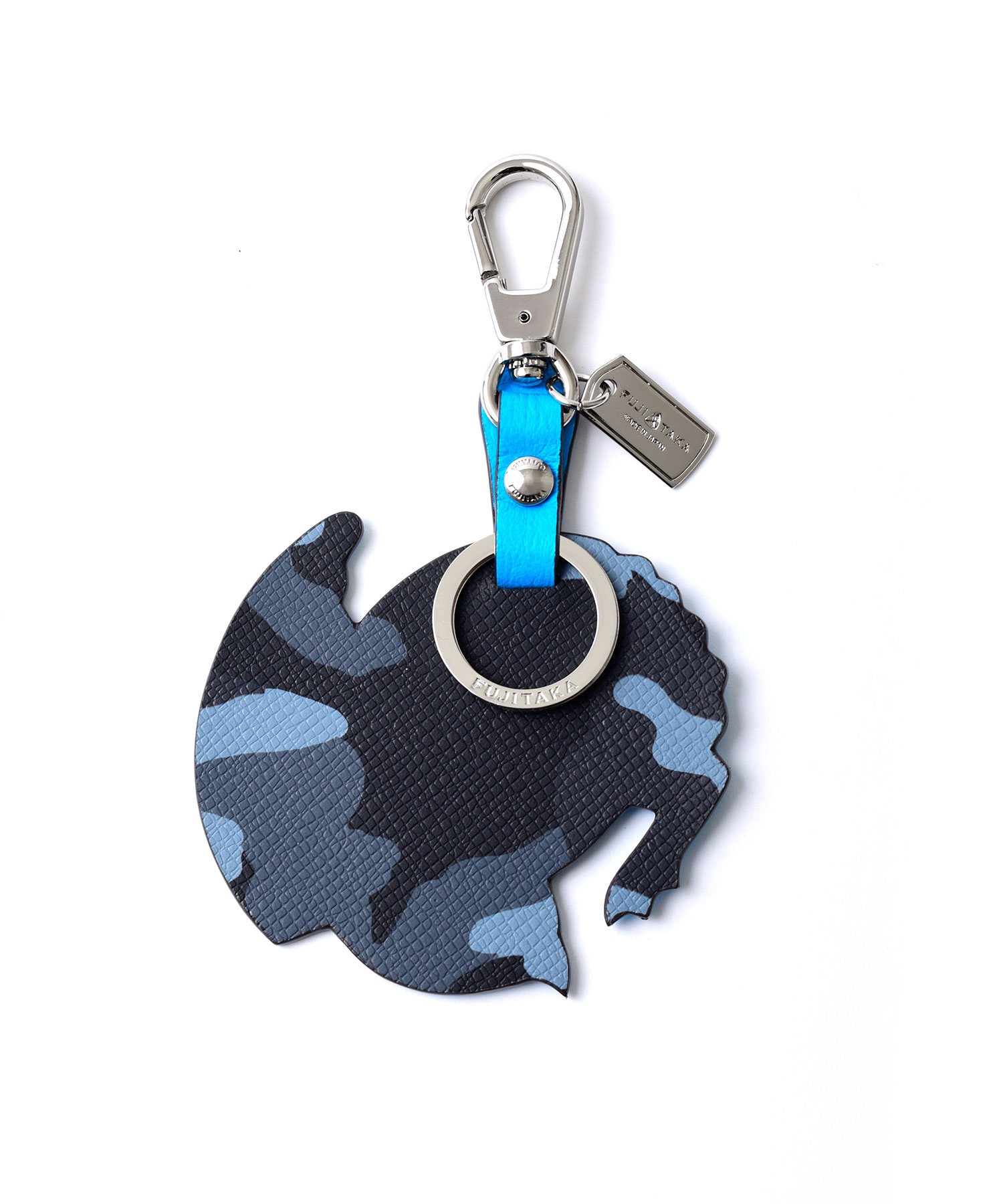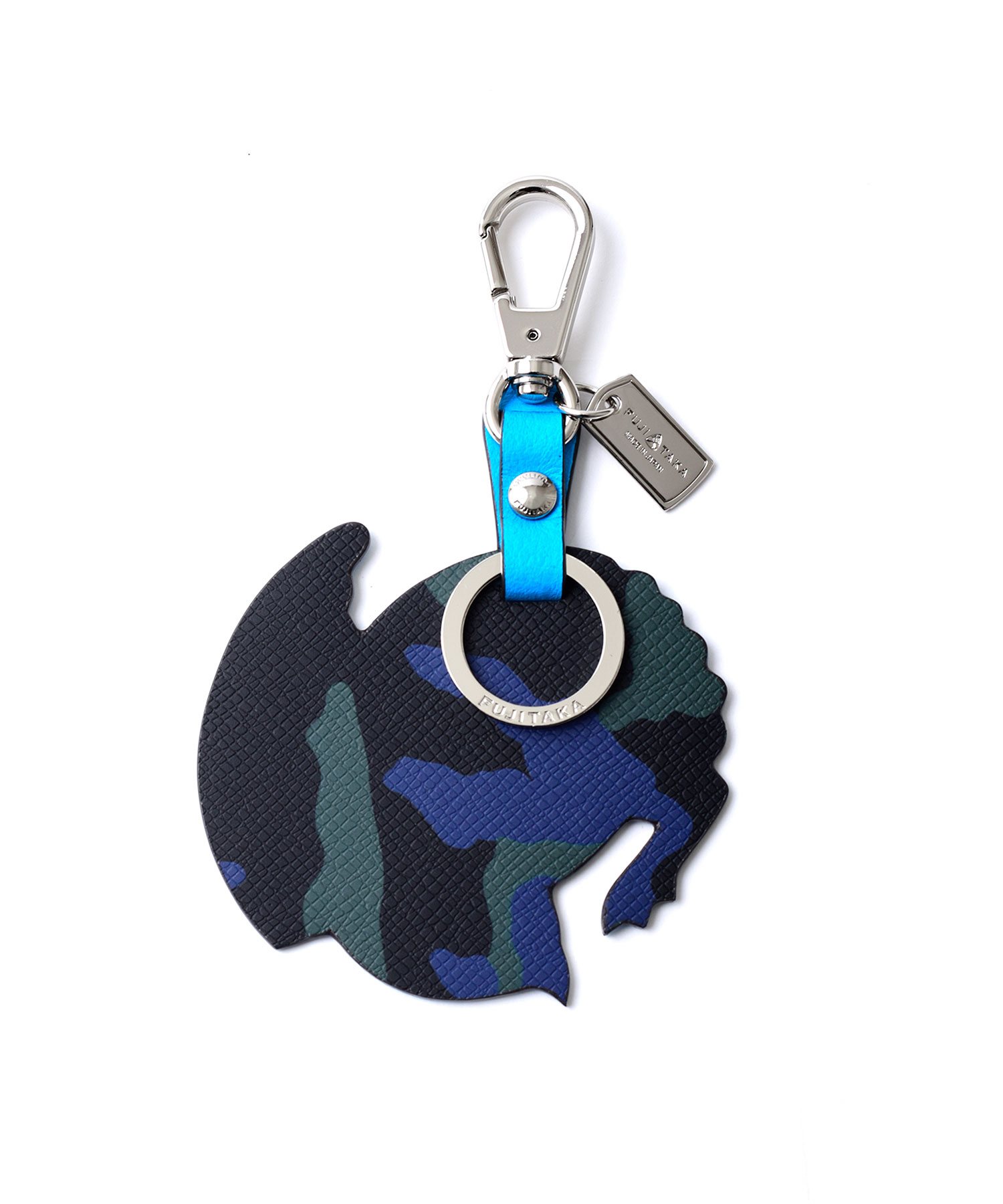 牛革にカモフラージュ柄をプリントした、個性引き立つフジタカのキーホルダー。ブランドオリジナルの紋章をモチーフにしています。一枚ずつ丁寧にプリントしている為、1つ1つ表情が違うところも魅力です。