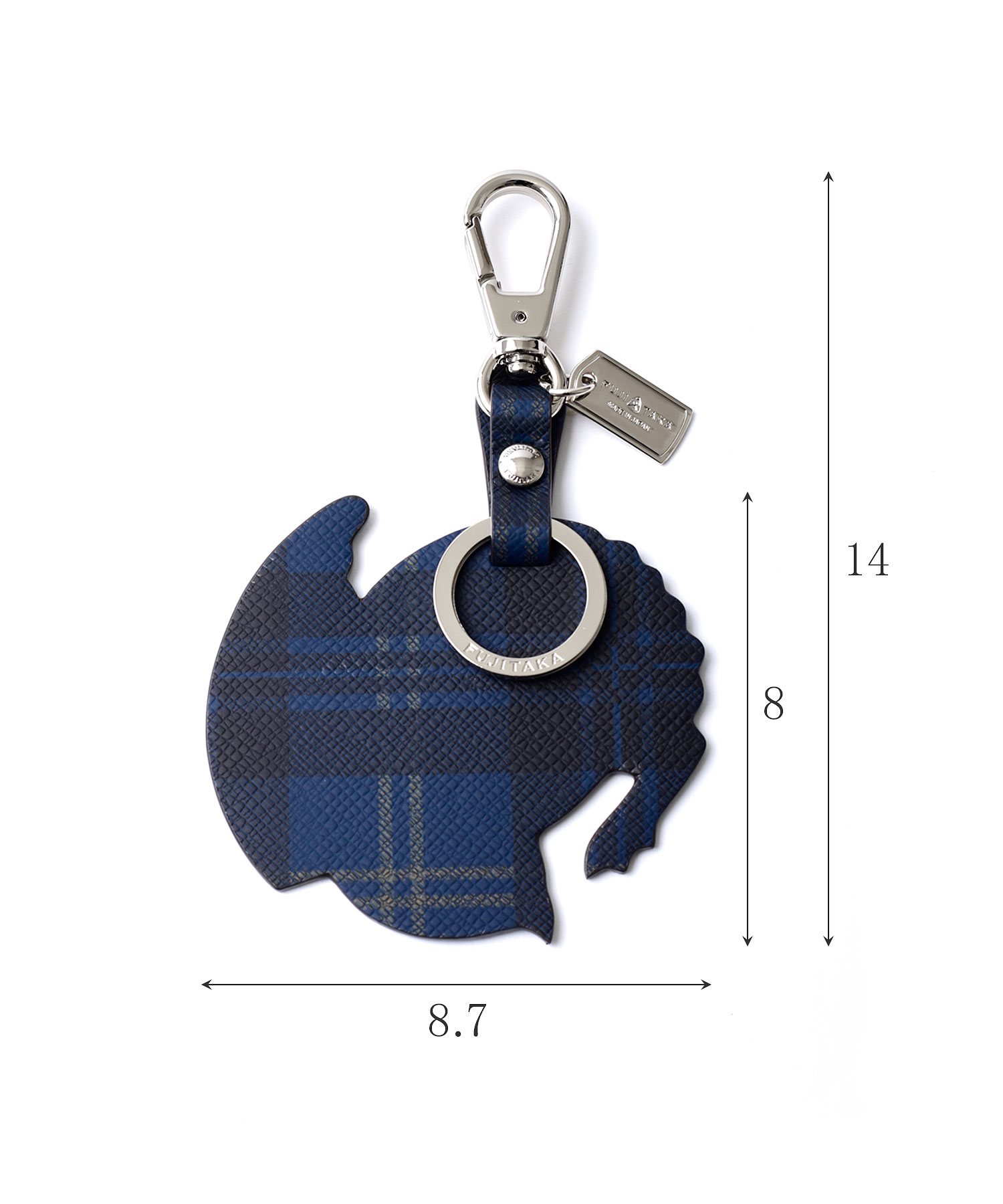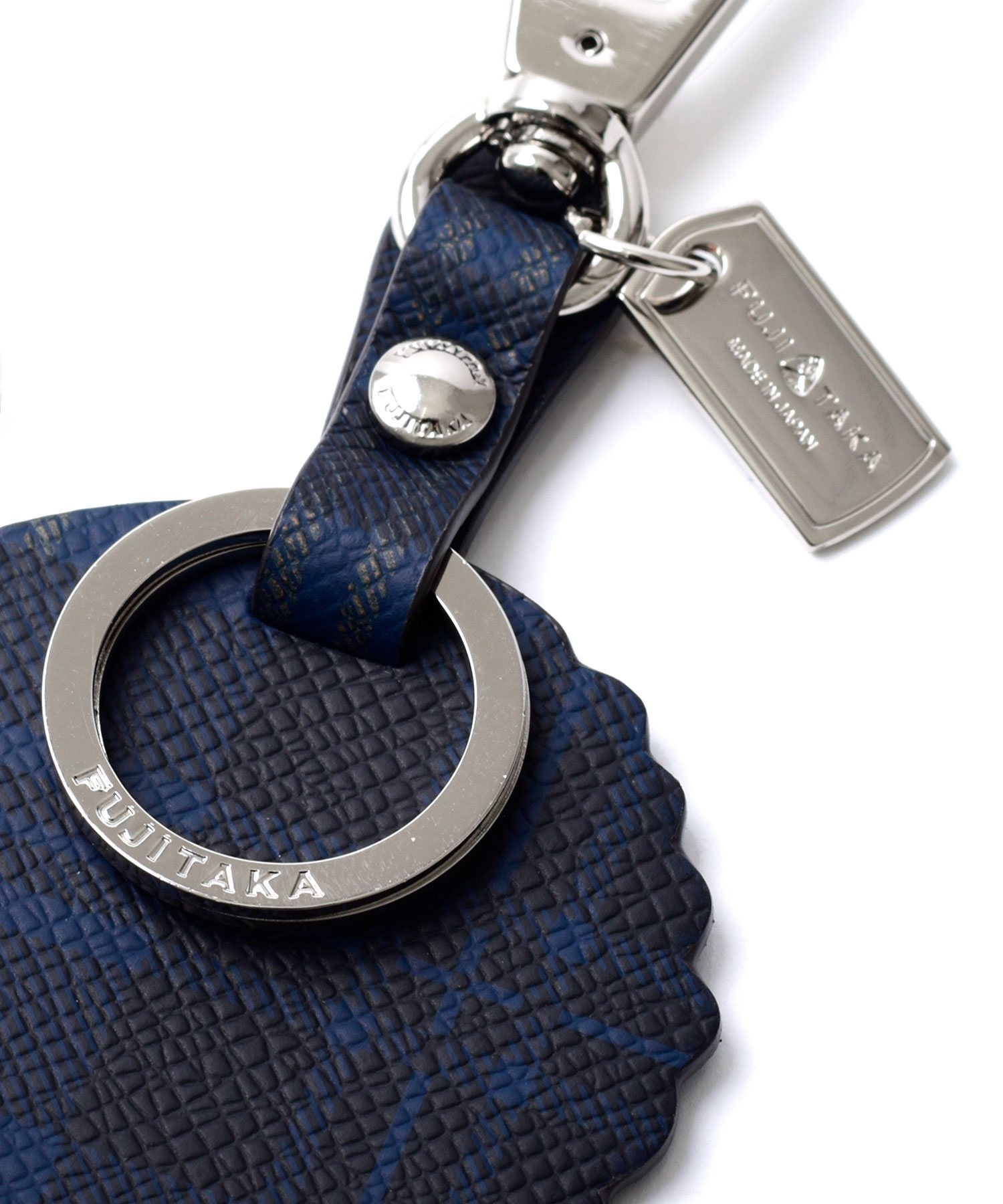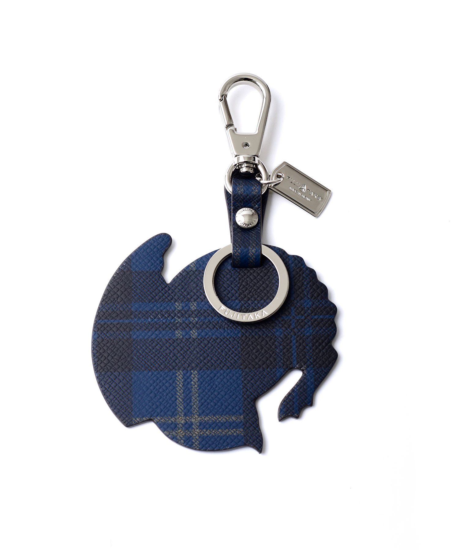 豚革にチェック柄をプリントした、高級感あふれるフジタカのキーホルダー。ブランドオリジナルの紋章をモチーフにしています。一枚ずつ丁寧にプリントしている為、1つ1つ表情が違うところも魅力です。